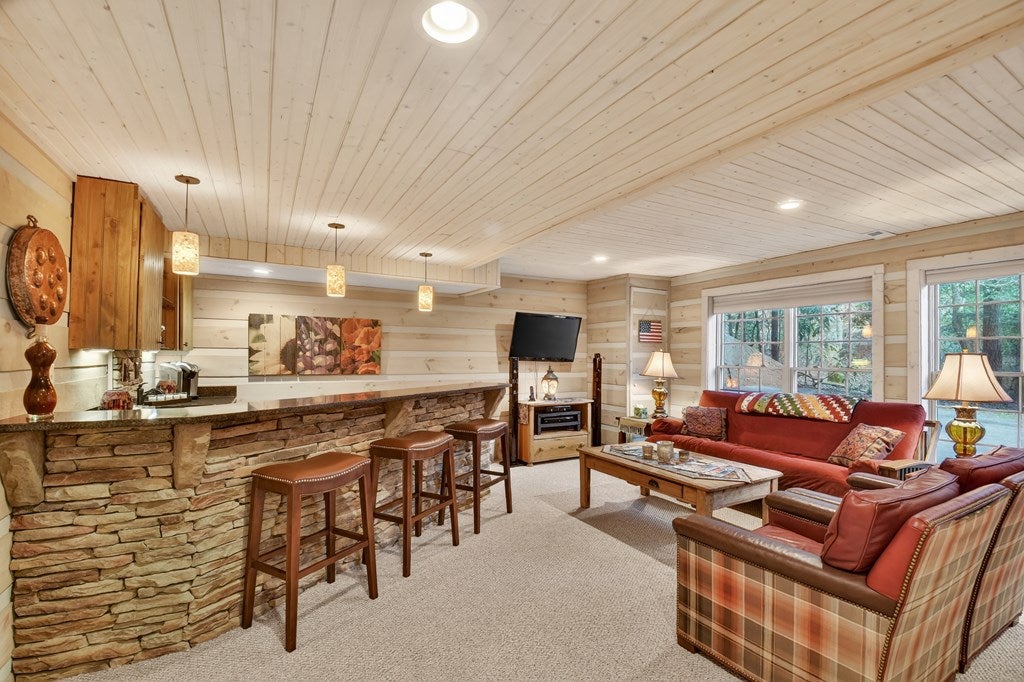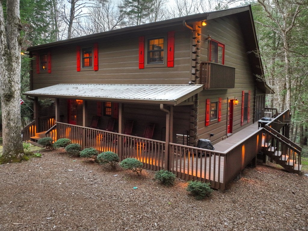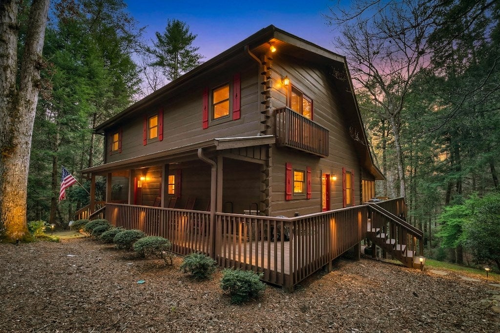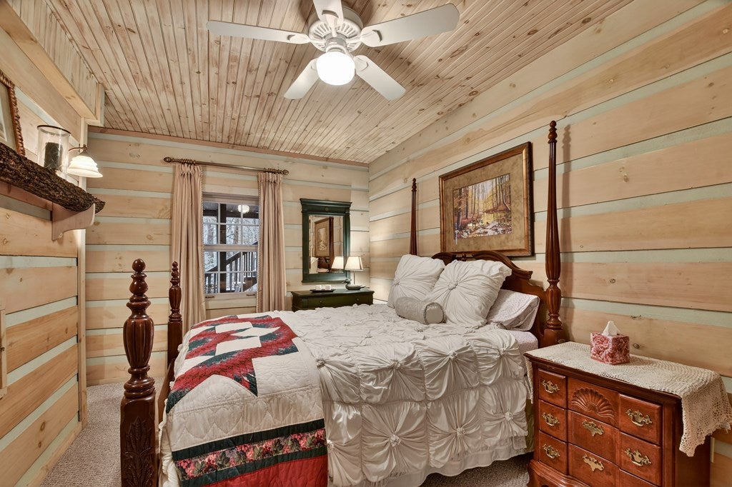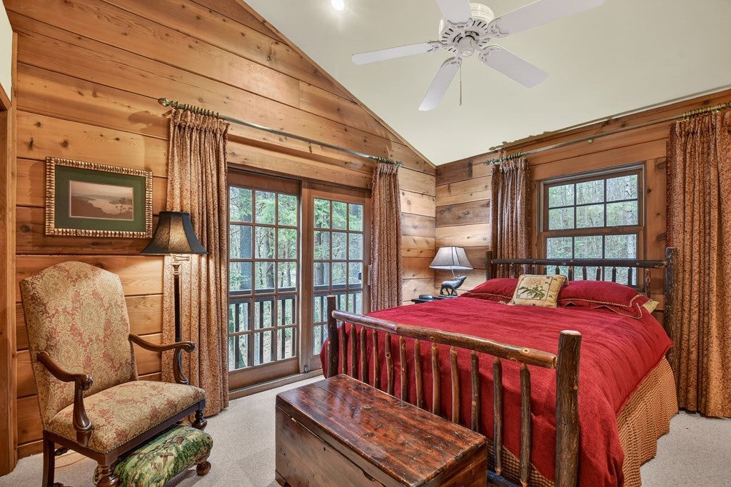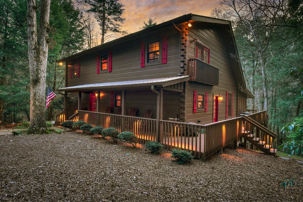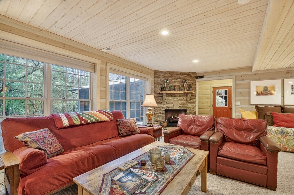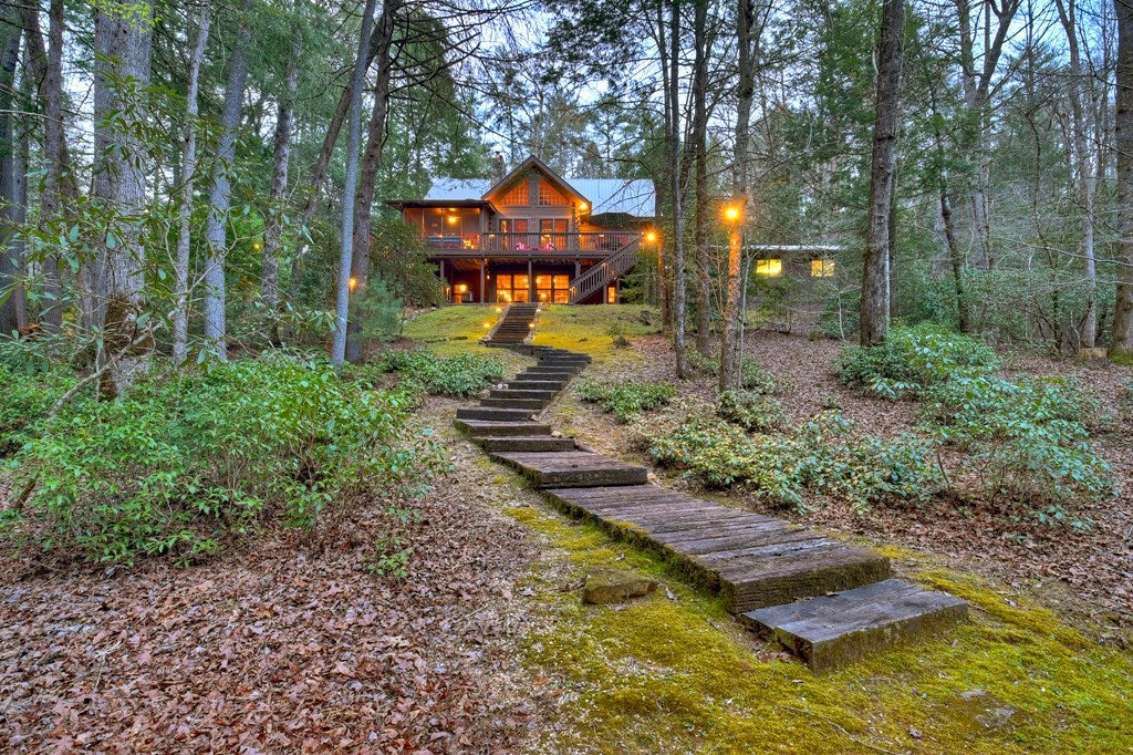 Luxury log home on the Ellijay River with 2.39 acres Located at Goose Island Hideaway, a 230 acre gated neighborhood in Cherry Log. This 4 bedroom log home is just under 4,000 squarefeet and is offered fully furnished with designer furnishings and original artwork. The main level features a central great room with a lodge fireplace, an updated kitchen with a walk-in pantry, 3 dining areas including a screened porch, and a primary bedroom suite with dual walk-in closets, a clawfoot tub, and a walk-in shower. Upstairs there is a small loft and 2 guest rooms with a Jack-and-Jill bathroom.The fully finished terrace level has a 4th bedroom with a bath, a bonus room that could serve as a home office/library, and a fully equipped game room with a wet bar, fireplace, and large-screen TV. Enjoy over 380 feet of river frontage by the outdoor fire pit with Adirondack seating. This property also includes a detached garage and a generator, and it has been recently painted. Short term rentals are permittedand this property would make an excellent vacation rental.