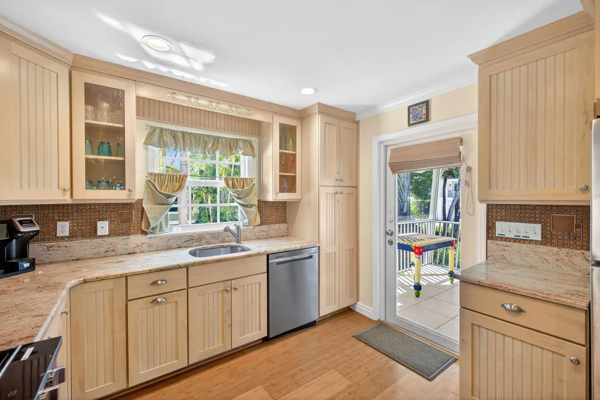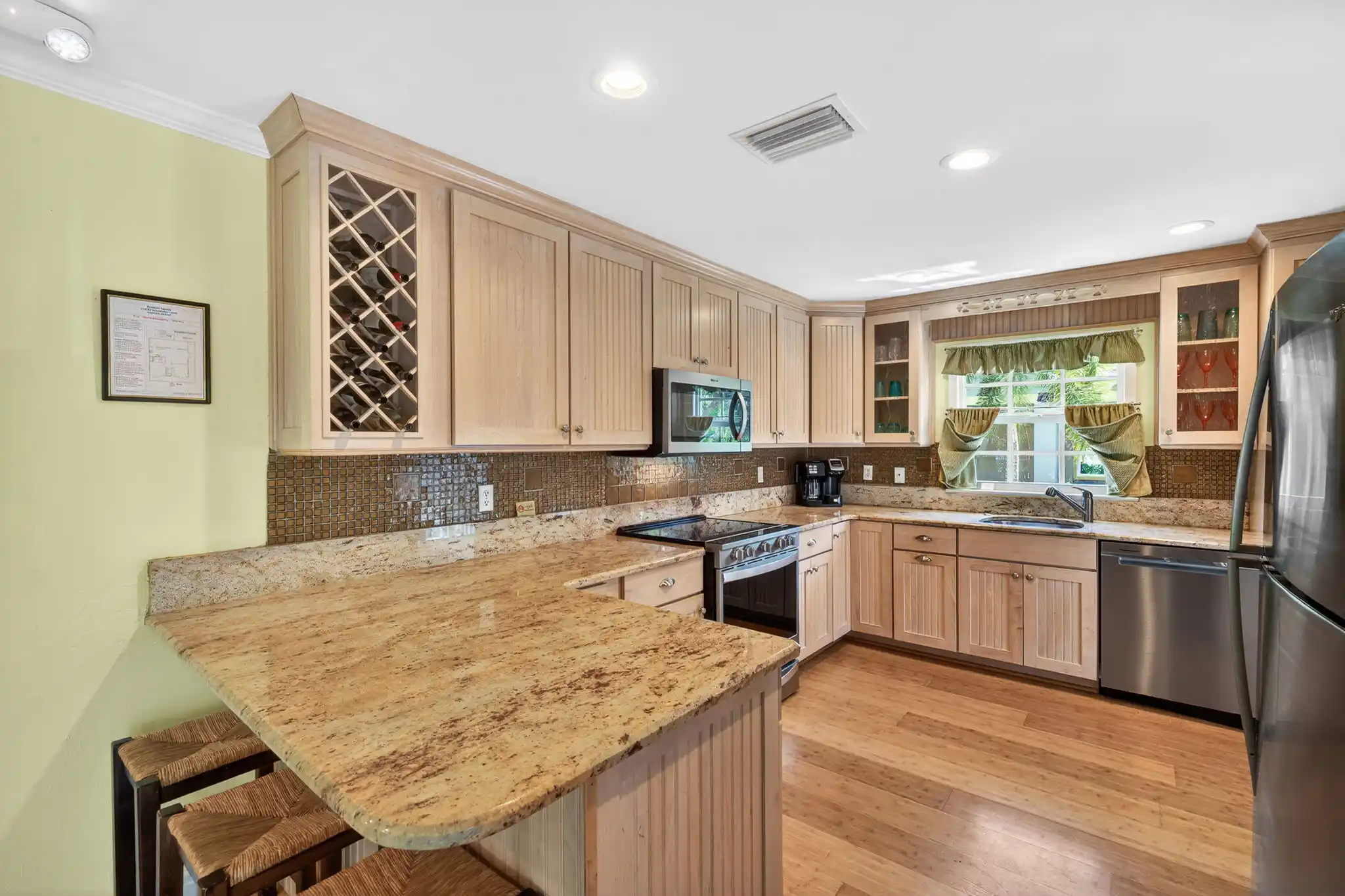 Take in the beautiful wide open lake views of this perfectly positioned waterfront home in the highly desirable waterfront community of Town & River Estates. This well maintained residence remained high and dry during recent hurricanes with no water intrusion—offering peace of mind along with timeless style. This 3 bedroom, 2 bath residence offers a relaxed yet refined style making it perfect to enjoy the Florida lifestyle. A new tile roof installed in 2025 complements the home’s extensive 2015 renovation, creating a move-in-ready opportunity. Inside, the open-concept design is highlighted by hand-scraped hickory flooring, cathedral ceilings with rich wood beams, a cozy fireplace, and an abundance of natural light. The gourmet kitchen is a chef’s dream, featuring custom white maple cabinetry, premium granite countertops, a 36” gas cooktop, farmhouse sink, built-in wine cooler, convection oven, warming drawer, and stainless steel appliances—all accented by custom lighting throughout the home. Step outside to your private oasis where a beautifully paved lanai sets the stage for true Florida living. Enjoy serene lake views from the covered lounge area, or entertain in style at the tiki bar complete with a full outdoor kitchen—perfect for relaxing or hosting guests. The spacious primary suite offers direct lanai access and a luxurious spa-inspired en suite bath. Both bathrooms are appointed with elegant Carrara marble and quartz finishes, while the primary bath features an open walk-in shower with a sleek French drain. Custom walk-in closets provide ample storage. This exceptional home combines comfort, quality, and a prime location—making it a true gem in Town & River Estates.