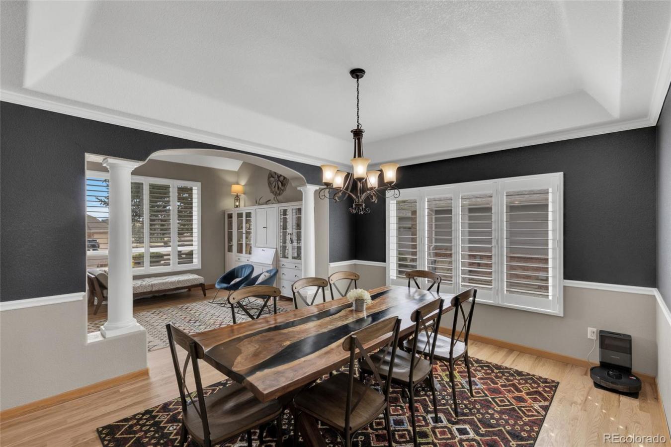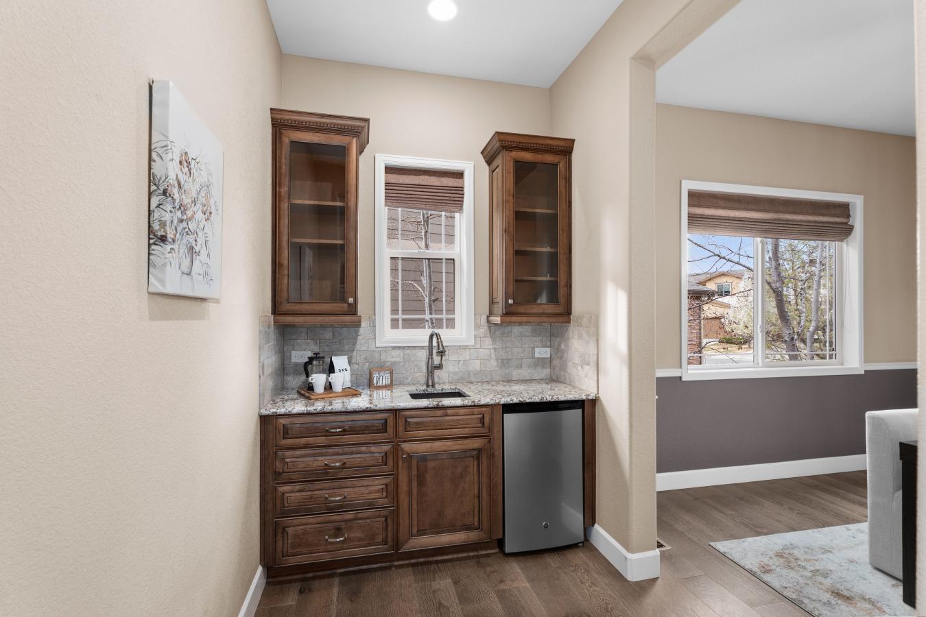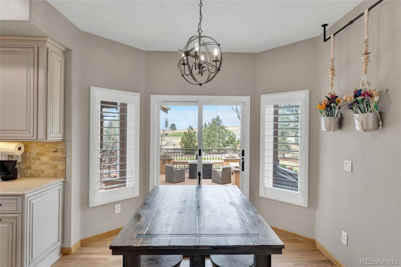 Imagine waking up at the end of a quiet, sun-drenched cul-de-sac, where the only sound is the wind through the pines. 7119 Dove Court isnt just a house; its a front-row seat to the best of Colorado living. From the moment you step through the door, the soaring vaulted ceilings and totally updated aesthetic create a sense of airy sophistication. Your backyard is a sprawling 15,000-square-foot sanctuary that backs directly to the lush fairways of the Pinery Country Clubs 14th hole, offering unobstructed, panoramic mountain views that turn every sunset into an event. The main floor is designed for a modern rhythm of life, featuring a secluded private office perfect for deep work. Upstairs, the layout is a rare find, keeping everyone close with the primary suite plus three additional spacious bedrooms all on the same level. When its time to entertain, the lower level is the ultimate destination. Imagine hosting friends at the sleek wet bar-complete with a full-size refrigerator for all your local brews-or heading into the dedicated gym or settling into the craft room for a creative session. Whether you are walking the nearby Cherry Creek Trail, enjoying a round at the club, or simply taking in the mountain vistas from your deck, this home offers a lifestyle of quiet luxury and natural beauty that is impossible to replicate.