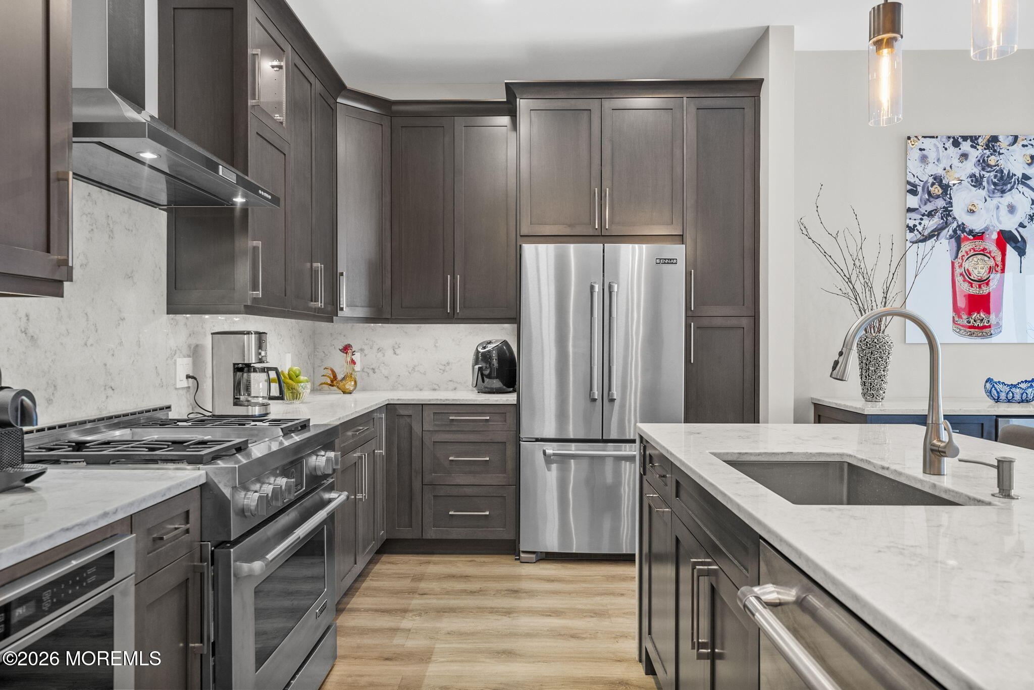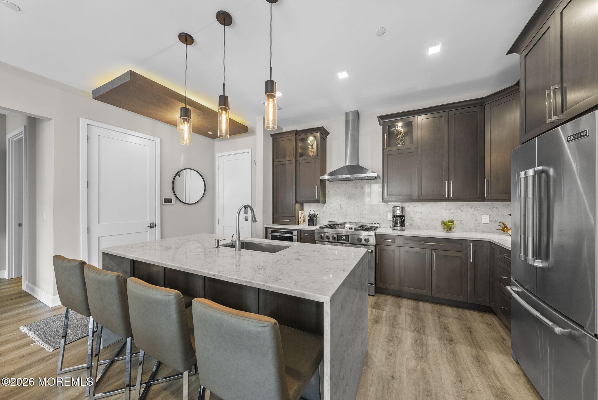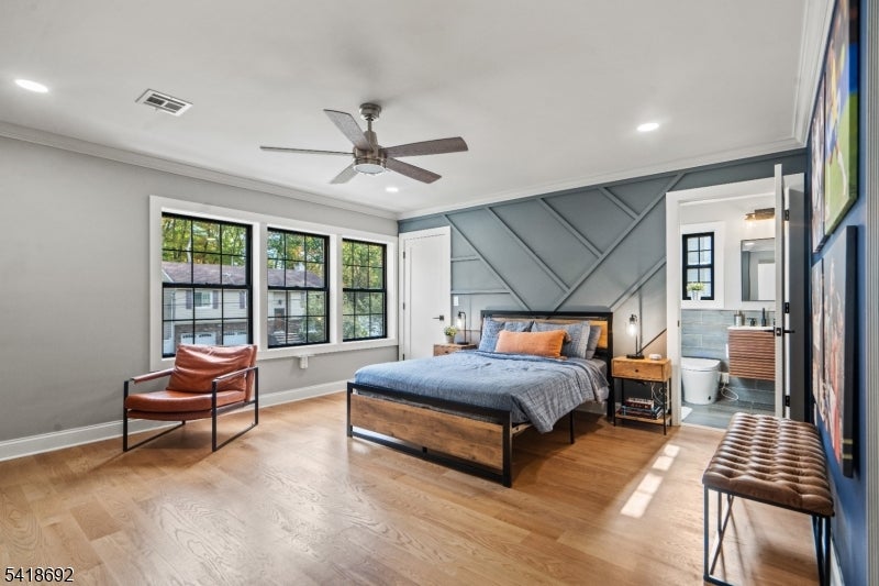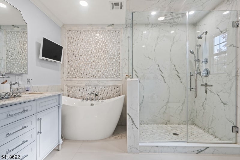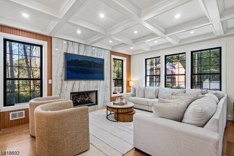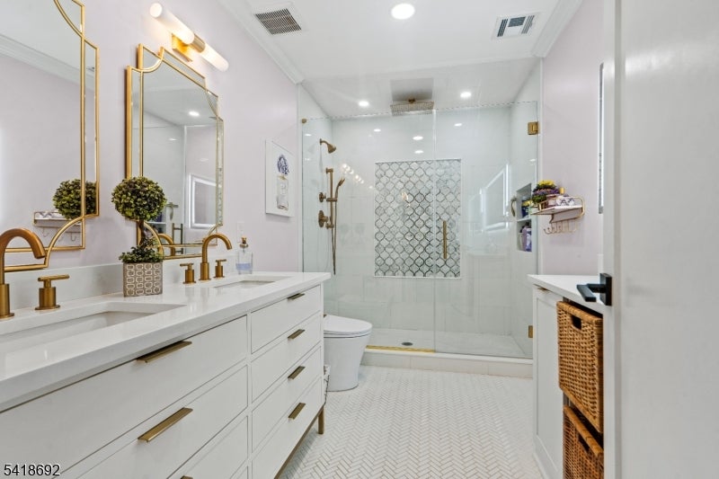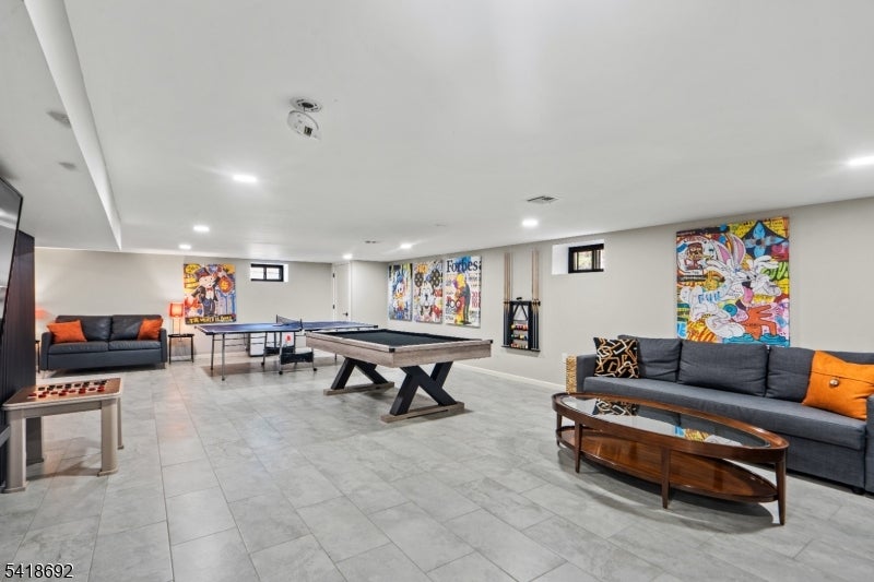 Welcome to Roseland, a charming gem in Essex County. This custom-built 2023 home sits on a quiet, near-private street just steps from a playground, basketball, and pickleball courts. A stone-paved driveway leads to a beautifully crafted exterior with James Hardie siding and a two-car garage.Inside, the open floor plan offers elegant spaces ideal for both everyday living and entertaining. The gourmet kitchen features a large island seating up to 7, custom refrigerator and freezer, Liebherr wine tower, and an 8-burner Italian stove, along with three dishwashers, two sinks, a Bosch speed oven, beverage fridge, ice maker, and a spacious pantry.The dining area flows into a bright great room with a gas fireplace, custom ceiling panels, crown molding, and special-order black windows. The primary suite boasts a spa-like bath with double vanity, Whirlpool tub, stall shower, heated floors, two walk-in closets, and a sitting area with electric fireplace. A second suite includes a private bath and built-in office, while two additional bedrooms share a beautifully designed bath with double vanity and heated floors.Additional highlights include a finished basement with entertainment space, a large attic for storage, and a water softener and filtration system. Located in the highly rated West Essex School District, with easy access to major highways and a NYC bus within walking distance.