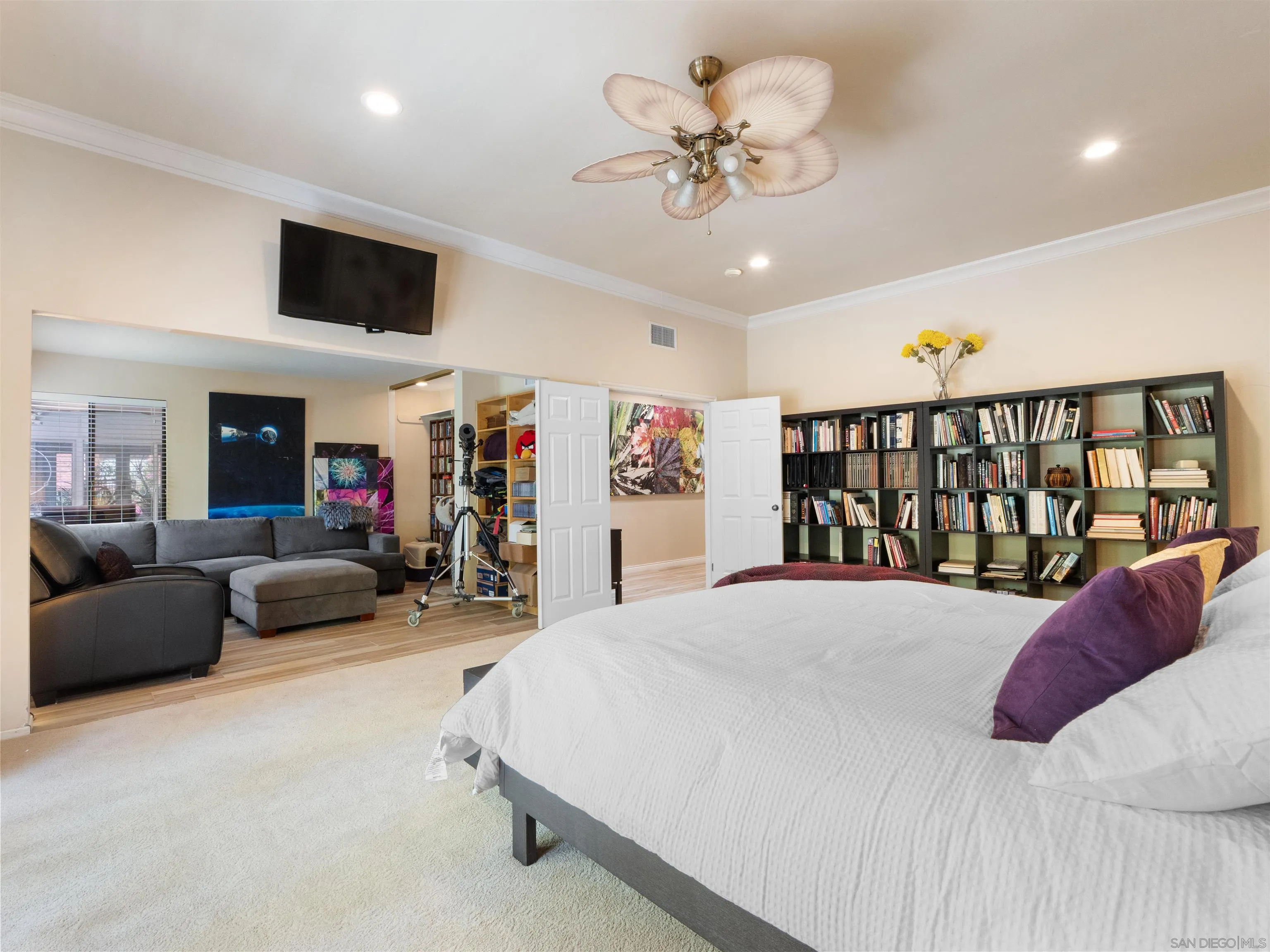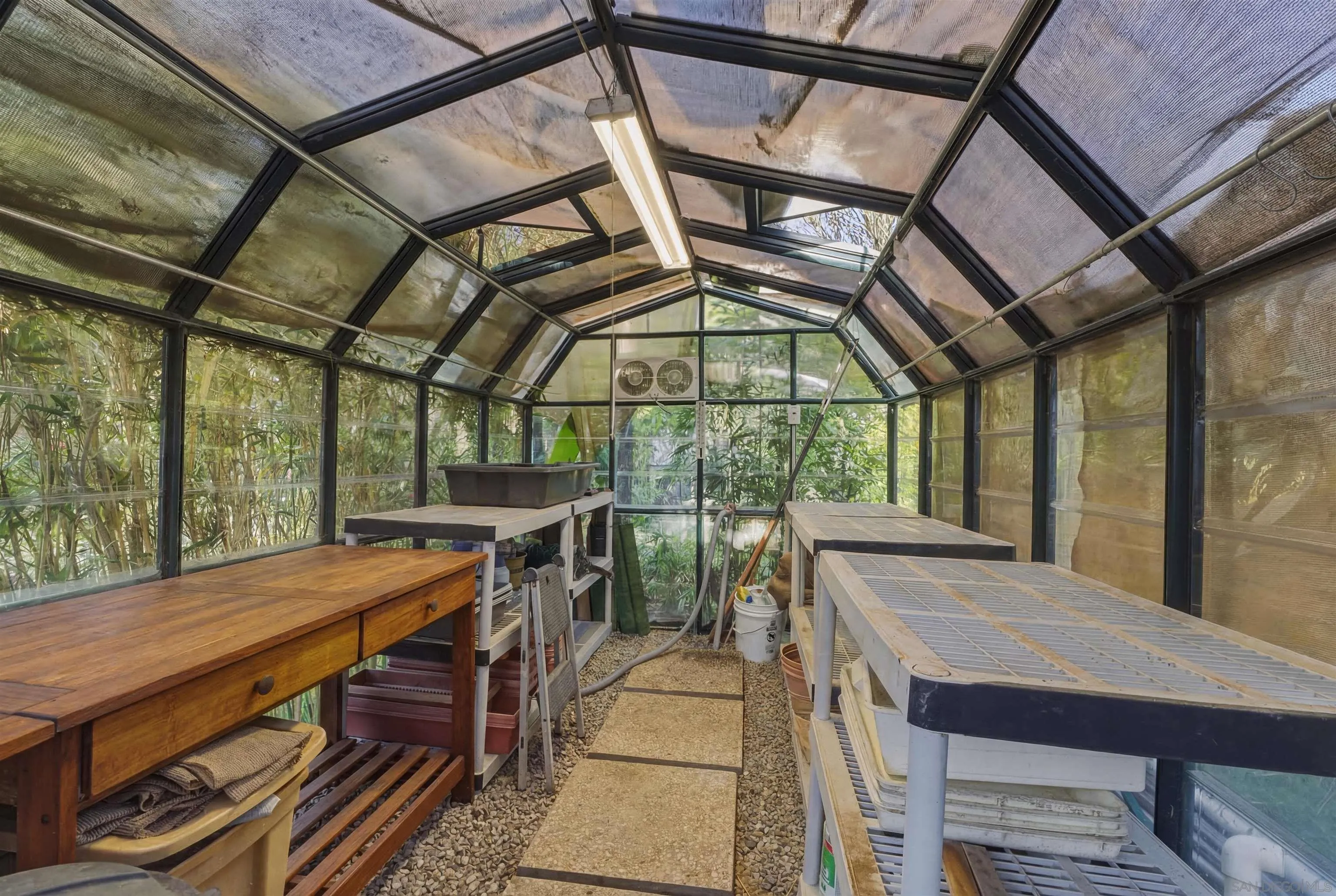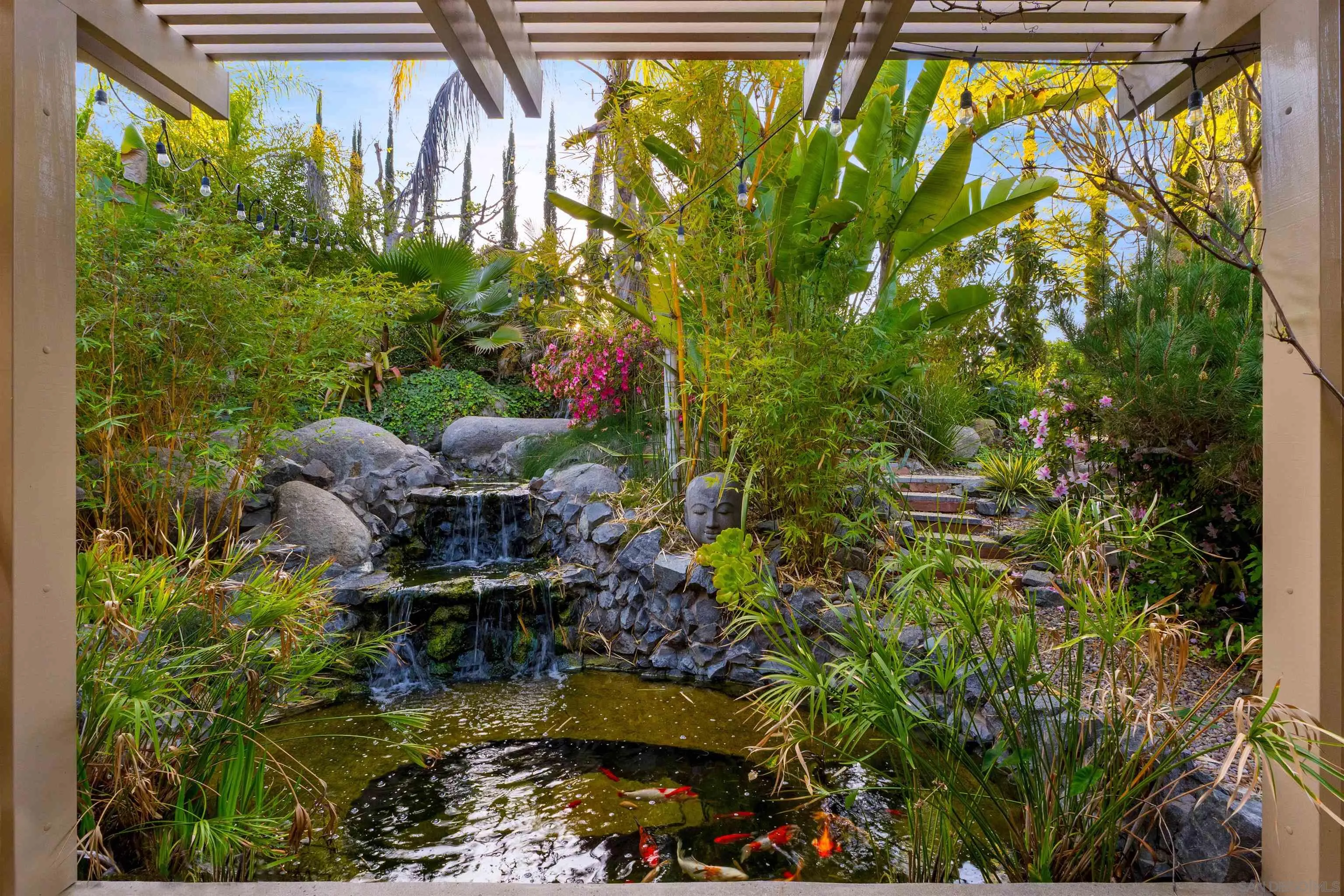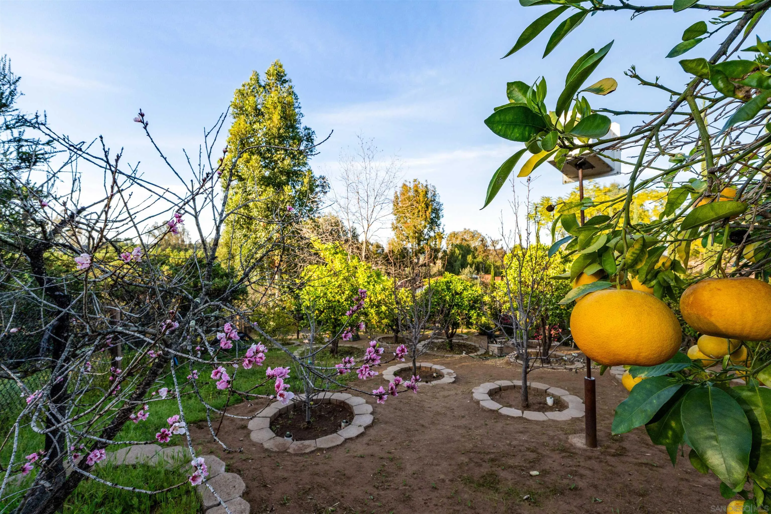 Welcome to your own private botanical garden in the highly desirable South Escondido neighborhood of Lomas Serenas. Tucked away on a peaceful cul-de-sac, this rare single-story former model home sits on over half an acre, offering a daily escape with hummingbirds, butterflies, and fresh fruit harvesting in your own backyard. Wander on garden paths through a thriving orchard, past peaceful sitting areas, and a multi-tier waterfall that flows into a tranquil koi pond. Enjoy a farm-to-table lifestyle with citrus, peaches, grapes, apples, berries, honey, and more. Inside, 3,159 sq ft of living space features vaulted ceilings, large skylights, whole-home sound, and elegant spaces for entertaining or relaxing. The kitchen showcases GE Monogram appliances and a large dine-in island, while a beverage bar with dual refrigerators and a formal dining area make hosting effortless. A climate-controlled sunroom and screened patio blend indoor and outdoor living. One bedroom is currently a built-in office, ideal for working from home. The primary suite offers a double-door entry, bonus retreat, and glass doors opening to soothing water features. The spa-style bath includes a soaking tub, garden atrium, and custom walk-in closet. Additional highlights include owned solar, a 3-car garage with workshop, custom patio covers, and a fully fenced yard. Ideally located west of I-15 near Lake Hodges and North County Mall, this peaceful retreat is still only minutes away from everything.