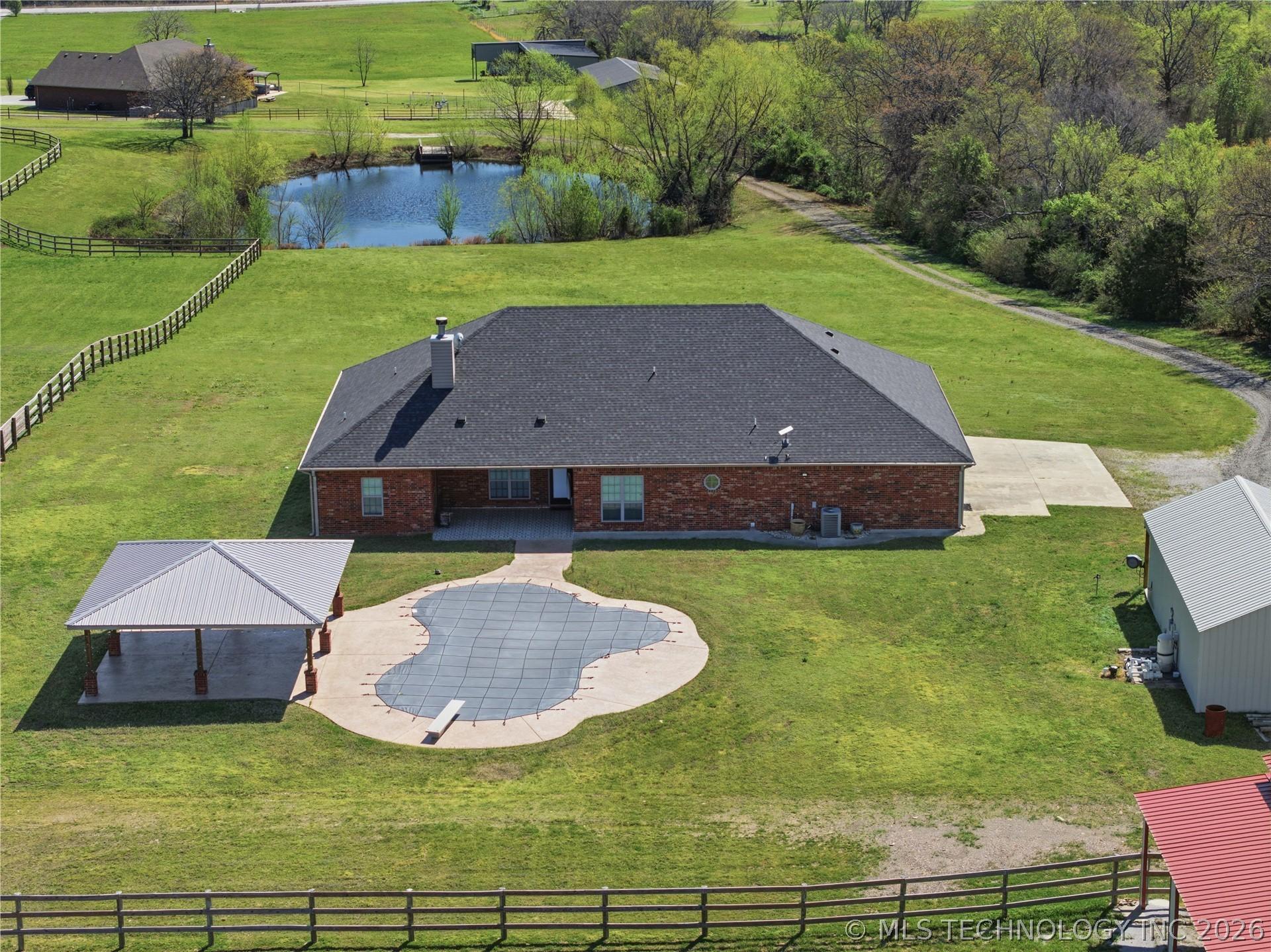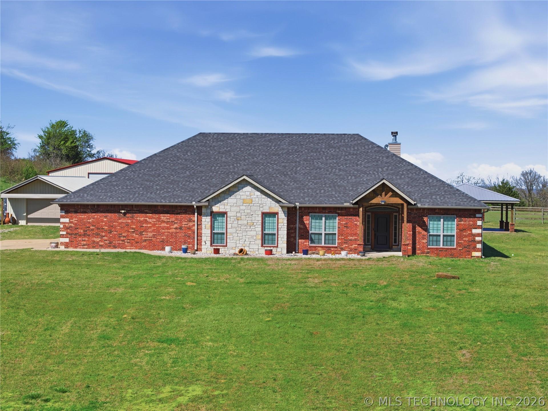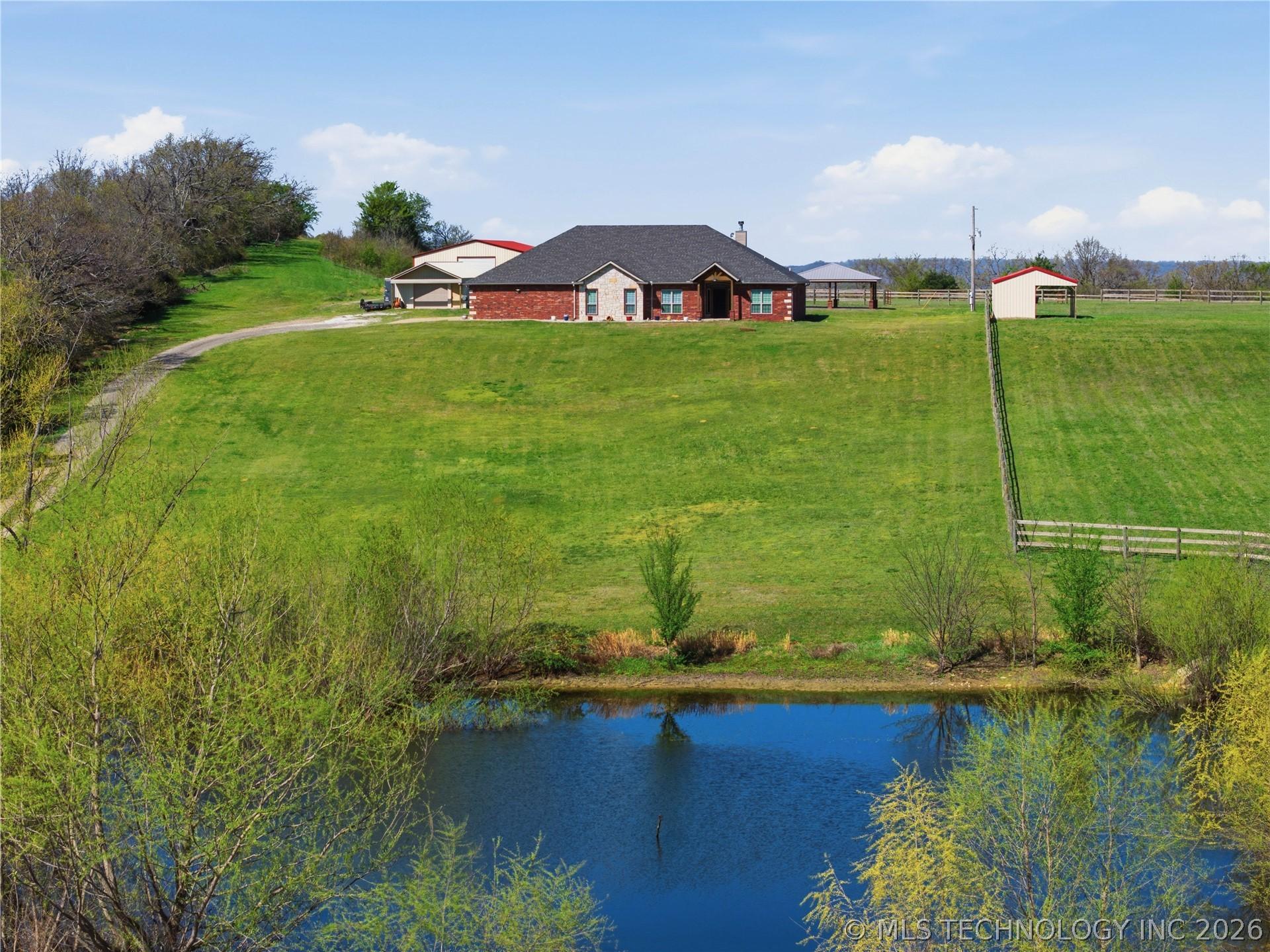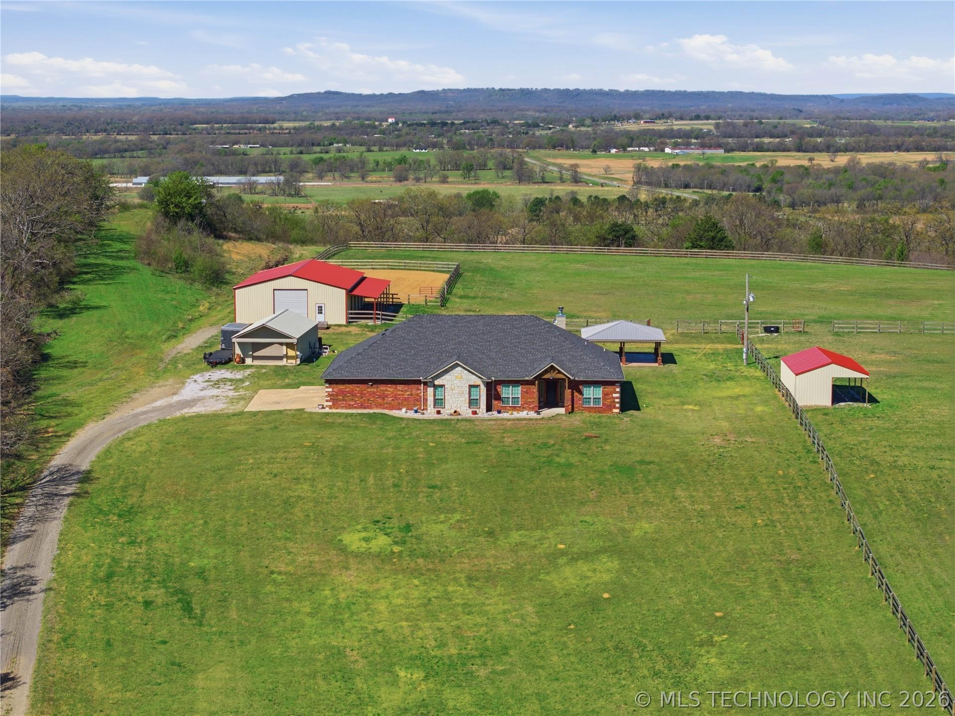 Your dream hobby horse ranch awaits on 21 acres where you wake up to breathtaking views that stretch for miles. The meticulously maintained, 4 bed, 2 bath home is move-in ready. The kitchen features a Wolf induction cooktop and a new smart refrigerator with tap-to-view technology. Gather in the eat-in kitchen for casual meals or host guests in the formal dining room. Fresh carpeting and natural look, hewn-style wood flooring flow throughout. An oversized 3 stall attached garage provides ample space for large trucks, cars, toys and storage. Step out back to your private oasis - an in-ground pool with a high-tech self-cleaning system and a spacious gazebo for entertaining. The property boasts a 40x60 horse barn with 2 stalls, built in 2023, with exterior-access doors, and a 10 foot lean-to running the full 60 foot length. Theres a 60x160 outdoor arena. Pipe & wood fencing with cross fencing and gates throughout the acreage. A 21x34 shop for equipment, built in 2024. A private lane leads to the back of the property where apprx 5 acres of woods for hunting and open space create an ideal setup for a private shooting range. Out front is a large pond with a dock for fishing! Just minutes to riding trails, dining, shopping and entertainment. Within a half mile to access I-40. 30 minutes to Ft Smith, 40 minutes to Muskogee and an hour and 20 minutes to Tulsa.
