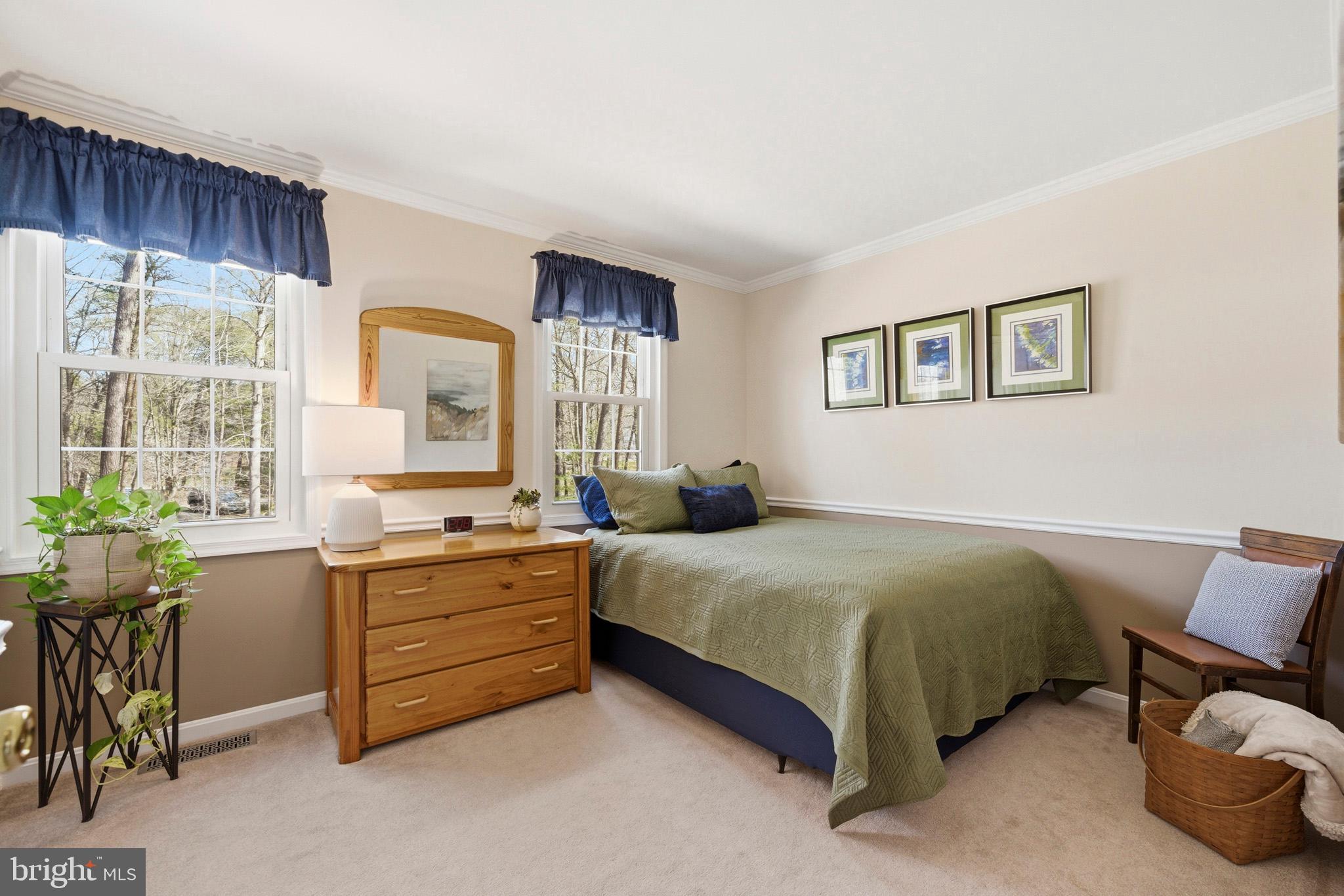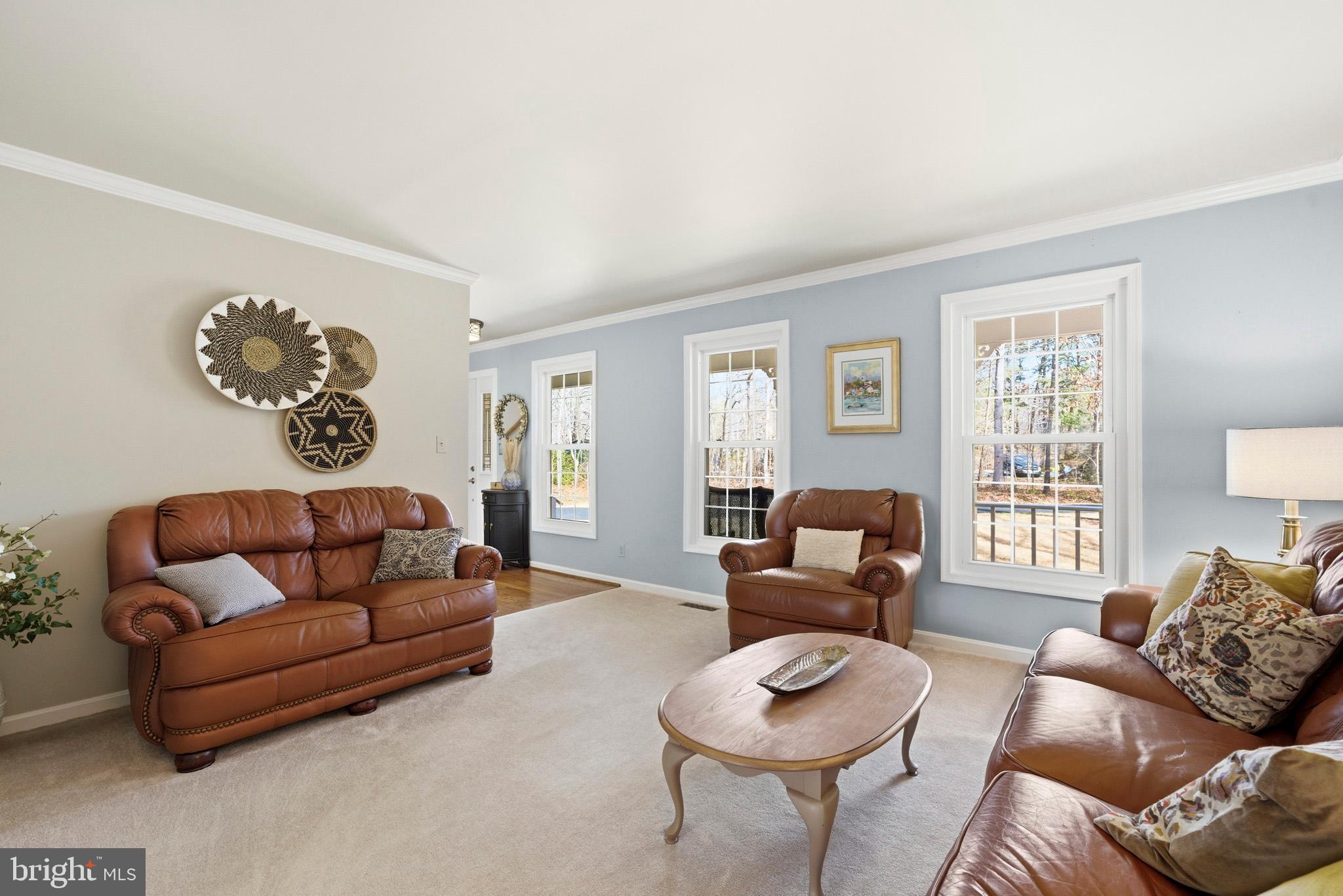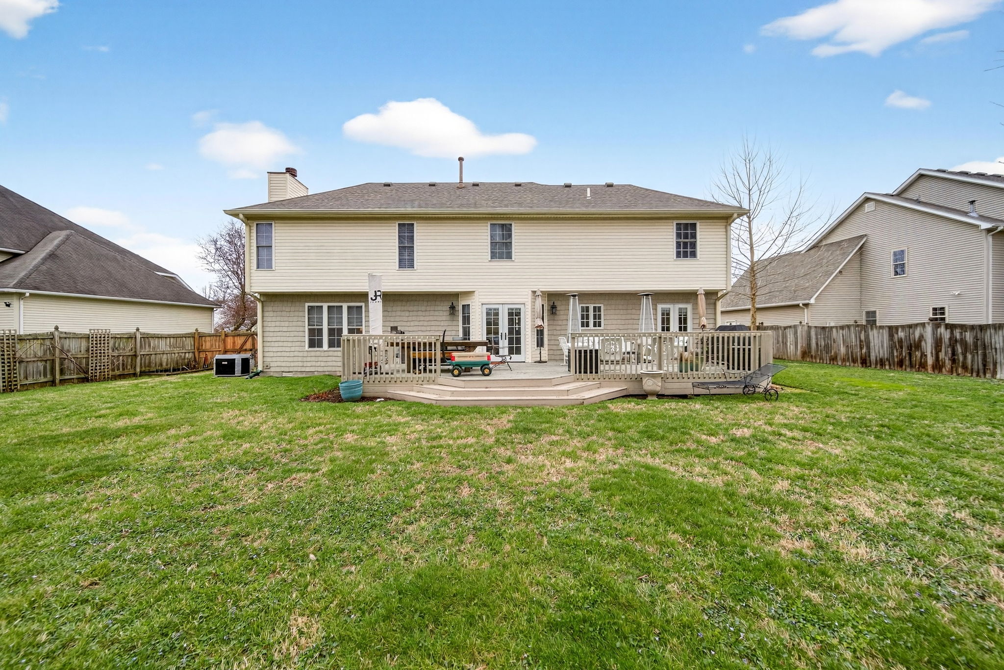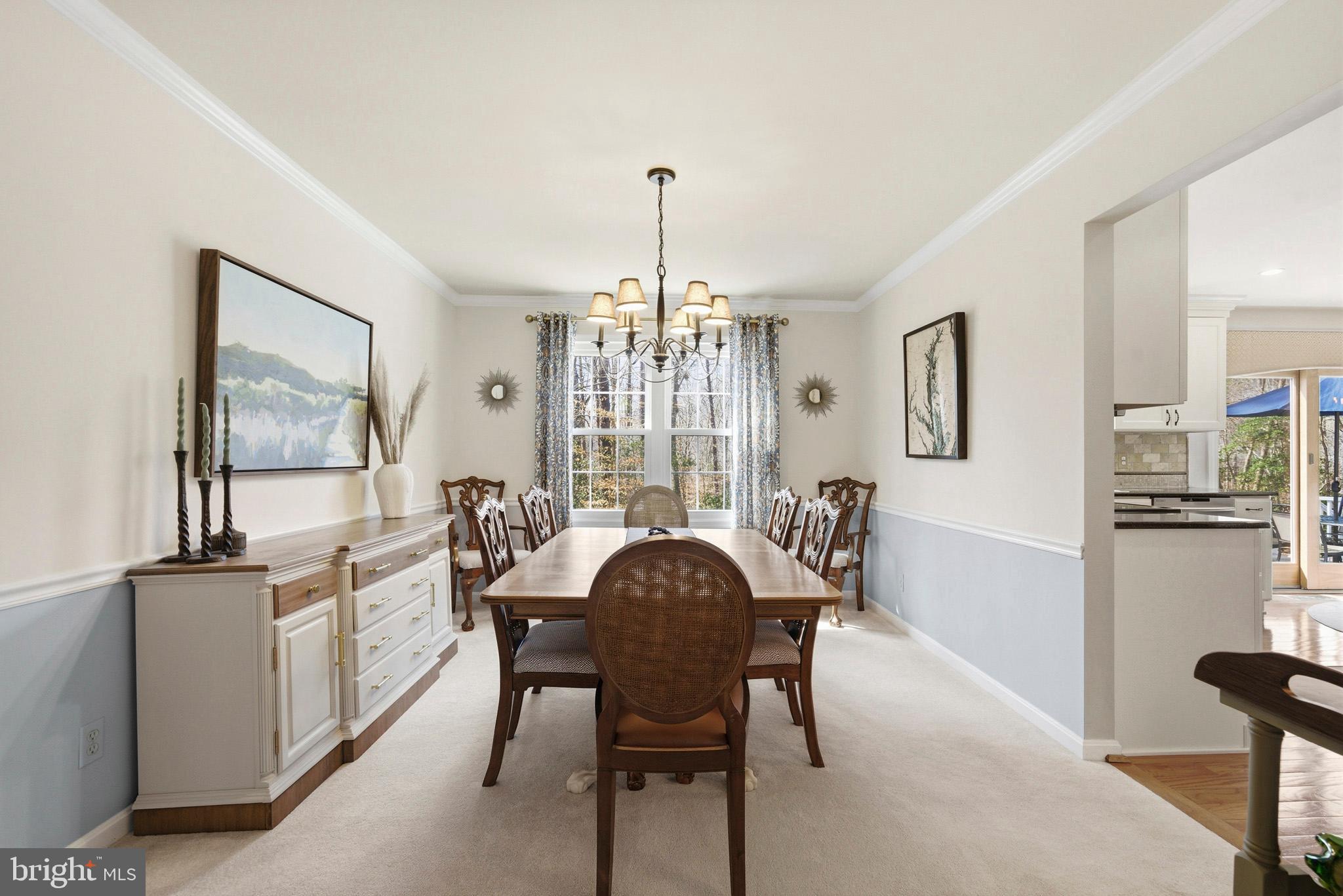Timeless elegance meets modern comfort in this 4 bedroom, 3 1/2 bath home. You are greeted with elegant landscaping and stamped walkway that lead up to your stunning front door. A two-story foyer with hardwood stairs, black railing, and crown molding sets the tone, while the great room's cathedral ceiling and gas fireplace create a welcoming centerpiece. The formal living and dining rooms feature tray ceilings and custom moldings, perfect for entertaining. The kitchen is both stylish and functional, with white cabinetry, granite counters, stainless steel appliances, tile backsplash, a wood-topped island, pantry, and butler's pantry with wine fridge. A bright office with French doors, drop zone off the garage, and a large bonus room upstairs (ideal as a 5th bedroom) add versatility. The primary suite offers a cathedral ceiling, jetted garden tub, tiled shower, double sinks, recessed lighting, and a custom walk-in closet. Finished basement boasts a large family room, recreation area, wet bar, built-ins, surround sound, full bath, and ample storage. Outdoor spaces include a deck, stamped concrete patio, and serene wooded backyard.