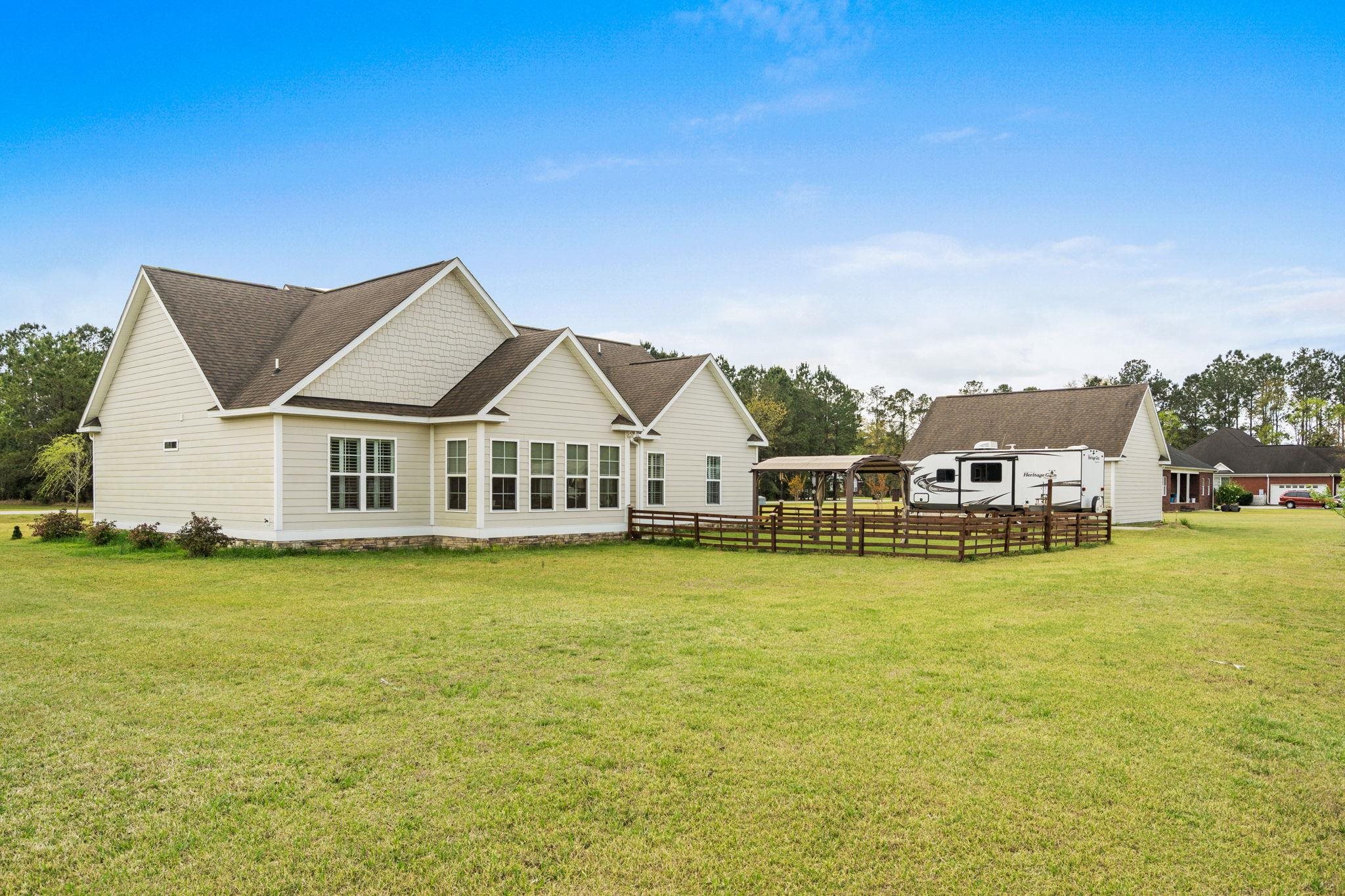 Welcome to this beautifully crafted 4-bedroom, 2.5-bath custom home, perfectly situated on a 1.36-acre corner lot in the charming city of Loris. Step inside the foyer to an inviting open-concept living area, highlighted by a two-way fireplace that seamlessly connects to the sun-filled Carolina room≠ideal for relaxing or entertaining.The chef's kitchen is both functional and stylish, featuring a gas stove, granite countertops, stainless steel appliances, and an elegant connection to the formal dining room. The master suite offers a private retreat with a spacious layout, double sinks, and a large walk-in shower. Secondary bedrooms share a convenient Jack-and-Jill bath, while the versatile fourth bedroom could also serve as an office or flex space. Outdoor living is a delight with a welcoming front porch, back patio with a gas hookup for grilling, a charming pergola, and a fully fenced yard. Additional features include an attached 2-car garage, detached 2-car garage/workshop, backup generator, RV parking, and an RV hookup. Experience the best of country living with the convenience of being less than 30 minutes from the beach, and all without the restrictions of an HOA. This home is a rare blend of comfort, space, and versatility, ready to accommodate your lifestyle.