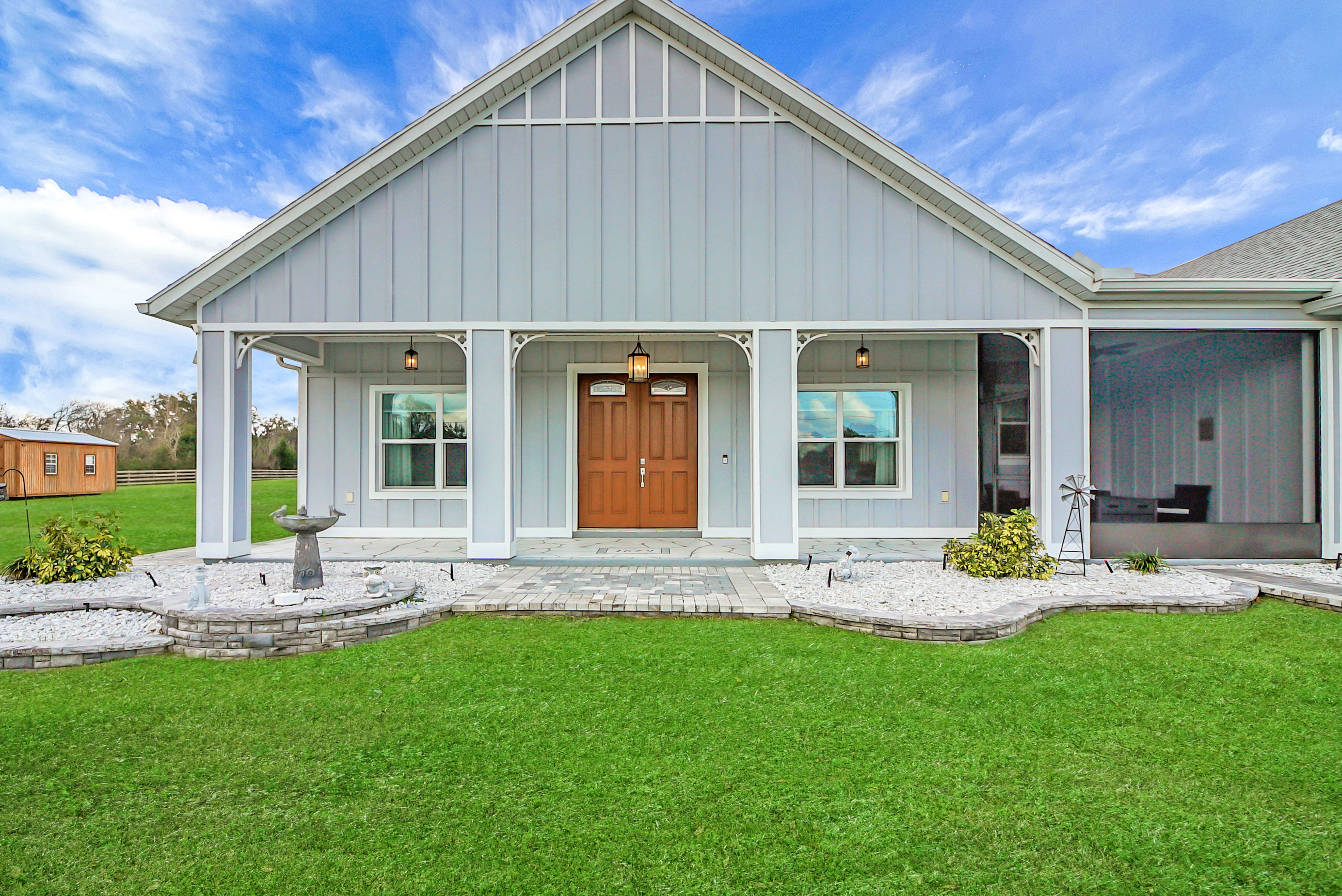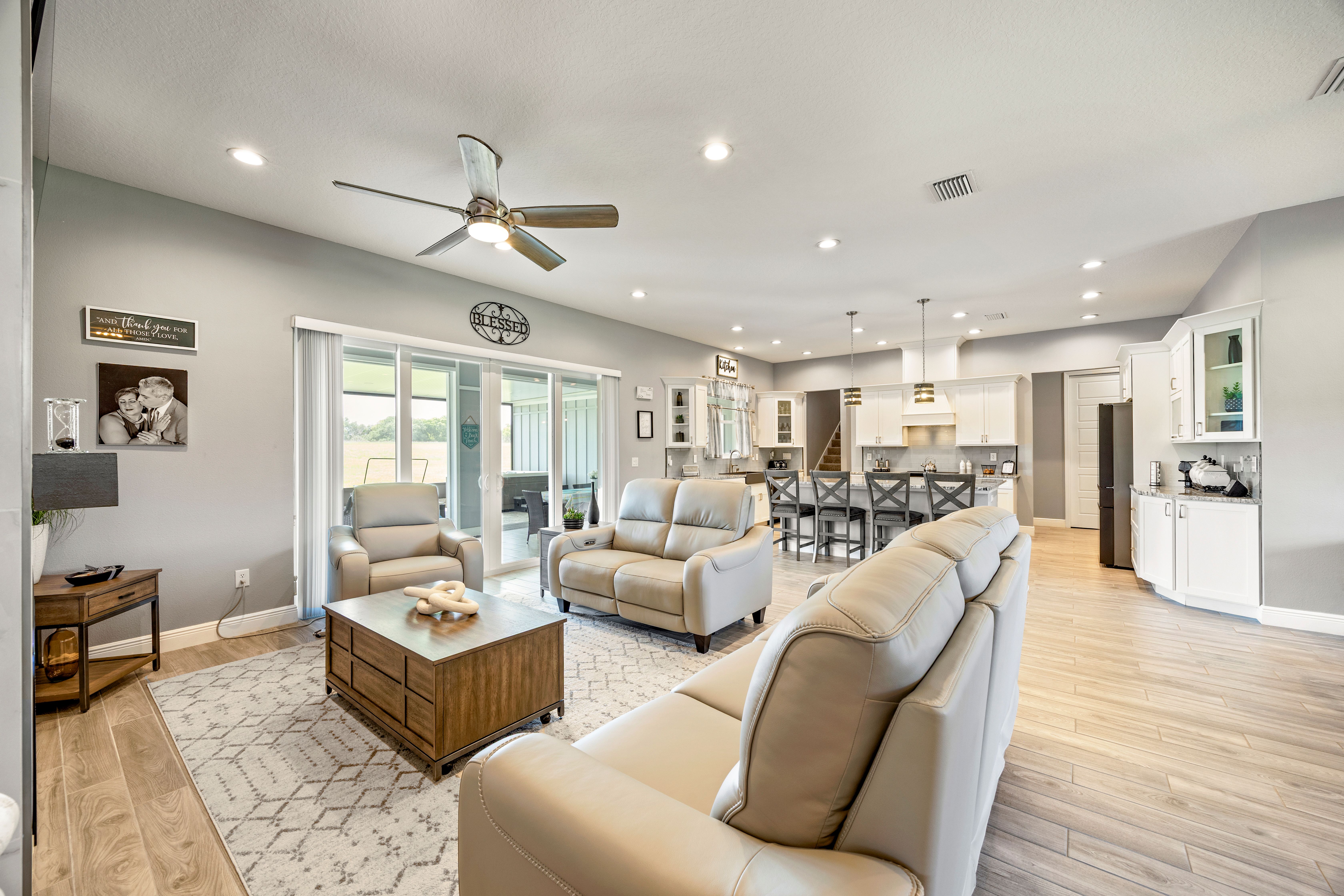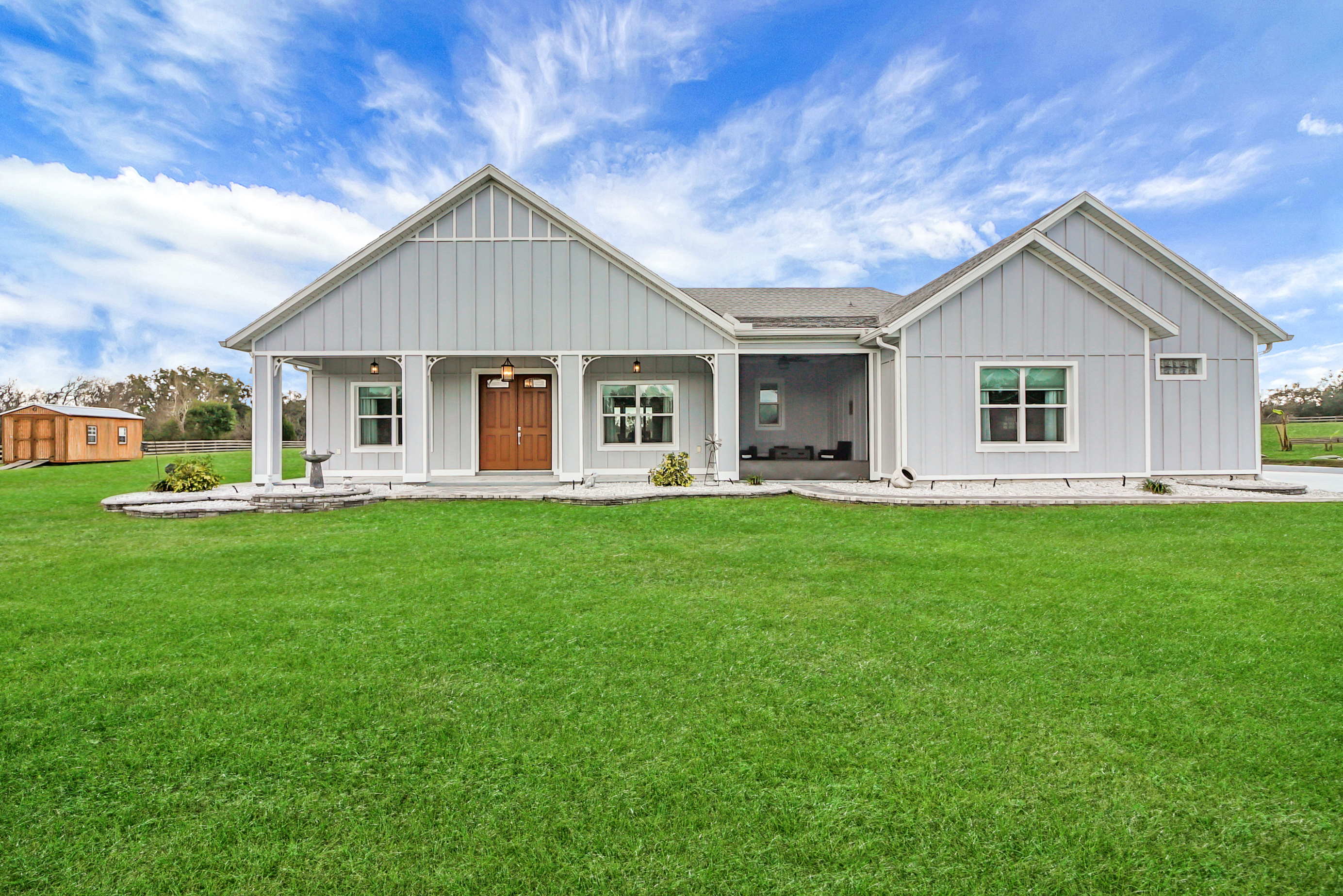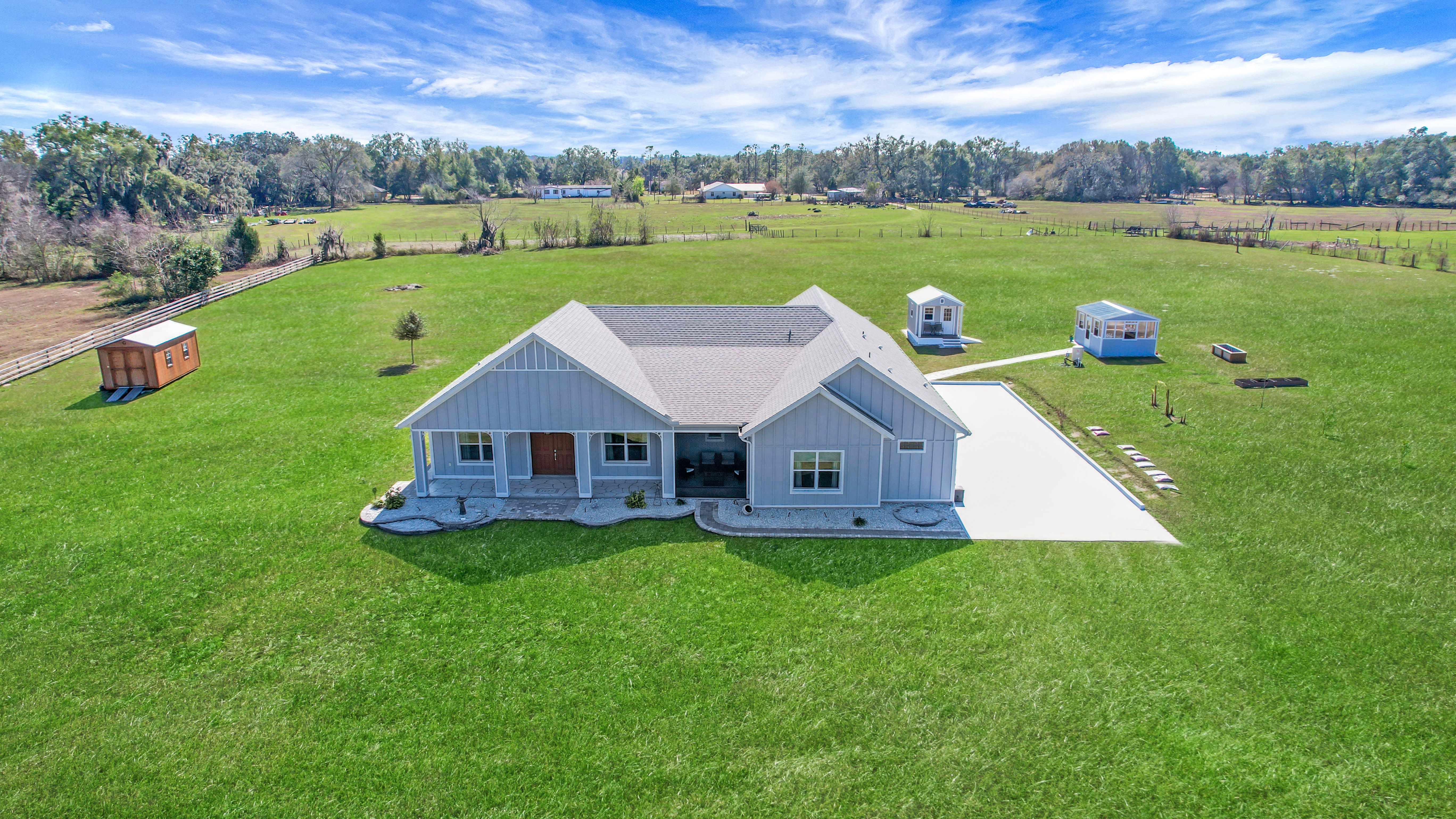 Experience country living at its finest in this stunning custom-built 2021 BLOCK home, finished with Hardie Board planks that create a modern farmhouse feel. Nestled on 5 fully fenced acres with an IRON solar powered gate providing a sense of privacy, this property offers the perfect blend of luxury, comfort, hobbies, and outdoor living. From the moment you arrive, the grand 8-foot double doors welcome you into an open and thoughtfully designed split floor plan featuring 10-foot ceilings, volume spaces, Ceramic wood-look tile flooring, 5-inch baseboards, and an abundance of natural light throughout. The inviting living room showcases an elegant porcelain tile electric fireplace, creating a perfect space to relax and unwind. The chef’s kitchen is truly the heart of the home, offering an expansive breakfast bar with natural quartzite countertops, a farmhouse-style sink, a massive custom walk-in pantry, soft-close cabinetry, high-end fingerprint-resistant stainless steel appliances, recessed and pendant lighting, and a dedicated coffee bar area designed for both function and style. The luxurious primary suite provides a private retreat with a tray ceiling and its own porcelain tile fireplace, while the spa-inspired en suite bathroom features an oversized walk-in shower with multiple shower heads and bench seating, a freestanding whirlpool soaking tub, a bidet toilet, and an impressive California-style walk-in closet complete with built-ins and a sitting area. Just beyond the primary suite, you’ll find a private office, an indoor laundry room, and a convenient half bath. Upstairs, a spacious bonus room offers endless possibilities, whether used as a media room, home gym, or additional guest space. The secondary bedrooms are generously sized and share a full bathroom with a tub and shower combination. Step outside and take in everything this property has to offer, including a charming covered front porch, a screened side porch, and an expansive lanai featuring a six-person hot tub—perfect for entertaining or simply enjoying peaceful evenings. The outdoor space continues with a large paver patio, multiple custom built storage sheds including one with electricity, a greenhouse, and plenty of open land ready for your animals, horses, or recreational toys. This luxury home is full of opportunities including a possible Mini farm if that is your hearts desire, as there are already chickens in place producing eggs and the zoning allows for various other animals as well. The oversized garage is equally impressive, featuring epoxy flooring, a water softener system, a split A/C unit, and additional storage space. Built with spray foam insulation, the home is designed for energy efficiency, helping maintain cooler temperatures year-round. Ideally located just 10 minutes from Brownwood Town Square in The Villages, this property offers the serenity of country living with convenient access to shopping, dining, and entertainment. In addition, this home is situated in a country setting but has easy access to US HWY 301, Interstate 75 and Hwy 44. This one-of-a-kind homestead truly delivers space, luxury, and lifestyle all in one remarkable package. Schedule your private showing today and start living your best life.