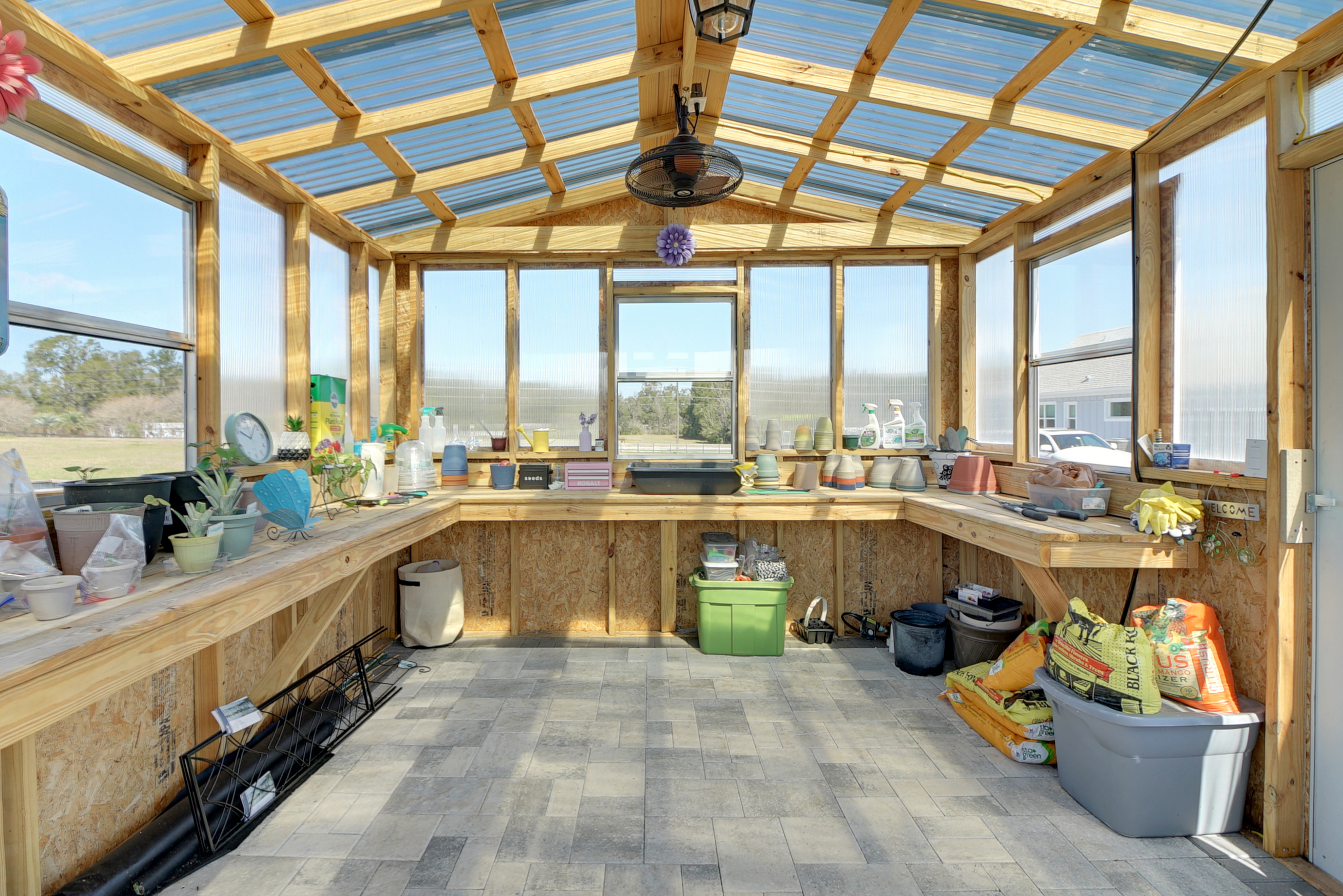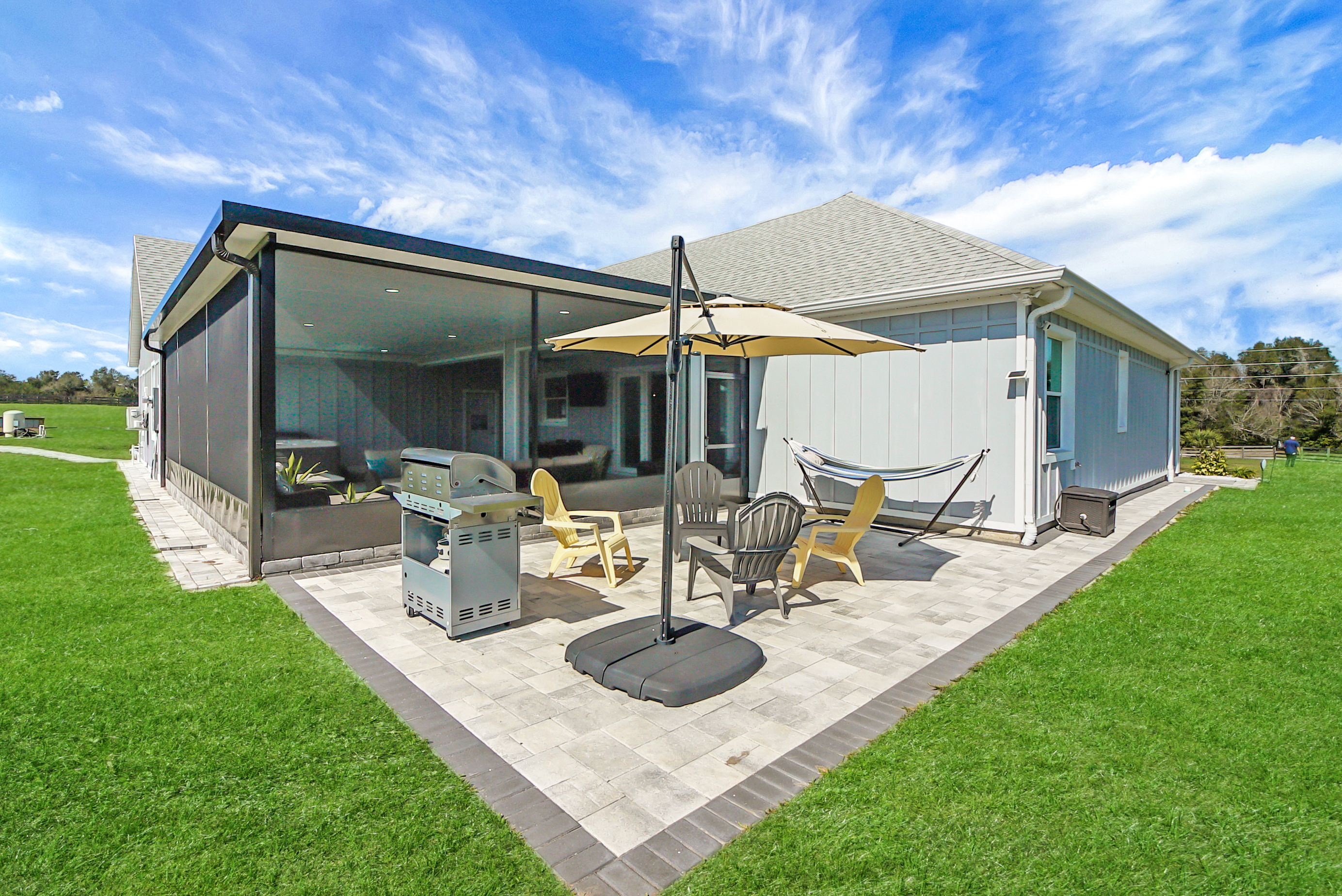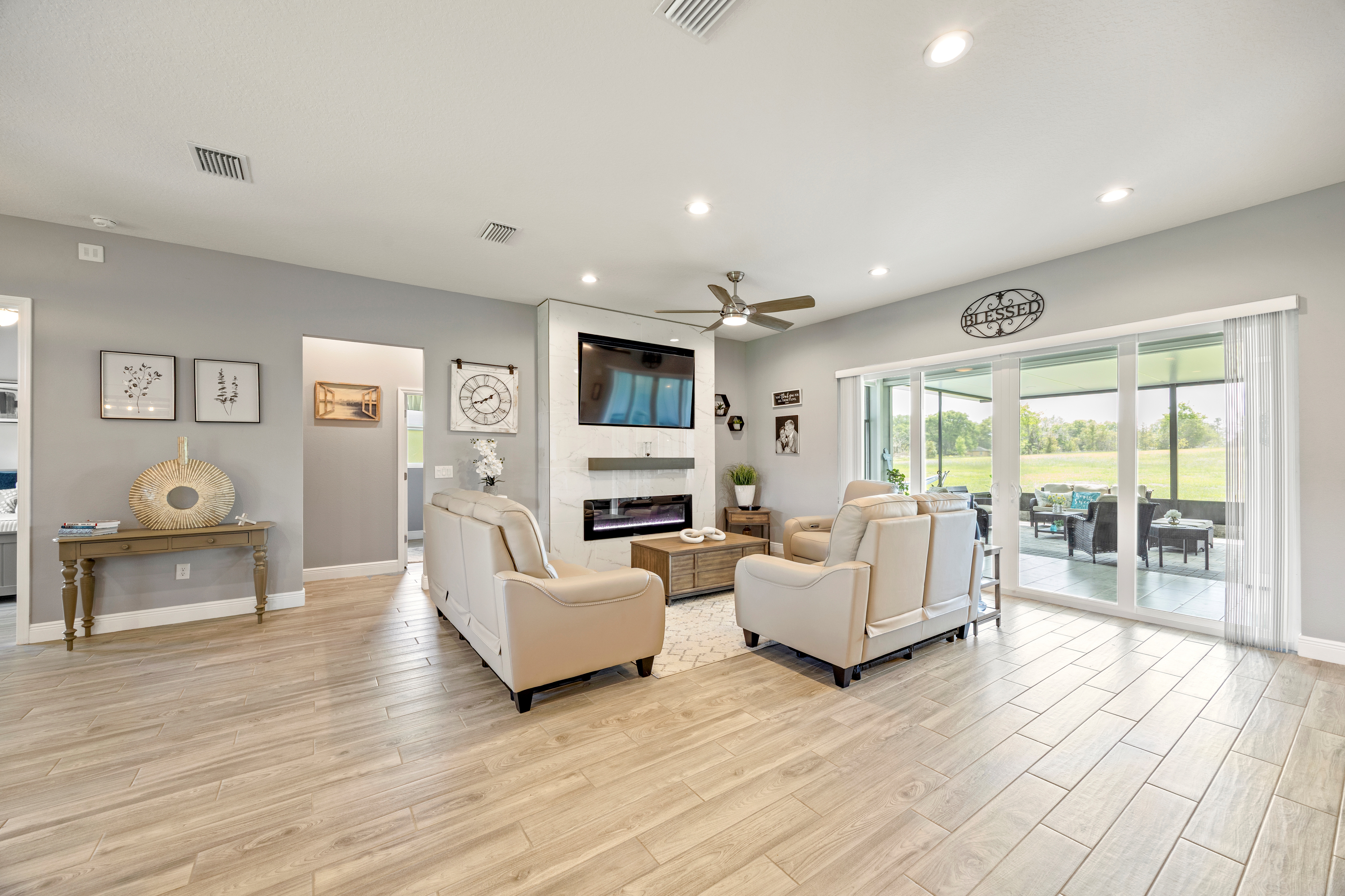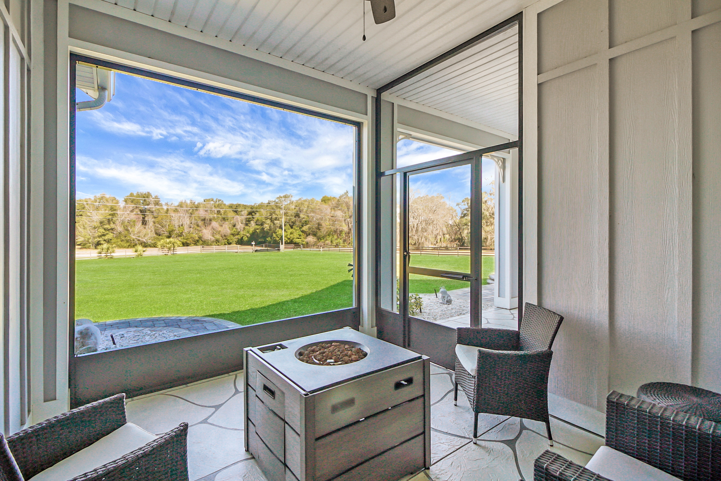 Experience country living at its finest in this stunning custom-built 2021 BLOCK home, finished with Hardie Board planks that create a modern farmhouse feel. Nestled on 5 fully fenced acres with an IRON solar powered gate providing a sense of privacy, this property offers the perfect blend of luxury, comfort, hobbies, and outdoor living. From the moment you arrive, the grand 8-foot double doors welcome you into an open and thoughtfully designed split floor plan featuring 10-foot ceilings, volume spaces, Ceramic wood-look tile flooring, 5-inch baseboards, and an abundance of natural light throughout. The inviting living room showcases an elegant porcelain tile electric fireplace, creating a perfect space to relax and unwind. The chef’s kitchen is truly the heart of the home, offering an expansive breakfast bar with natural quartzite countertops, a farmhouse-style sink, a massive custom walk-in pantry, soft-close cabinetry, high-end fingerprint-resistant stainless steel appliances, recessed and pendant lighting, and a dedicated coffee bar area designed for both function and style. The luxurious primary suite provides a private retreat with a tray ceiling and its own porcelain tile fireplace, while the spa-inspired en suite bathroom features an oversized walk-in shower with multiple shower heads and bench seating, a freestanding whirlpool soaking tub, a bidet toilet, and an impressive California-style walk-in closet complete with built-ins and a sitting area. Just beyond the primary suite, you’ll find a private office, an indoor laundry room, and a convenient half bath. Upstairs, a spacious bonus room offers endless possibilities, whether used as a media room, home gym, or additional guest space. The secondary bedrooms are generously sized and share a full bathroom with a tub and shower combination. Step outside and take in everything this property has to offer, including a charming covered front porch, a screened side porch, and an expansive lanai featuring a six-person hot tub—perfect for entertaining or simply enjoying peaceful evenings. The outdoor space continues with a large paver patio, multiple custom built storage sheds including one with electricity, a greenhouse, and plenty of open land ready for your animals, horses, or recreational toys. This luxury home is full of opportunities including a possible Mini farm if that is your hearts desire, as there are already chickens in place producing eggs and the zoning allows for various other animals as well. The oversized garage is equally impressive, featuring epoxy flooring, a water softener system, a split A/C unit, and additional storage space. Built with spray foam insulation, the home is designed for energy efficiency, helping maintain cooler temperatures year-round. Ideally located just 10 minutes from Brownwood Town Square in The Villages, this property offers the serenity of country living with convenient access to shopping, dining, and entertainment. In addition, this home is situated in a country setting but has easy access to US HWY 301, Interstate 75 and Hwy 44. This one-of-a-kind homestead truly delivers space, luxury, and lifestyle all in one remarkable package. Schedule your private showing today and start living your best life.