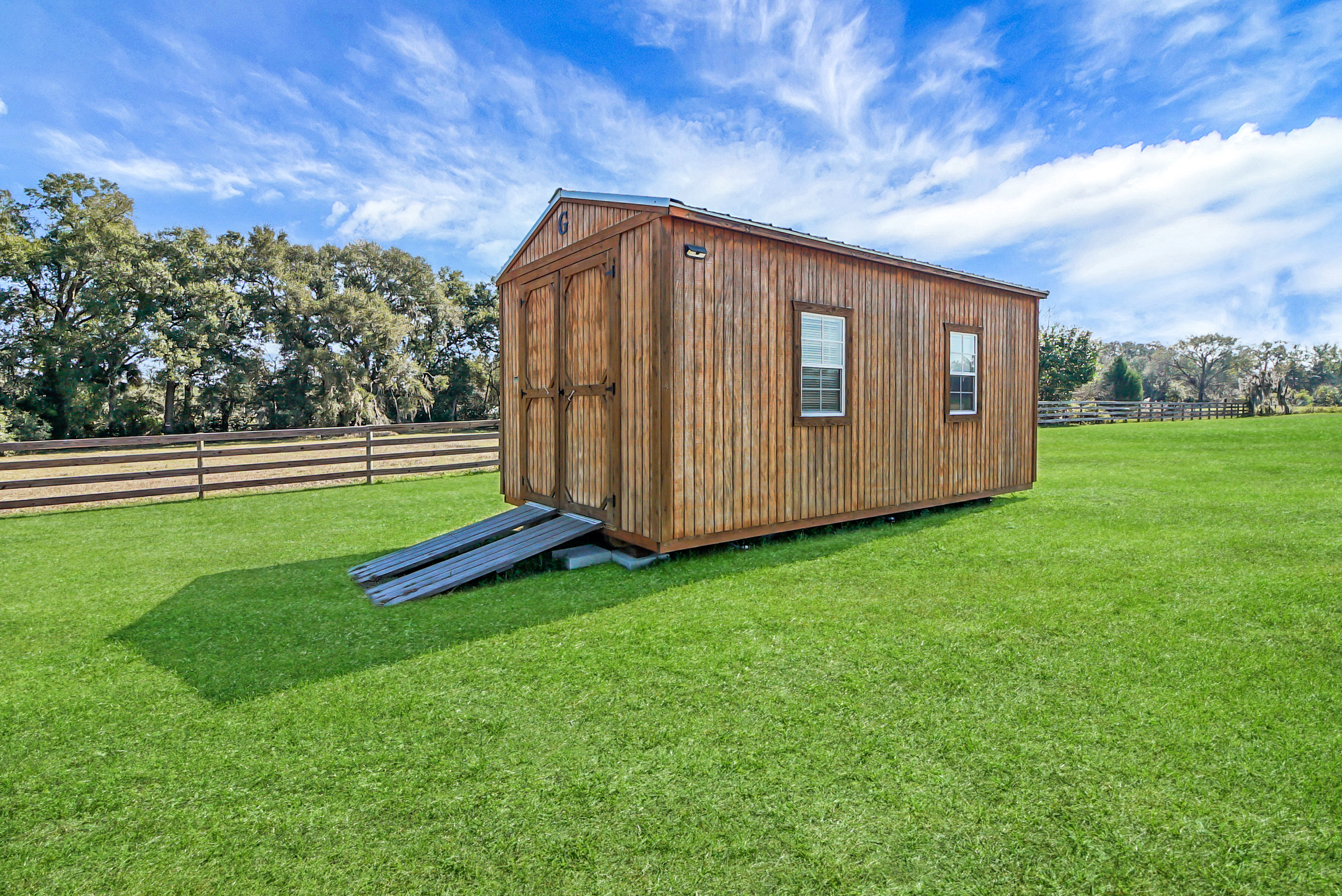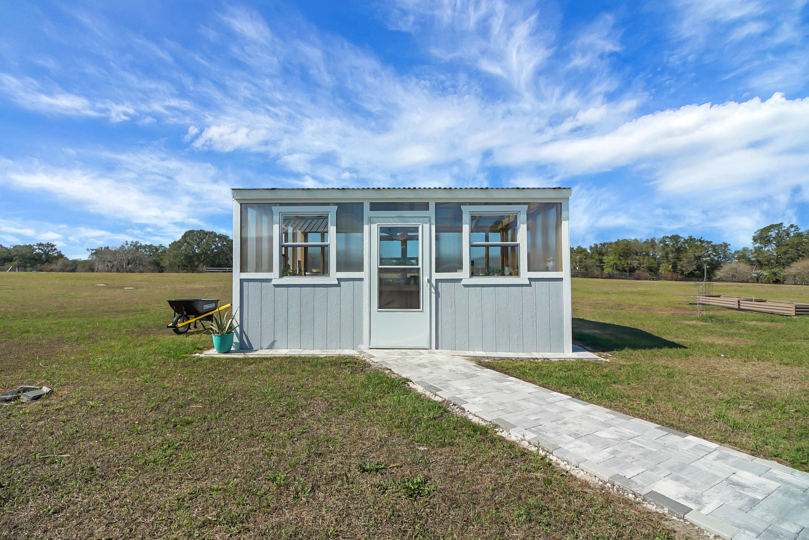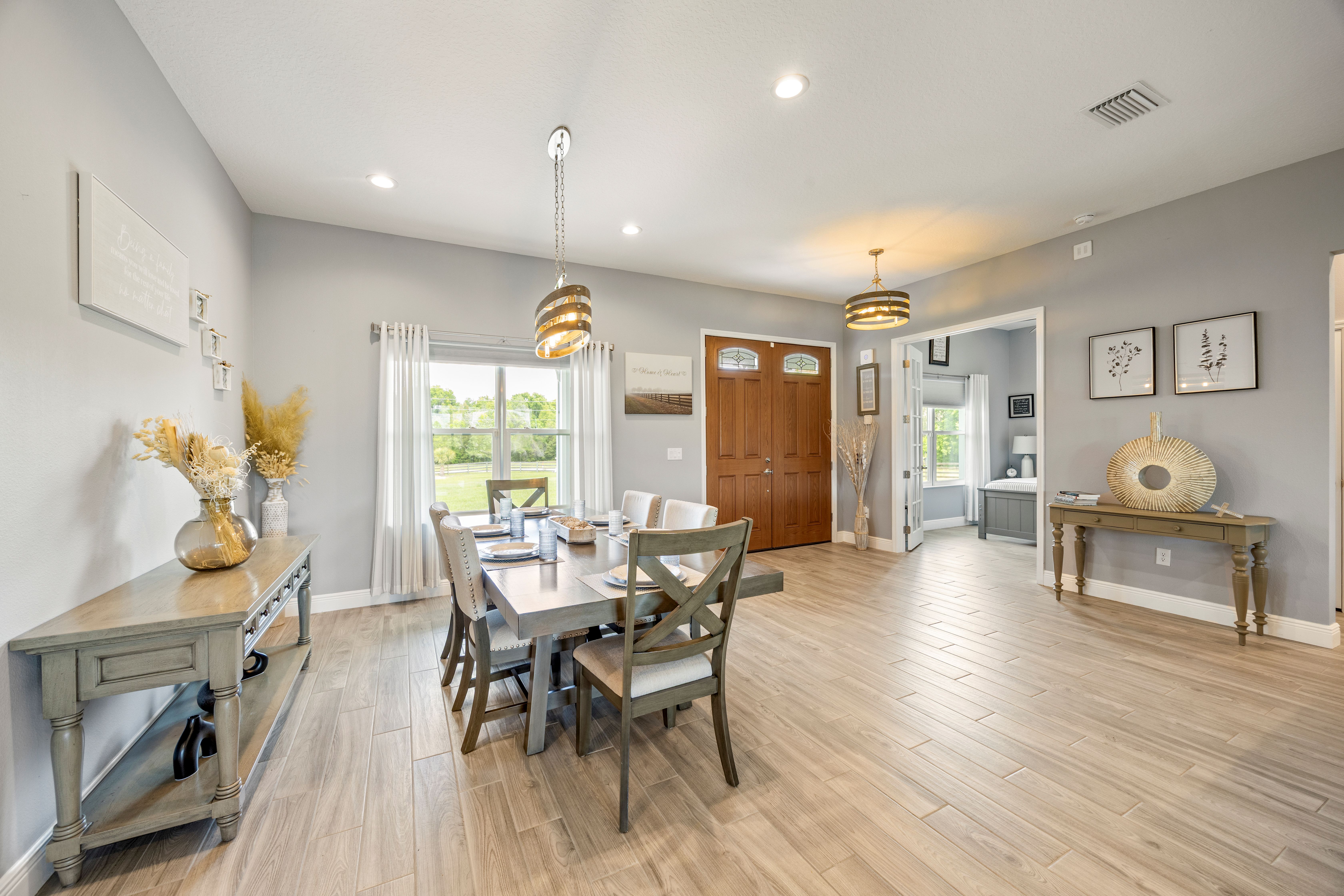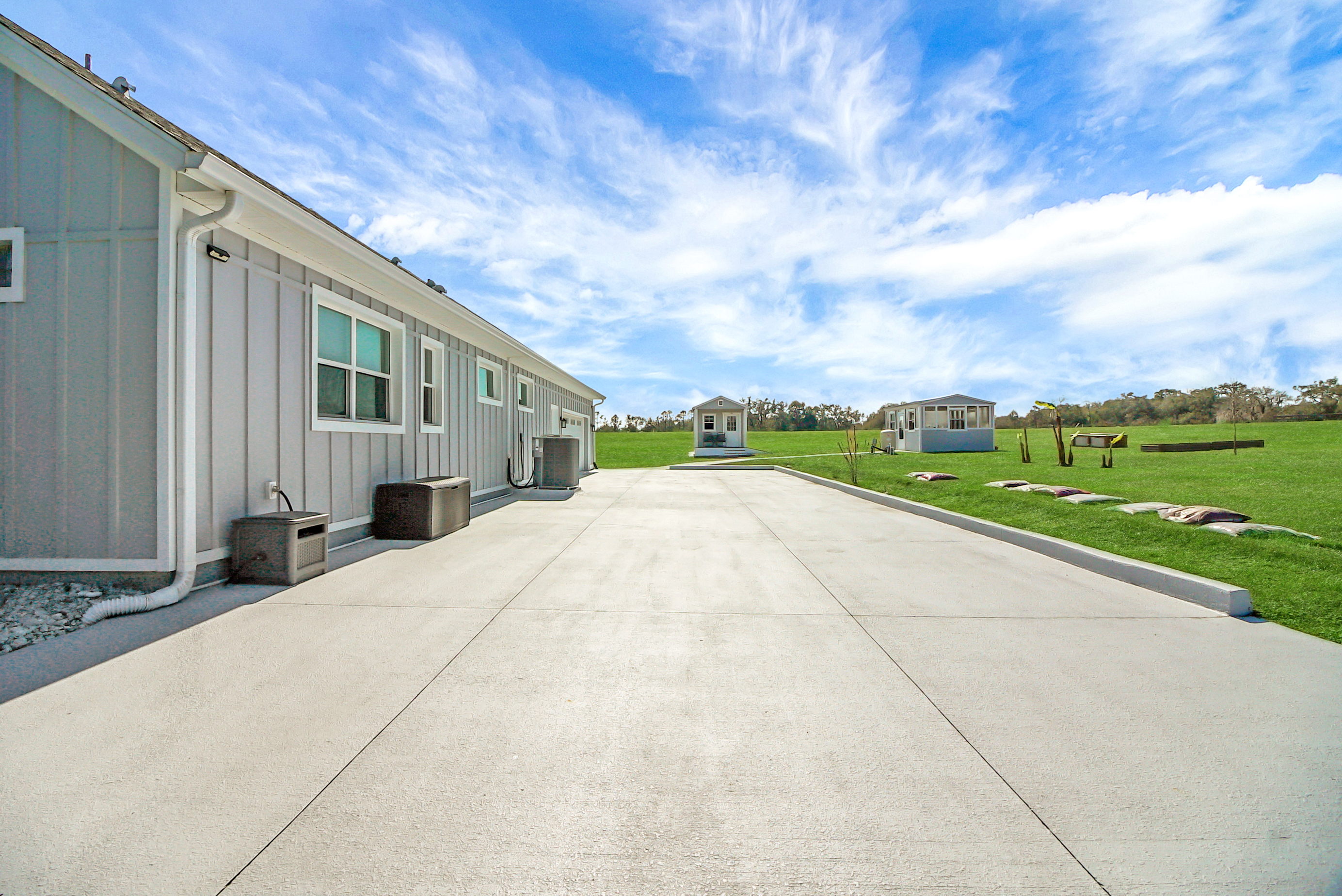 Experience country living at its finest in this stunning custom-built 2021 BLOCK home, finished with Hardie Board planks that create a modern farmhouse feel. Nestled on 5 fully fenced acres with an IRON solar powered gate providing a sense of privacy, this property offers the perfect blend of luxury, comfort, hobbies, and outdoor living. From the moment you arrive, the grand 8-foot double doors welcome you into an open and thoughtfully designed split floor plan featuring 10-foot ceilings, volume spaces, Ceramic wood-look tile flooring, 5-inch baseboards, and an abundance of natural light throughout. The inviting living room showcases an elegant porcelain tile electric fireplace, creating a perfect space to relax and unwind. The chef’s kitchen is truly the heart of the home, offering an expansive breakfast bar with natural quartzite countertops, a farmhouse-style sink, a massive custom walk-in pantry, soft-close cabinetry, high-end fingerprint-resistant stainless steel appliances, recessed and pendant lighting, and a dedicated coffee bar area designed for both function and style. The luxurious primary suite provides a private retreat with a tray ceiling and its own porcelain tile fireplace, while the spa-inspired en suite bathroom features an oversized walk-in shower with multiple shower heads and bench seating, a freestanding whirlpool soaking tub, a bidet toilet, and an impressive California-style walk-in closet complete with built-ins and a sitting area. Just beyond the primary suite, you’ll find a private office, an indoor laundry room, and a convenient half bath. Upstairs, a spacious bonus room offers endless possibilities, whether used as a media room, home gym, or additional guest space. The secondary bedrooms are generously sized and share a full bathroom with a tub and shower combination. Step outside and take in everything this property has to offer, including a charming covered front porch, a screened side porch, and an expansive lanai featuring a six-person hot tub—perfect for entertaining or simply enjoying peaceful evenings. The outdoor space continues with a large paver patio, multiple custom built storage sheds including one with electricity, a greenhouse, and plenty of open land ready for your animals, horses, or recreational toys. This luxury home is full of opportunities including a possible Mini farm if that is your hearts desire, as there are already chickens in place producing eggs and the zoning allows for various other animals as well. The oversized garage is equally impressive, featuring epoxy flooring, a water softener system, a split A/C unit, and additional storage space. Built with spray foam insulation, the home is designed for energy efficiency, helping maintain cooler temperatures year-round. Ideally located just 10 minutes from Brownwood Town Square in The Villages, this property offers the serenity of country living with convenient access to shopping, dining, and entertainment. In addition, this home is situated in a country setting but has easy access to US HWY 301, Interstate 75 and Hwy 44. This one-of-a-kind homestead truly delivers space, luxury, and lifestyle all in one remarkable package. Schedule your private showing today and start living your best life.