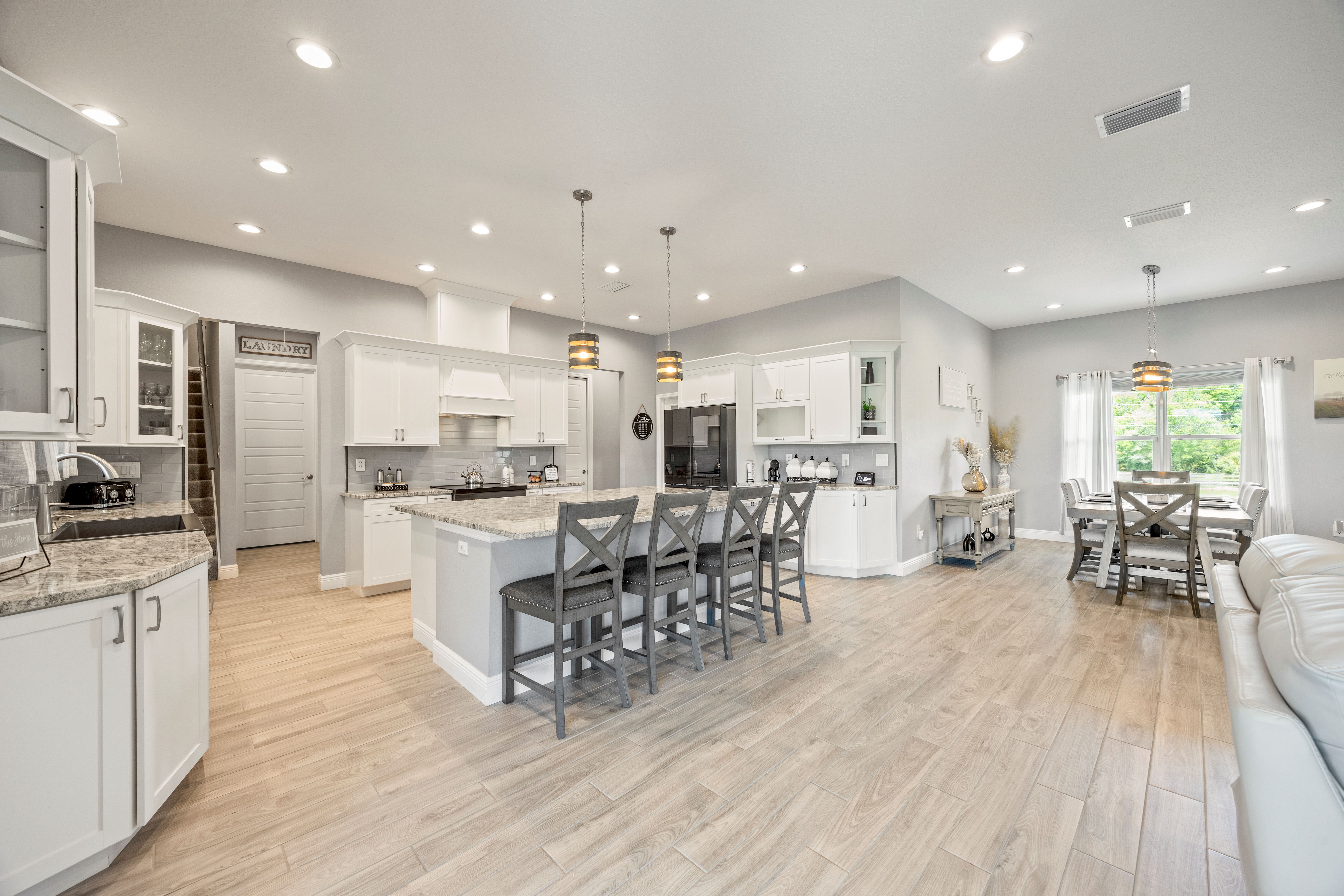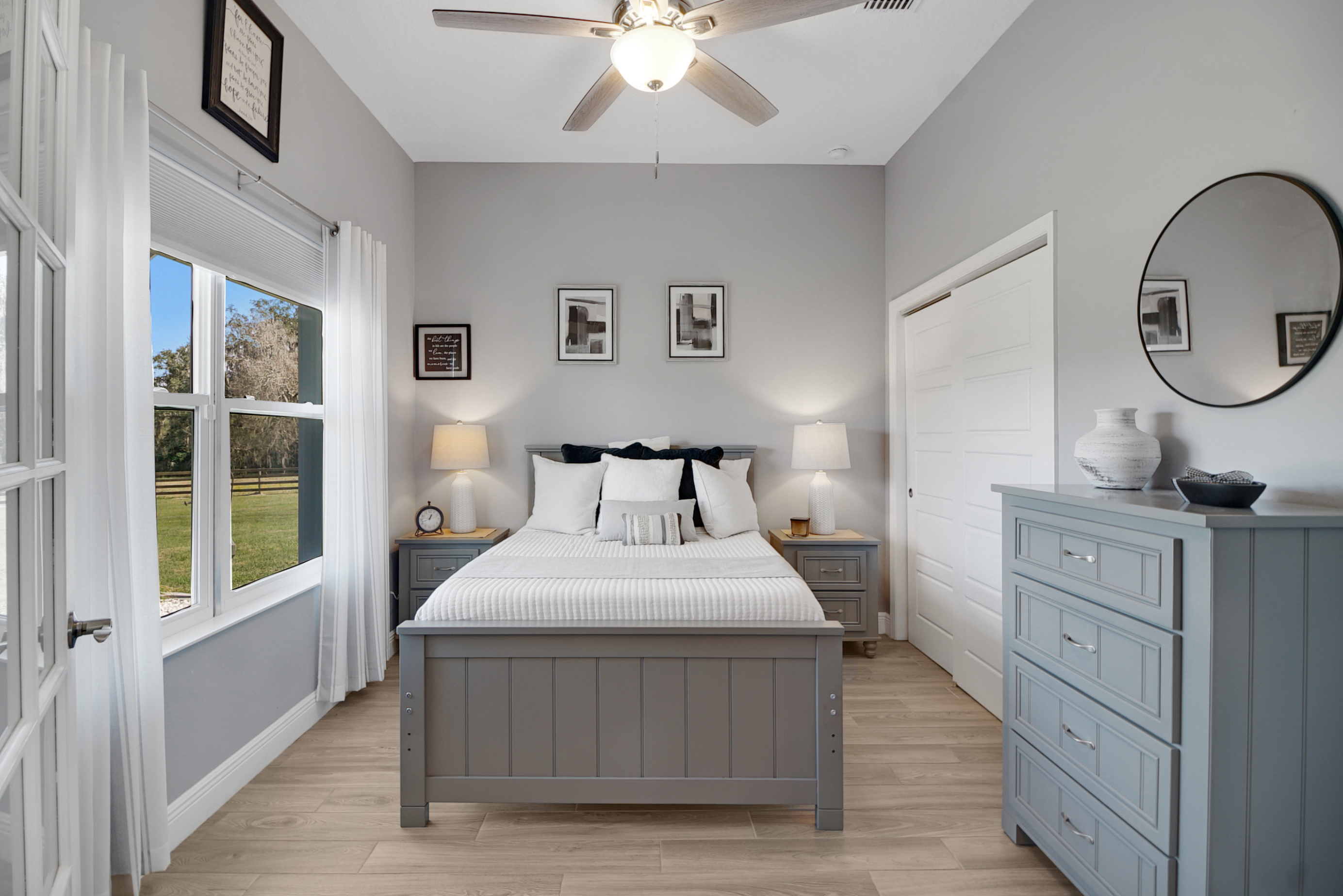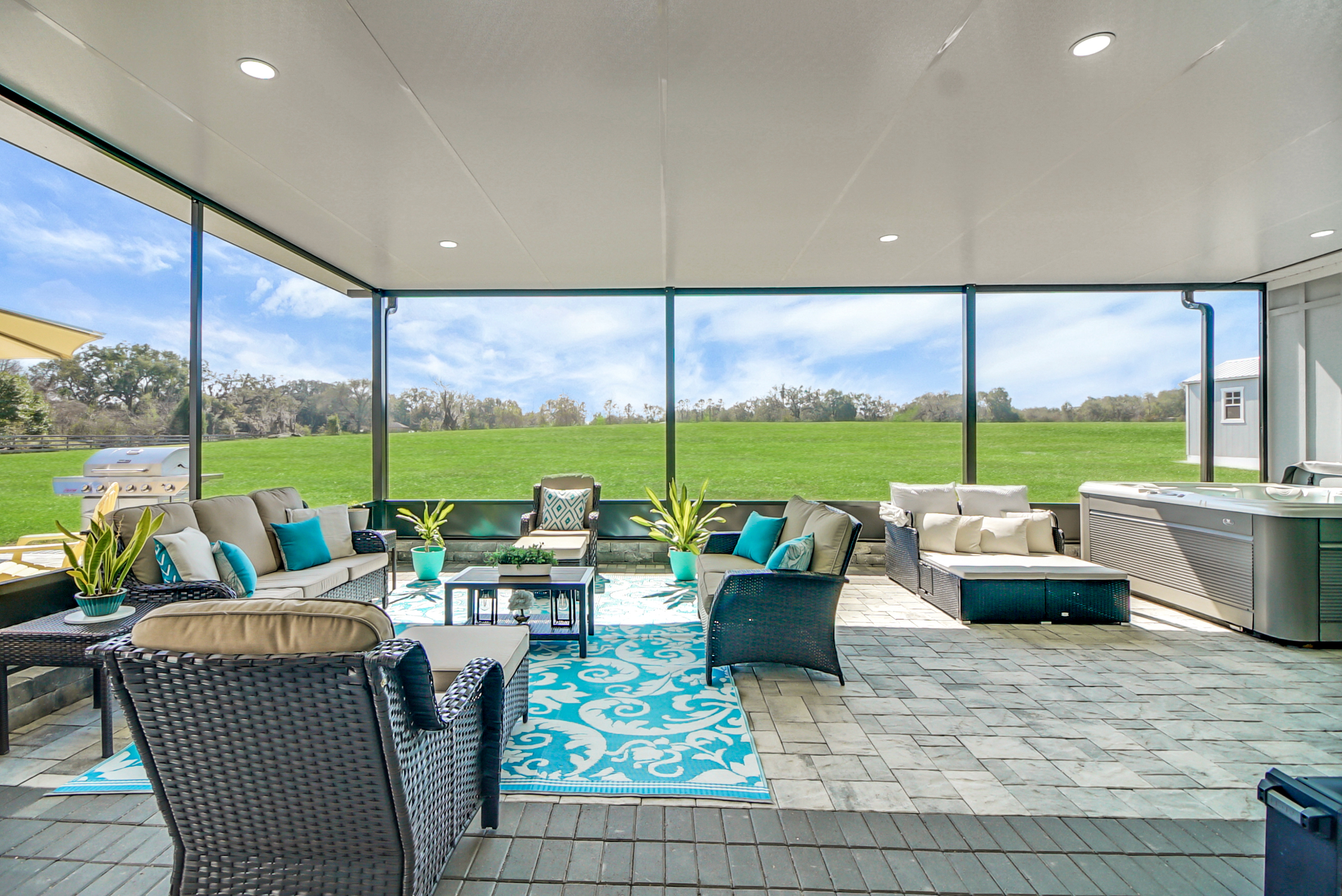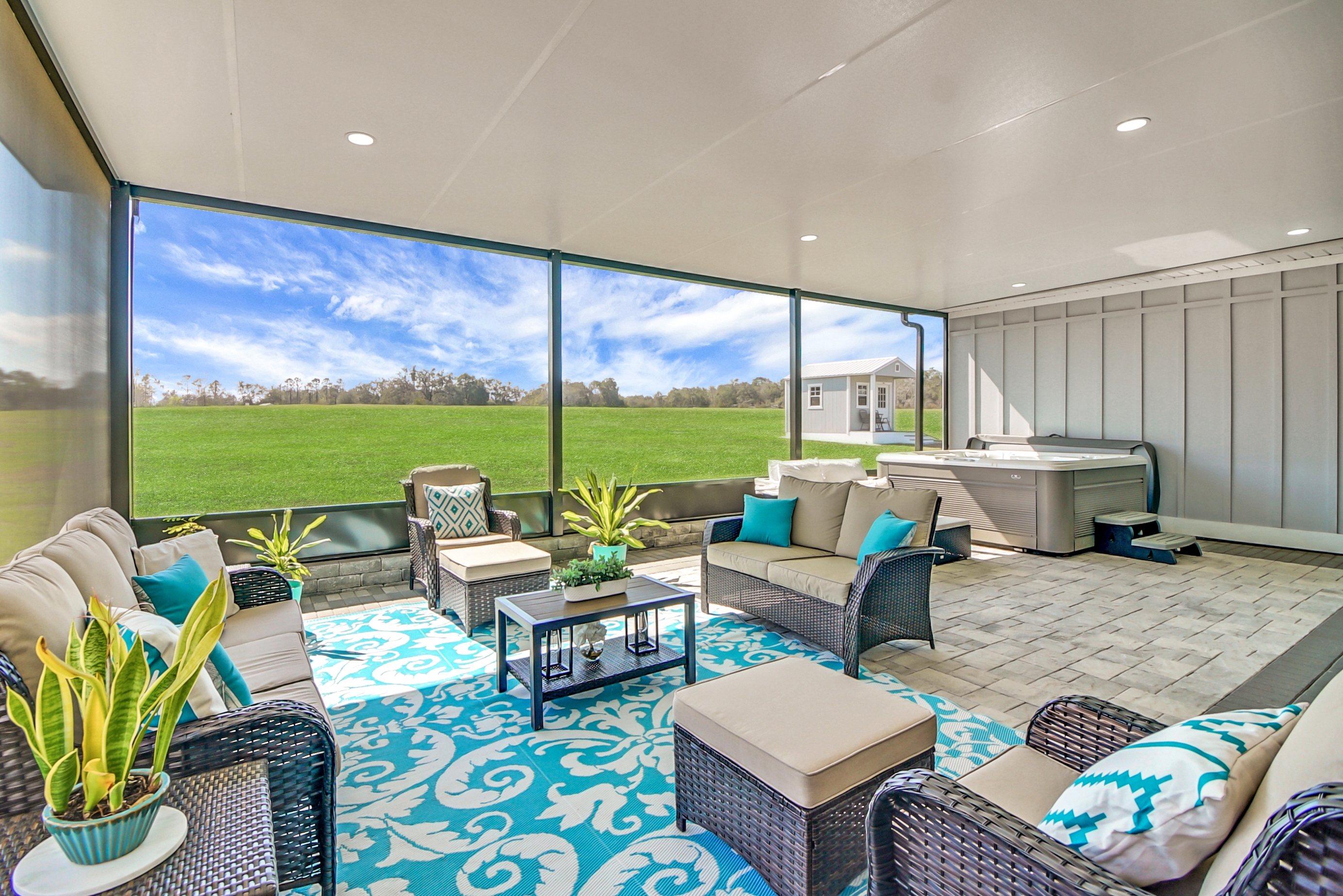 Experience country living at its finest in this stunning custom-built 2021 BLOCK home, finished with Hardie Board planks that create a modern farmhouse feel. Nestled on 5 fully fenced acres with an IRON solar powered gate providing a sense of privacy, this property offers the perfect blend of luxury, comfort, hobbies, and outdoor living. From the moment you arrive, the grand 8-foot double doors welcome you into an open and thoughtfully designed split floor plan featuring 10-foot ceilings, volume spaces, Ceramic wood-look tile flooring, 5-inch baseboards, and an abundance of natural light throughout. The inviting living room showcases an elegant porcelain tile electric fireplace, creating a perfect space to relax and unwind. The chef’s kitchen is truly the heart of the home, offering an expansive breakfast bar with natural quartzite countertops, a farmhouse-style sink, a massive custom walk-in pantry, soft-close cabinetry, high-end fingerprint-resistant stainless steel appliances, recessed and pendant lighting, and a dedicated coffee bar area designed for both function and style. The luxurious primary suite provides a private retreat with a tray ceiling and its own porcelain tile fireplace, while the spa-inspired en suite bathroom features an oversized walk-in shower with multiple shower heads and bench seating, a freestanding whirlpool soaking tub, a bidet toilet, and an impressive California-style walk-in closet complete with built-ins and a sitting area. Just beyond the primary suite, you’ll find a private office, an indoor laundry room, and a convenient half bath. Upstairs, a spacious bonus room offers endless possibilities, whether used as a media room, home gym, or additional guest space. The secondary bedrooms are generously sized and share a full bathroom with a tub and shower combination. Step outside and take in everything this property has to offer, including a charming covered front porch, a screened side porch, and an expansive lanai featuring a six-person hot tub—perfect for entertaining or simply enjoying peaceful evenings. The outdoor space continues with a large paver patio, multiple custom built storage sheds including one with electricity, a greenhouse, and plenty of open land ready for your animals, horses, or recreational toys. This luxury home is full of opportunities including a possible Mini farm if that is your hearts desire, as there are already chickens in place producing eggs and the zoning allows for various other animals as well. The oversized garage is equally impressive, featuring epoxy flooring, a water softener system, a split A/C unit, and additional storage space. Built with spray foam insulation, the home is designed for energy efficiency, helping maintain cooler temperatures year-round. Ideally located just 10 minutes from Brownwood Town Square in The Villages, this property offers the serenity of country living with convenient access to shopping, dining, and entertainment. In addition, this home is situated in a country setting but has easy access to US HWY 301, Interstate 75 and Hwy 44. This one-of-a-kind homestead truly delivers space, luxury, and lifestyle all in one remarkable package. Schedule your private showing today and start living your best life.