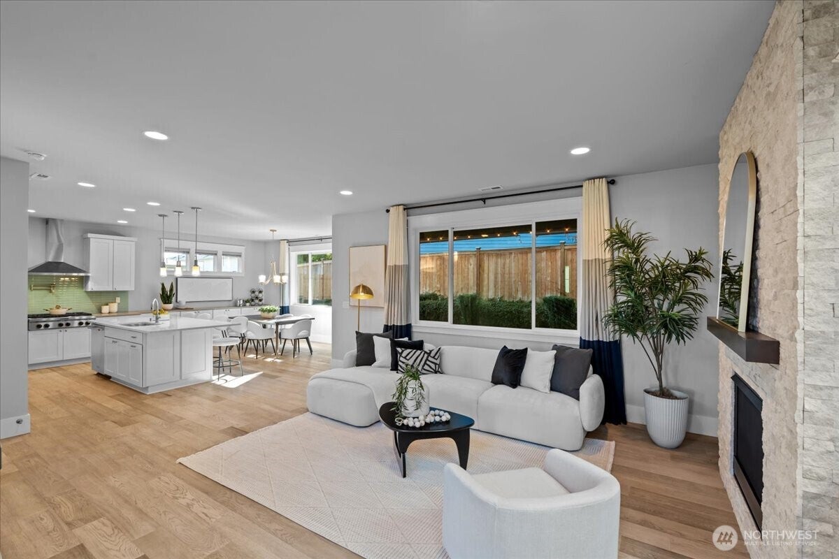 Welcome to Vintners Place, an inviting and thoughtfully designed home nestled in a newer Kirkland community, just minutes from Totem Lake Village, Redmond, and the Eastside tech corridor. Situated on a quiet cul-de-sac, this residence offers a blend of comfort, functionality, and modern finishes. The main level features a great room with 9-foot ceilings and wood flooring, creating an open, connected space ideal for everyday living and entertaining. The kitchen is well-appointed with a large island and stainless steel appliances, including a double oven, gas cooktop, and range hood. Quartz countertops, a full-height tile backsplash, and a pantry complete the space with both style and practicality. Climbing the stairs, enjoy beautiful views of the morning sunrise and Cascade Mountains. A versatile loft provides flexible space for a home office, media area, or additional bonus room. The primary suite is privately situated and features a walk-in closet, an en-suite bath with a soaking tub and tile shower. Additional highlights include a gas fireplace, covered patio, and a low-maintenance yard, offering effortless indoor-outdoor living. Located in a community with green spaces, a playground, dog park, and walking path, this move-in ready home delivers a well-rounded lifestyle in a highly convenient location. Served by the Lake Washington School District. Pre-inspected by the seller, this home reflects true pride of ownership throughout.