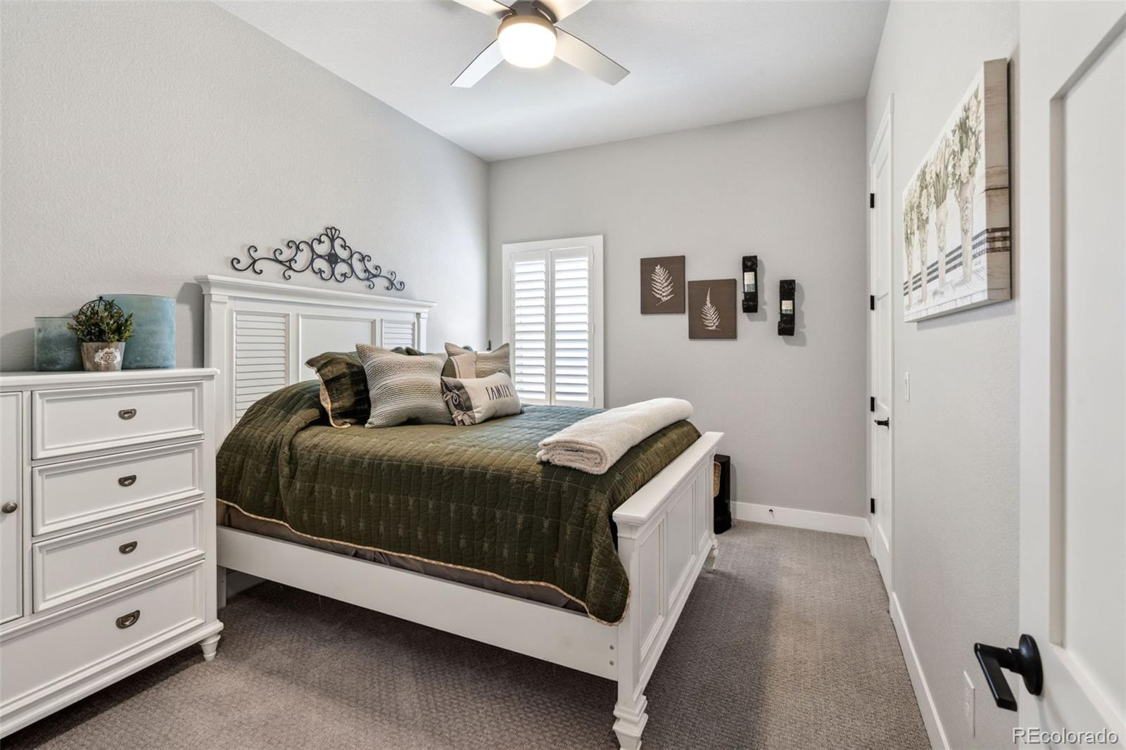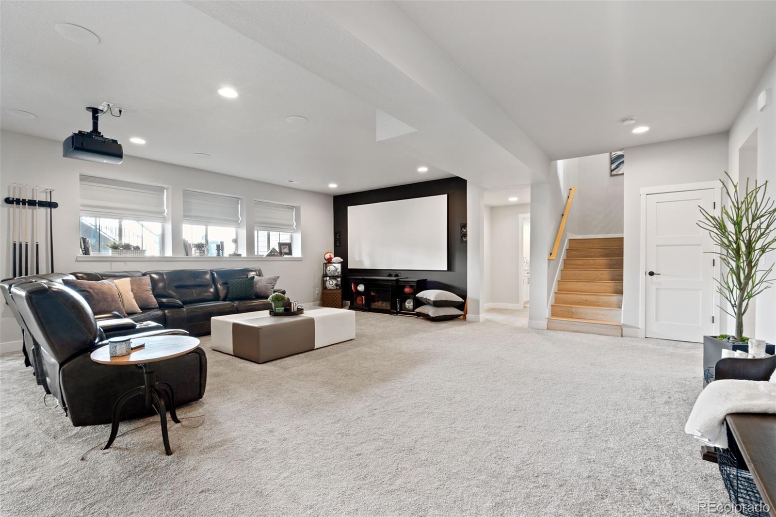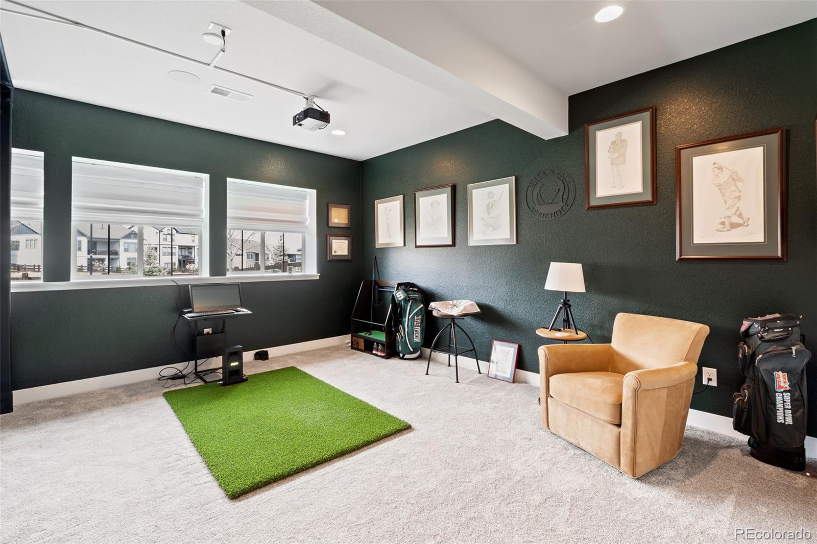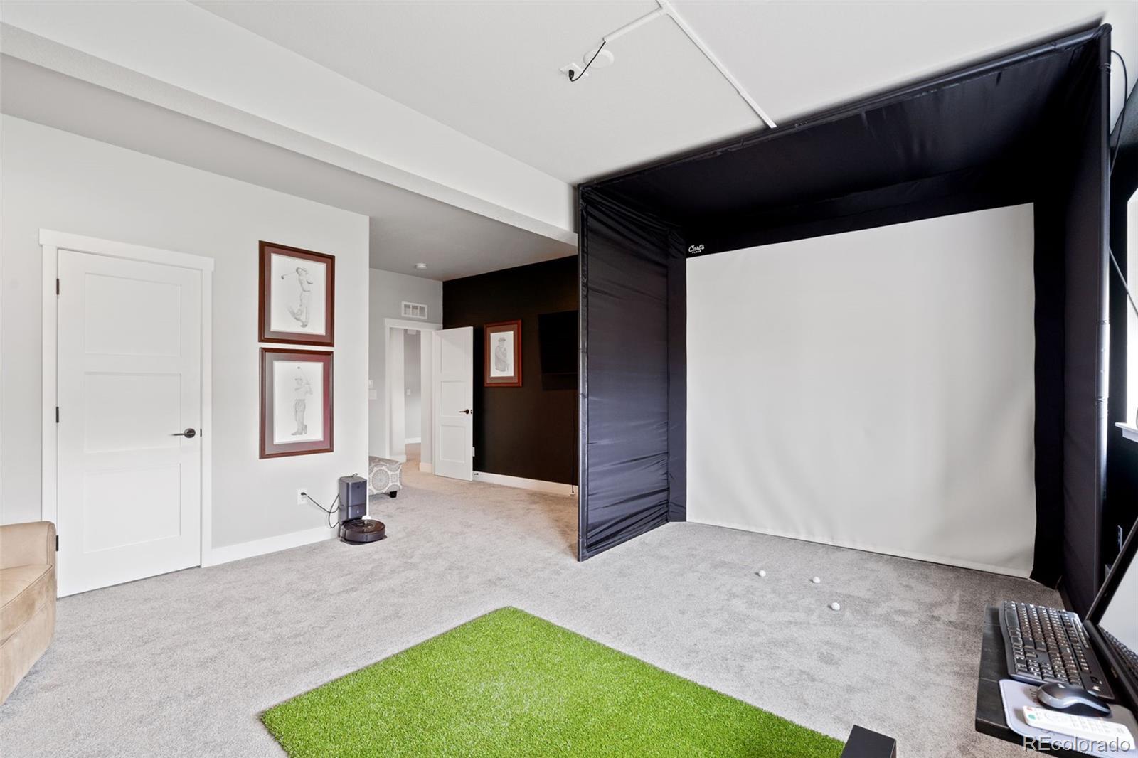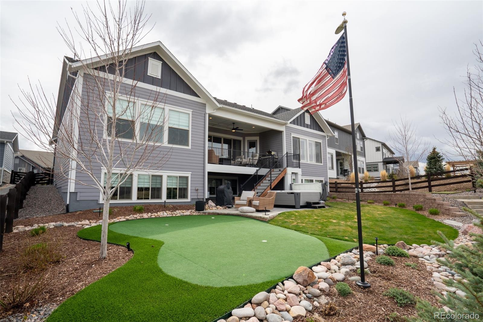 Rarely does a semi-custom ranch of this magnitude become available, offering a masterclass in luxury, and design From the moment you approach the custom front door framed by professional landscaping with elegant retaining walls, and architectural up-lighting. The quality is undeniable. The main level features a sprawling, open-concept layout where an stunning great room with a custom shiplap fireplace flows into a true chefs sanctuary. The kitchen is anchored by an oversized Super Slab granite island and features high-end Caf appliances, a 36 cooktop, and ceiling-height cabinetry with integrated upper, under, and glass-window lighting. Three spacious main-floor bedrooms, three bathrooms, and a dedicated executive office are all elevated by upgraded Kichler lighting, dimmer switches, and premium Levolor wood shutters and Roman blinds. The finished basement expands your living space with a professional home theater, featuring a 110 framed screen, projector, and integrated electronic rack. This level is fully equipped for entertaining or multi-generational living with a second kitchen, an additional bedroom, and a massive flex room perfect for a home gym, second office or bedroom (just add a door). Substantial closet space throughout the home. The primary closet is 10x12 and every room has a walk-in closet if not two (dedicated craft room closet, is amazing), plus linen closets and flex storage in the basement. The experience culminates in a backyard oasis that rivals a private resort. Step onto the expansive paver patio to find a PGA-designed synthetic putting green with a chipping tee, a luxurious spa (240V), and a lush canopy of seven hardwood trees and over 75 perennials. The entire grounds are illuminated by a sophisticated 15-light patio system and extensive up-lighting, all openings up to green space and mountain views.