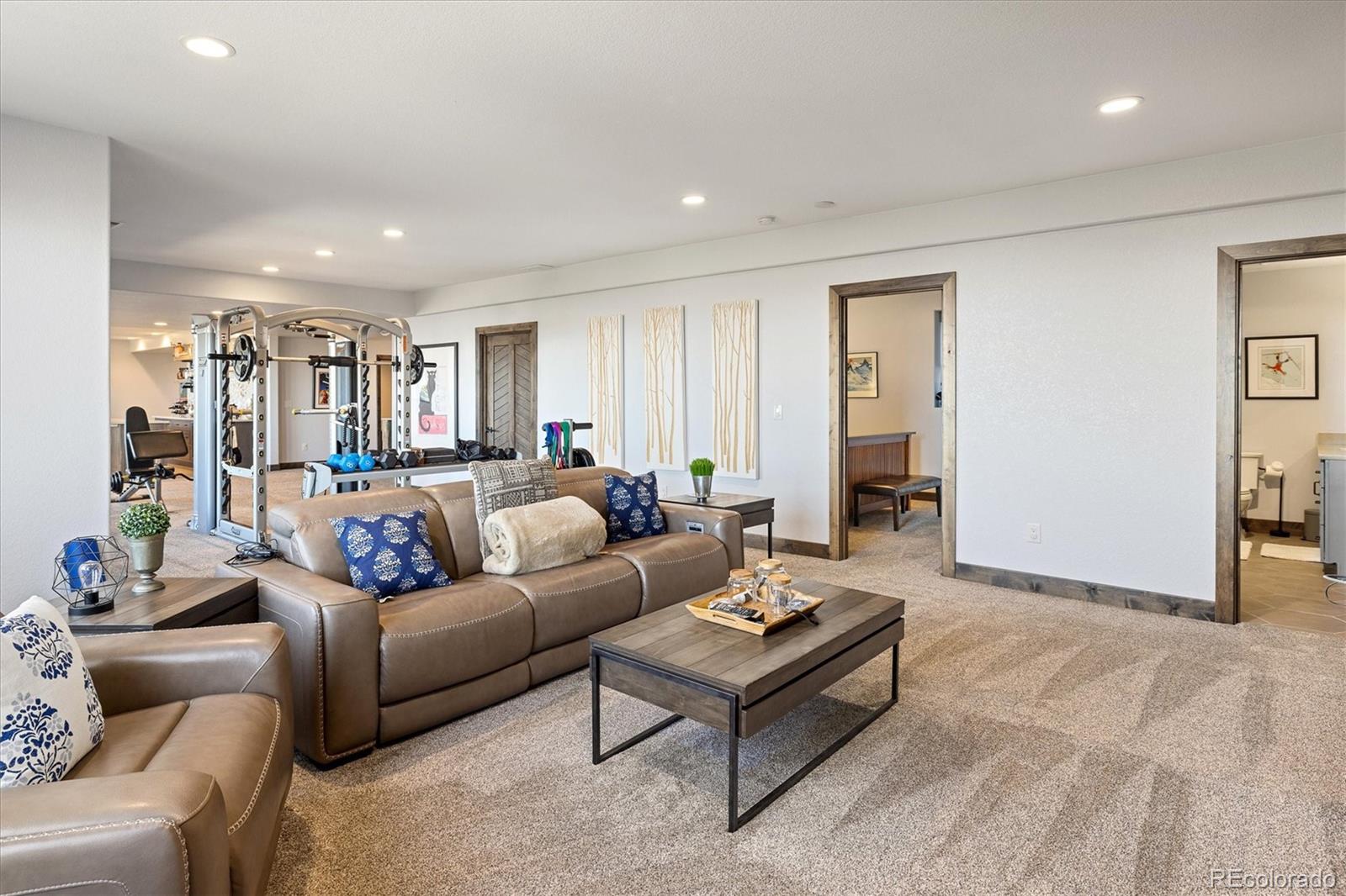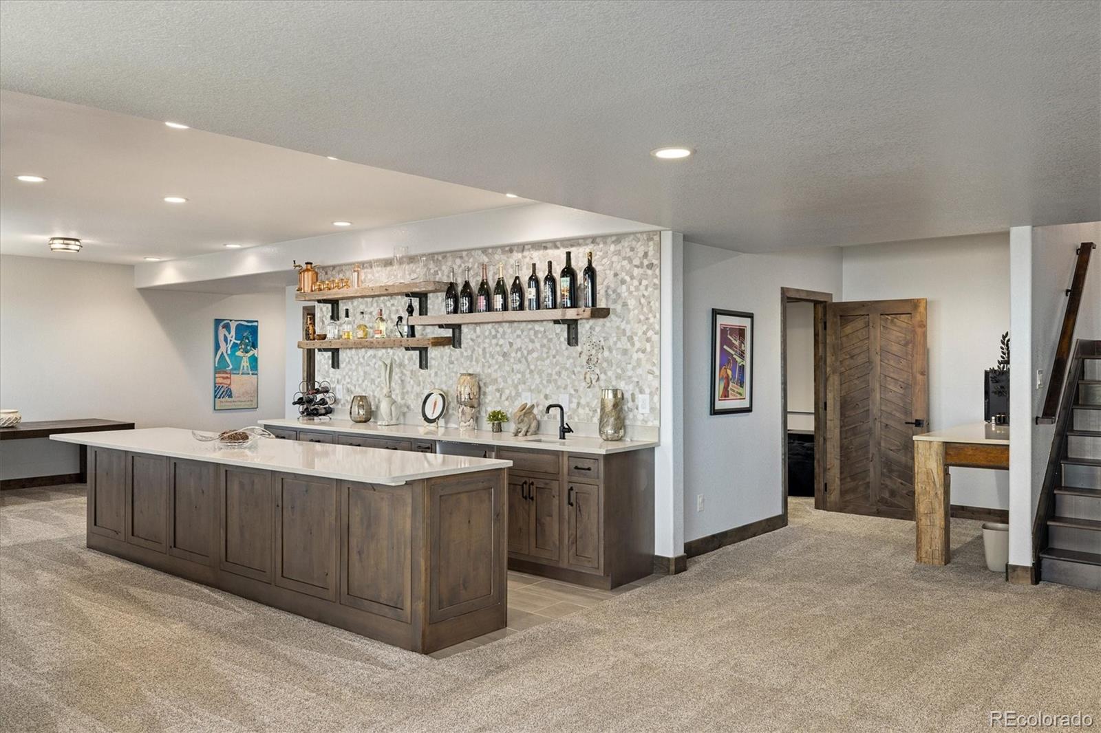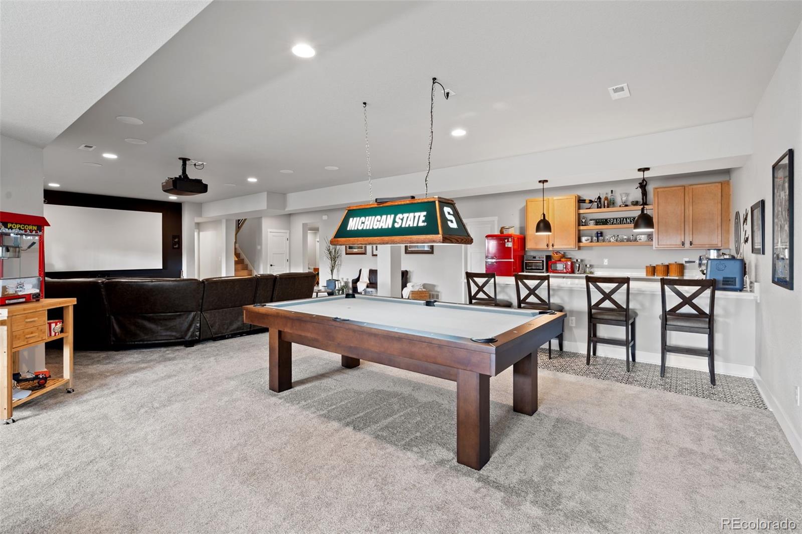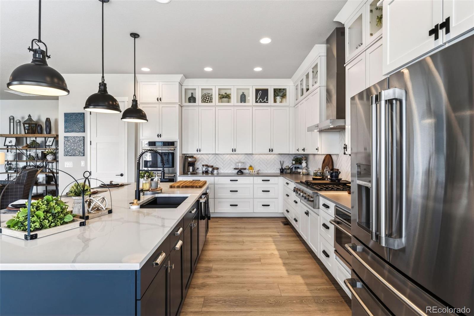 Rarely does a semi-custom ranch of this magnitude become available, offering a masterclass in luxury, and design From the moment you approach the custom front door framed by professional landscaping with elegant retaining walls, and architectural up-lighting. The quality is undeniable. The main level features a sprawling, open-concept layout where an stunning great room with a custom shiplap fireplace flows into a true chefs sanctuary. The kitchen is anchored by an oversized Super Slab granite island and features high-end Caf appliances, a 36 cooktop, and ceiling-height cabinetry with integrated upper, under, and glass-window lighting. Three spacious main-floor bedrooms, three bathrooms, and a dedicated executive office are all elevated by upgraded Kichler lighting, dimmer switches, and premium Levolor wood shutters and Roman blinds. The finished basement expands your living space with a professional home theater, featuring a 110 framed screen, projector, and integrated electronic rack. This level is fully equipped for entertaining or multi-generational living with a second kitchen, an additional bedroom, and a massive flex room perfect for a home gym, second office or bedroom (just add a door). Substantial closet space throughout the home. The primary closet is 10x12 and every room has a walk-in closet if not two (dedicated craft room closet, is amazing), plus linen closets and flex storage in the basement. The experience culminates in a backyard oasis that rivals a private resort. Step onto the expansive paver patio to find a PGA-designed synthetic putting green with a chipping tee, a luxurious spa (240V), and a lush canopy of seven hardwood trees and over 75 perennials. The entire grounds are illuminated by a sophisticated 15-light patio system and extensive up-lighting, all openings up to green space and mountain views.