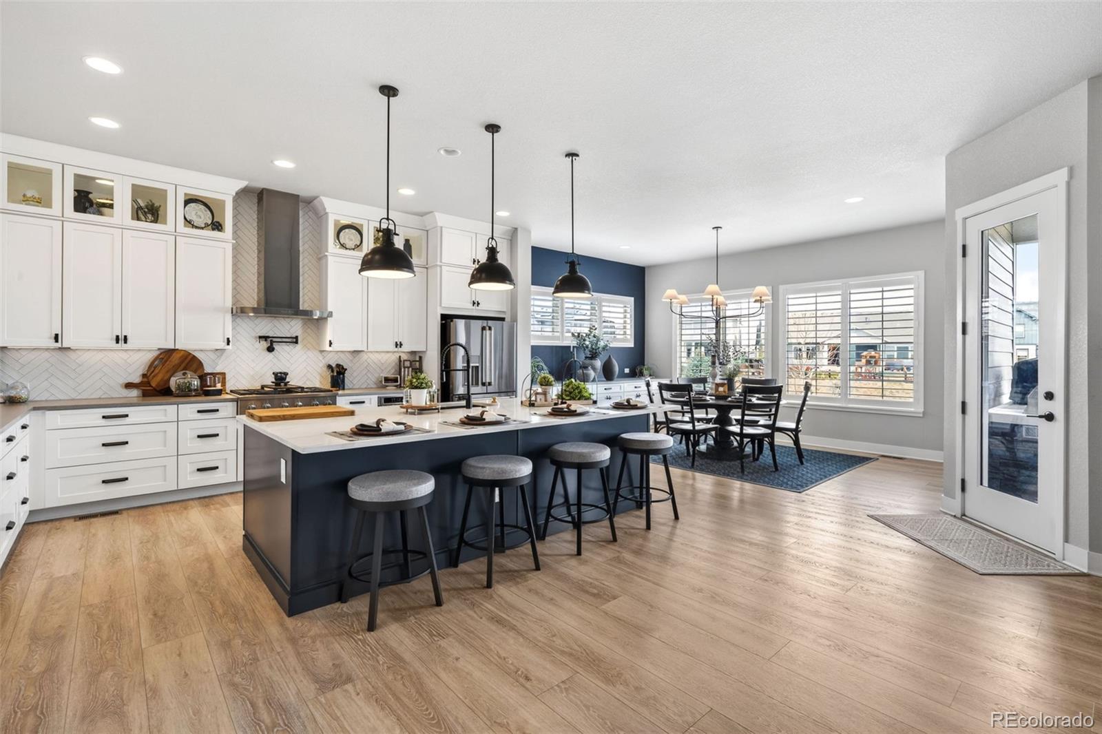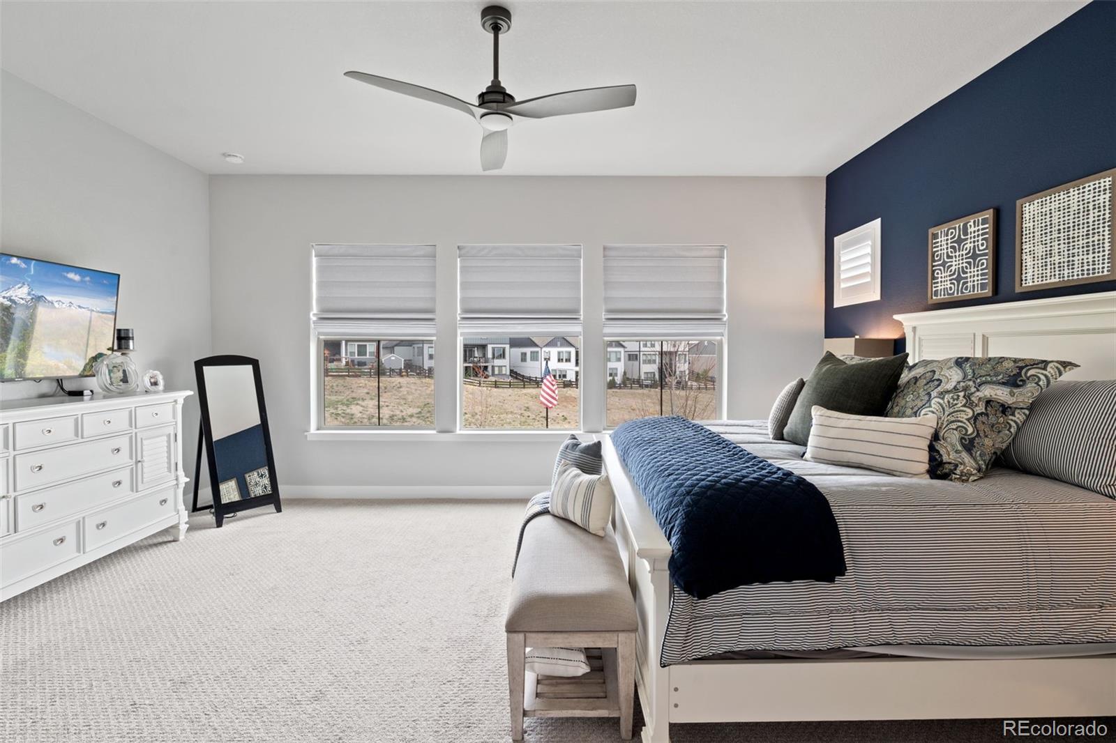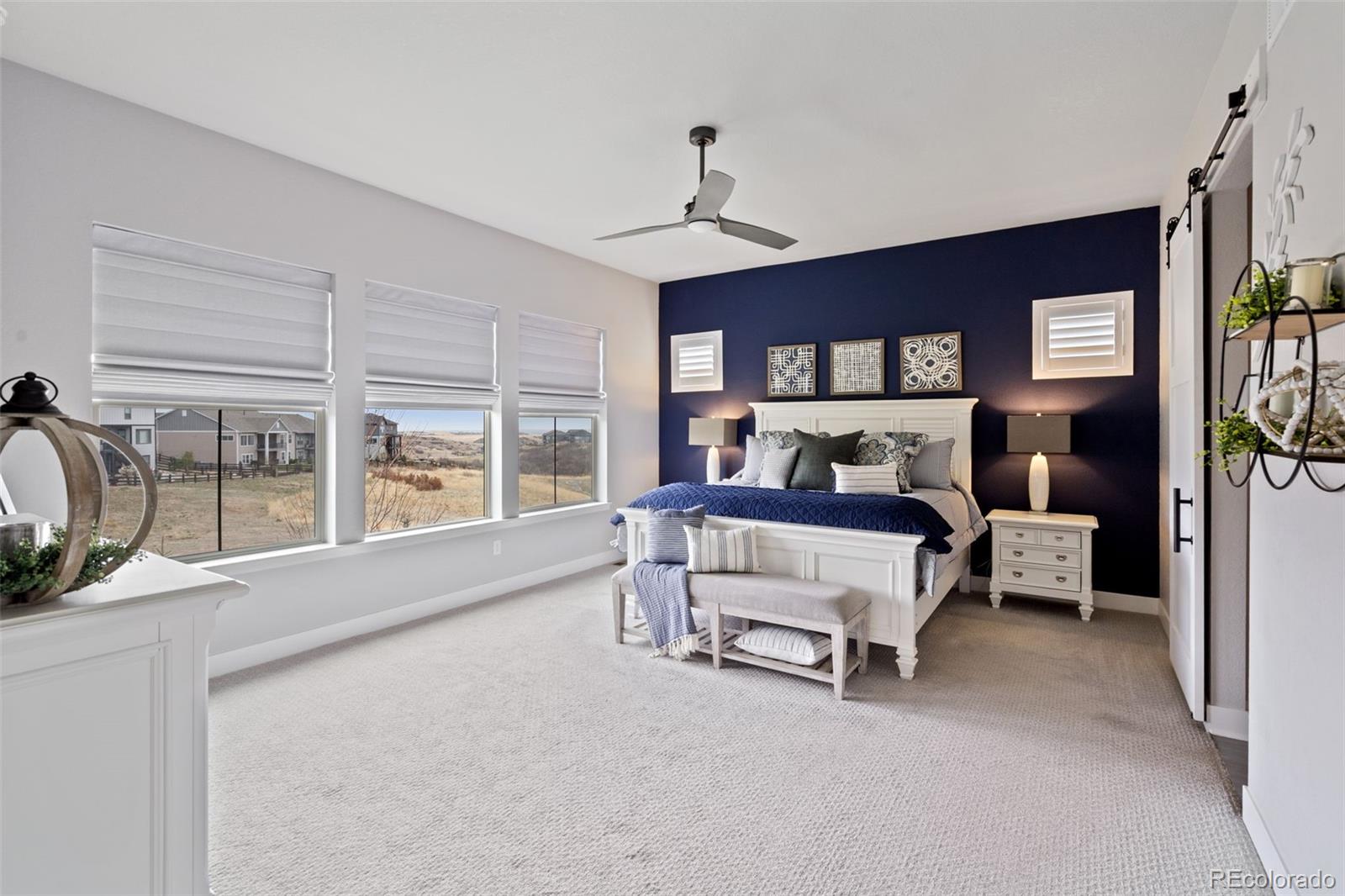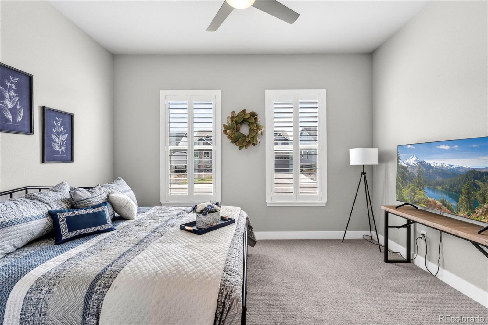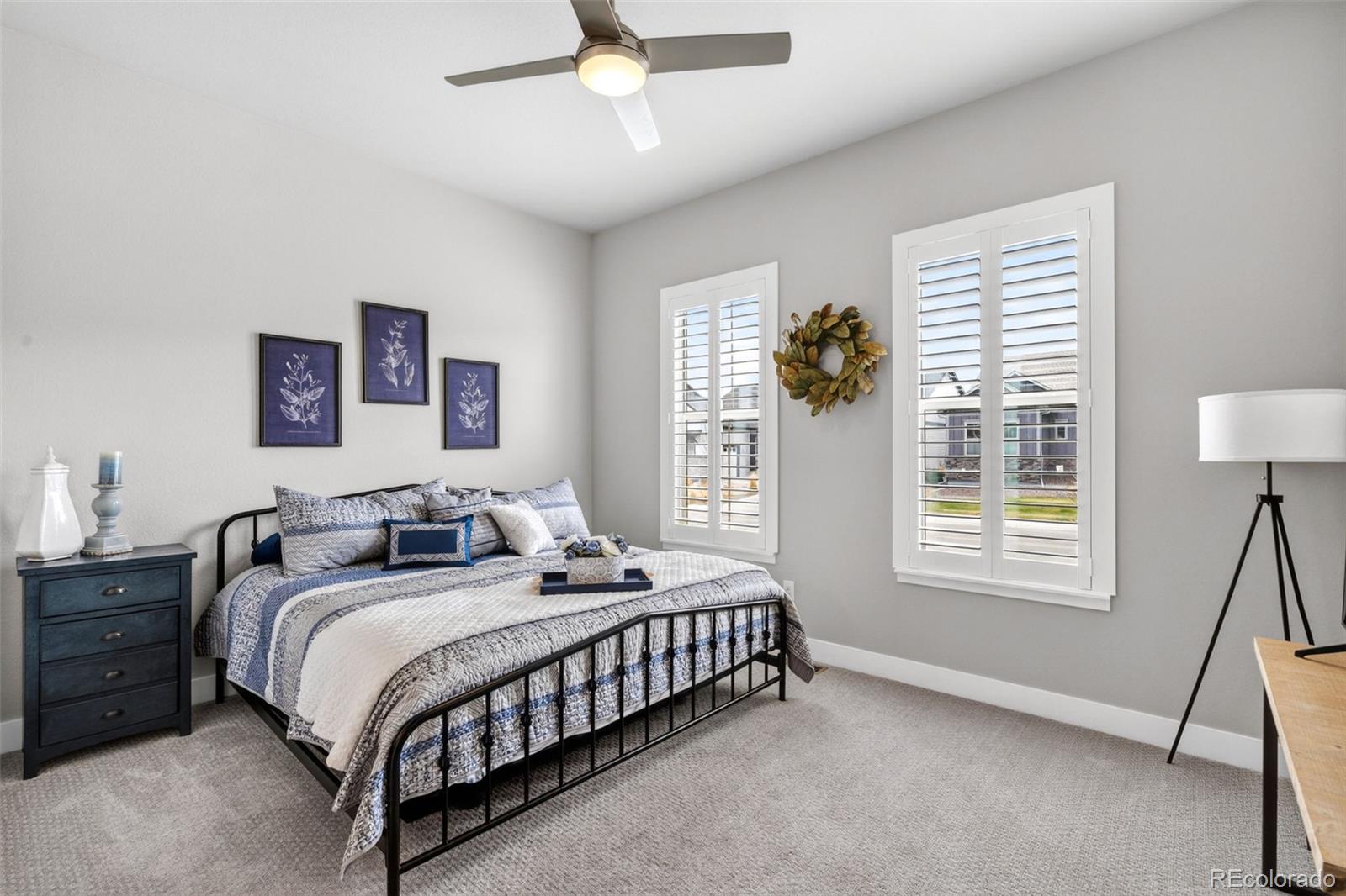 Rarely does a semi-custom ranch of this magnitude become available, offering a masterclass in luxury, and design From the moment you approach the custom front door framed by professional landscaping with elegant retaining walls, and architectural up-lighting. The quality is undeniable. The main level features a sprawling, open-concept layout where an stunning great room with a custom shiplap fireplace flows into a true chefs sanctuary. The kitchen is anchored by an oversized Super Slab granite island and features high-end Caf appliances, a 36 cooktop, and ceiling-height cabinetry with integrated upper, under, and glass-window lighting. Three spacious main-floor bedrooms, three bathrooms, and a dedicated executive office are all elevated by upgraded Kichler lighting, dimmer switches, and premium Levolor wood shutters and Roman blinds. The finished basement expands your living space with a professional home theater, featuring a 110 framed screen, projector, and integrated electronic rack. This level is fully equipped for entertaining or multi-generational living with a second kitchen, an additional bedroom, and a massive flex room perfect for a home gym, second office or bedroom (just add a door). Substantial closet space throughout the home. The primary closet is 10x12 and every room has a walk-in closet if not two (dedicated craft room closet, is amazing), plus linen closets and flex storage in the basement. The experience culminates in a backyard oasis that rivals a private resort. Step onto the expansive paver patio to find a PGA-designed synthetic putting green with a chipping tee, a luxurious spa (240V), and a lush canopy of seven hardwood trees and over 75 perennials. The entire grounds are illuminated by a sophisticated 15-light patio system and extensive up-lighting, all openings up to green space and mountain views.