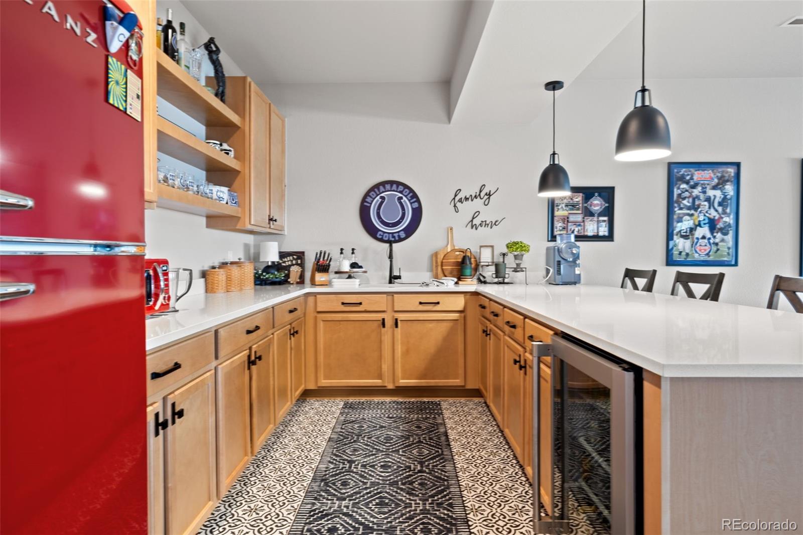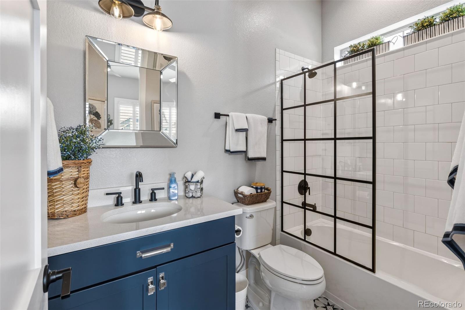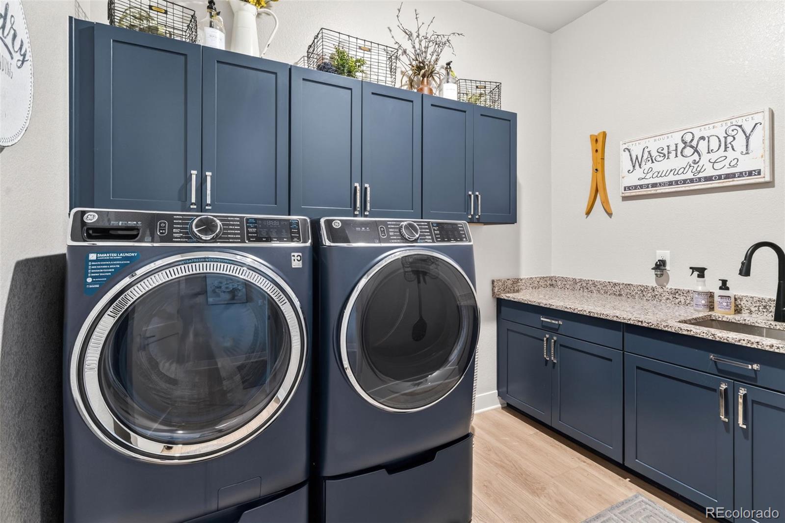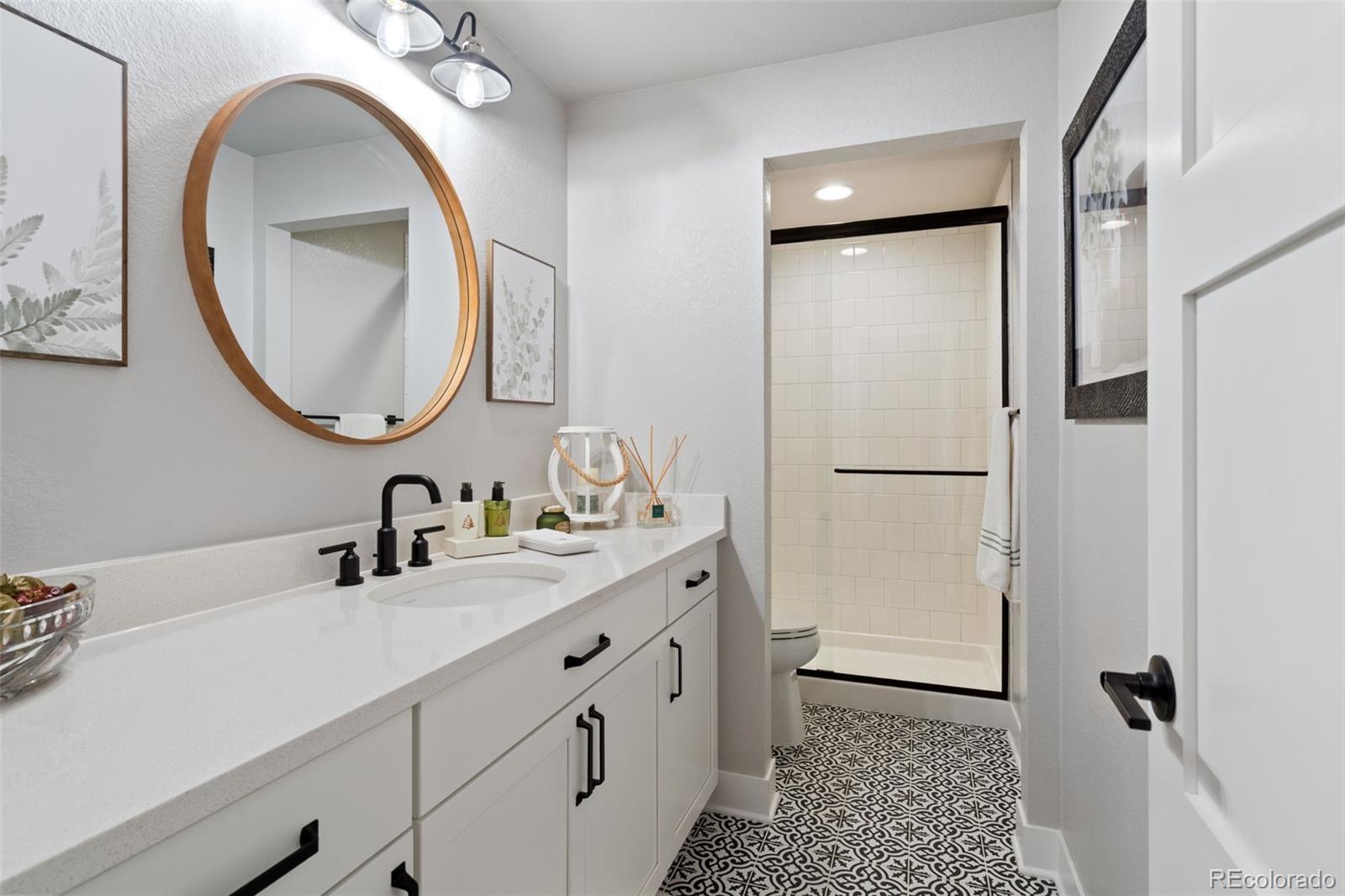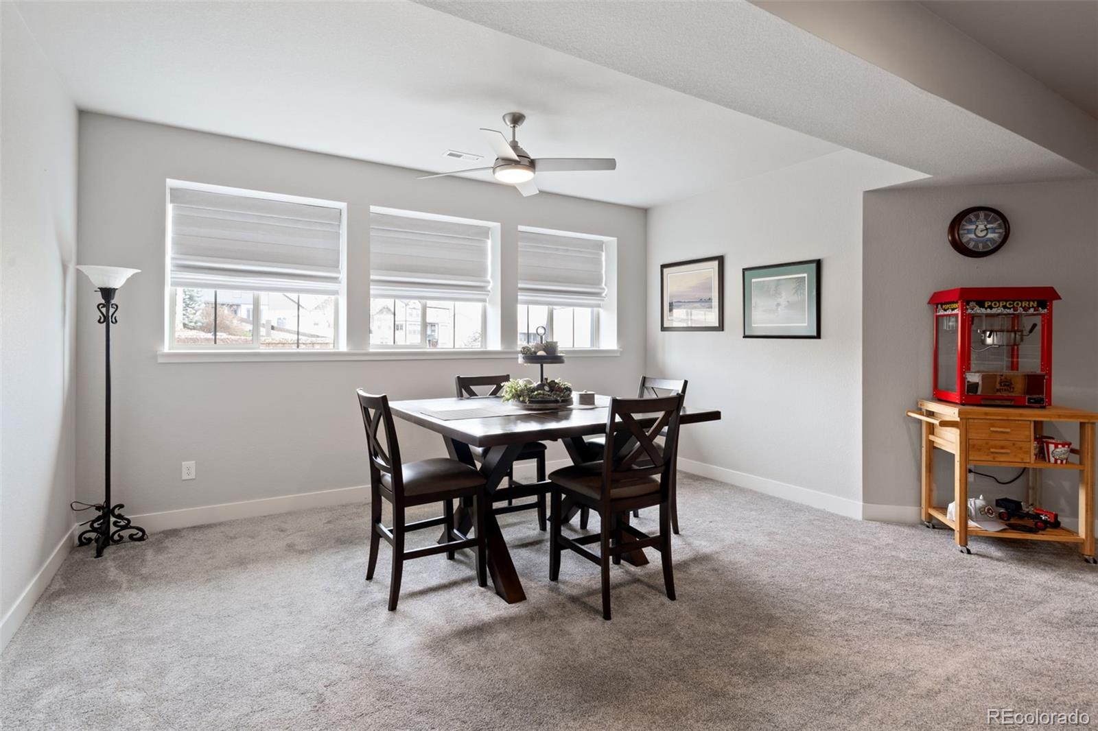 Rarely does a semi-custom ranch of this magnitude become available, offering a masterclass in luxury, and design From the moment you approach the custom front door framed by professional landscaping with elegant retaining walls, and architectural up-lighting. The quality is undeniable. The main level features a sprawling, open-concept layout where an stunning great room with a custom shiplap fireplace flows into a true chefs sanctuary. The kitchen is anchored by an oversized Super Slab granite island and features high-end Caf appliances, a 36 cooktop, and ceiling-height cabinetry with integrated upper, under, and glass-window lighting. Three spacious main-floor bedrooms, three bathrooms, and a dedicated executive office are all elevated by upgraded Kichler lighting, dimmer switches, and premium Levolor wood shutters and Roman blinds. The finished basement expands your living space with a professional home theater, featuring a 110 framed screen, projector, and integrated electronic rack. This level is fully equipped for entertaining or multi-generational living with a second kitchen, an additional bedroom, and a massive flex room perfect for a home gym, second office or bedroom (just add a door). Substantial closet space throughout the home. The primary closet is 10x12 and every room has a walk-in closet if not two (dedicated craft room closet, is amazing), plus linen closets and flex storage in the basement. The experience culminates in a backyard oasis that rivals a private resort. Step onto the expansive paver patio to find a PGA-designed synthetic putting green with a chipping tee, a luxurious spa (240V), and a lush canopy of seven hardwood trees and over 75 perennials. The entire grounds are illuminated by a sophisticated 15-light patio system and extensive up-lighting, all openings up to green space and mountain views.