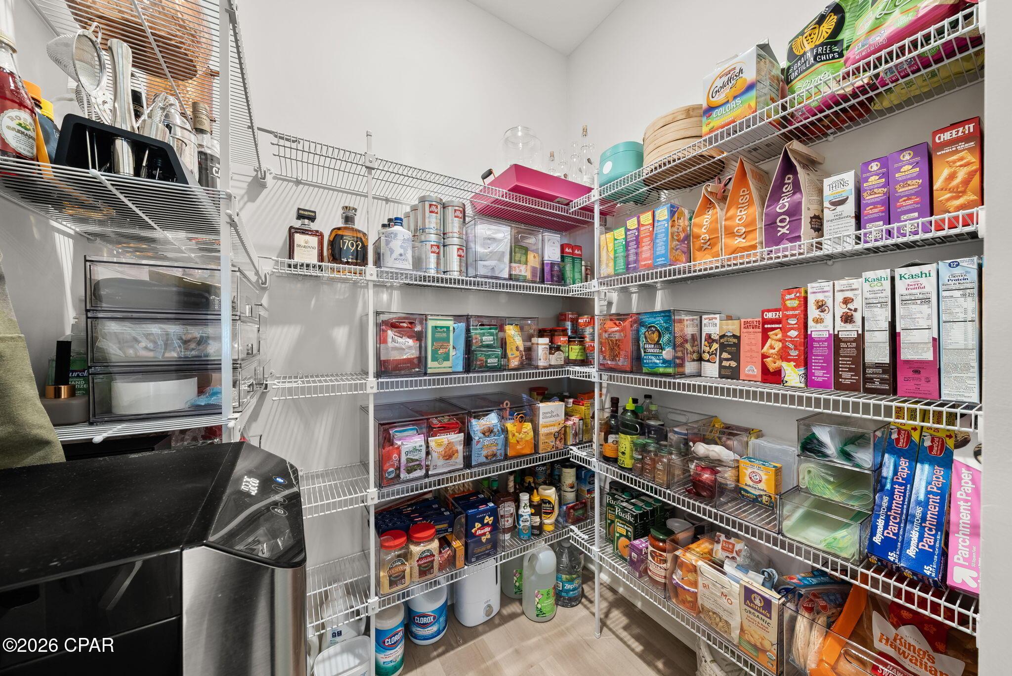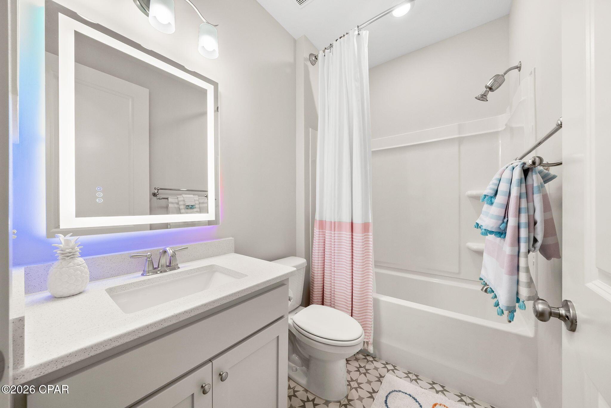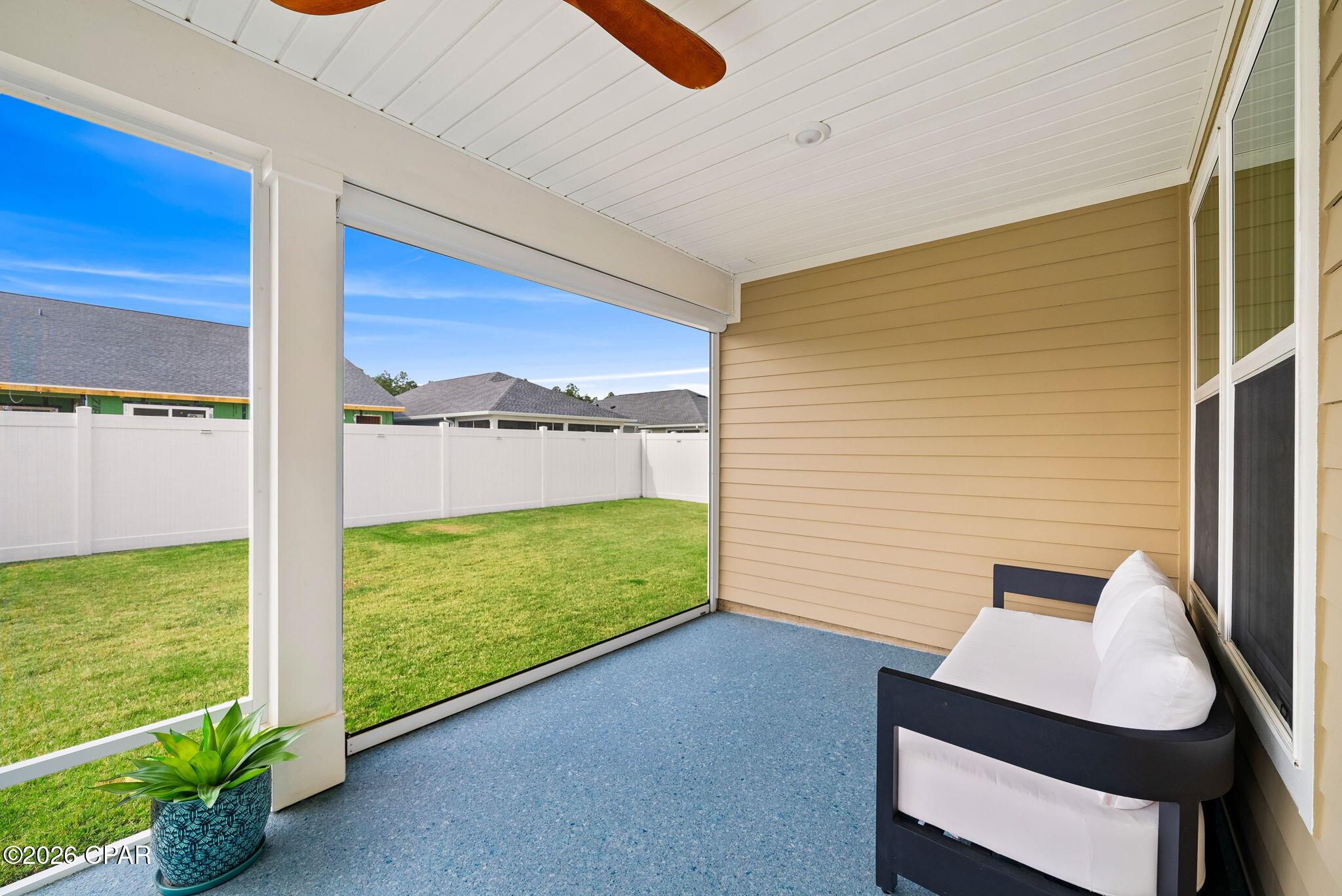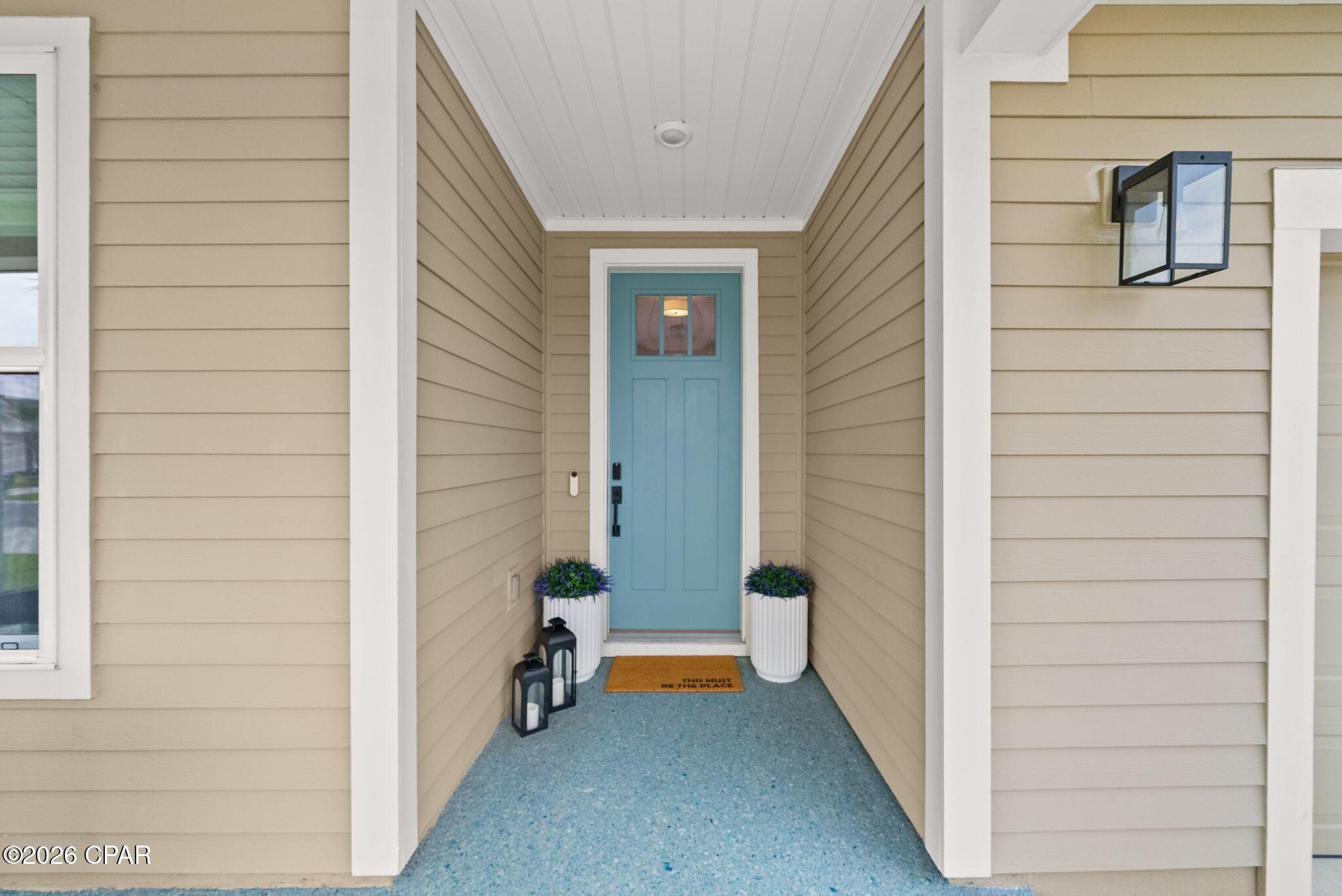 ENDLESS upgrades in central Panama City Beach location! Beautiful newer home immaculately maintained in the desirable Breakfast Point East community. Thoughtfully enhanced well beyond builder grade, this property stands out with an impressive list of modern upgrades, smart home features, and stylish finishes throughout. The exterior features whole house storm gutters, an enclosed patio with an electric retractable screen, and durable epoxy-coated porch and patio floors. The backyard is complete with a WiFi-enabled sprinkler system, a dedicated flower bed irrigation system, white marble landscaping accents, and a full outdoor termite prevention system. Smart exterior upgrades include professionally wired Google security cameras, floodlights, a doorbell camera, solar-powered garage lights, patio ceiling outlets, a ceiling fan, and beautifully placed solar lighting throughout the yard. Inside, the home continues to impress with upgraded bathrooms featuring built-in shelving, LED mirrors with dedicated wiring, and high end fixtures including Pottery Barn towel racks and accessories. Living spaces are designed for both comfort and entertainment, highlighted by a custom built entertainment wall complete with Philips Hue lighting, a color-changing electric fireplace, a 75 Samsung TV, Samsung soundbar, and hidden storage with integrated outlets. Additional interior features include built in closet systems in secondary bedrooms, an advanced A/C electrostatic purification system, multiple TV mounts, custom curtain rods, added pantry electrical access, and a full ADT security system with window sensors and fire/carbon monoxide detection. Subtle touches like accent hallway lighting enhance the overall ambiance. The attic has been upgraded for maximum usability with a pull-down ladder and added wood flooring, creating valuable additional storage space. In the kitchen, youll find both style and functionality with a touchless faucet, pot filler, custom cabinet hardware, designer island lighting, a Samsung Bespoke refrigerator, and cleverly designed retractable organizers for pots, lids, and spices. This home offers a rare combination of modern technology, thoughtful upgrades, and everyday practicality, all in a prime central location close to top rated schools, shopping, restaurants, and the white sandy beach. A RARE GEM LIKE NEW! Schedule your private showing today! Buyer to verify any information deemed important.