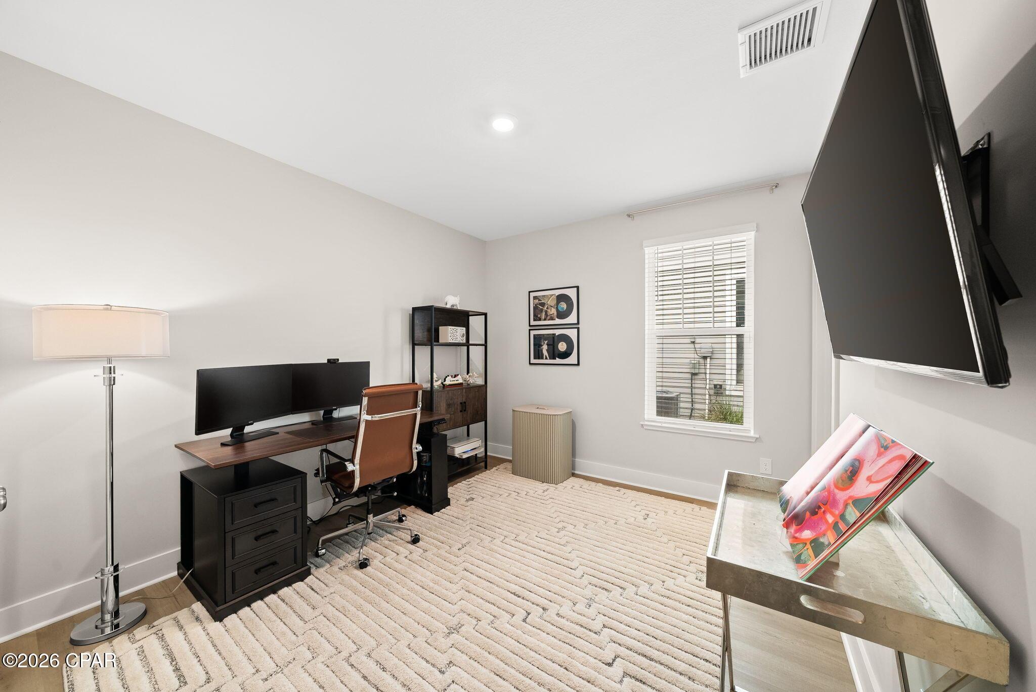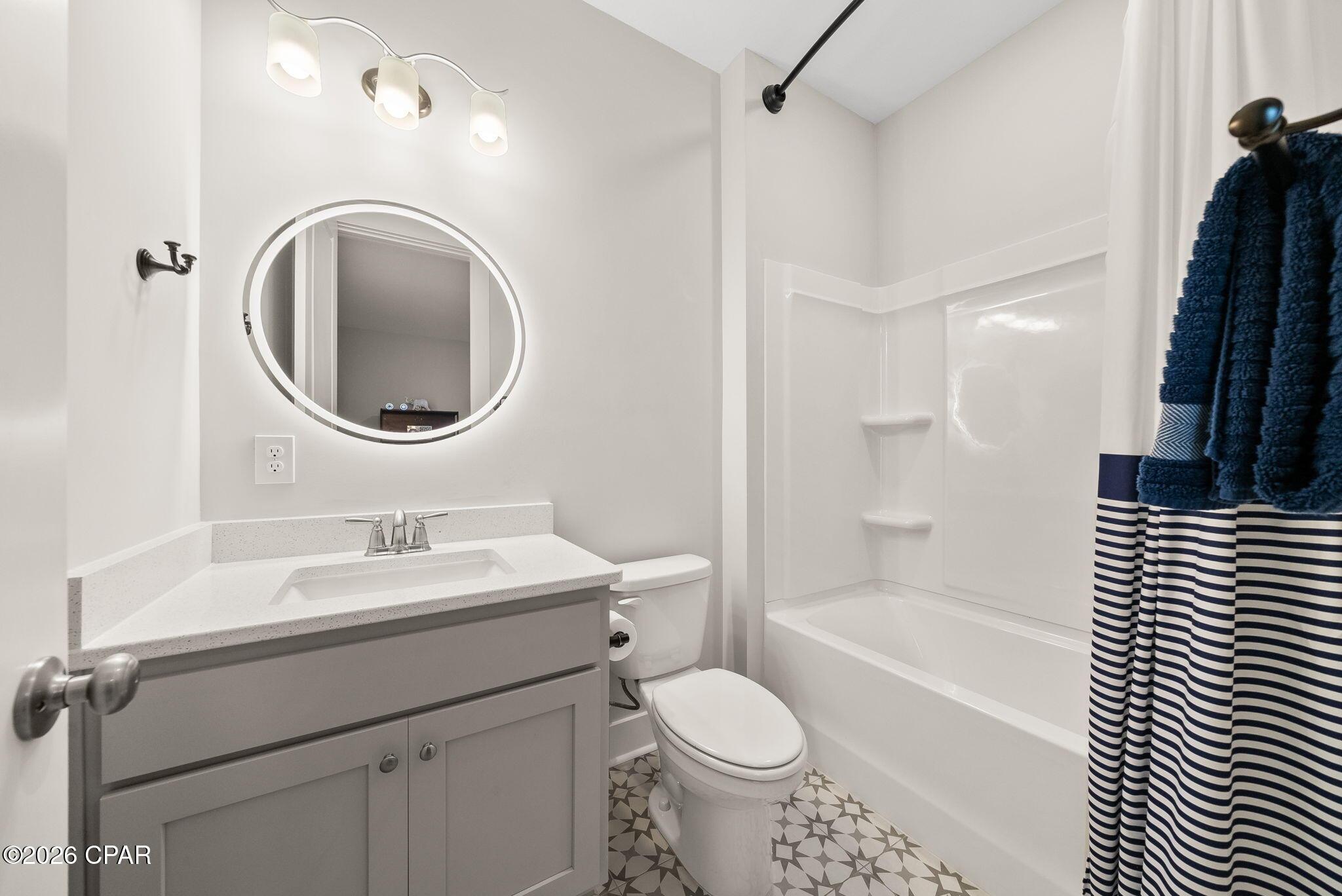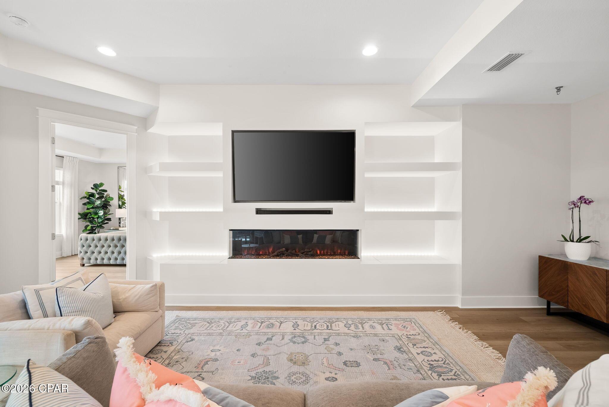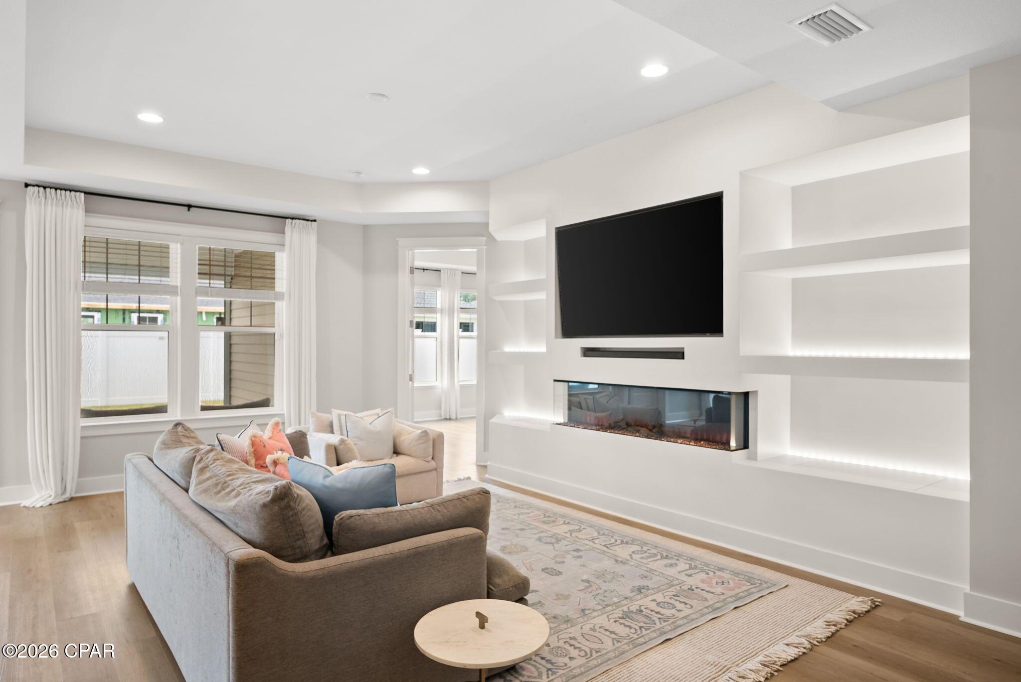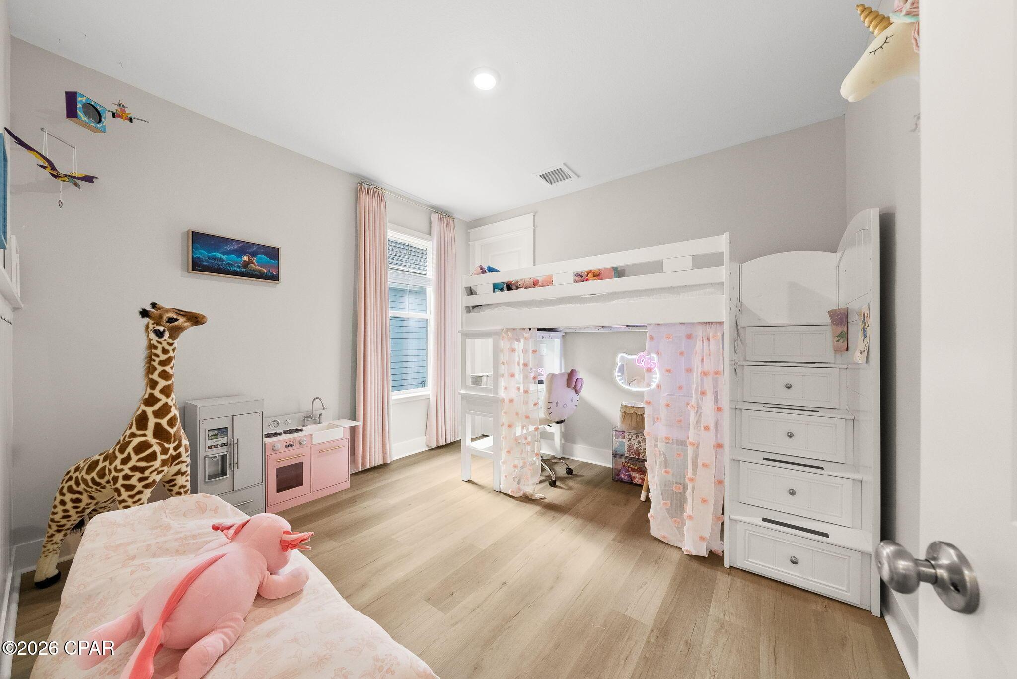 ENDLESS upgrades in central Panama City Beach location! Beautiful newer home immaculately maintained in the desirable Breakfast Point East community. Thoughtfully enhanced well beyond builder grade, this property stands out with an impressive list of modern upgrades, smart home features, and stylish finishes throughout. The exterior features whole house storm gutters, an enclosed patio with an electric retractable screen, and durable epoxy-coated porch and patio floors. The backyard is complete with a WiFi-enabled sprinkler system, a dedicated flower bed irrigation system, white marble landscaping accents, and a full outdoor termite prevention system. Smart exterior upgrades include professionally wired Google security cameras, floodlights, a doorbell camera, solar-powered garage lights, patio ceiling outlets, a ceiling fan, and beautifully placed solar lighting throughout the yard. Inside, the home continues to impress with upgraded bathrooms featuring built-in shelving, LED mirrors with dedicated wiring, and high end fixtures including Pottery Barn towel racks and accessories. Living spaces are designed for both comfort and entertainment, highlighted by a custom built entertainment wall complete with Philips Hue lighting, a color-changing electric fireplace, a 75 Samsung TV, Samsung soundbar, and hidden storage with integrated outlets. Additional interior features include built in closet systems in secondary bedrooms, an advanced A/C electrostatic purification system, multiple TV mounts, custom curtain rods, added pantry electrical access, and a full ADT security system with window sensors and fire/carbon monoxide detection. Subtle touches like accent hallway lighting enhance the overall ambiance. The attic has been upgraded for maximum usability with a pull-down ladder and added wood flooring, creating valuable additional storage space. In the kitchen, youll find both style and functionality with a touchless faucet, pot filler, custom cabinet hardware, designer island lighting, a Samsung Bespoke refrigerator, and cleverly designed retractable organizers for pots, lids, and spices. This home offers a rare combination of modern technology, thoughtful upgrades, and everyday practicality, all in a prime central location close to top rated schools, shopping, restaurants, and the white sandy beach. A RARE GEM LIKE NEW! Schedule your private showing today! Buyer to verify any information deemed important.