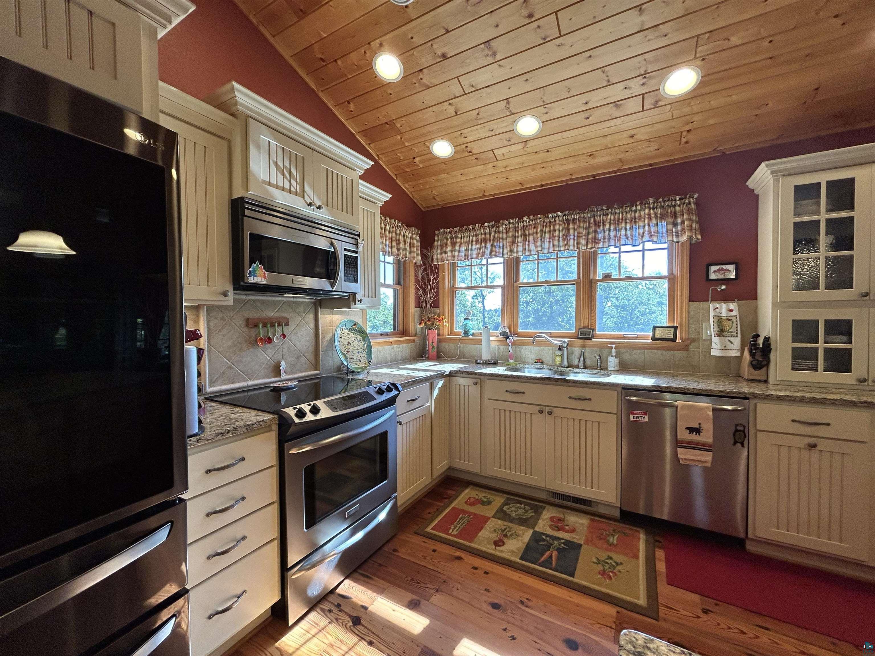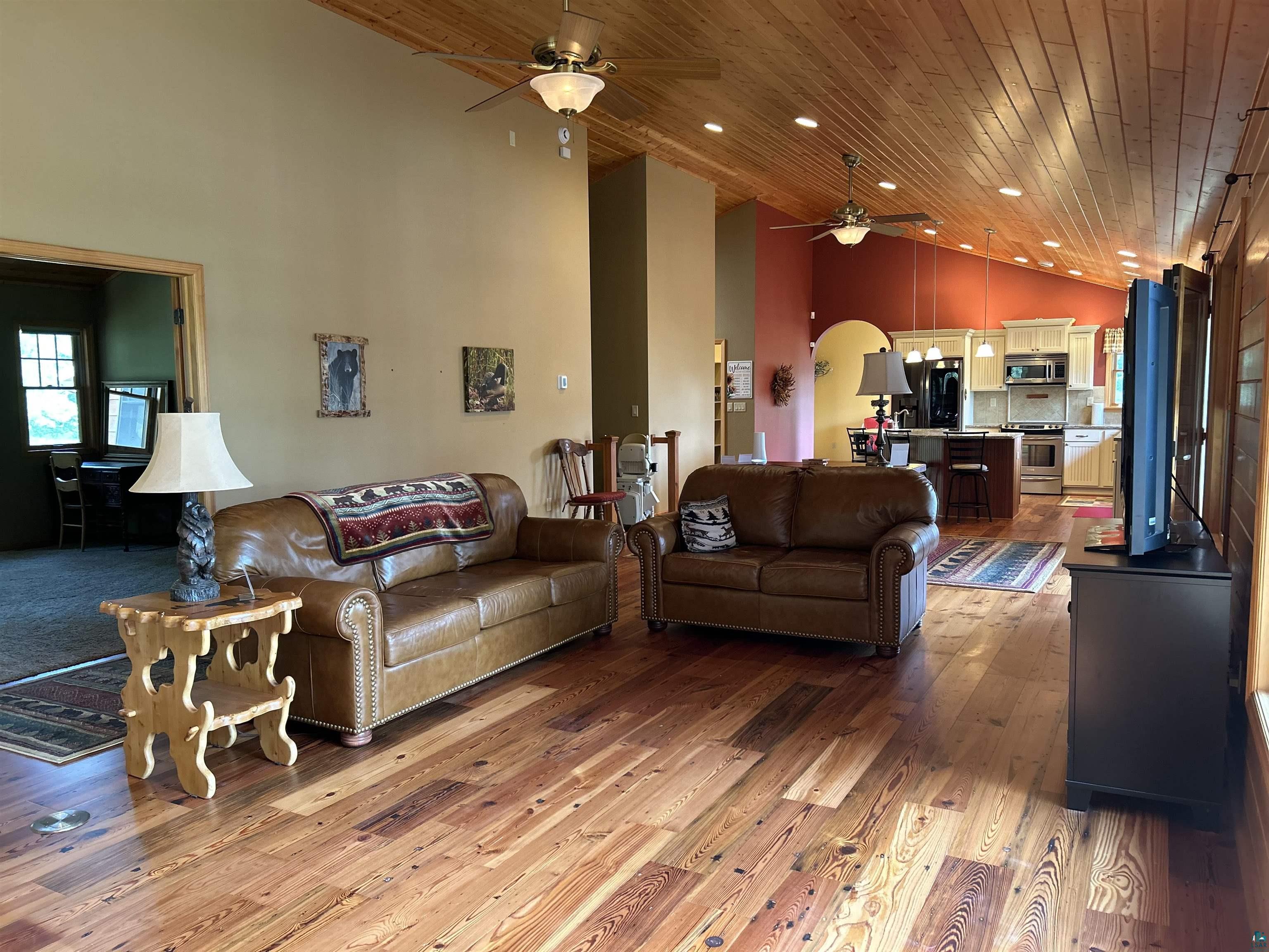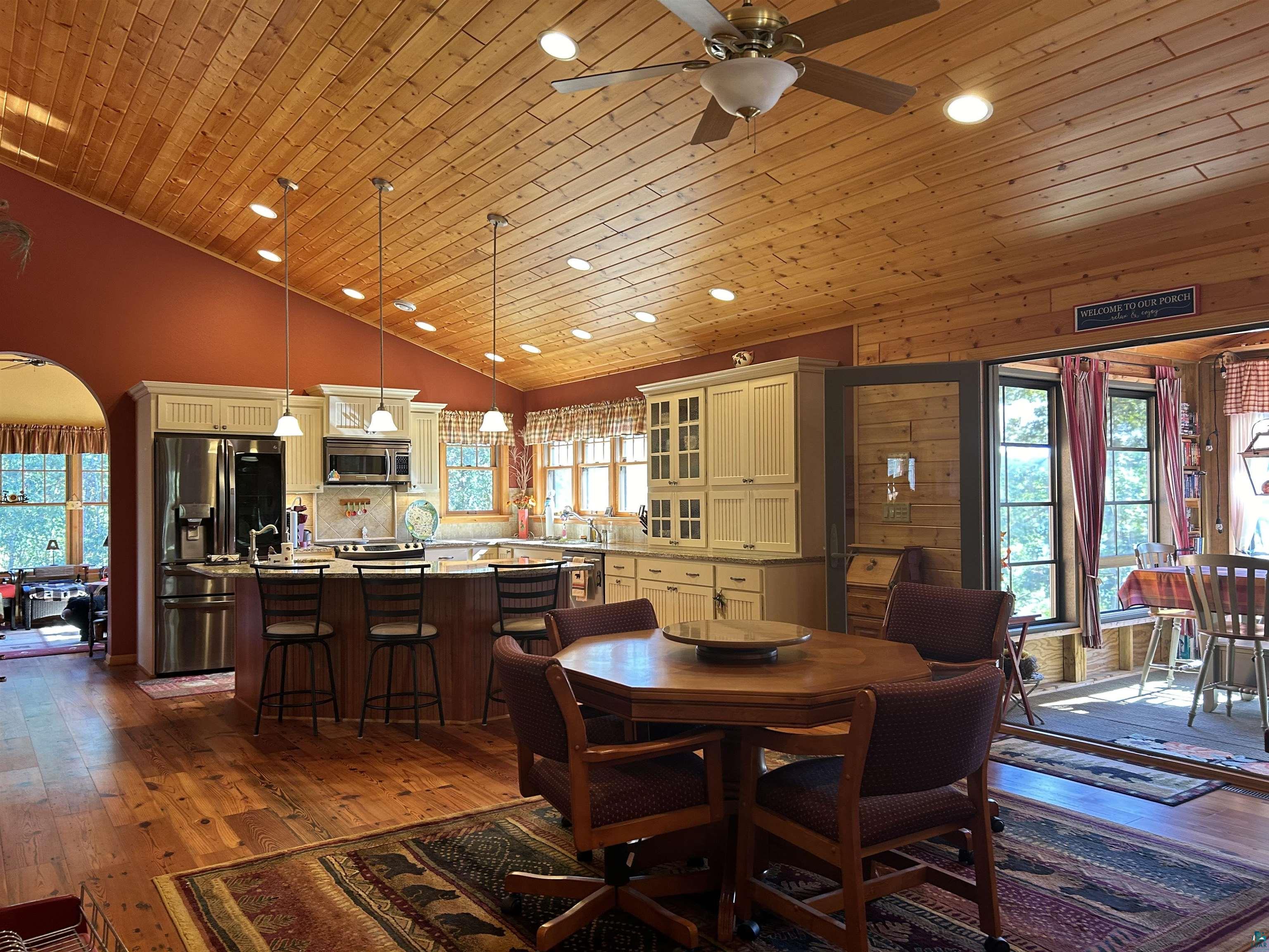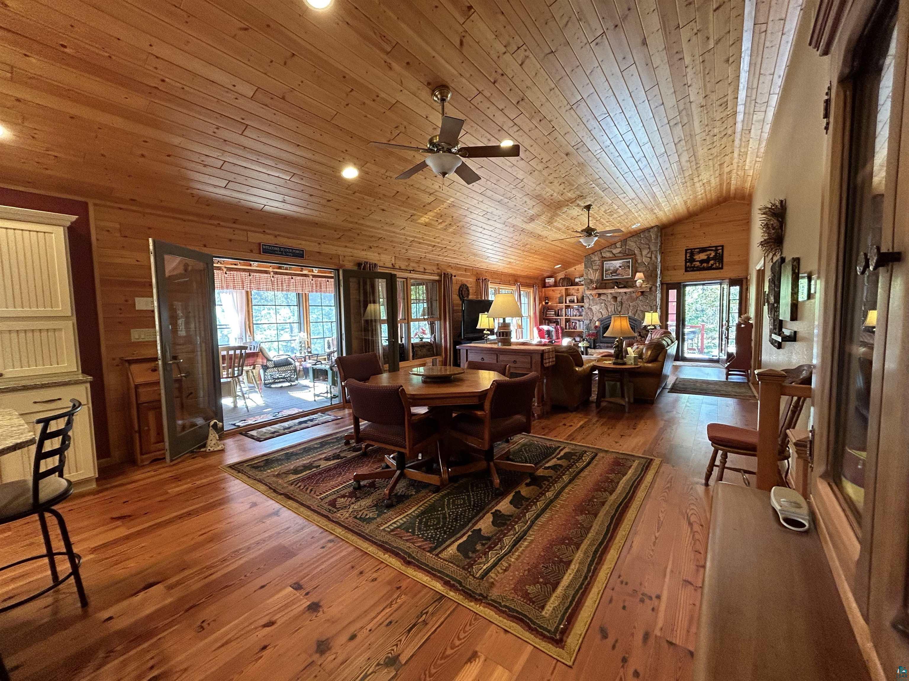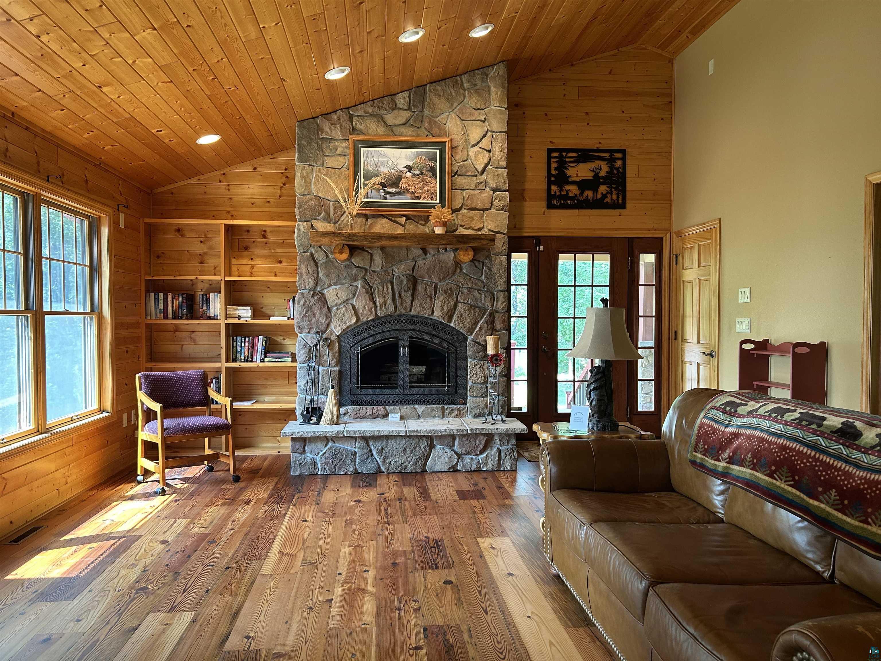 Pride of ownership is shown in this custom designed home. Enjoy the stunning sunrises as they dance across the water, with morning coffee in the incredible three season room overlooking Island Lake! A non-blooming, spring-fed private lake in Solon Springs WI is just what you need. Relax to the cascading flow of the water feature that brings in a variety of birds, waterfowl, and wildlife through the naturalized slope to the 384 ft of sandy beach. Located a few miles from St. Croix Lake you will enjoy loon calls, chickadees, peepers and whippoorwills calls as the moon sparkles on the lake. Nicely wooded with mature trees and hardwoods for year-round privacy and color on the 3.59 acres. A Circle drive to the heated 3 car garage with electric and slab for all your lake and trail toys. Landscaped areas around multiple outdoor seating decks and patios. You feel the quality of material and design thru out the home as you enter and pass the main floor laundry with extra storage, a ½ bath, and walk-in pantry with floor to ceiling storage. As you step into the expansive Great Room with vaulted ceilings, stunning floors, your eye settles on the massive stone wood burning fireplace. The dining and kitchen complement the design and functionality of the main floor. The custom kitchen is designed with storage, functionality, granite countertops, and stainless appliances. The main floor ensuite is framed in French doors with a walk in closet, and custom designed walk-in shower and bath. Bonus is a main floor office/den with views of the lake. There are multiple outdoor decks and patios to enjoy all year. Energy-efficient windows, doors, and a Steffes heating system, ensures year-round comfort. (see documents) The lower level erupts in quality and functionality with 2 bedrooms, one with a patio, a den/play area, workroom, and full bath and utility room. Spacious rec room allows for groups to enjoy the walk out patio to the lake and impressive fireplace to enjoy. Here, comfort, recreation and four-season enjoyment come together seamlessly.