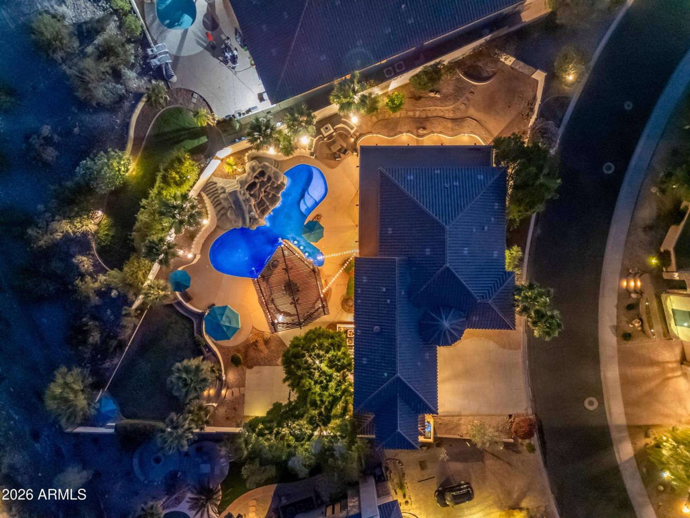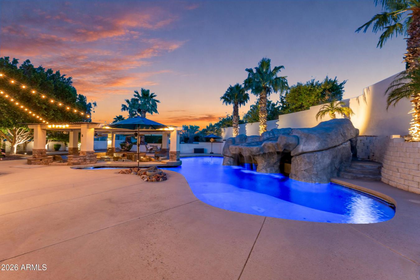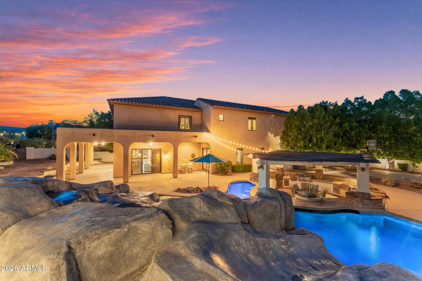 Nestled within the Ahwatukee Foothills in the gated community of Tuscan Hills, this exceptional custom home sits on a coveted oversized lot and captures breathtaking city lights and mountain views from nearly every window, creating a setting that feels both elevated and serene. Designed as a true retreat, the home offers six bedrooms and four bathrooms, with expansive living spaces that balance comfort, privacy, and effortless entertaining. The thoughtful layout provides flexibility for guests, multigenerational living, or work-from-home needs while maintaining a warm and inviting flow throughout the home. At the center of the home, the gourmet kitchen is designed to perform as beautifully as it looks. It features granite countertops, a large island, a walk-in pantry, and a fully equipped butlers pantry with a small prep sink and built-in ice maker tucked beneath the cabinetry. The kitchen is outfitted with double ovens, including a top oven with convection cooking, a microwave that also functions as a convection oven, and an electric cooktop with a full warming drawer below, creating a space that is equally suited for everyday meals or large-scale entertaining. The primary suite serves as its own private sanctuary, complete with a separate sitting area or office space ideal for quiet mornings or working from home. A private balcony frames stunning mountain views, while the spacious bath offers dual vanities, a soaking tub positioned to capture city views, and dual walk-in closets, creating a luxurious and functional retreat. Step outside and the property transforms into a private resort. The backyard is anchored by a spectacular waterfall pool complete with a slide, grotto, and spa, creating a setting that feels like a luxury getaway. A swim-up bar connects to a large sunken outdoor kitchen, designed for effortless entertaining and resort-style living. The outdoor kitchen is fully equipped with a built-in BBQ with side burners, a built-in smoker, a full sink, and multiple coolers, making it ideal for hosting gatherings while enjoying the incredible Arizona weather and surrounding views. The grounds continue to impress with a raised grass yard overlooking the valley, mature fruit trees, and a private basketball court, offering both recreation and relaxation across the expansive homesite. Completing the property is a three-car garage and the privacy and prestige of a gated neighborhood, all while being just minutes from shopping, dining, and freeway access. With its rare lot, sweeping city and mountain views, and resort-style amenities, this home delivers a lifestyle with a vibe that makes every day feel like a getaway... the kind of place you arrive at and never want to leave!