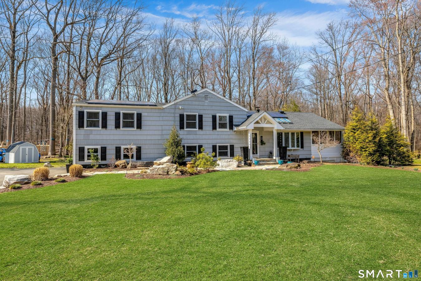 Beautifully renovated split level situated on a centrally located cul-de-sac. This sun-filled residence offers an open floor plan with a bright living room featuring a cozy fireplace, an updated kitchen, and an adjoining dining area. The property includes 4 bedrooms and 3 1/2 renovated baths, highlighted by an oversized primary suite with a spa-like bathroom. The finished lower level provides flexible space for a family room or home office. A spacious sunroom with a large hot tub offers year round enjoyment. The flat one acre lot features a patio, greenhouse, and fire pit. Improvements include: extensive landscaping, new stone walkway, newer roof, solar panels, newer skylights, garage doors, moldings & more. Move-in ready with modern updates throughout. More photos to come.