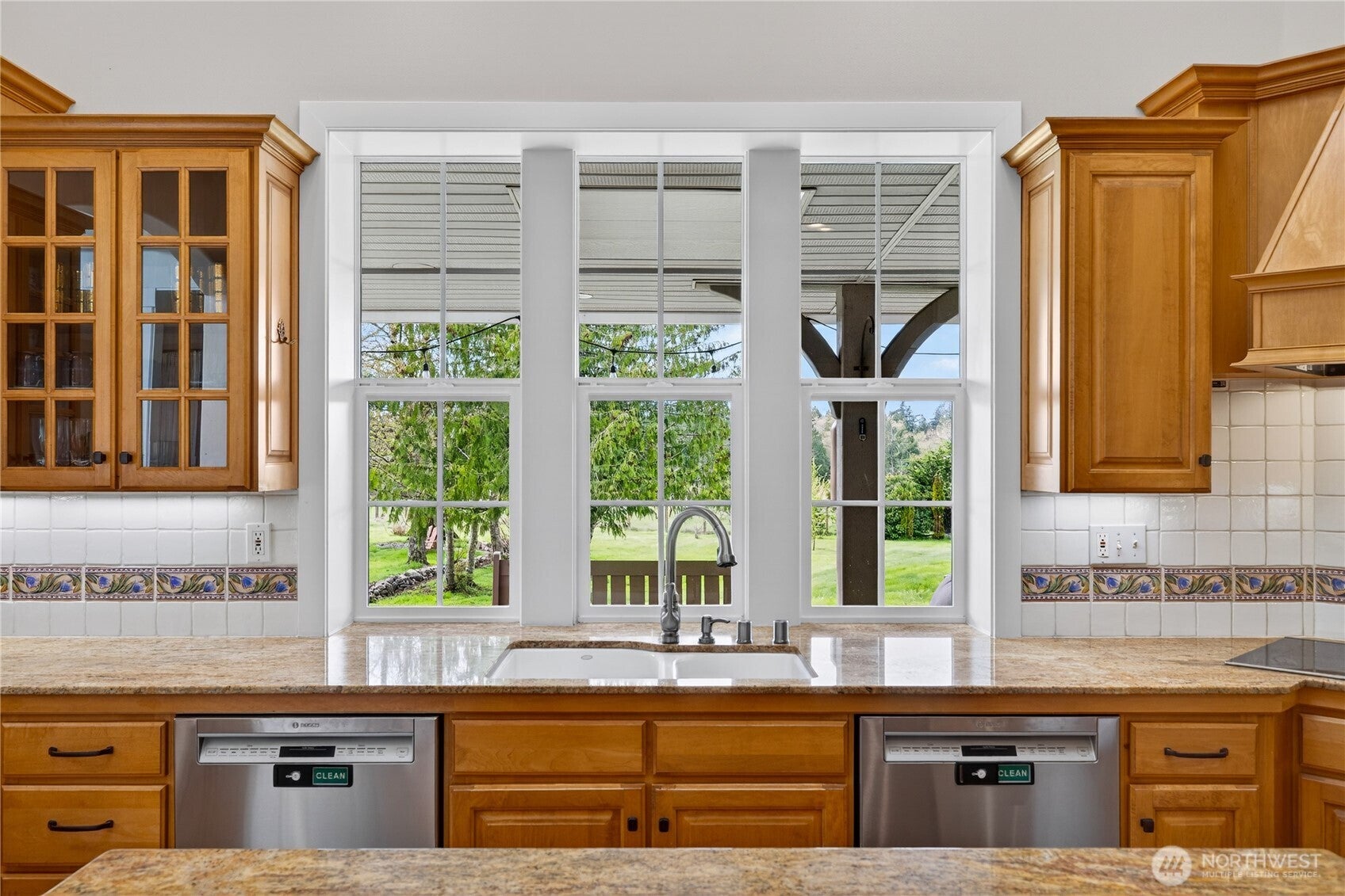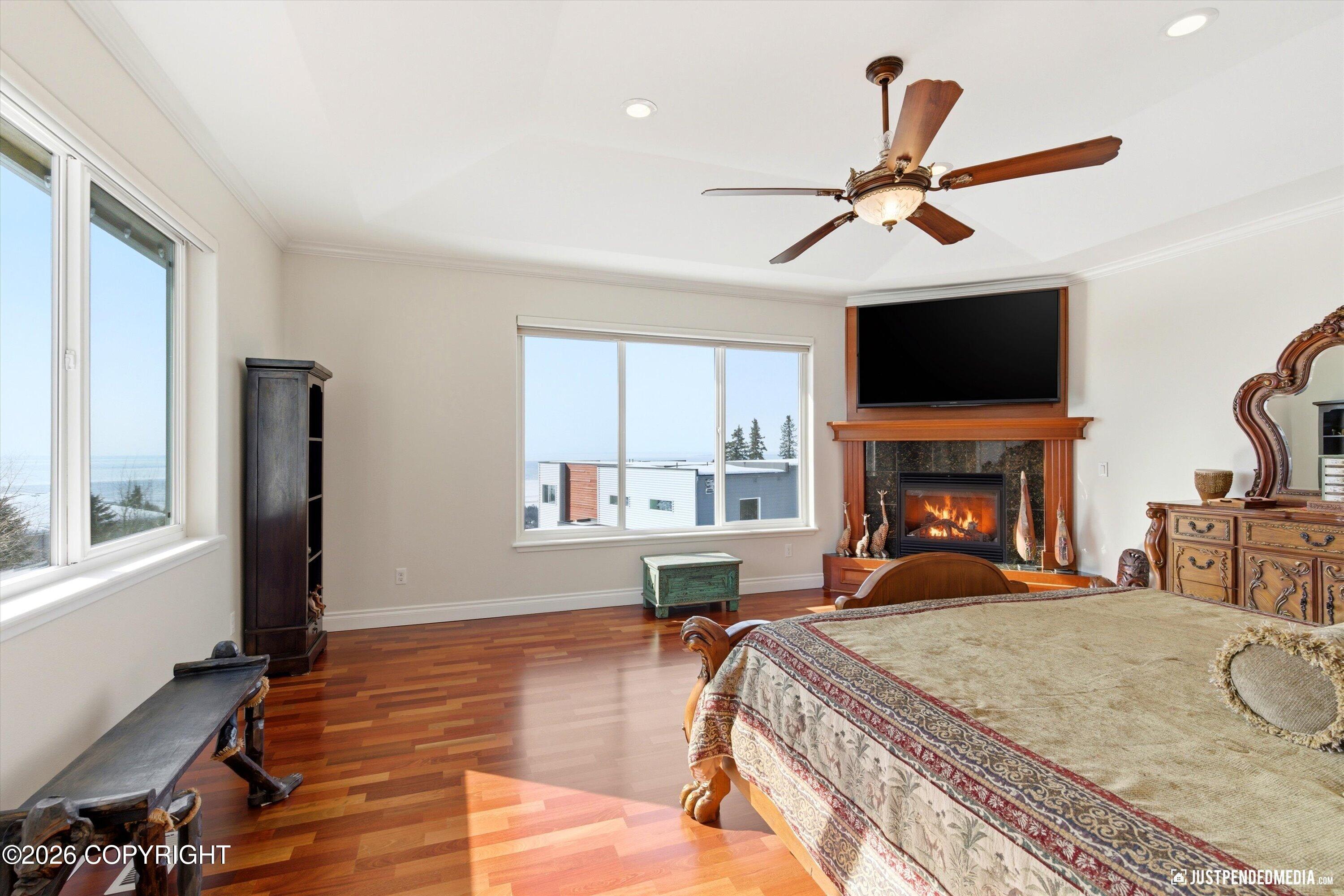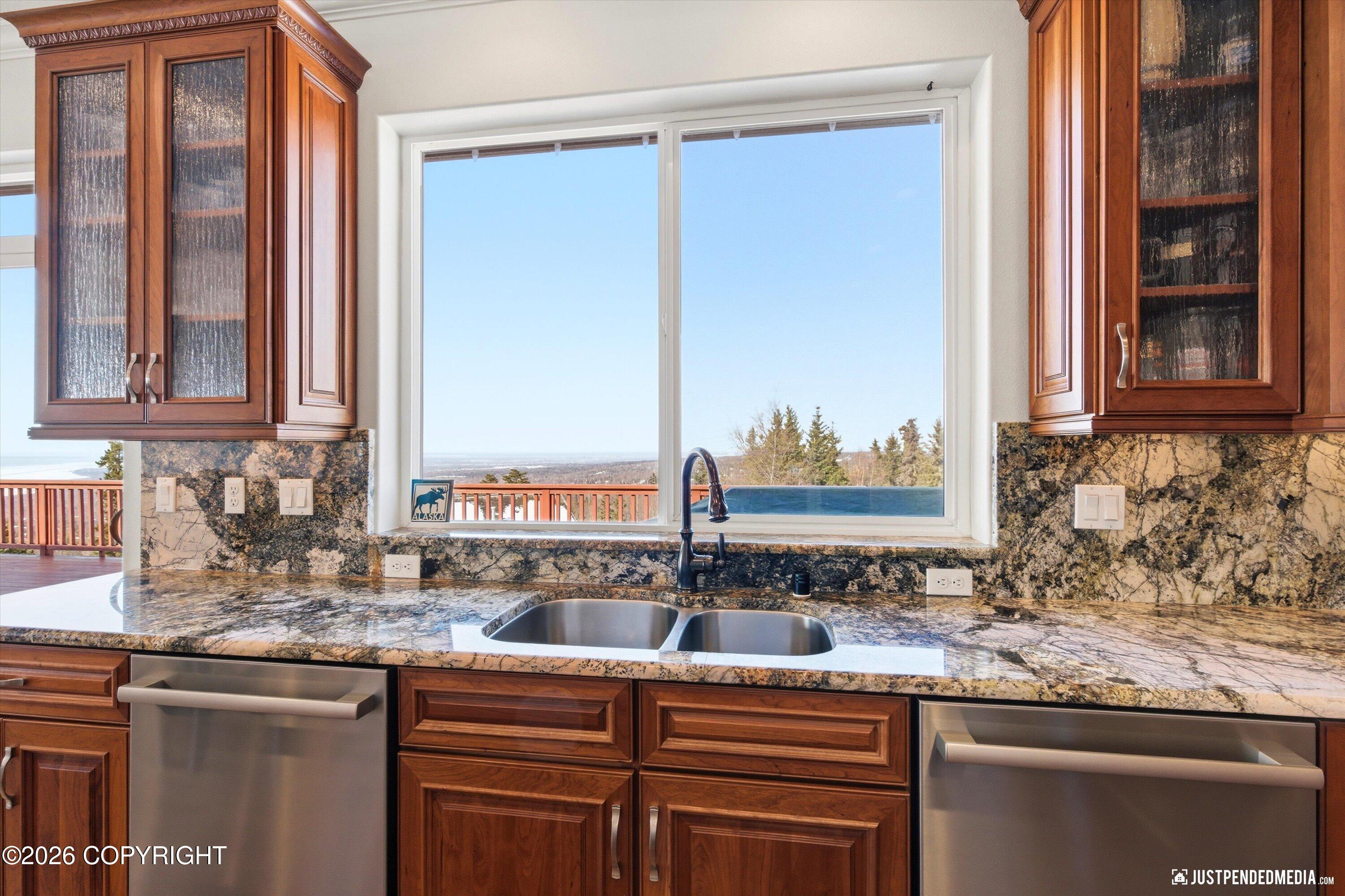 Panoramic 180-degree inlet and mountain views set the stage for this exceptional gated hillside residence. Thoughtfully designed with a reverse floor plan to maximize natural light and scenery, the upper-level main living area features a chefs kitchen with Viking appliances, granite countertops, and a large island, opening to expansive living spaces and cedar decks.The home offers three levels, with the main entry level featuring a grand foyer, den with cherry wainscoting, and a spacious rec room--converted from additional garage space--along with a mudroom and bonus garage/exercise area separated by a glass interior garage door.The upper level includes the primary suite with soaking tub, glass shower, and walk-in closet, along with additional bedrooms connected by a Jack and Jill bath. The lower level features a theater room, extensive storage, and a full 3-bedroom, 3-bath mother-in-law apartment with access to the backyard, ideal for multi-generational living and out of town visitors.Additional highlights include a 5-car garage with tandem bay, stacked stone exterior, and professionally landscaped grounds.