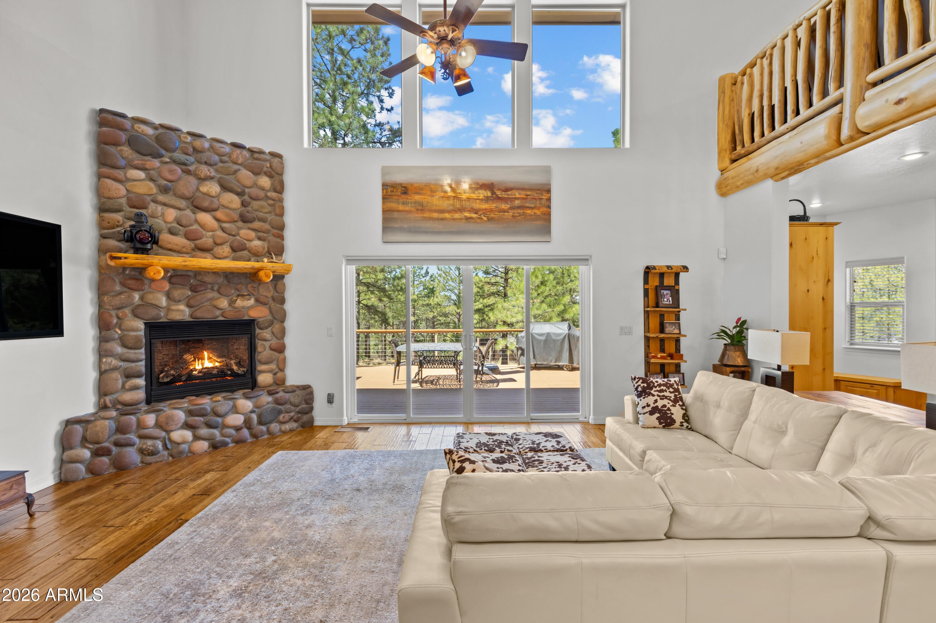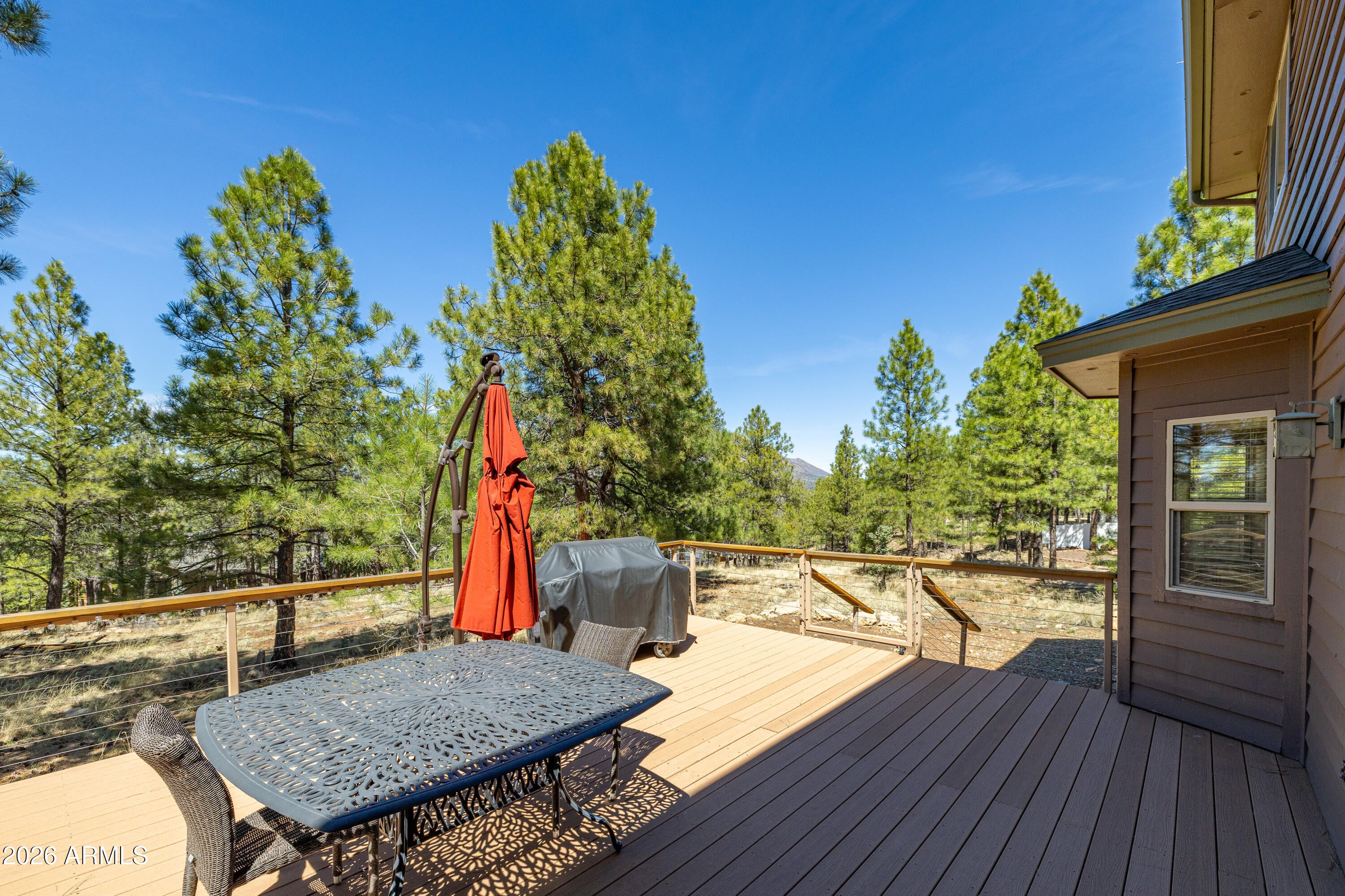 45 Lone Oak is the bright, beautifully updated mountain retreat backing forested green space that buyers wait for. With 5 bedrooms, 3.5 baths, central air, and an upstairs loft that works perfectly as a second living area, this home offers the ideal Flagstaff getaway for both everyday living and hosting family and friends.The open floor plan is filled with natural light, and the main-level primary suite is a standout, complete with a newly remodeled bath and steam shower. In the great room, soaring 18-foot ceilings and a dramatic wall of windows bring in the deep blue sky and peaceful views of the pines. The spacious kitchen has been fully remodeled and is designed for gathering with a large breakfast bar. A separate dining room off of the great room makes this floorplan perfect. A stone fireplace and log accents add just the right amount of mountain character.Step outside and you may never want to leave the back deck. It is the perfect place to relax, entertain, and enjoy the privacy of the green space, cool pines, and views of Mount Elden.Short-term rentals are permitted.Recent improvements include a full kitchen remodel, primary bath remodel with steam shower, upstairs bath remodel, new roof, and garage remodel.The inspection has been completed, repairs have been made or scheduled, and the home is in excellent condition. Move right in and enjoy one of Amberwoods rarest and most beautiful settings.