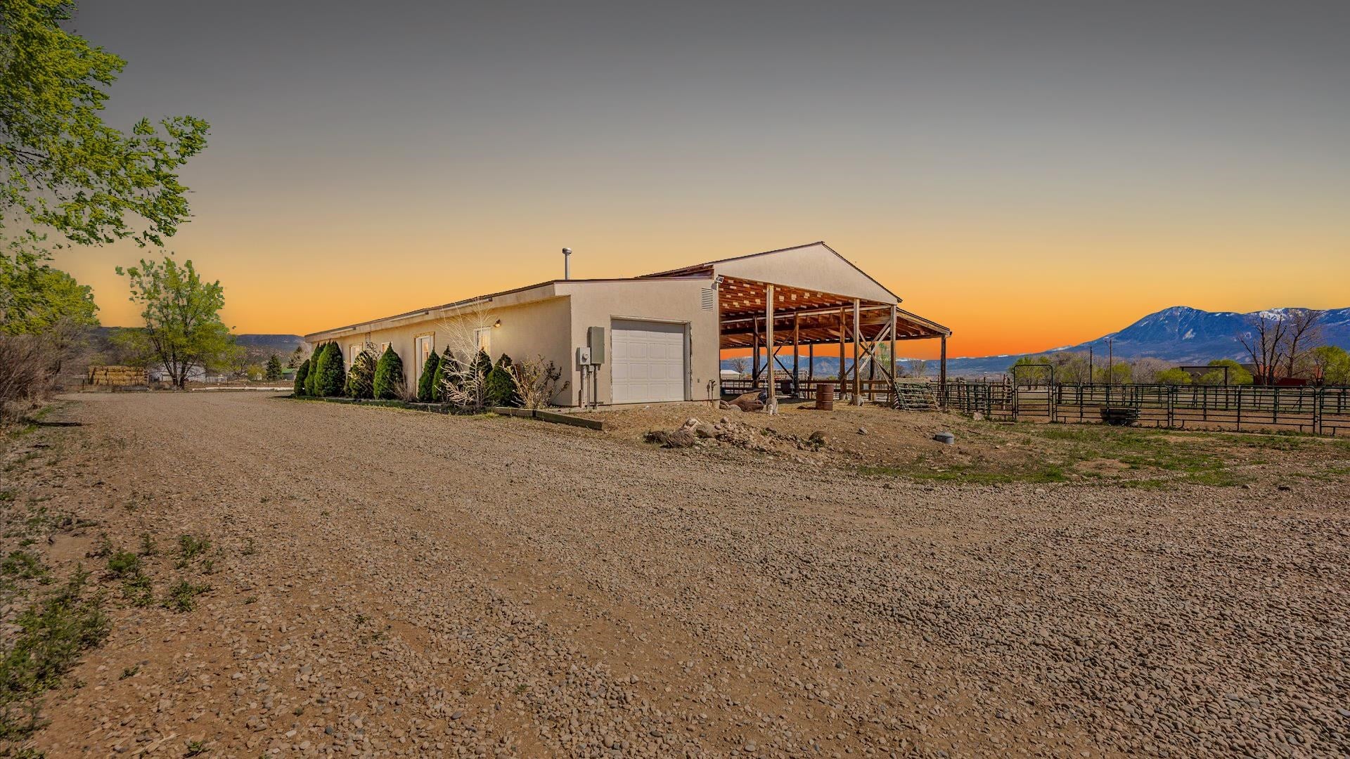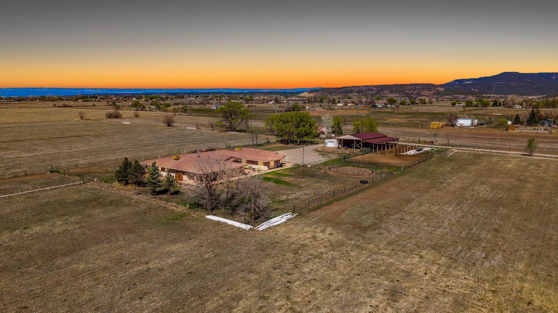 Set on approximately 30 acres on sought-after Rogers Mesa near Hotchkiss, this versatile property offers privacy, infrastructure, and sweeping North Fork Valley viewsincluding Mount Lamborn, the West Elk Mountains, and Grand Mesa. Approximately 25 irrigated acres in grass/alfalfa are supported by 555 shares of irrigation waterideal for hay, livestock, horses, or a self-sufficient setup. The 5,785 sq ft Spanish-style home features 6 bedrooms, 5 baths, multiple living areas, wood stoves, and a finished lower level with full kitchenperfect for multi-generational living or rental potential. Upgrades include in-floor heat (including garage pad), Marvin windows, water filtration, two evaporative coolers, and a heated 4-car garage. Multiple patios, including a sunset and hot tub area, take full advantage of the setting. A 3,000 sq ft income-producing kennel with 20 runs, wash station, and solar support, plus a former veterinary clinic, hay barn, and horse setup, create rare flexibility for boarding, training, ag use, or potential ADU conversion. Two parcels, two water taps, and two wells allow for future expansion or additional dwellings. Located minutes from Hotchkiss, enjoy North Fork Valley living with agriculture, wineries, and year-round recreation. A rare blend of productivity, flexibility, and Colorado lifestyle.