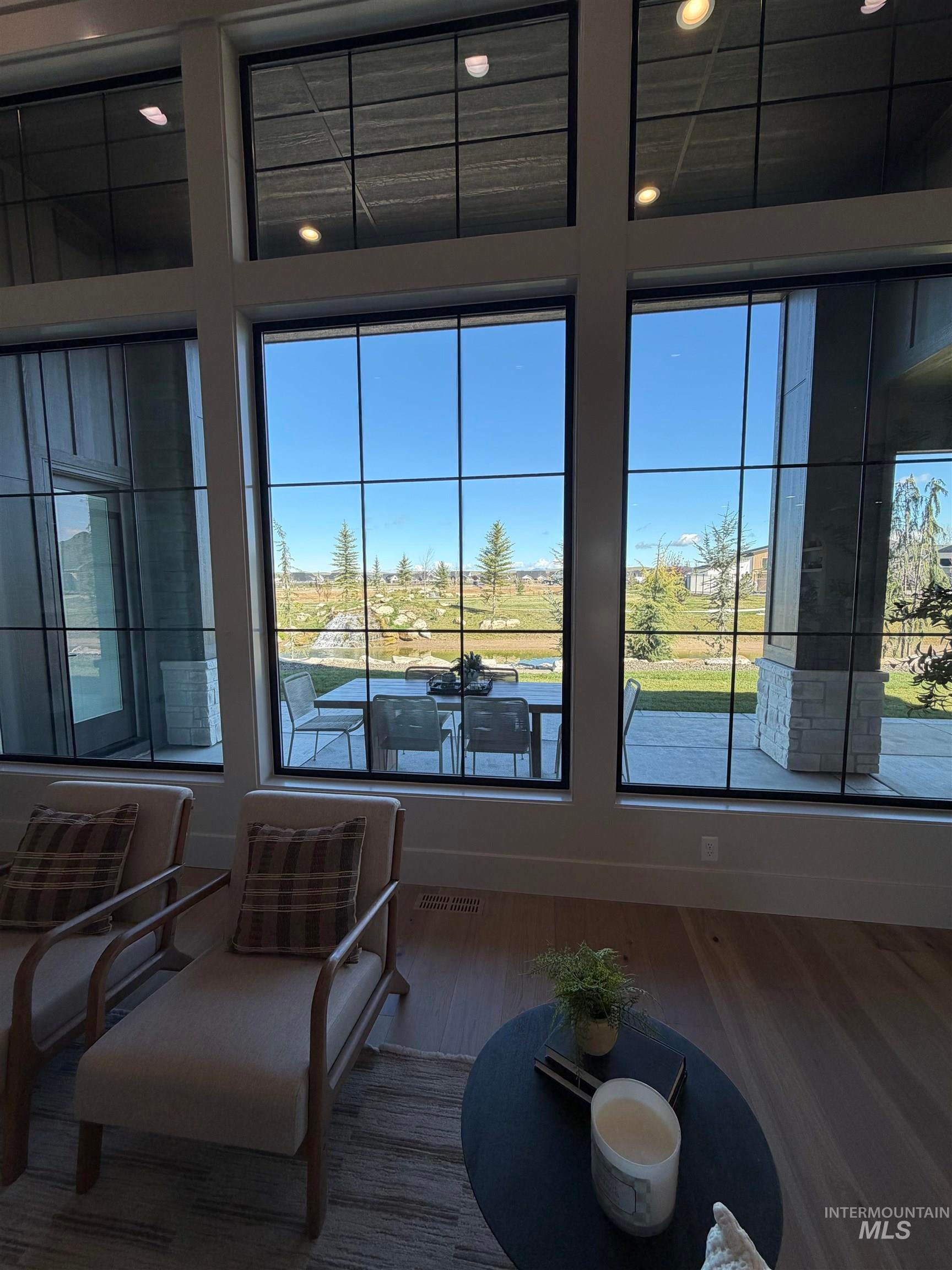 Welcome to an extraordinary waterfront estate where luxury, design, & lifestyle converge in one breathtaking setting. Perfectly positioned along a serene pond with cascading waterfalls, this residence offers a rare blend of architectural sophistication. From the moment you enter, youre greeted by a dramatic open-to-above foyer highlighted by a stunning floating staircasean unforgettable first impression that sets the tone for the entire home. A striking glass-walled office with full glass front and doors creates a modern, light-filled workspace on the main level. The heart of the home is a true chefs kitchen, featuring a grand center island, top-of-the-line appliances, double ovens, built-in range, and an impressive butlers pantry complete with wine refrigeration & custom cabinetry. Extensive engineered hardwood flooring flows throughout, enhancing the homes warmth & elegance. Designed to capture the beauty of its surroundings, the living room, kitchen, & luxurious primary suite all overlook the tranquil waterfront & cascading waterfallscreating a seamless connection between indoor & outdoor living. The primary suite is a private retreat, complete with a stunning stone fireplace, dual vanities, dedicated makeup station, heated tile floors, & a spa-inspired walk-in shower wrapped in full tile. Step outside to your own personal oasis where extensive landscaping, massive