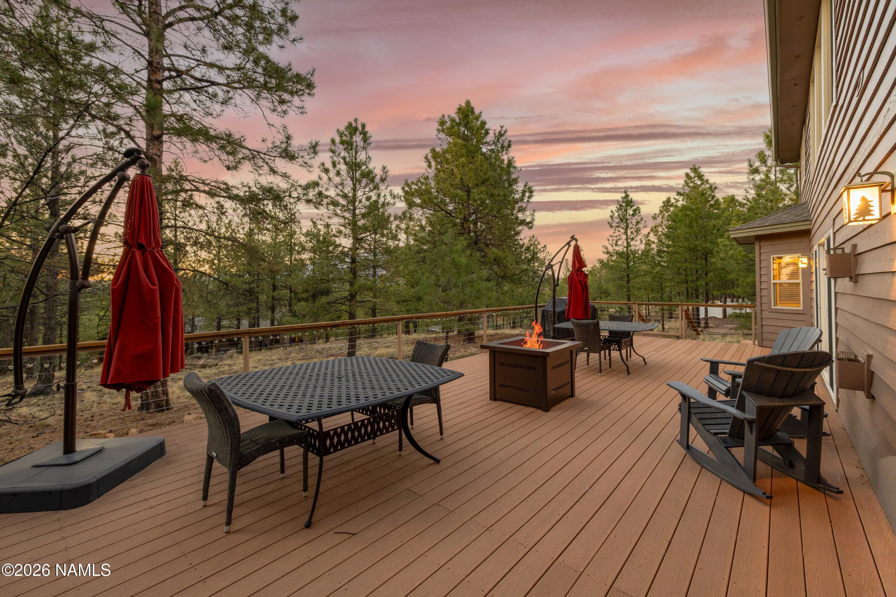 45 Lone Oak is the bright, beautifully updated mountain retreat backing forested green space that buyers wait for. With 5 bedrooms, 3.5 baths, central air, and an upstairs loft that works perfectly as a second living area, this home offers the ideal Flagstaff getaway for both everyday living and hosting family and friends.The open floor plan is filled with natural light, and the main-level primary suite is a standout, complete with a newly remodeled bath and steam shower. In the great room, soaring 18-foot ceilings and a dramatic wall of windows bring in the deep blue sky and peaceful views of the pines. The spacious kitchen has been fully remodeled and is designed for gathering with a large breakfast bar. A separate dining room off of the great room makes this floorplan perfect. A stone fireplace and log accents add just the right amount of mountain character.Step outside and you may never want to leave the back deck. It is the perfect place to relax, entertain, and enjoy the privacy of the green space, cool pines, and views of Mount Elden.Short-term rentals are permitted.Recent improvements include a full kitchen remodel, primary bath remodel with steam shower, upstairs bath remodel, new roof, and garage remodel.The inspection has been completed, repairs have been made or scheduled, and the home is in excellent condition. Move right in and enjoy one of Amberwoods rarest and most beautiful settings.