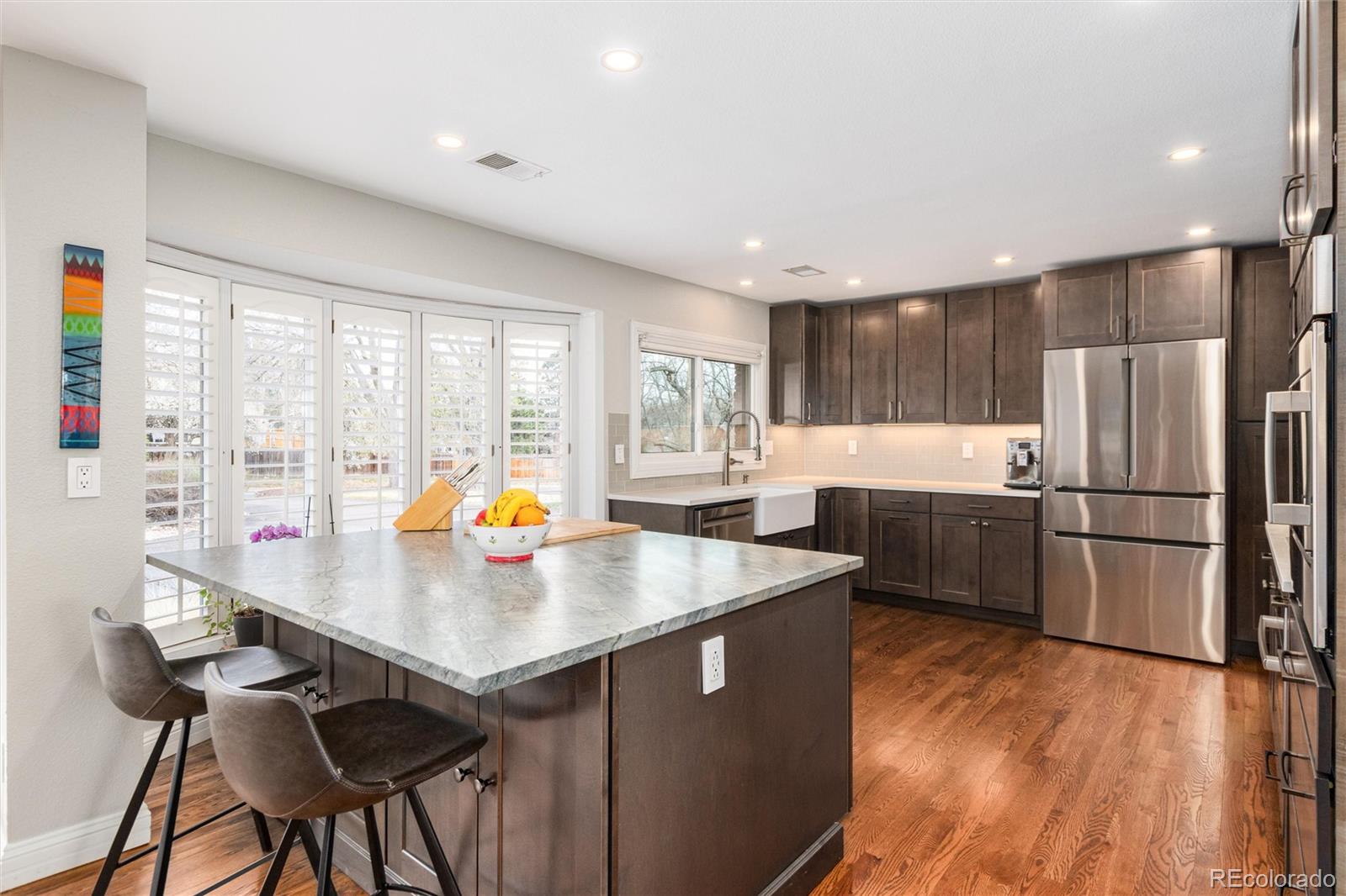 Nestled in the heart of Littleton, this beautifully updated mid-century modern ranch blends timeless design with todays comfortsset on nearly a full acre of serene, usable land. With 4 spacious bedrooms and 4 well-appointed bathrooms, this home offers both style and functionality for modern living, all with expansive mountain views. Step inside to discover clean architectural lines, abundant natural light, and thoughtfully curated updates throughout. The sleek, modern kitchen is the centerpiece of the home, featuring smart appliances, contemporary finishes, ample cabinetry, and plenty of space to gather and entertain. Talk about cozy - the radiant heat system is in the flooring, walls and ceiling! Smart options abound: induction cooking, smart thermostats, even smart light switches.A versatile office/sunroom provides the perfect setting for working from home or relaxing with views of the expansive yard, while a dedicated home gym adds convenience for an active lifestyle. Walkout lower level offers a family room with tv room, pool table, adjacent bar and fireplace. The open layout flows effortlessly, creating inviting spaces for both everyday living and hosting guests.Outside, the nearly one-acre lot offers endless possibilitieswhether you envision outdoor entertaining, gardening, or simply enjoying the privacy and space, even room for a pool! Covered patio off main level as well as large patio with fireplace in backyard. Plenty of space for all your toys: 2 car attached garage and a 4 car tandem detached garage (with EV charging).This rare find combines mid-century charm, modern upgrades, and an unbeatable locationjust moments from everything Littleton has to offer. Just a short distance to downtown Littleton, Reynolds Landing, Aspen Grove, Hudson Gardens, the Mary Carter greenway system and Charley Emley park for tennis! Or grab the light rail into Denver. Just the perfect location!