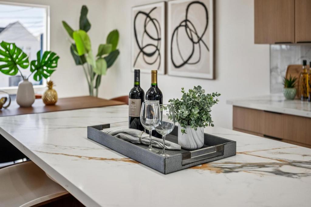 Beautiful 4 Bedroom 2 Bath Single Story Mid Century La Mirada Home in a Quiet Cul-De-Sac Neighborhood. This amazing home isnt a flip, it was a family home that has been lovingly cared for by the people who actually lived there. We think the difference is striking. Upon entering, your friends will be jealous of the open concept great room, perfect for everything from simple family dinners to entertaining a house full of guests. The remodeled kitchen portion includes a huge custom island, quartz countertops, natural cabinets, white subway tile backsplash, stainless gas range, microwave, dishwasher, laminate flooring, dramatic pendant lights, and recessed lighting. The living area portion of the great room boasts vaulted exposed beam ceilings, laminate flooring (same as kitchen), inspired light fixtures, exposed brick fireplace, and a new wood mantle. There has been an intentional effort to keep the great room area warm and welcoming while still light, clean and contemporary. Moving down the hallway that leads to the bedrooms, youll first come across a very convenient 3/4 bath that doubles as guest restroom and on suite bathroom for Bedroom #2. Bedrooms #2 and #3 feature laminate flooring, closet storage, vaulted ceilings, and modern ceiling fans. Bedroom 4 is on the other side of the hallway and features carpet flooring, vaulted ceilings, and a newer ceiling fan. The primary bedroom is also on this side of the hallway, and in addition to vaulted ceiling, a spacious closet, custom accent wall, and newer ceiling fan, it also sits directly adjacent to the remodeled full bathroom. The remodeled full bathroom has new tile flooring, vanity, light fixtures, plumbing fixtures, and a brilliant shower/tub with with subway tile and custom recessed shower shelf. The entire home has new neutral paint plus central AC and heat. There is ample vehicle storage with a two car garage plus an oversized driveway. The home provides a Laundry room directly off the kitchen with washer hookups, electric and gas dryer hookups, as well as convenient cabinet storage. Around back, the yard area features a slightly elevated wooden deck with sunshade, perfect for outdoor dining on a warm Spring evening. Address feeds La Pluma Elementary, Benton Middle, and La Mirada High School. Close proximity to shopping, groceries, the La Mirada Theatre, La Mirada Regional and Splash Waterpark. This will be a very clean sale with no seller contingencies so hurry because it wont last long.