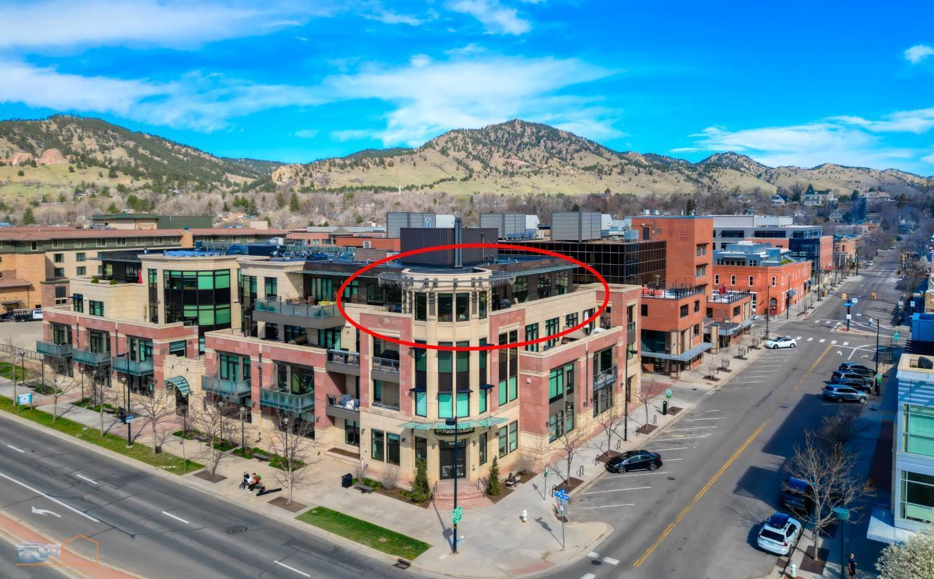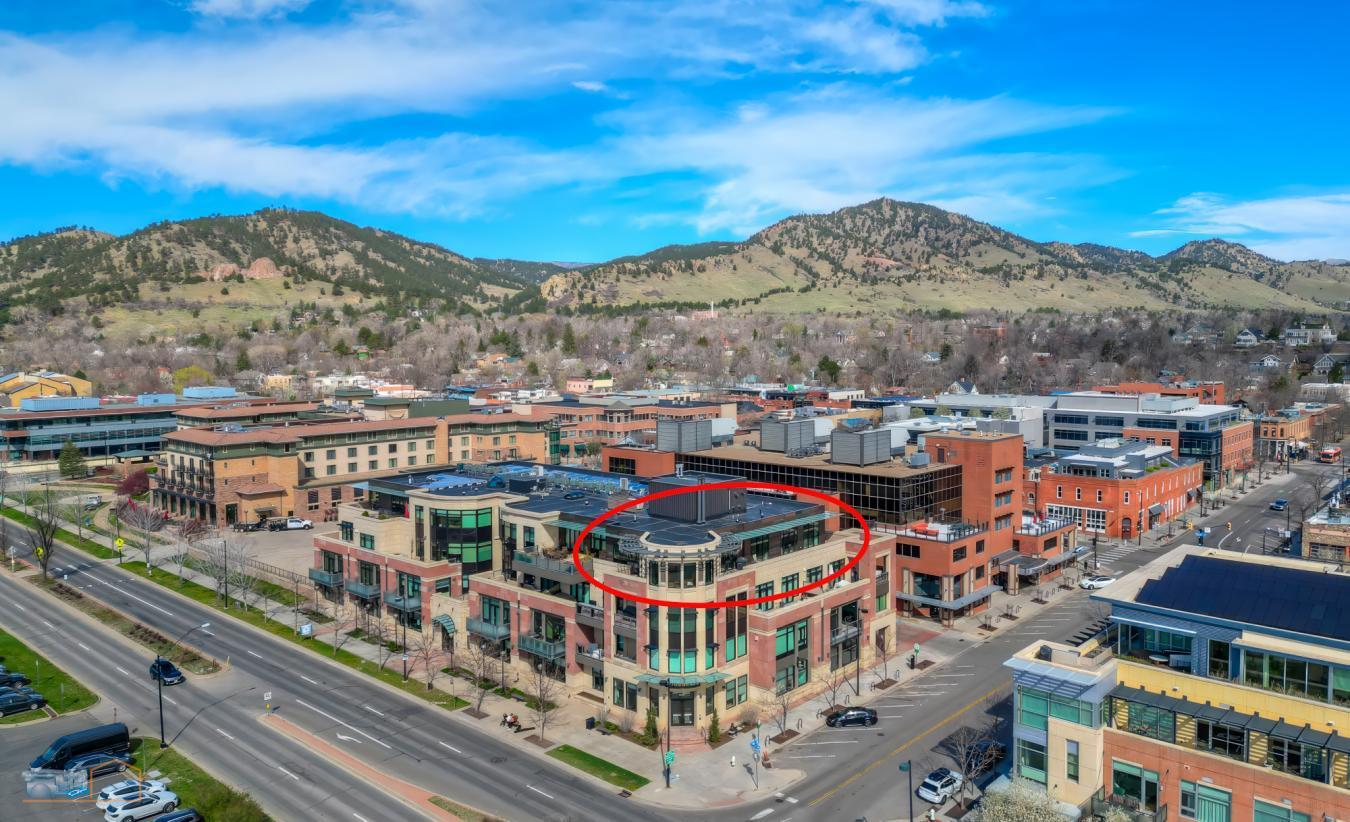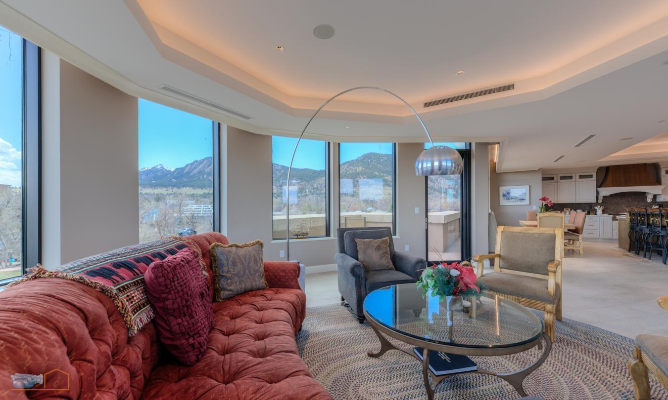 Considered by many to be the finest residence in downtown Boulder. Stunning 4415 sf penthouse in the Arete with floor to ceiling panoramic views above tree line to the Flatirons, Central Park, Boulder Creek, Folsom Stadium, Chautauqua and Pearl St. Mall. And all of downtown within steps or viewed from a 1400sf wrap around patio. This build-out of only 5 years ago, features a rare turret style living room of convex architecture providing full vistas 24/7 without the need to be outside. The turret, with expansive windows, floods the living space with abundant sunshine. An inviting open-concept layout seamlessly merges the kitchen, dining, and living areas, making entertaining and socializing a central focus. Moros Fabrication cut and installed the Pental slab quartz kitchen island and natural stone granite countertops. Wolf double ovens and range top, Sub-Zero refrigerator, custom cabinetry, bespoke range hood, and wine cooler make this kitchen truly a haven for culinary enthusiasts. The family room with custom fireplace and marble mantel, provides a cozy retreat while keeping the mountains in view. Adjacent home office with built ins. The generous primary bedroom will not disappoint, with recessed cove lighting, TV/fireplace and library wall. Luxurious spa like bathroom, additional primary vanity & an expansive walk-in closet. The current owner uses one of the three additional bedrooms as an exercise room, but all have ensuite bathrooms, granite counters and direct access to the 1400 sf wraparound patio that enjoys late day sunshine. There are 15 full size doors with custom screens providing natural air flow. Abundant and discrete storage throughout and a 150 sf storage room in the garage that includes built-in shelving. The unit comes with 3 dedicated underground parking spaces with additional parking available for guests. The Arete is an elite building and certified as Silver Leeds consistently drawing the highest resale prices in Boulder since opening in 2009.