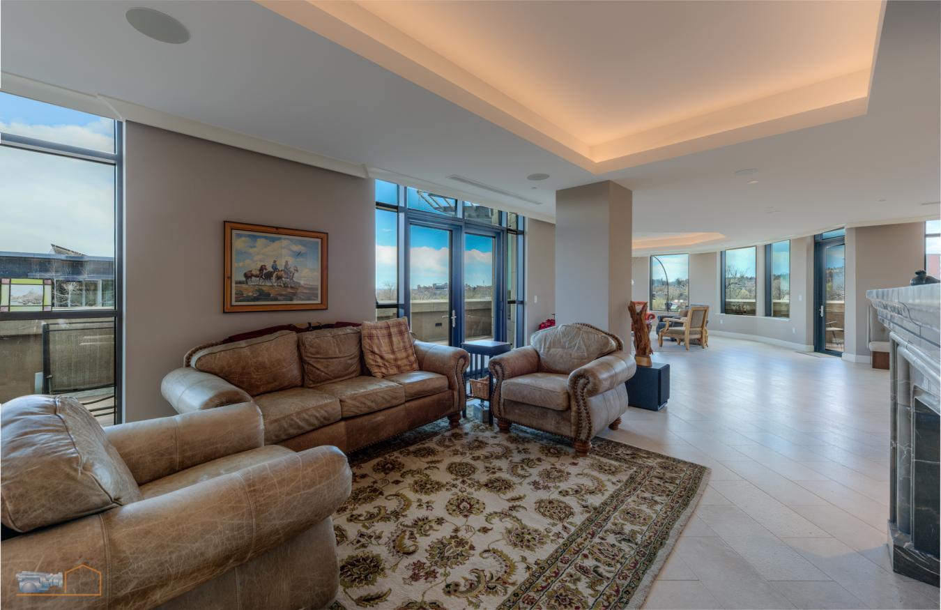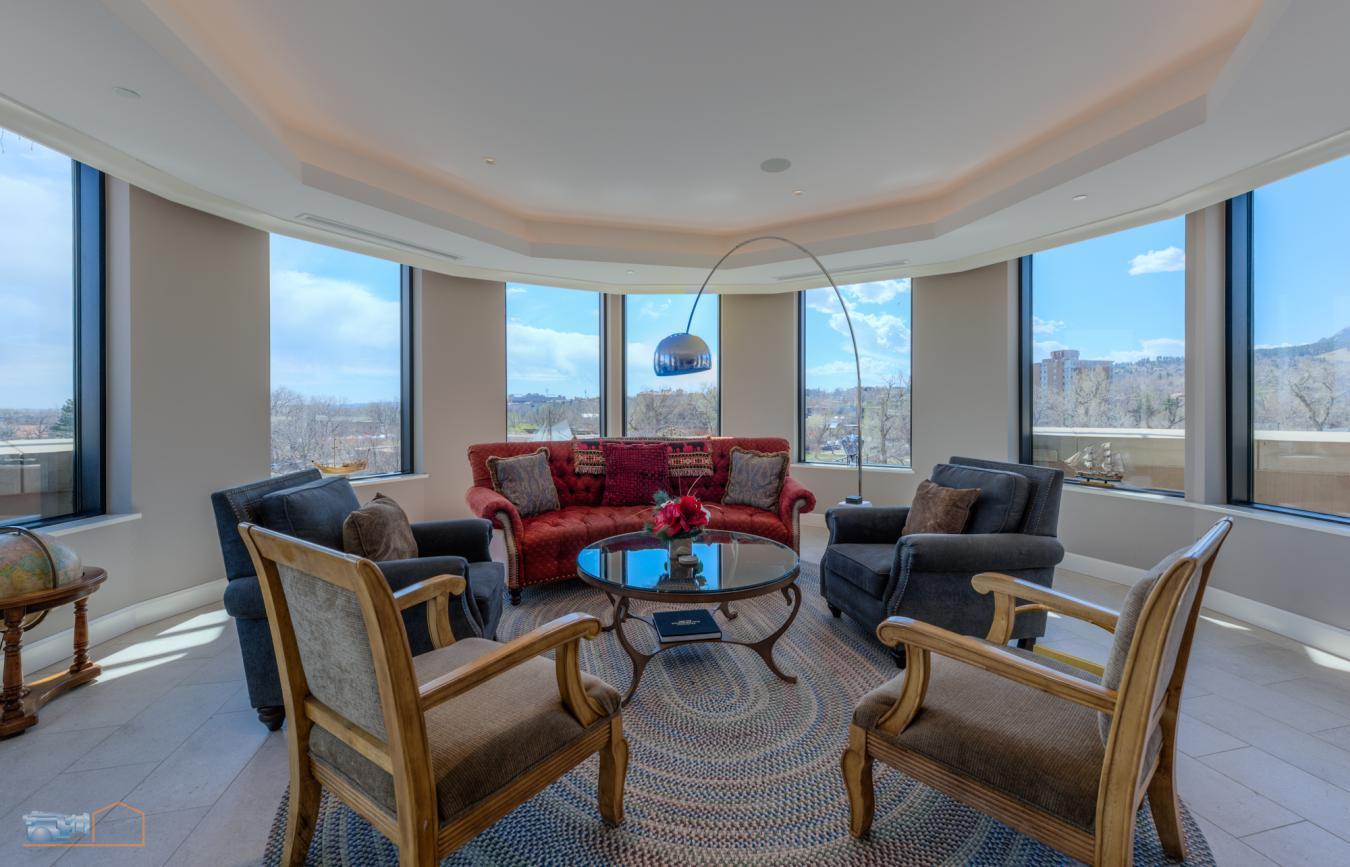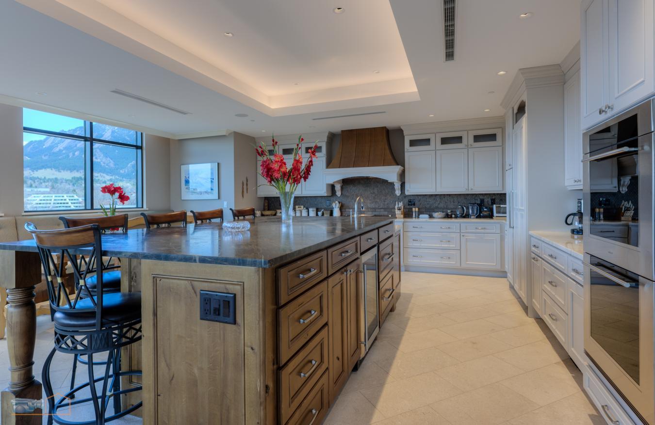 Considered by many to be the finest residence in downtown Boulder. Stunning 4415 sf penthouse in the Arete with floor to ceiling panoramic views above tree line to the Flatirons, Central Park, Boulder Creek, Folsom Stadium, Chautauqua and Pearl St. Mall. And all of downtown within steps or viewed from a 1400sf wrap around patio. This build-out of only 5 years ago, features a rare turret style living room of convex architecture providing full vistas 24/7 without the need to be outside. The turret, with expansive windows, floods the living space with abundant sunshine. An inviting open-concept layout seamlessly merges the kitchen, dining, and living areas, making entertaining and socializing a central focus. Moros Fabrication cut and installed the Pental slab quartz kitchen island and natural stone granite countertops. Wolf double ovens and range top, Sub-Zero refrigerator, custom cabinetry, bespoke range hood, and wine cooler make this kitchen truly a haven for culinary enthusiasts. The family room with custom fireplace and marble mantel, provides a cozy retreat while keeping the mountains in view. Adjacent home office with built ins. The generous primary bedroom will not disappoint, with recessed cove lighting, TV/fireplace and library wall. Luxurious spa like bathroom, additional primary vanity & an expansive walk-in closet. The current owner uses one of the three additional bedrooms as an exercise room, but all have ensuite bathrooms, granite counters and direct access to the 1400 sf wraparound patio that enjoys late day sunshine. There are 15 full size doors with custom screens providing natural air flow. Abundant and discrete storage throughout and a 150 sf storage room in the garage that includes built-in shelving. The unit comes with 3 dedicated underground parking spaces with additional parking available for guests. The Arete is an elite building and certified as Silver Leeds consistently drawing the highest resale prices in Boulder since opening in 2009.