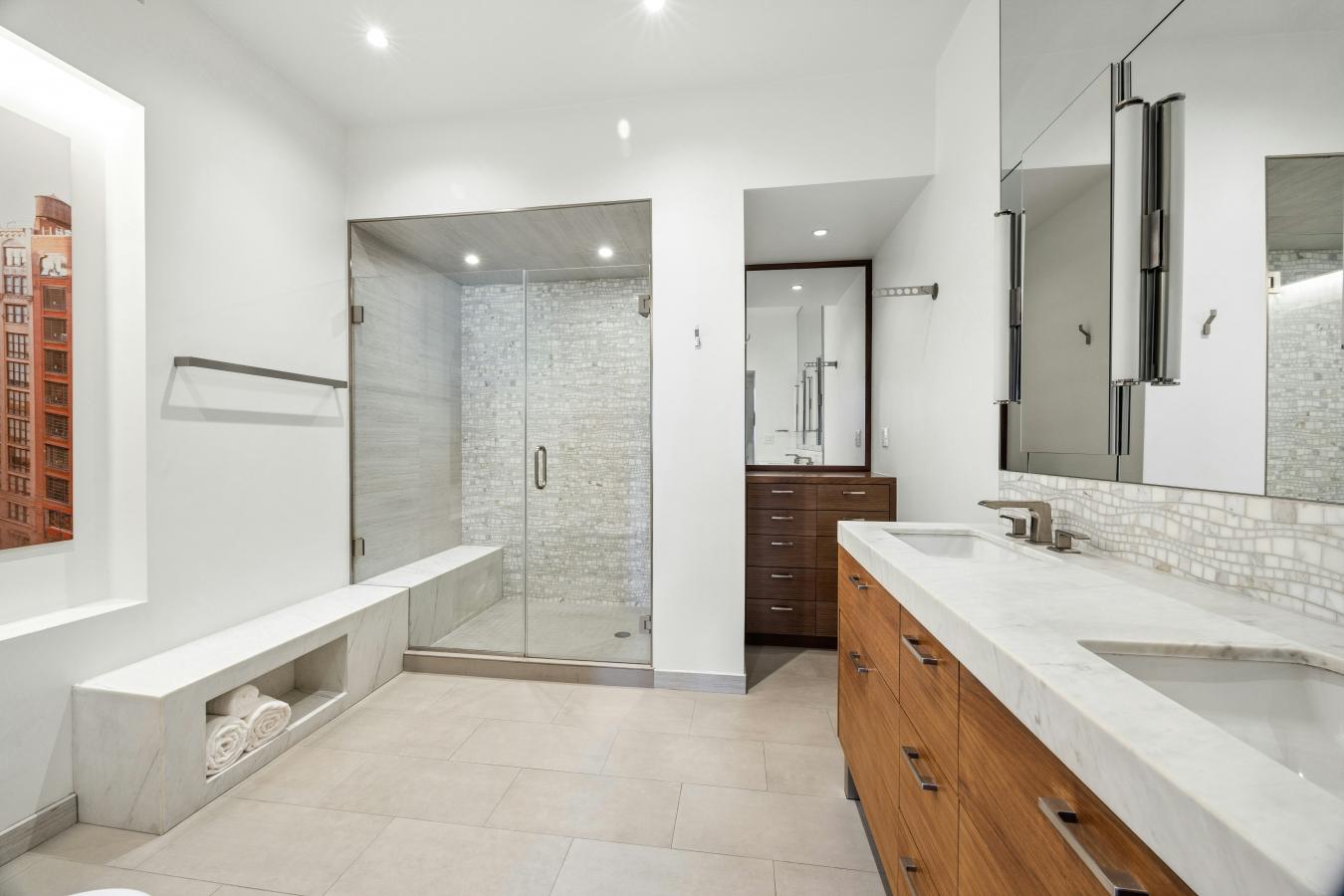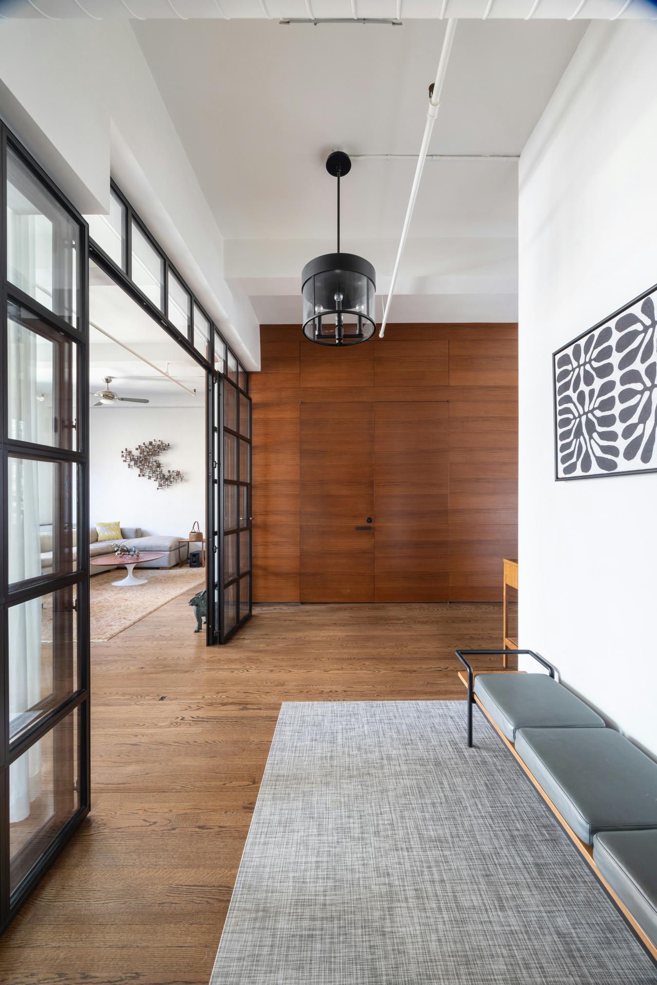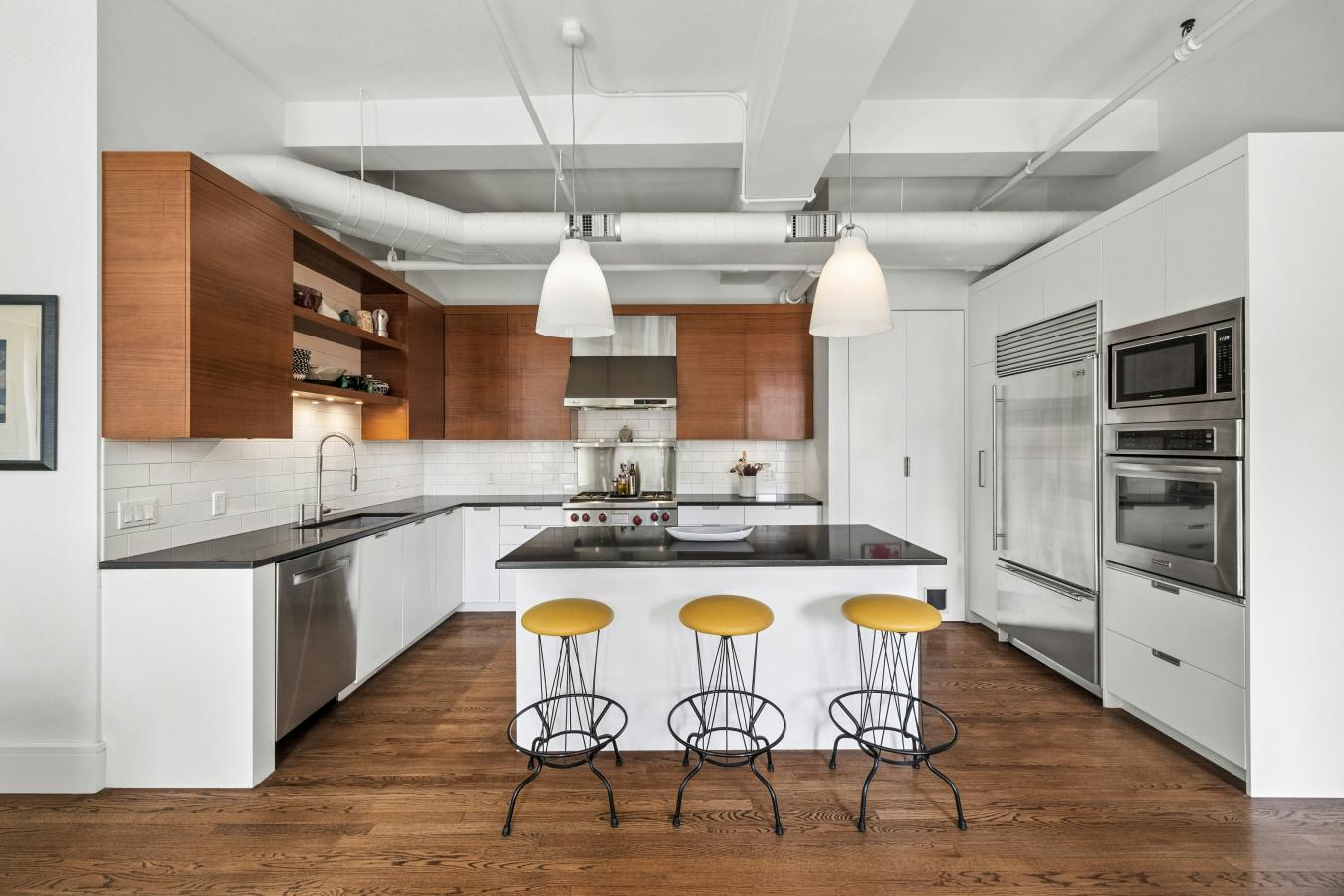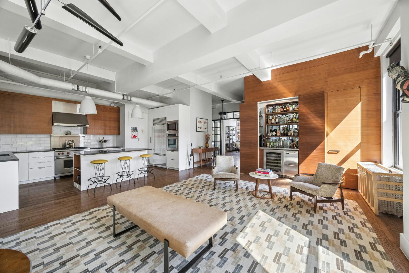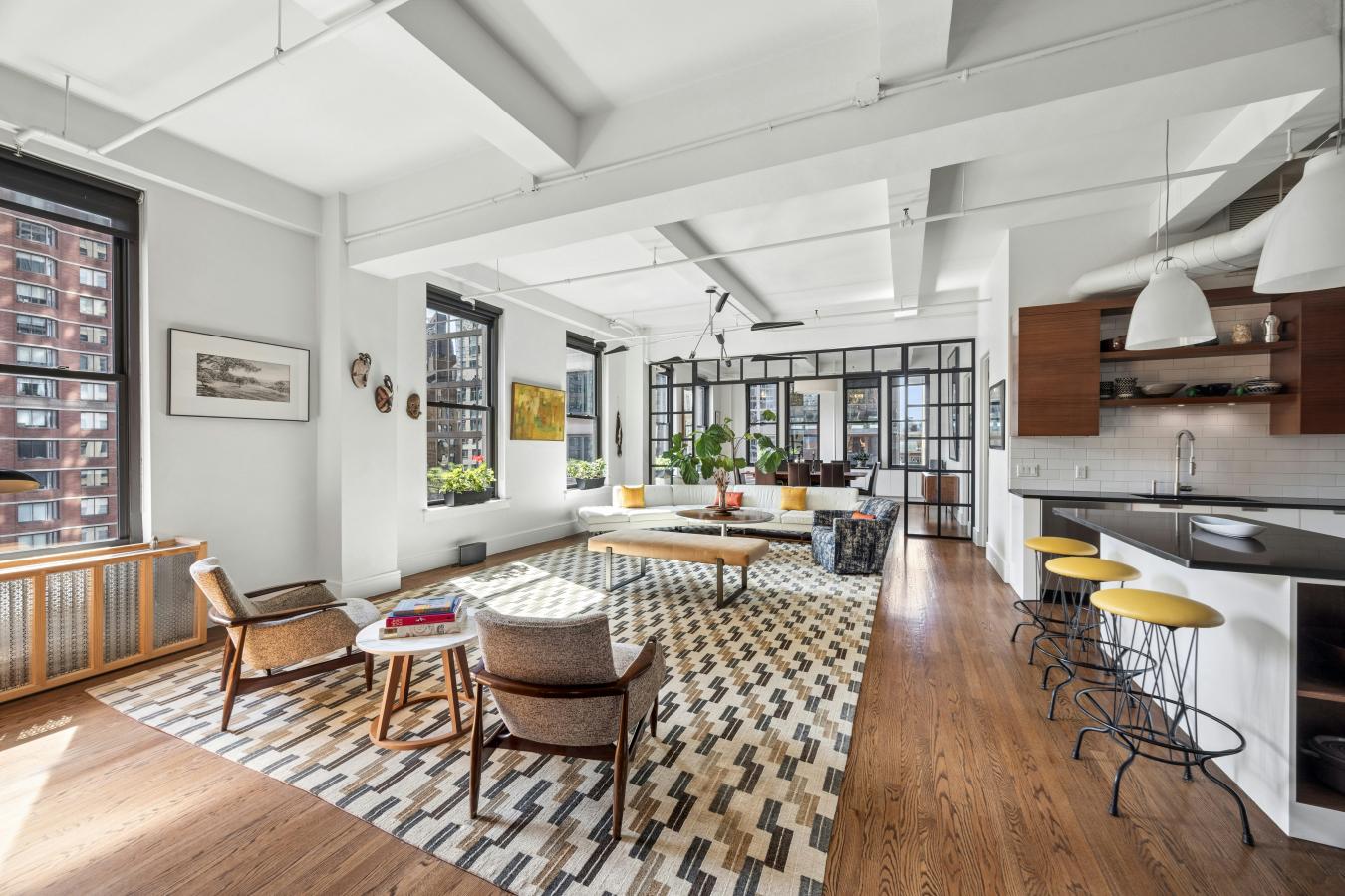 Gorgeously renovated full floor condo loft in prime Chelsea with spectacular light and open views. The residence has dramatic, oversized windows on four sides and 11-foot ceilings. Located in a prewar boutique building on 25th Street, the apartment is close to all that downtown offers and is ideally situated a block from Madison Square Park. A private, keyed elevator enters directly into the loft, where a foyer with a custom glass and steel partition and walnut paneled walls characterizes the mid-century aesthetic. The 43-foot expanse of living/dining provides a commanding sweep of entertaining space, with sunny open eastern and southern exposures. This sprawling spread is elegantly divided by a floor-to-ceiling steel and glass partition, which stylishly separates the living from the dining while maintaining the openness of the apartment. The huge chefs kitchen has everything a gourmet might desire, including a Wolf stove with griddle, a built-in KitchenAid wall oven, Bosch dishwasher, and a Sub Zero refrigerator. The hood is vented, the island massive for prep and entertaining and there is ample storage both in the custom walnut cabinets and the adjoining pantry. In addition, there is a bar, artfully concealed behind millwork, with a wine fridge and two refrigerator drawers. The primary suite has sunny southern and western exposures, built-ins with a concealed television, custom closets, and a huge marble bathroom with walnut and cherry millwork, marble counters, double vanity, bidet and a glass-enclosed shower and radiant heated floors. Currently used as a comfortable and bright den/media room, the large room to the left of the entry foyer is separated from the apartment by a glass and steel wall. This space, with northern views, is ample enough to become either one or two additional bedrooms. It has easy access to the bathroom that currently serves the additional guest bedroom. Off the foyer is also a huge mudroom/laundry room with tons of storage and a vented washer dryer. A third full bath provides layout options should another bedroom be needed. The loft is cooled by central air conditioning throughout. Built in 1911 with a limestone and glazed terra cotta tile facade, 110 W 25th street is a boutique condominium consisting of eleven foot full-floor lofts plus commercial space on the first floor. The building has an on site superintendent, a video-intercom system and is pet-friendly. There is an assessment of 1493 through 2030.