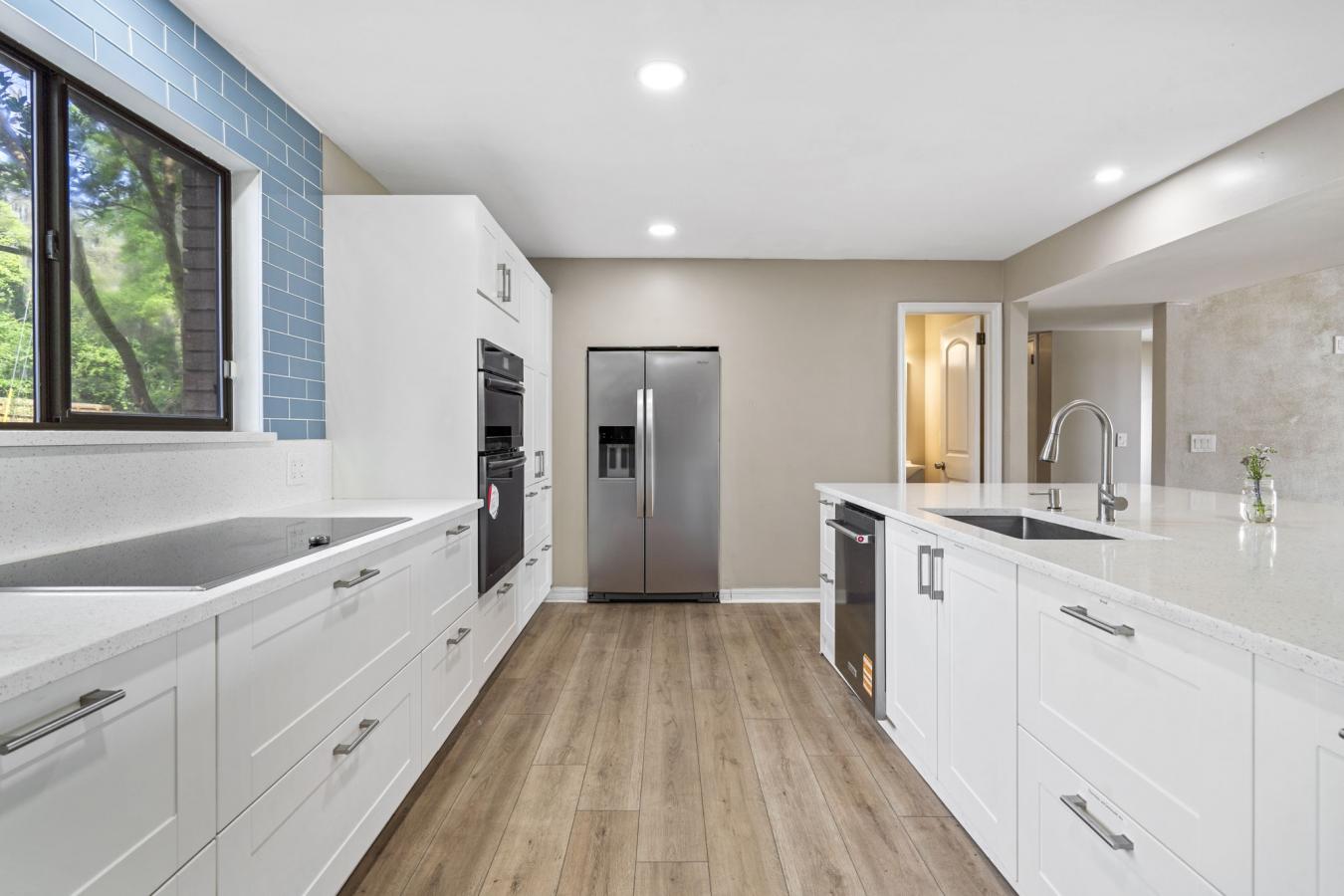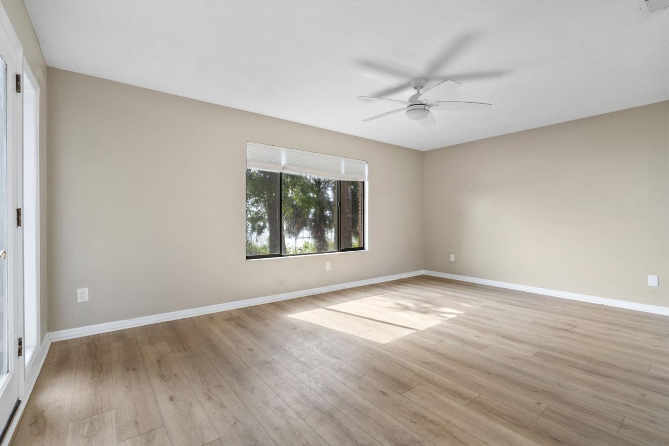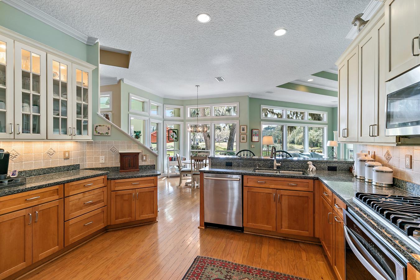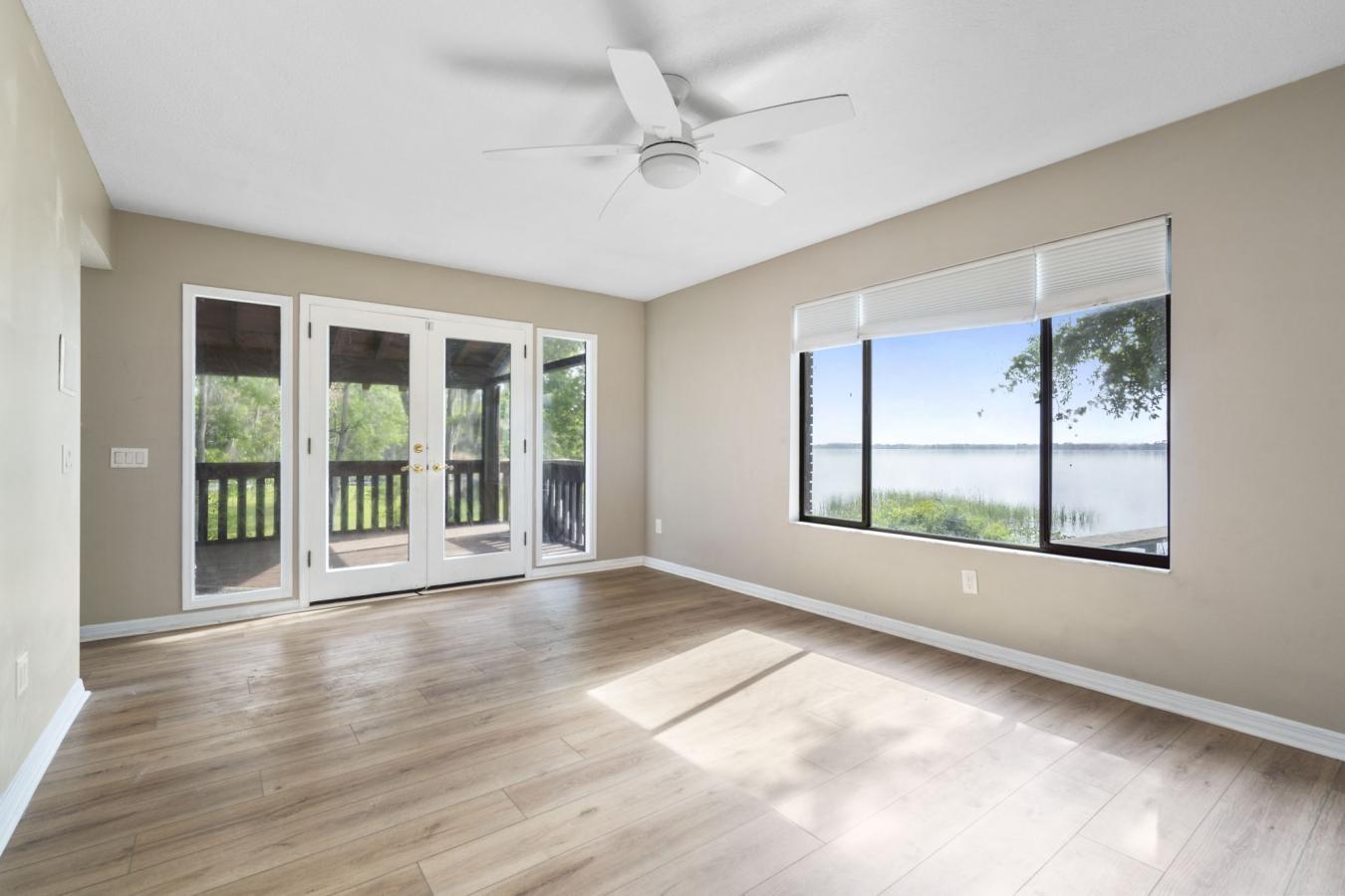 Drive down a private tucked away driveway and arrive at this waterfront retreat on Doctors Lake, where every day feels like a vacation! Situated on over 1.5 acres, this exceptional property offers some of the widest water views on Doctors Lake and breathtaking sunrises. The home features a first-floor waterfront owners suite designed for comfort and privacy, complete with its own sitting area, fireplace, screened porch, and a spacious custom walk-in closet. The heart of the home is the dramatic two-story family room, featuring floor-to-ceiling windows that capture panoramic lake views and a cozy fireplace that creates a warm, inviting atmosphere. The upgraded kitchen opens seamlessly to the living space, making it ideal for entertaining. It features an oversized island with abundant storage, quartz countertops, soft-close drawers, illuminated cabinetry, and stainless steel appliances. Throughout the home you will find new LVP flooring. Choose from 2 decks to enjoy the water views!