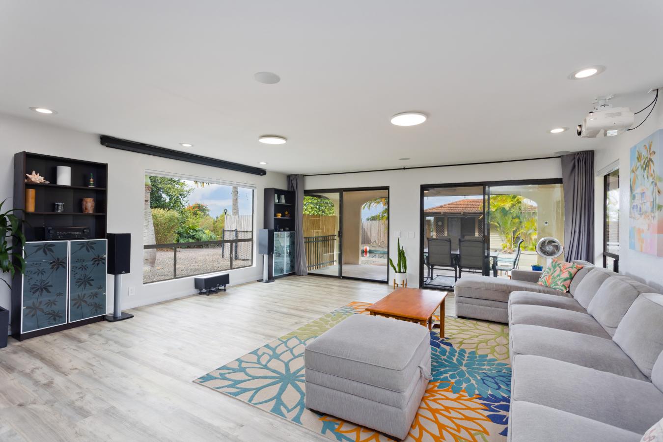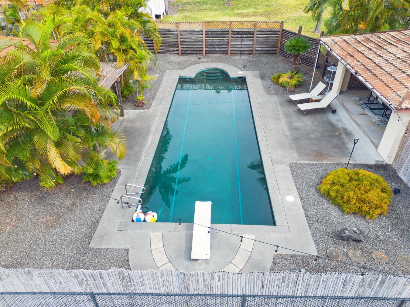 Discover your own private tropical oasis in the desirable Kona Acres community-an exceptional one-acre retreat featuring a main residence, pool house, and detached hosted vacation rental set against ocean-view backdrops and lush island landscaping. The main home offers 4 bedrooms and 3 baths, showcasing all-new vinyl plank flooring, fresh paint throughout & upgraded recessed lighting. The spacious kitchen features a reverse osmosis system, a new refrigerator & an open-concept design that invites ocean breezes & pool views while you cook. The living area centers around a home theater equipped with an automated projector, retractable screen & built-in surround sound-perfect for movie nights or entertaining guests w/ tranquil pool views. The primary suite includes a walk-in closet, en suite bath, & private lanai. Two additional bedrooms are just right down the hall. Step outside to your resort-style pool, solar-heated & surrounded by tropical greenery, papaya, loquat, white pineapple, & avocado trees. The pool house provides guests with their own private retreat featuring a full bedroom & bathroom, ideal for quiet relaxation or extended stays. Completing this unique property is a detached, fully remodeled 2-bedroom, 1-bath home, currently operating as a hosted short-term vacation rental & offered fully furnished for a seamless, income-producing opportunity. With ocean views, expansive outdoor living, and both luxury and versatility built in, this property perfectly blends island living and investment potential in one exceptional package. The buyer & their agent to perform due diligence.