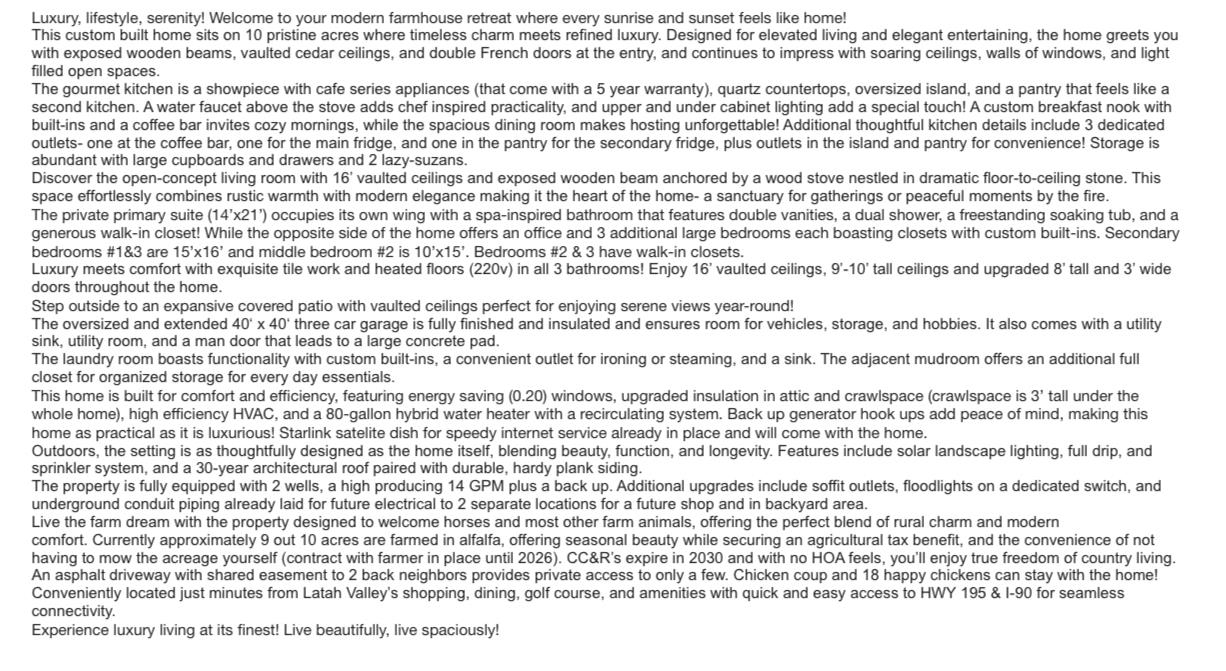 LUXURY, LIFESTYLE, SERENITY! Welcome to your modern farmhouse retreat on 10 pristine acres! You are greeted with 16' vaulted ceilings, exposed wooden beams, walls of windows, and an open layout! The gourmet kitchen impresses with café series appliances, quartz countertops, oversized island, breakfast nook, coffee bar, and a pantry that feels like a second kitchen! A wood stove is nestled in floor-to-ceiling stone in the livingroom. The primary suite occupies its own wing with a spa-inspired bath featuring double vanities, dual shower, and a standalone tub! The opposite side of the home offers an office and 3 large bedrooms, each boasting closets with custom built-ins. Outstanding features include 9-10' ceilings, 8'x3' doors, heated bathroom floors, upgraded insulation, hi-eff HVAC, backup generator hookups, 40'x40' insulated garage, hardy plank siding, 30-year roof, 2 wells, and in-ground conduit for future shop electrical connection. Minutes to Latah Valley, HWY 195, and I-90.