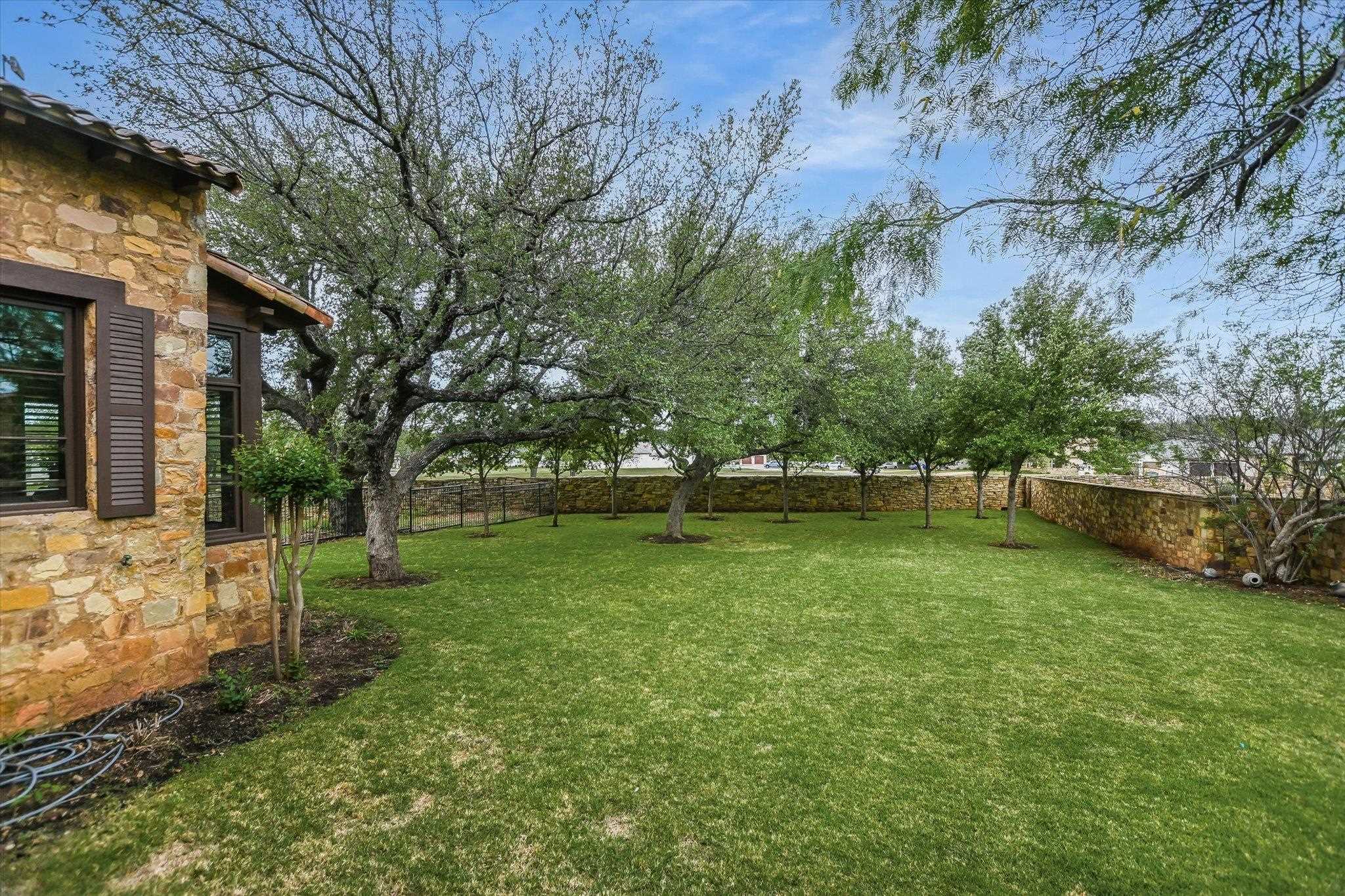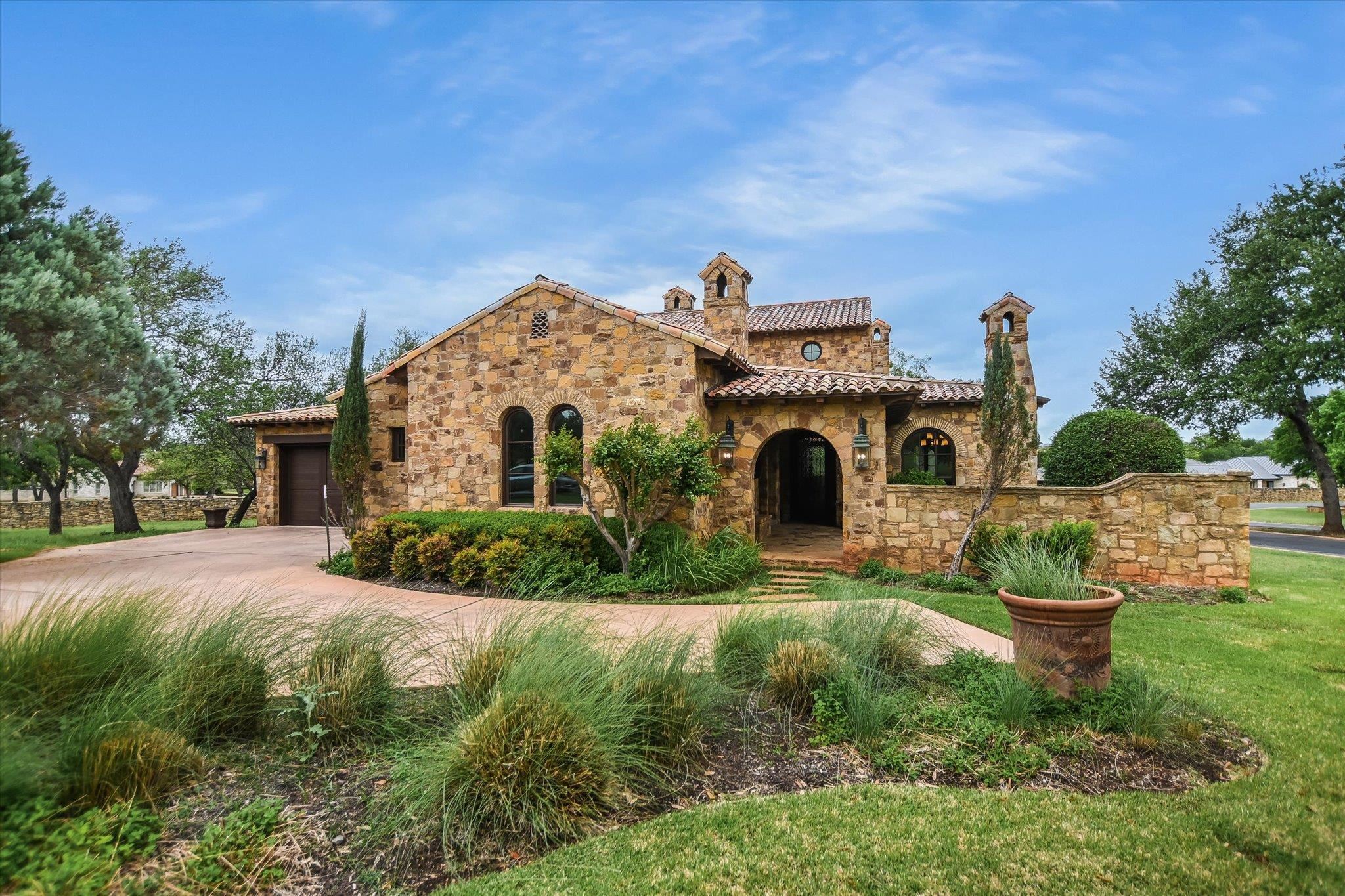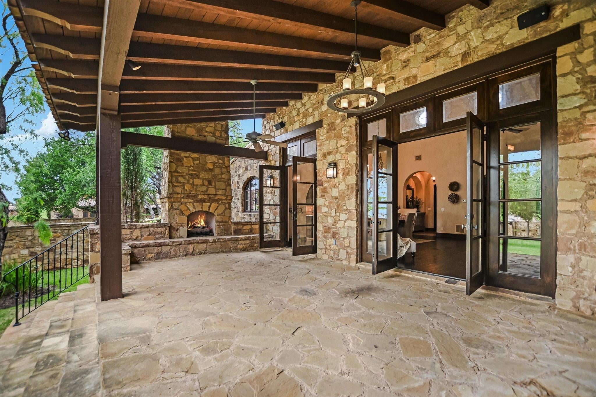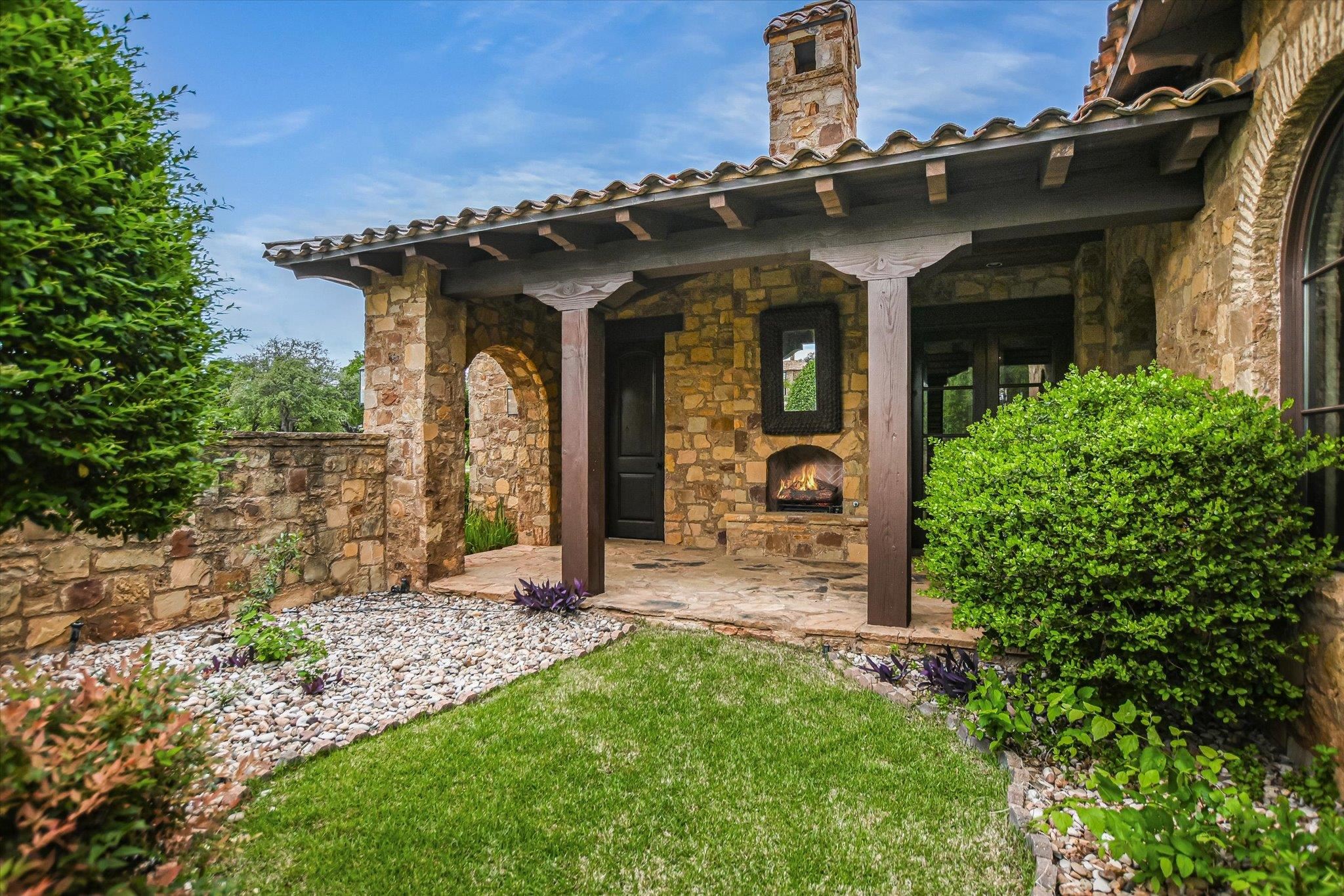 A front courtyard fireplace sets the tone, where the glow of the fire and the stillness of the Hill Country create a natural place to gather. From this warm and welcoming entry, 100 Milagro unfolds into a thoughtfully crafted 3,352 sq. ft. residence within the private gates of Escondido Golf & Lake Club, offering a refined yet relaxed approach to luxury living. Arched passageways, rich wood beams, and hand-selected finishes define the interiors, where the main living and dining spaces open beneath soaring ceilings and center around a stone fireplace. The chefs kitchen is both functional and inviting, featuring custom cabinetry and a generous island, with an adjoining bonus space anchored by its own fireplace, offering flexibility for a second living area, media room, or breakfast nook. The home offers four bedrooms and four full baths, including a spacious primary suite with a sitting area, spa-like bath, and expansive walk-in closet. An upstairs guest suite provides a private, tucked-away retreatideal for hosting family and friendswhile a fourth bedroom or study with patio access is well-suited for guests or a quiet workspace. Outdoor living continues on the covered back patio with fireplace, creating a comfortable extension of the home for year-round enjoyment and relaxed gatherings. Overlooking an expansive backyard shaded by mature trees, the setting offers both privacy and space to unwind, with the potential to add a pool and create a true resort-style retreat.
