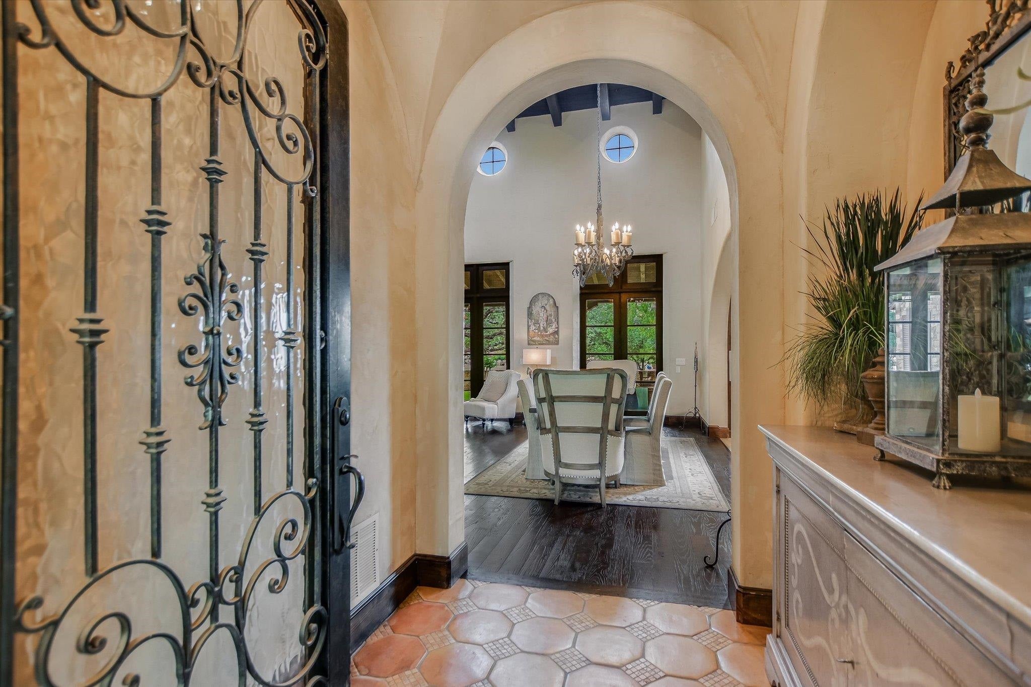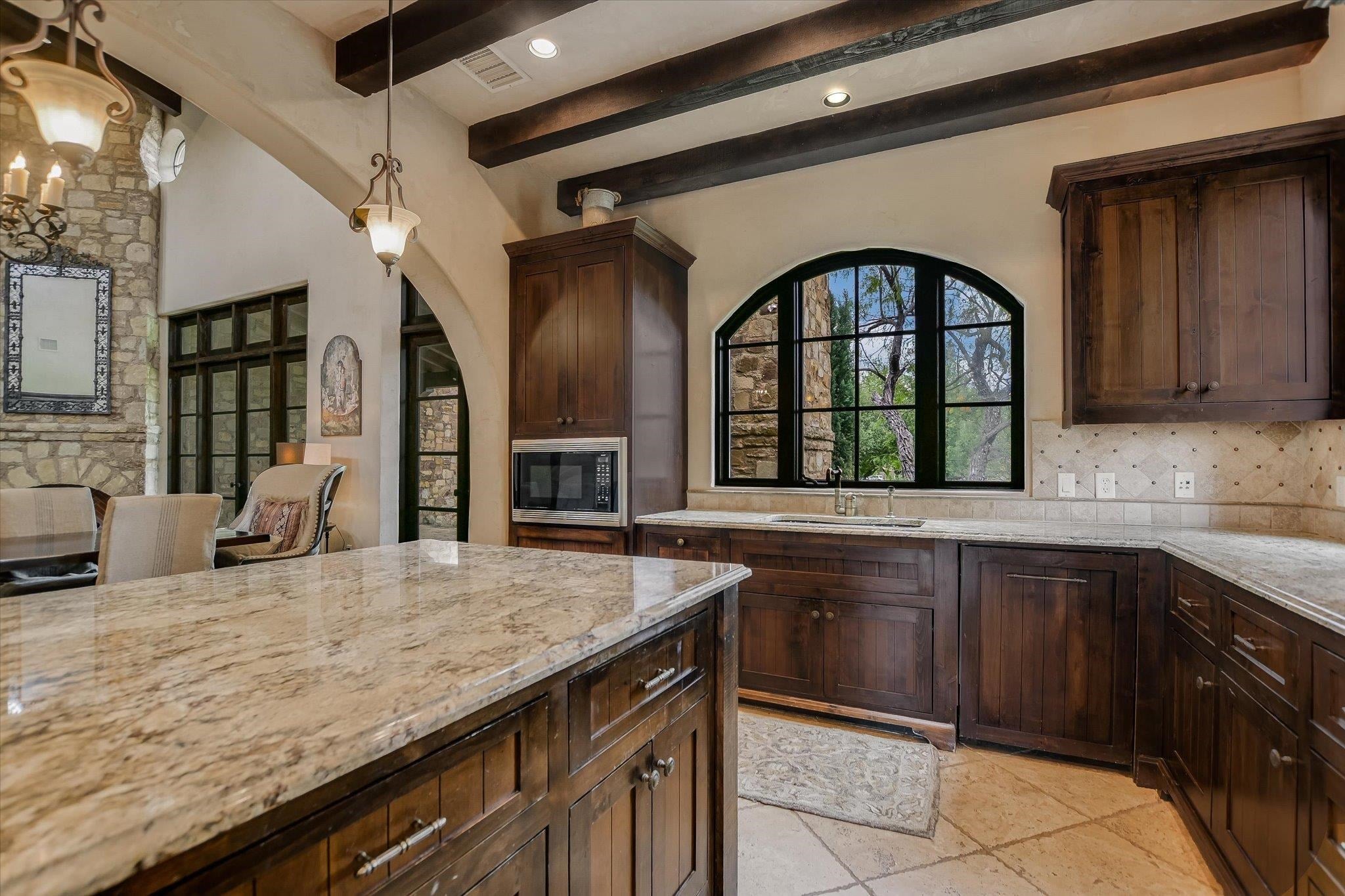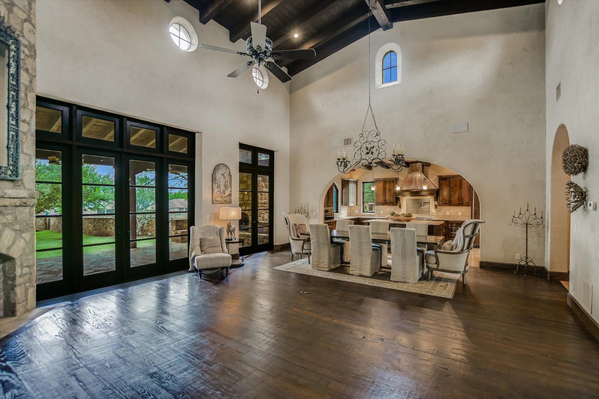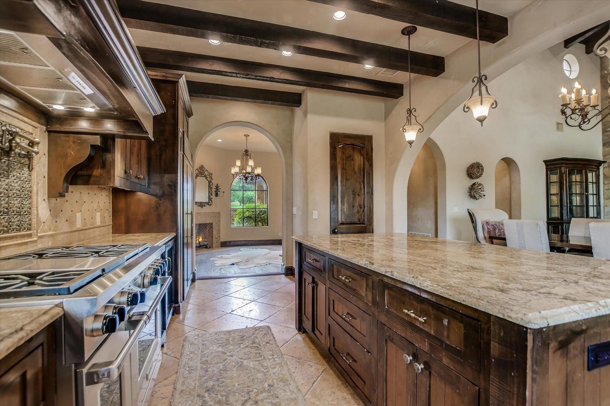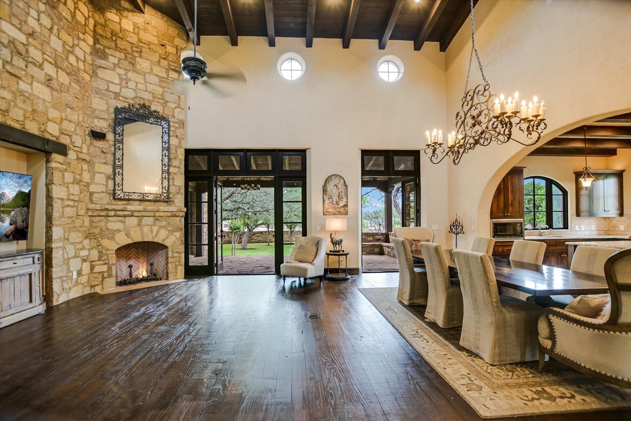 A front courtyard fireplace sets the tone, where the glow of the fire and the stillness of the Hill Country create a natural place to gather. From this warm and welcoming entry, 100 Milagro unfolds into a thoughtfully crafted 3,352 sq. ft. residence within the private gates of Escondido Golf & Lake Club, offering a refined yet relaxed approach to luxury living. Arched passageways, rich wood beams, and hand-selected finishes define the interiors, where the main living and dining spaces open beneath soaring ceilings and center around a stone fireplace. The chefs kitchen is both functional and inviting, featuring custom cabinetry and a generous island, with an adjoining bonus space anchored by its own fireplace, offering flexibility for a second living area, media room, or breakfast nook. The home offers four bedrooms and four full baths, including a spacious primary suite with a sitting area, spa-like bath, and expansive walk-in closet. An upstairs guest suite provides a private, tucked-away retreatideal for hosting family and friendswhile a fourth bedroom or study with patio access is well-suited for guests or a quiet workspace. Outdoor living continues on the covered back patio with fireplace, creating a comfortable extension of the home for year-round enjoyment and relaxed gatherings. Overlooking an expansive backyard shaded by mature trees, the setting offers both privacy and space to unwind, with the potential to add a pool and create a true resort-style retreat.