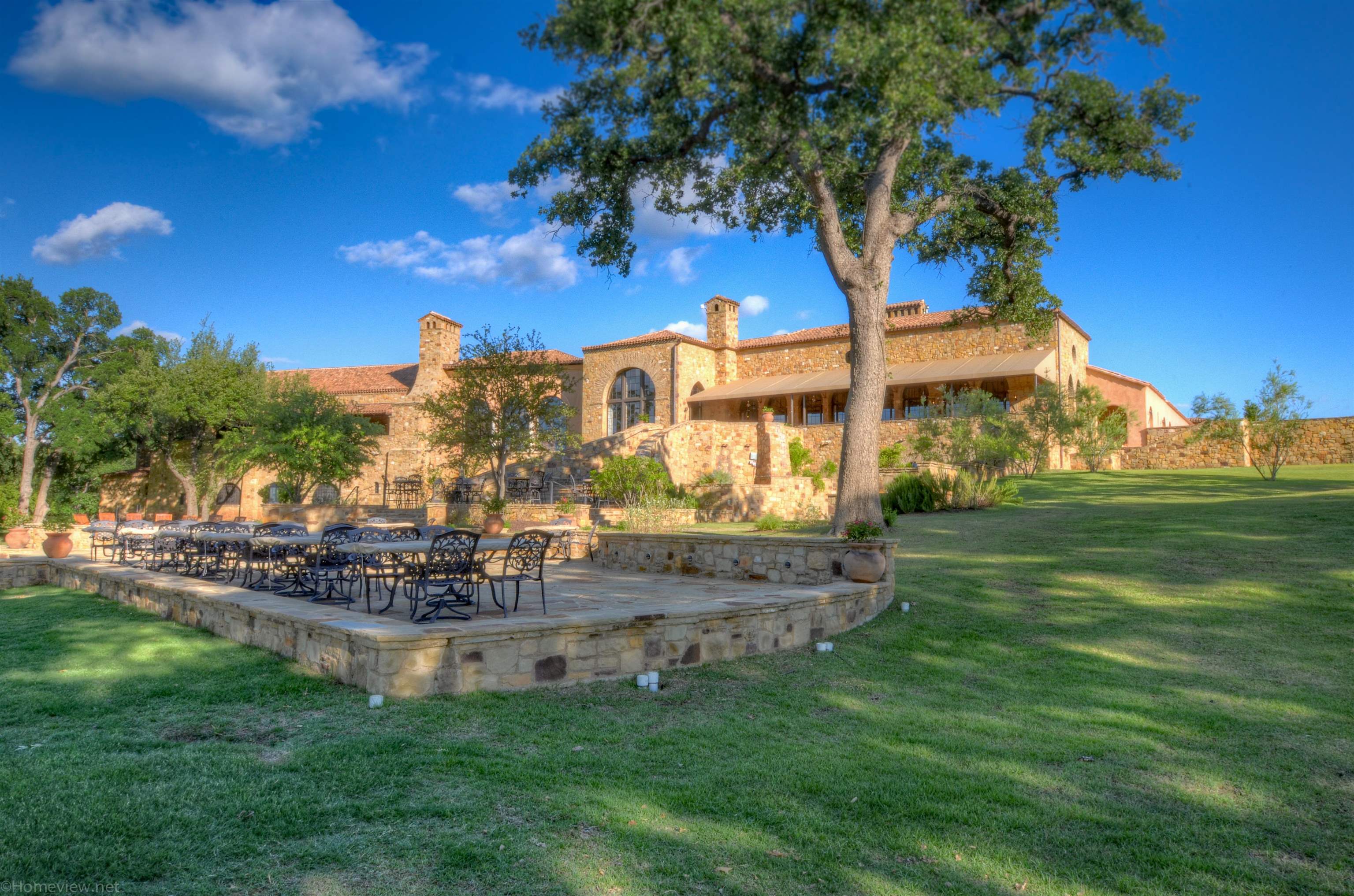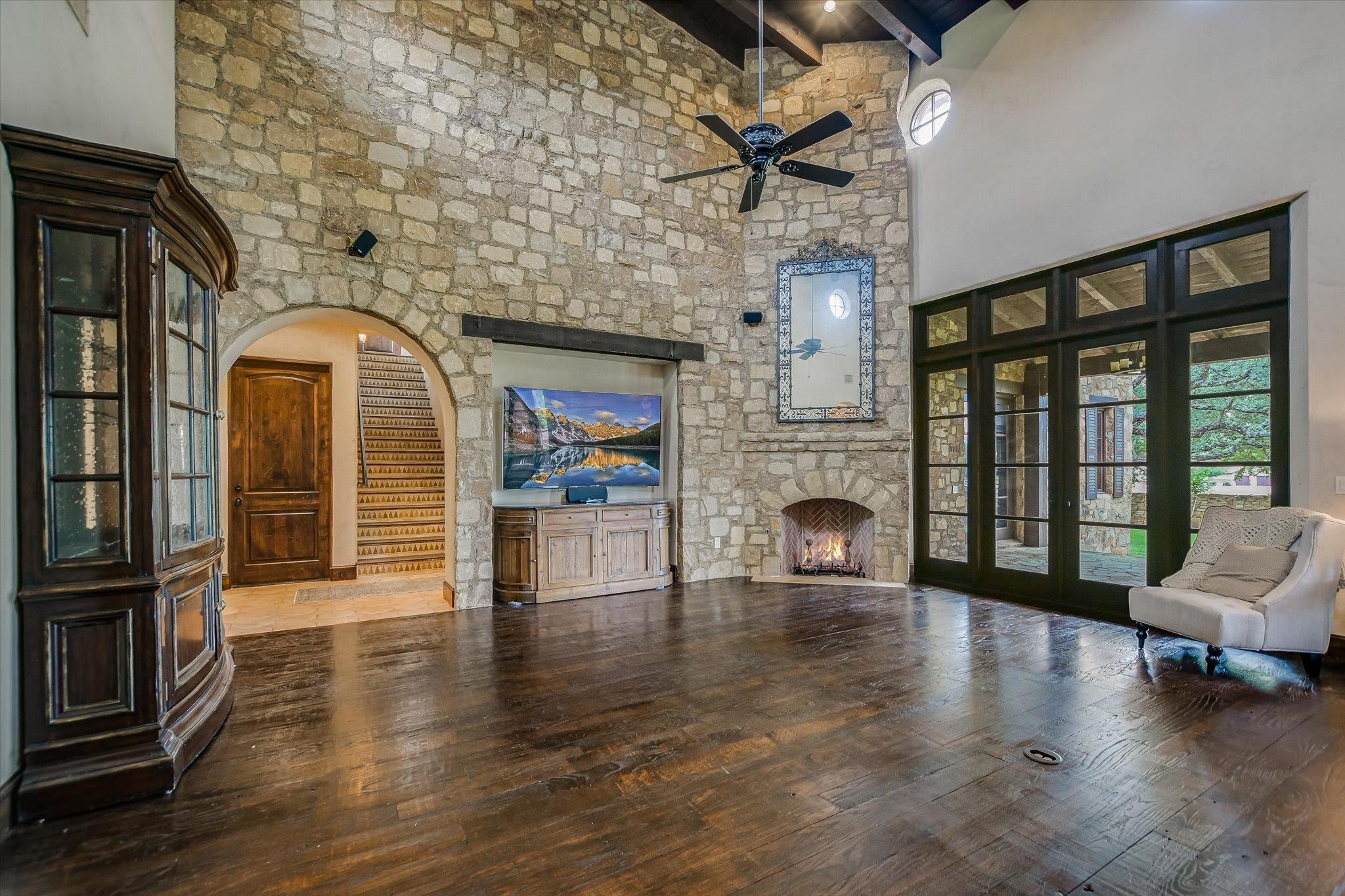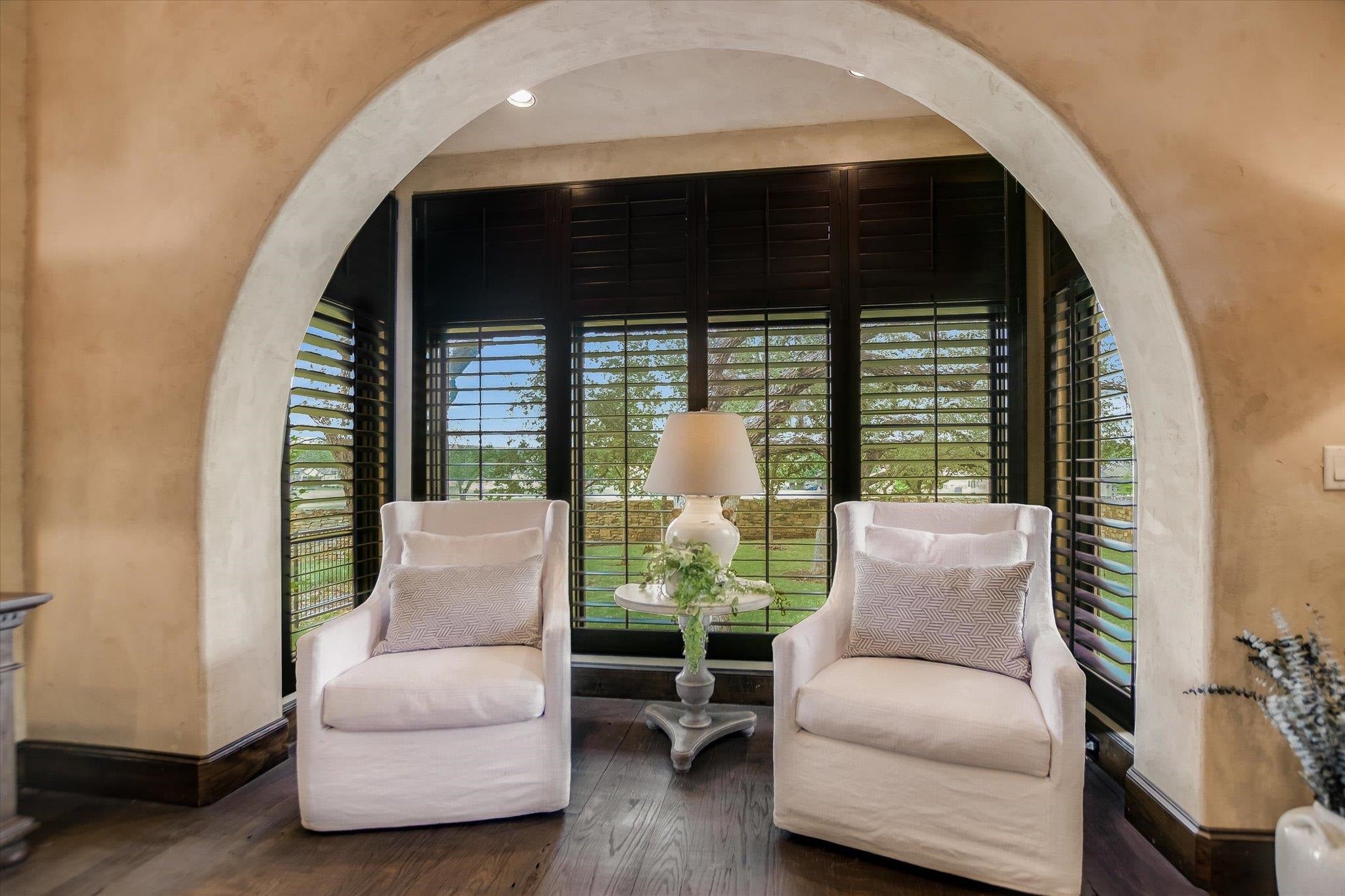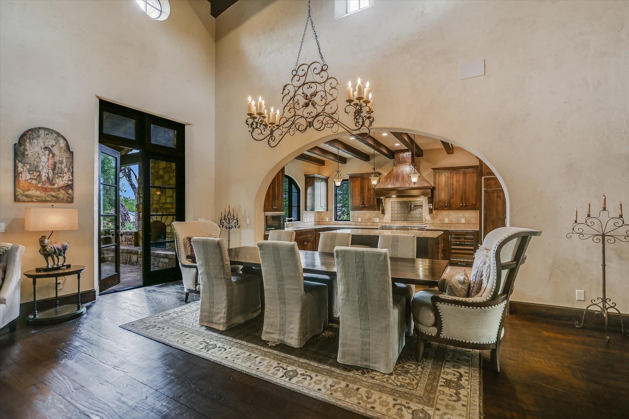 A front courtyard fireplace sets the tone, where the glow of the fire and the stillness of the Hill Country create a natural place to gather. From this warm and welcoming entry, 100 Milagro unfolds into a thoughtfully crafted 3,352 sq. ft. residence within the private gates of Escondido Golf & Lake Club, offering a refined yet relaxed approach to luxury living. Arched passageways, rich wood beams, and hand-selected finishes define the interiors, where the main living and dining spaces open beneath soaring ceilings and center around a stone fireplace. The chefs kitchen is both functional and inviting, featuring custom cabinetry and a generous island, with an adjoining bonus space anchored by its own fireplace, offering flexibility for a second living area, media room, or breakfast nook. The home offers four bedrooms and four full baths, including a spacious primary suite with a sitting area, spa-like bath, and expansive walk-in closet. An upstairs guest suite provides a private, tucked-away retreatideal for hosting family and friendswhile a fourth bedroom or study with patio access is well-suited for guests or a quiet workspace. Outdoor living continues on the covered back patio with fireplace, creating a comfortable extension of the home for year-round enjoyment and relaxed gatherings. Overlooking an expansive backyard shaded by mature trees, the setting offers both privacy and space to unwind, with the potential to add a pool and create a true resort-style retreat.