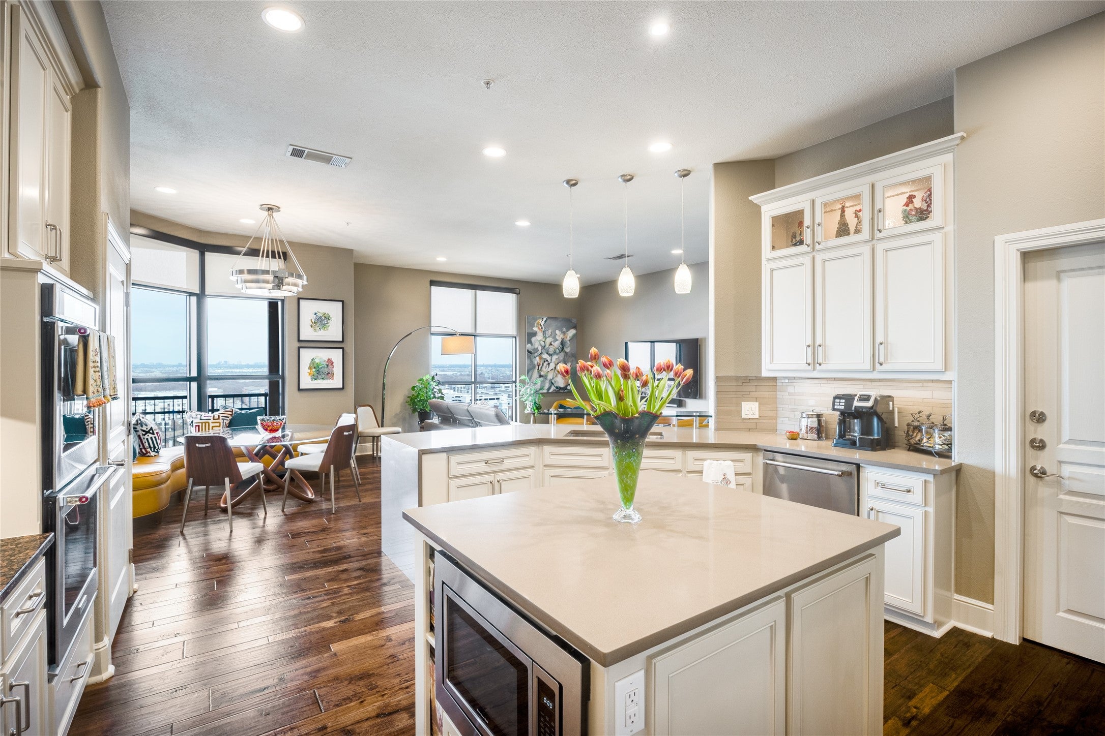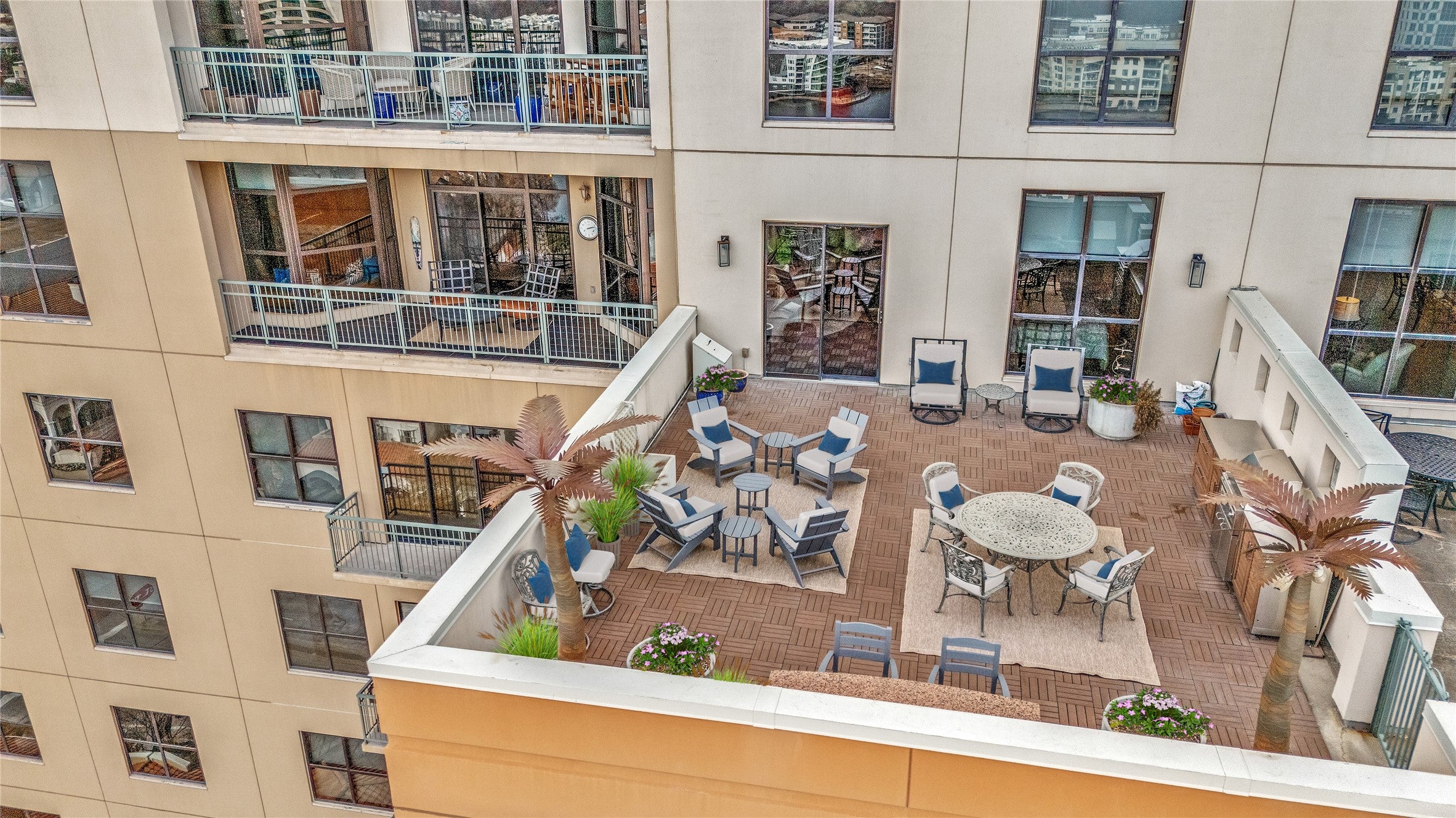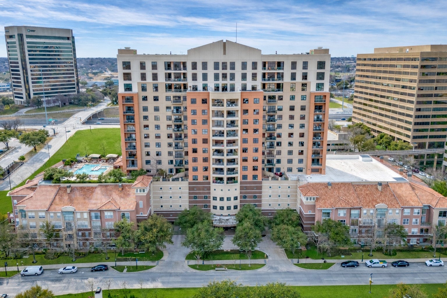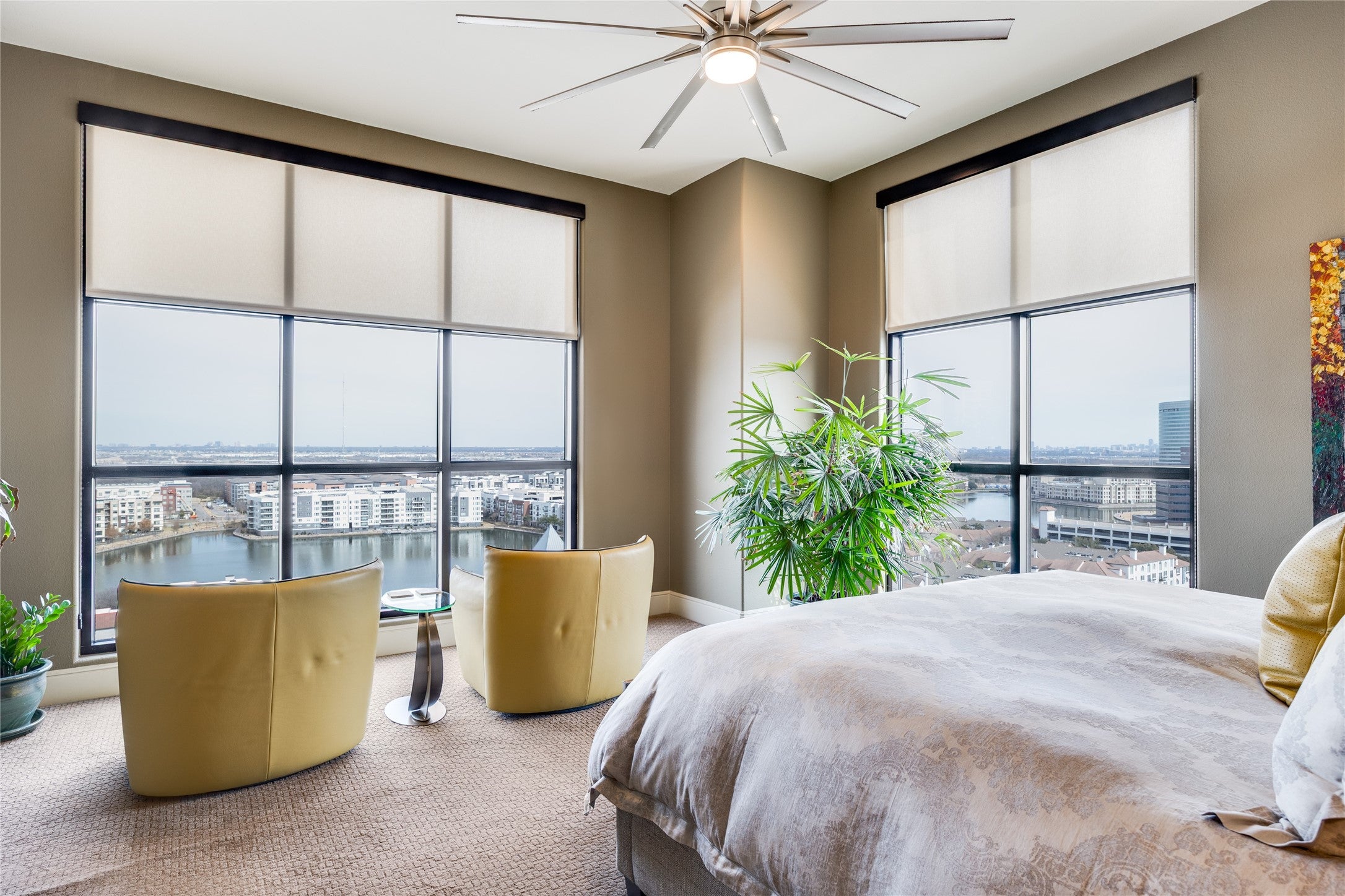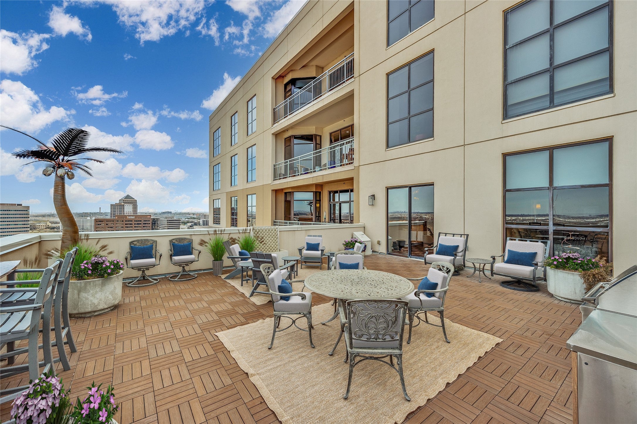 Experience elevated living in this exceptional 15th-floor penthouse at Grand Treviso, ideally positioned above the waterways of Las Colinas. With no shared walls, this rare residence offers remarkable privacy and tranquility rarely found in high-rise living. Designed for both refined entertaining and everyday comfort, the expansive interior features custom wood front doors, hardwood and designer flooring, custom lighting, a gourmet kitchen, dry bar, and a grand living and dining space framed by walls of windows capturing sweeping east-facing views. Each bedroom includes a private study or sitting area, offering flexible space for work or relaxation. Outdoor living is equally impressive, with over 700 square feet of private terraces, including a separate terrace off the main living area complete with a grilling station and water feature, perfect for enjoying sunrises, entertaining guests, or unwinding above the city. This thoughtfully designed home includes two bedrooms, two and a half beautifully remodeled baths, a chefs kitchen with KitchenAid appliances, induction cooktop, double ovens, and breakfast bar, along with expansive walls ideal for showcasing art. Professionally designed by Mary Ann Smiley Interiors and Heidi Arwine Interiors, every detail reflects elevated style and sophistication. Additional highlights include two premium parking spaces near the entrance and a private storage suite on the third floor. Residents of Grand Treviso enjoy concierge-level amenities including a grand lobby, 24-hour concierge, fitness center, business and conference facilities, clubroom, and a rooftop pool and spa overlooking Lake Carolyn. Located just steps from the Las Colinas canals, dining, and entertainment, with convenient access to DFW Airport, Love Field, and major destinations. This is a rare opportunity to own a private penthouse retreat offering luxury, privacy, and panoramic views in one of Las Colinas most iconic addresses.