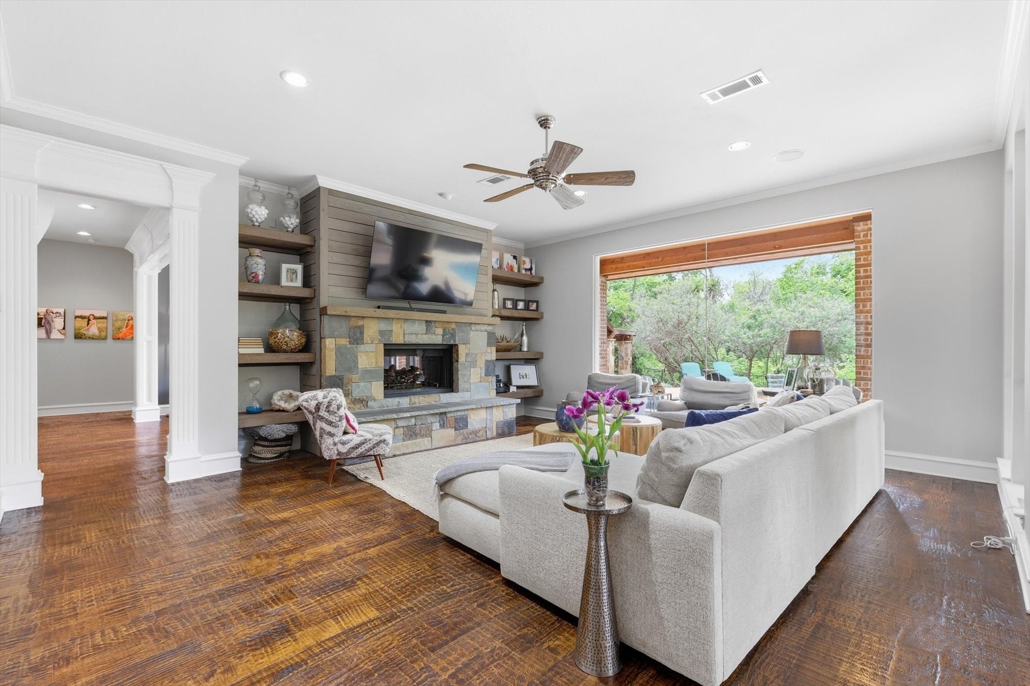 A front courtyard fireplace sets the tone, where the glow of the fire and the stillness of the Hill Country create a natural place to gather. From this warm and welcoming entry, 100 Milagro unfolds into a thoughtfully crafted 3,352 sq. ft. residence within the private gates of Escondido Golf & Lake Club, offering a refined yet relaxed approach to luxury living.