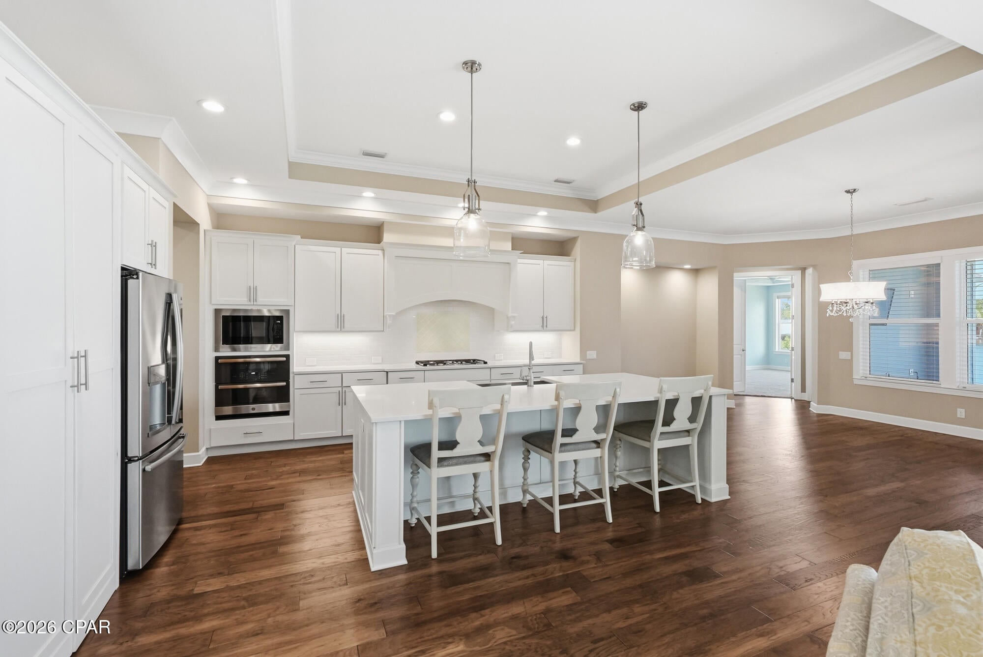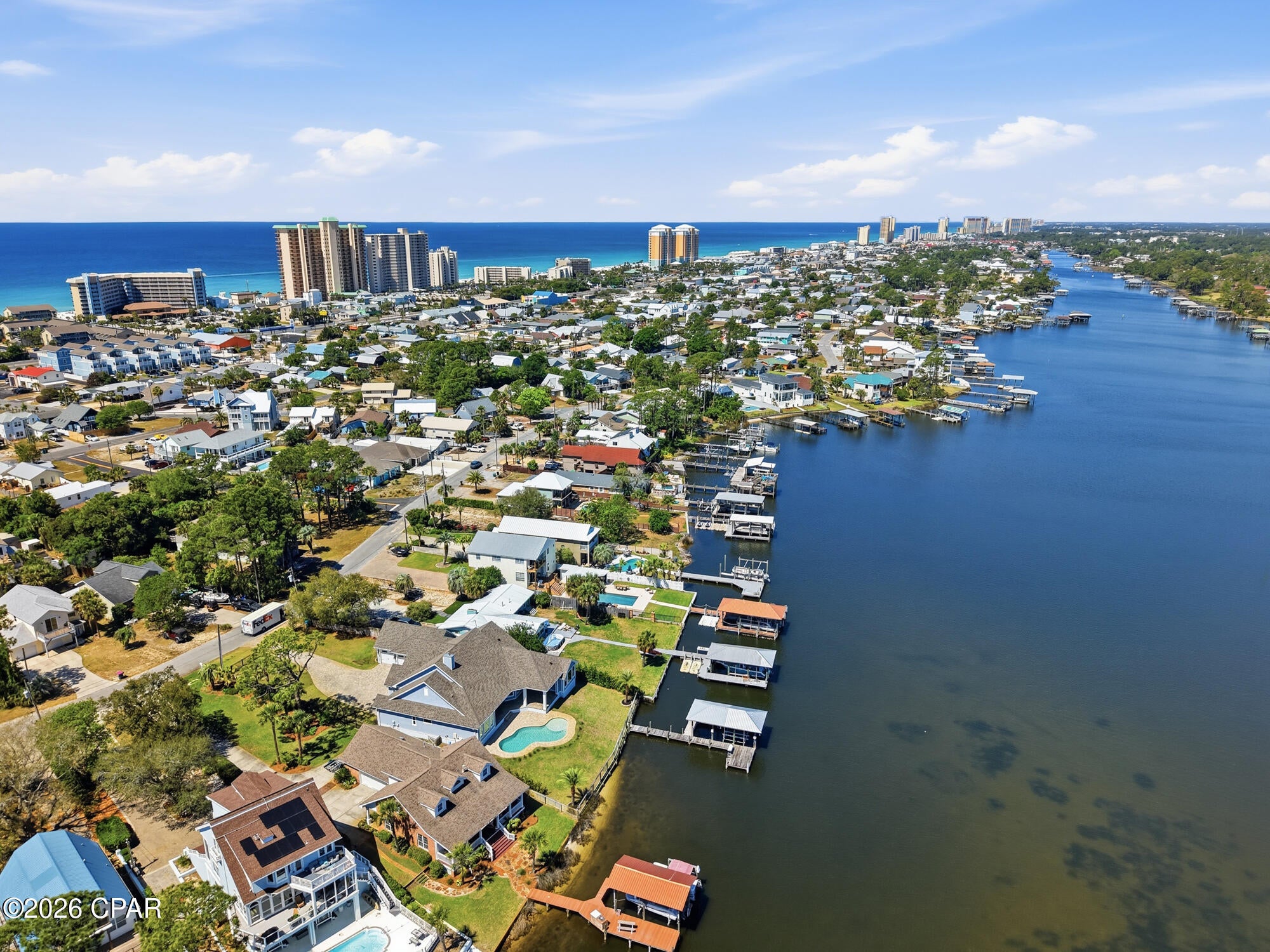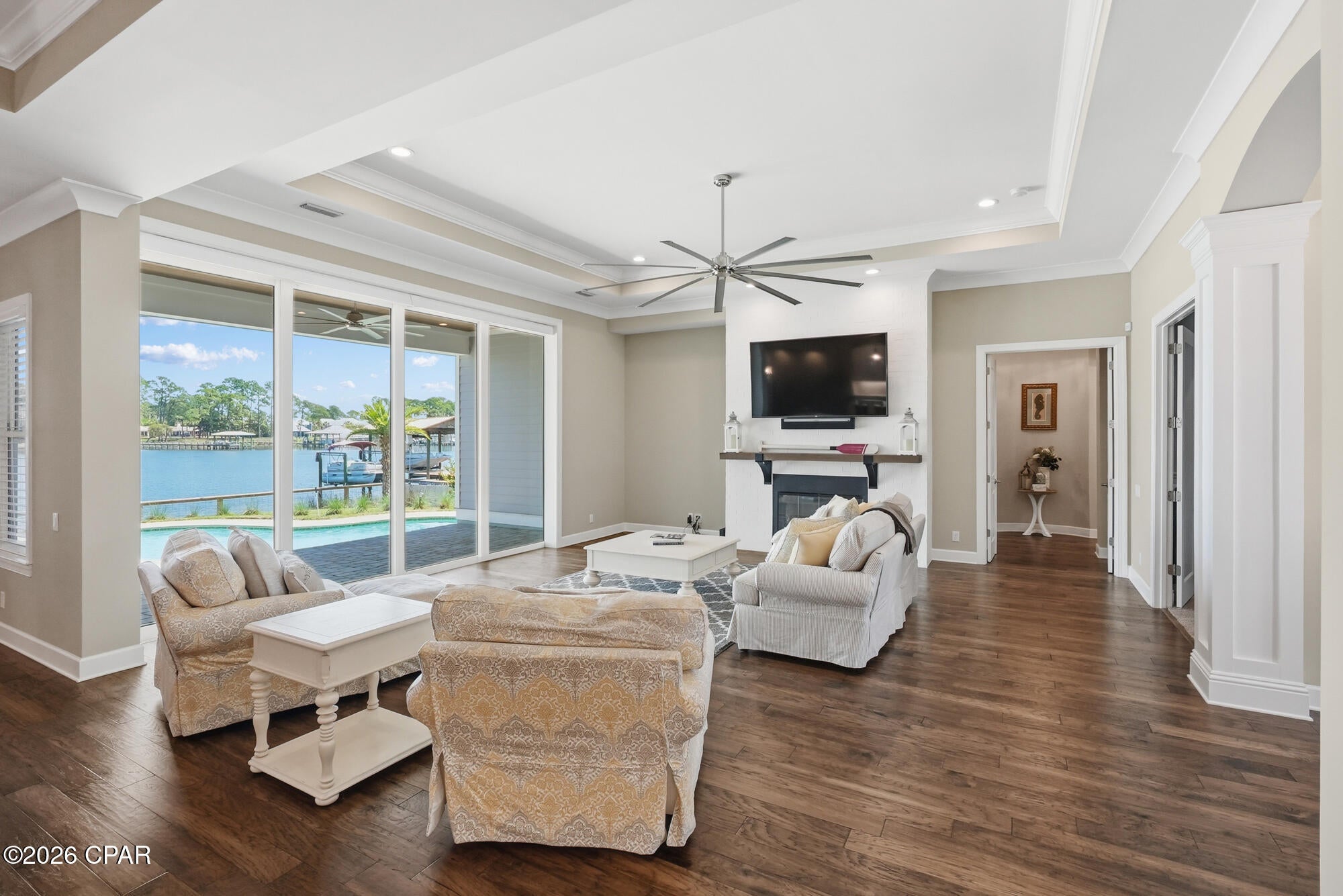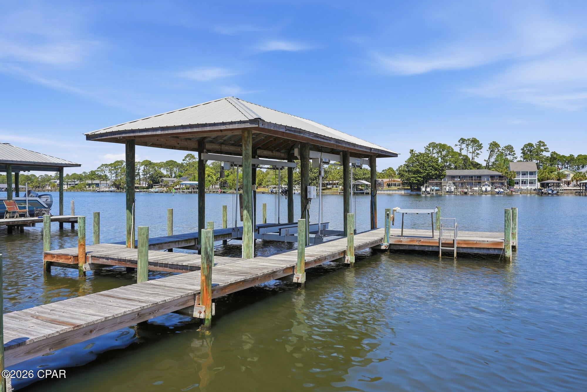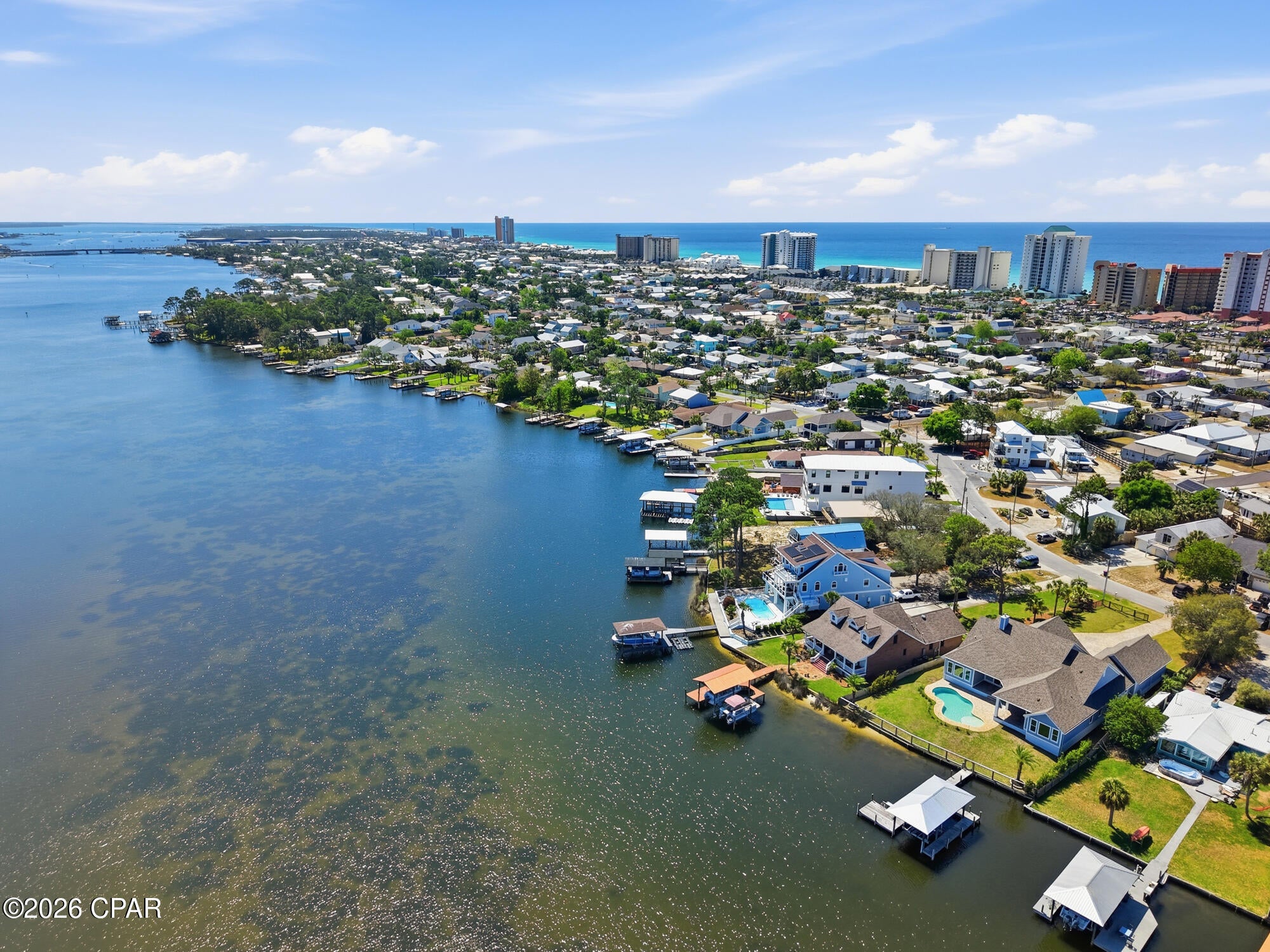 CURRENTLY UNDER CONTRACT, SELLER WILL CONSIDER BACKUP OFFERSWelcome to 6728 South Lagoon Drive, a stunning waterfront retreat perfectly positioned on South Lagoon in Panama City Beach. Built in 2020 by Arthur Rutenberg, this exceptional one-story residence offers 3,404 square feet of heated and cooled living space and 4,938 square feet under roof including the outdoor living areas. An upgraded version of the sought-after May River floor plan, this home sits on a rare double lot and showcases quality craftsmanship, thoughtful design, and luxurious coastal living at its finest.This boaters paradise offers unobstructed water views and seamless indoor-outdoor living designed to capture the beauty of the lagoon. The spacious 4-bedroom, 3-bathroom home features an open-concept layout with breathtaking views from the kitchen, dining, and living areas. The expansive living room is highlighted by vaulted ceilings, a cozy gas fireplace, and floor-to-ceiling glass sliders that open completely to a covered outdoor living space--perfect for entertaining or relaxing while overlooking the water. The dining area is filled with natural light from elegant bay windows, and the kitchen is thoughtfully equipped with a gas stove, a double oven, two refrigerators, and a generous walk-in pantry. Beautiful hardwood floors run throughout the main living spaces, while quartz countertops are featured throughout the home, with granite in the laundry room for added durability.The primary suite is a true private retreat, featuring a split floor plan with double doors that allow you to close off the bedroom, closets, and bathroom from the rest of the home for maximum privacy. The suite also includes his and hers walk-in closets, offering ample storage and organization. The spa-like primary bathroom includes a standalone soaking tub, a marble, zero-threshold (curbless) oversized dual shower head shower, and a his-and-hers vanity--complete with a dedicated sit-down makeup area on the hers side for added luxury and convenience. The suite is also framed for a private exterior door, offering even more flexibility.A versatile multi-use office with beautiful beamed ceilings adds character and flexibility for work or additional living space.Step outside to your private oasis featuring a 6-foot inground saltwater pool complete with bubblers and a sun shelf. The fully fenced yard includes a sprinkler system powered by a separate well, a gated and paved driveway, and a 3-car garage with an elevated lift for easily accessible extra storage. The home is also equipped with gutters, spray foam insulation for energy efficiency, a tankless hot water heater, and a built-in monitored security system with hardwired outdoor cameras for added peace of mind. An in-wall pest control system further enhances convenience.For boating enthusiasts, this property truly stands out with a covered boat lift, deep water dock, and seawall--allowing you to take your boat out anytime of day regardless of the tides. Enjoy a quick 15-minute boat ride to the open Gulf or take a short 5-minute drive to the areas famous white sandy beaches. Pier Park is just 20 minutes away, offering shopping, dining, and entertainment. Located in a golf cart-friendly community, this home offers both convenience and a relaxed coastal lifestyle.With gas and electric already available for an outdoor kitchen, this home is ready to create the ultimate waterfront experience.Dont miss your chance to own this exceptional coastal property where luxury, comfort, and breathtaking views come together.