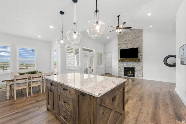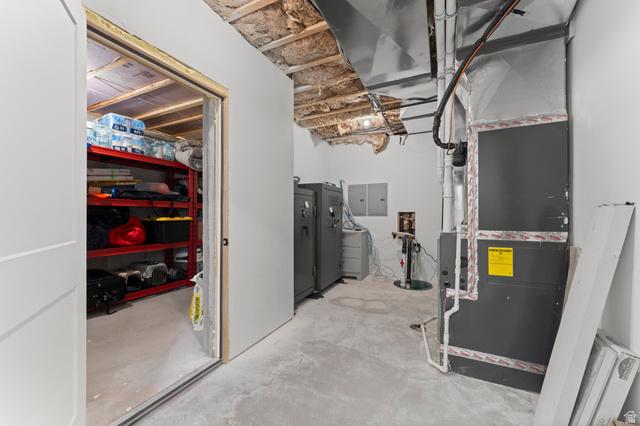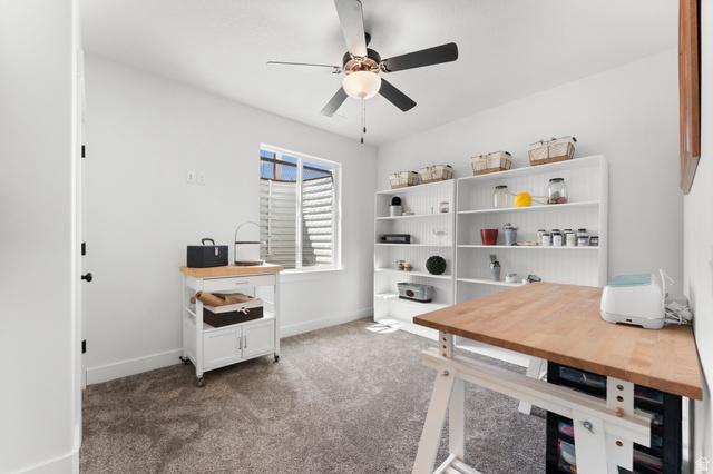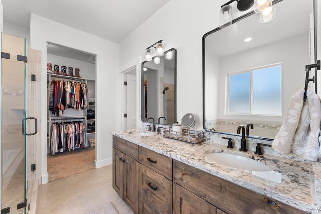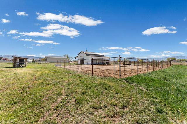 Incredible custom-built Erda rambler on a full acre, where luxury, functionality, and wide-open space come together in a way thats hard to find! From the moment you arrive, youll feel the peace and quiet of this setting and instantly fall in love with the inviting front porch, perfectly positioned to capture breathtaking mountain views and ideal for slow mornings and relaxing evenings. Step through the impressive 8-foot doors and youre welcomed by a refined front office with soaring ceilings, plantation shutters, and stunning natural light. The heart of the home opens up into a beautifully designed great room featuring floor-to-ceiling rock work, a statement gas fireplace, and expansive windows that flood the space with light while seamlessly connecting to the covered patio through elegant French doors. The kitchen is a true showpiece and chefs dream, outfitted with custom lighting, double ovens, a KitchenAid gas cooktop with pot filler, oversized island with bar seating, farmhouse sink, modern backsplash, double pantry, and floor-to-ceiling soft-close cabinetry complete with built-ins like a spice rack and pull-out trash. The semi-formal dining space offers the perfect setting for everyday living and entertaining alike. The primary suite is a private retreat with vaulted ceilings, plantation shutters, and incredible mountain views, while the spa-like en-suite features a large walk-in closet, European glass shower with dual heads, elegant tile work, double sinks, custom cabinetry, and a relaxing soaker tub. The main level also includes a spacious secondary bedroom, beautifully upgraded full bath, a large laundry room with folding station and storage cabinets, and a thoughtfully designed mudroom with built-in backpack racks. Downstairs, the fully finished basement offers 9-foot ceilings, an expansive rec space perfect for gatherings or play, three additional bedrooms with generous closets, a high-end full bathroom, massive cold storage, and upgraded carpet and pad throughout. Additional interior features include a water softener, tankless water heater, sump pump, and French drains in window wells. The oversized three-car garage is fully finished with epoxy floors, a sink, and access to an incredible 1,000 sq ft loft space above, offering endless potential for a future office, bedroom, or flex space. Step outside and the property truly shines with a fully landscaped yard, iron fencing set in concrete, and a fully functional setup ready for animals with corrals, reinforced covered shelters for your horses (horse property), and a turnkey chicken coop. The impressive 24x40 shop (approximately 48x40 with overhangs) features a 16-foot door, covered sides for equipment or hay storage, loft potential, RV hookups, and nearby water access. The property is equipped with a septic system, drip irrigation throughout rock areas, exterior lighting with customizable colors, and board and batten siding wrapping the home. This is a rare opportunity to own a ful