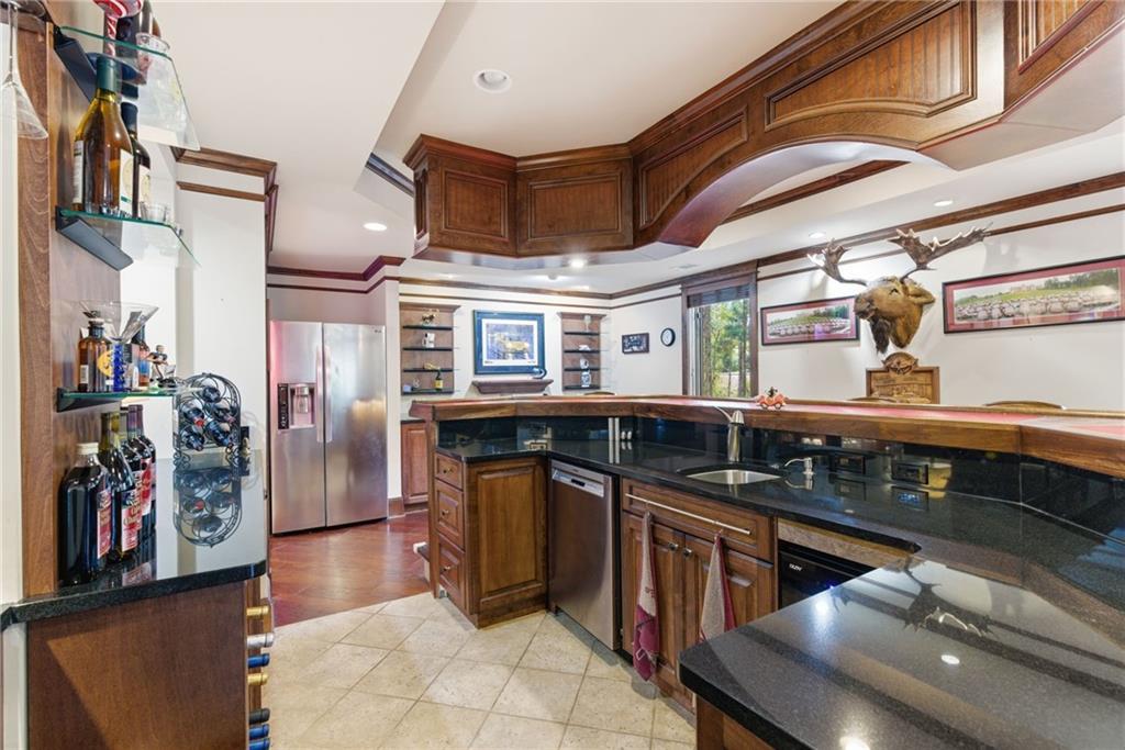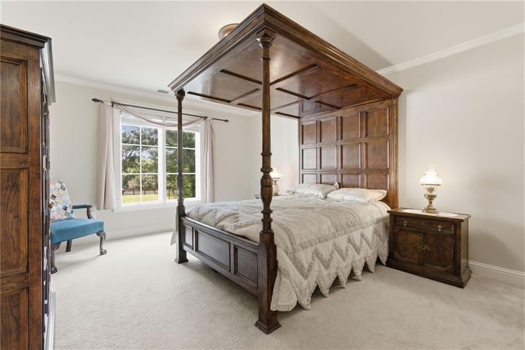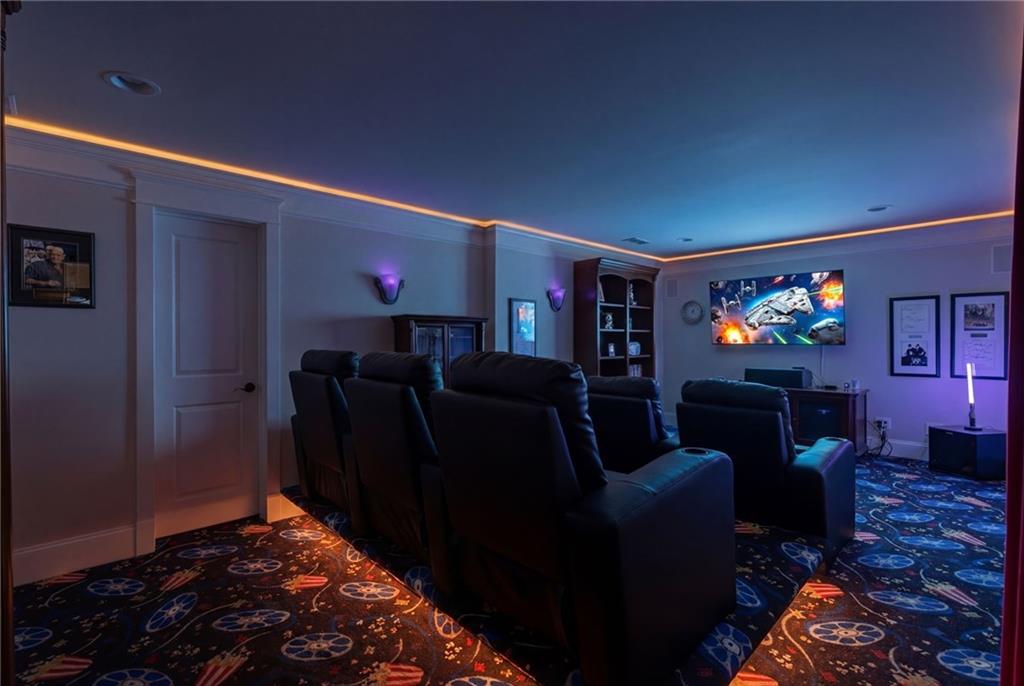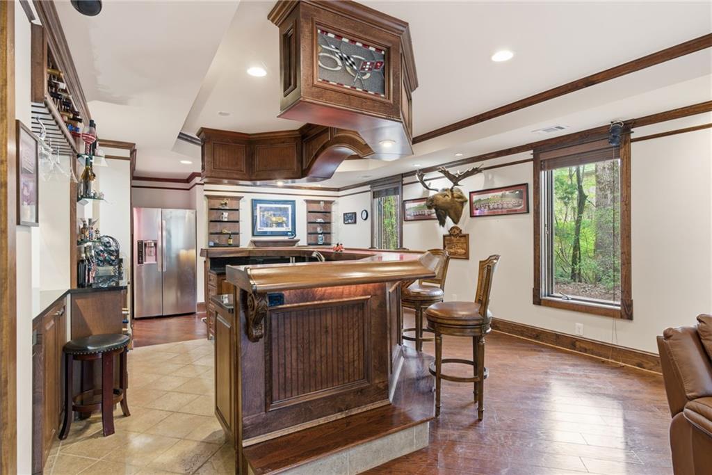 You feel it the moment you walk in—warm, inviting, and effortlessly elegant—this private 2-acre estate in gated Blackberry Ridge redefines what luxury living should feel like. Warmth and timeless design define this exceptional 4-sided brick estate on 2 private acres in gated Blackberry Ridge. Located in Cherokee County (lower taxes) and zoned for Creekview High School, this home offers luxury, privacy, and convenience just minutes from Milton, Crabapple, and Downtown Alpharetta. Inside, you'll find substantial custom millwork throughout—rich, architectural trim that sets this home apart—paired with mahogany hardwood floors, soaring ceilings, and 5 interior fireplaces. The main level features an oversized primary suite with sitting room, stacked stone fireplace, and custom built-ins, plus an additional bedroom and full bath—ideal for multigenerational living or a home office. The gourmet kitchen with granite countertops, gas range, walk-in pantry, and butler's pantry opens to the fireside keeping room—the true heartbeat of the home. Upstairs offers multiple ensuite bedrooms and flexible living space. The terrace level is a true extension of the home—finished to the same high standard as the main level and designed for entertaining. Highlights include a one-of-a-kind hand-built custom bar, an elevated theater room with ambient lighting entry, game areas, and multiple exterior access points. With abundant windows and doors, the space feels bright, open, and connected—not like a basement. Additional features include: 3 laundry rooms (one on each level),Oversized 3-car side-entry garage, level, private backyard—ideal for a future pool, Expansive 2-acre setting with exceptional privacy. A rare opportunity to own a private, move-in ready luxury estate in one of the area's most desirable gated communities.