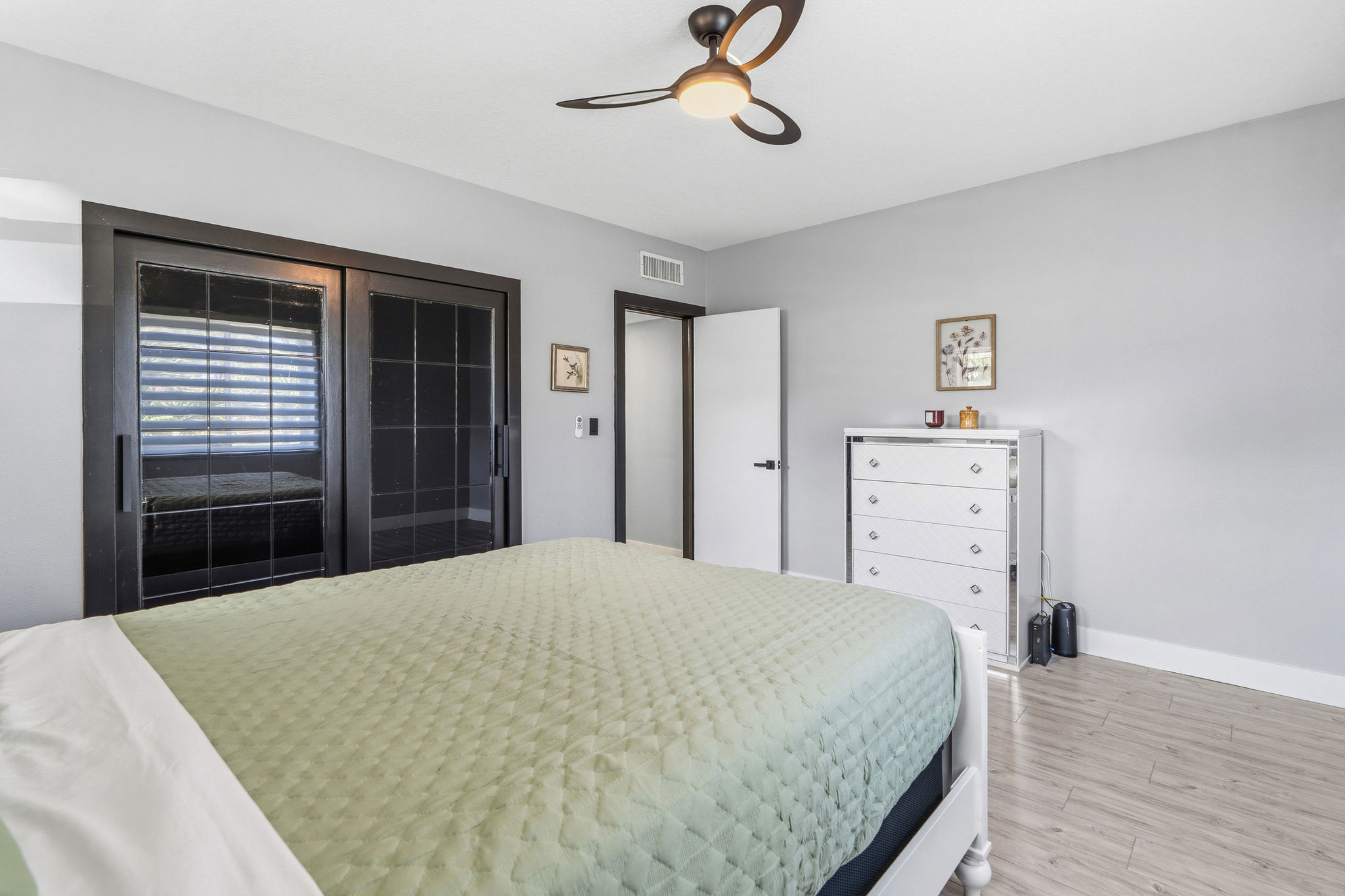 Prime Location in Windstone Ranch – A True Gem! Fully remodeled and move-in ready, this exceptional home offers 4 bedrooms, each with its own walk-in closet and 3 full bathrooms featuring new vanities and toilets. The formal living room, enhanced with updated lighting, and the separate dining room with elegant chandeliers create the perfect setting for entertaining. The gourmet kitchen features quartz countertops, refinished cabinetry, a center island, a wine cooler, stainless steel appliances, and recessed lighting, and seamlessly opens into a spacious family room with a cozy fireplace. Upstairs, a convenient laundry room, walk-in linen closet, and built-in study area provide both comfort and functionality for modern living. The luxurious primary suite, connected to the fifth bedroom/retreat, features a beautifully remodeled bathroom with a soaking tub, separate shower, upgraded dual vanities, and a spacious walk-in closet. Recent upgrades include fresh interior and exterior paint, new vinyl flooring throughout, energy-efficient LED lighting, and new front-facing windows that enhance both curb appeal and efficiency. The home also includes leased solar panels for added energy savings. Step outside to an entertainer's backyard featuring a newly installed vinyl-covered patio with ceiling fans and recessed lighting, a firepit, and a kid-friendly play area. Additional highlights include a 3-car tandem garage. Enjoy walking access to the Tot Lot and scenic equestrian trails. Located in a quiet neighborhood with convenient access to schools, parks, shopping, dining, and the I-15 and 215 freeways, this home offers an exceptional blend of style, comfort, and location. This is a must-see home, schedule your showing today.