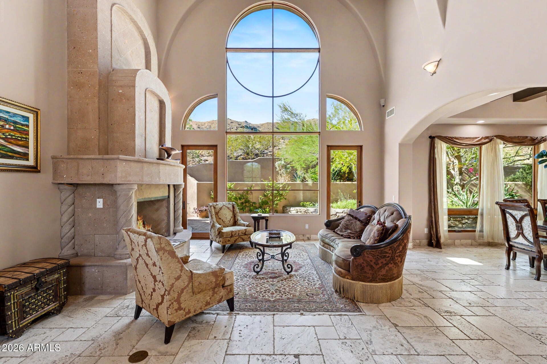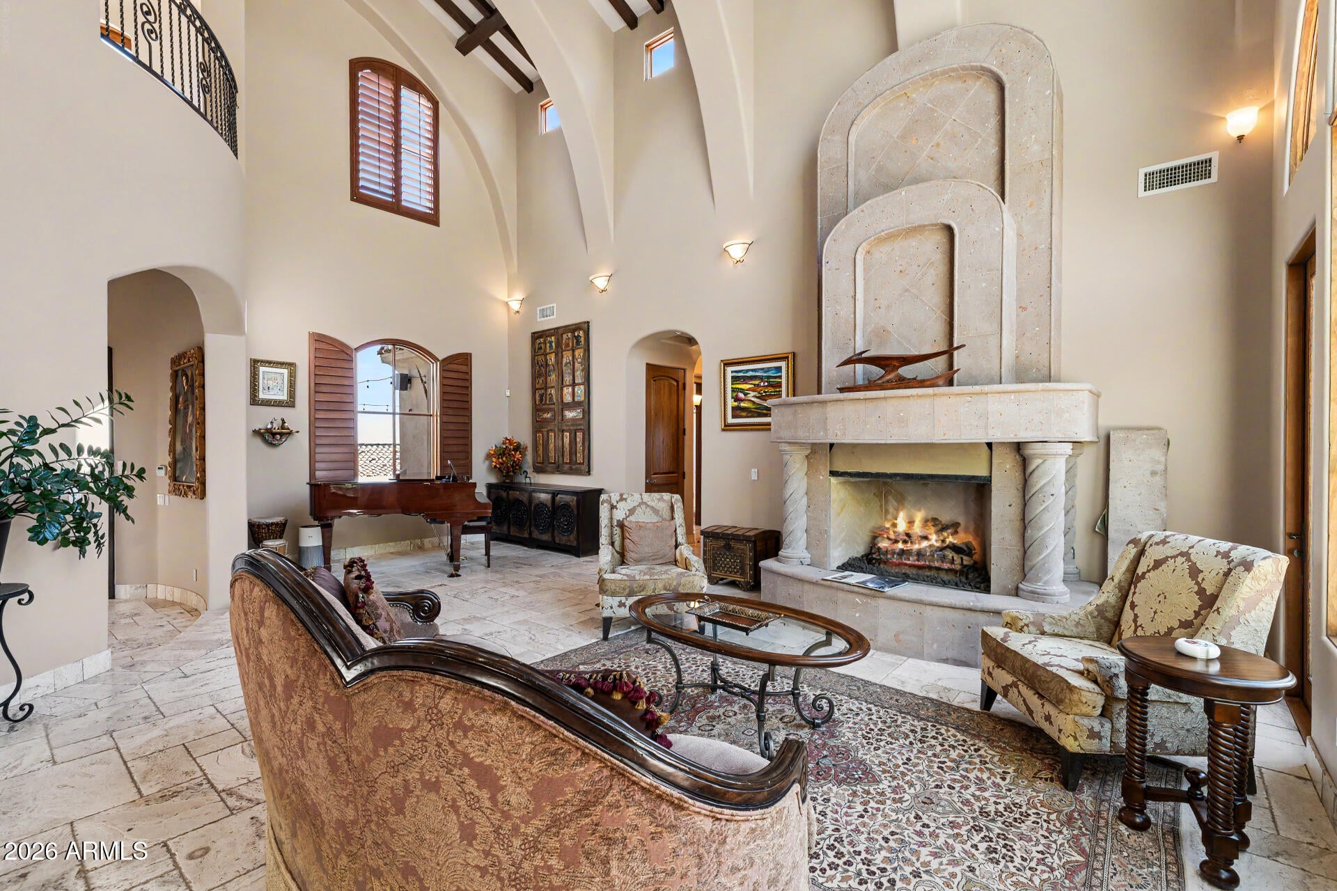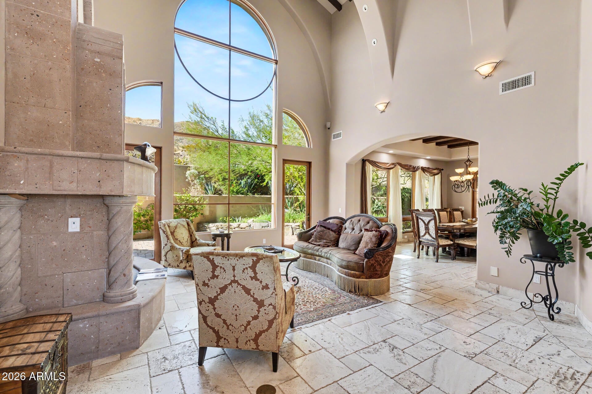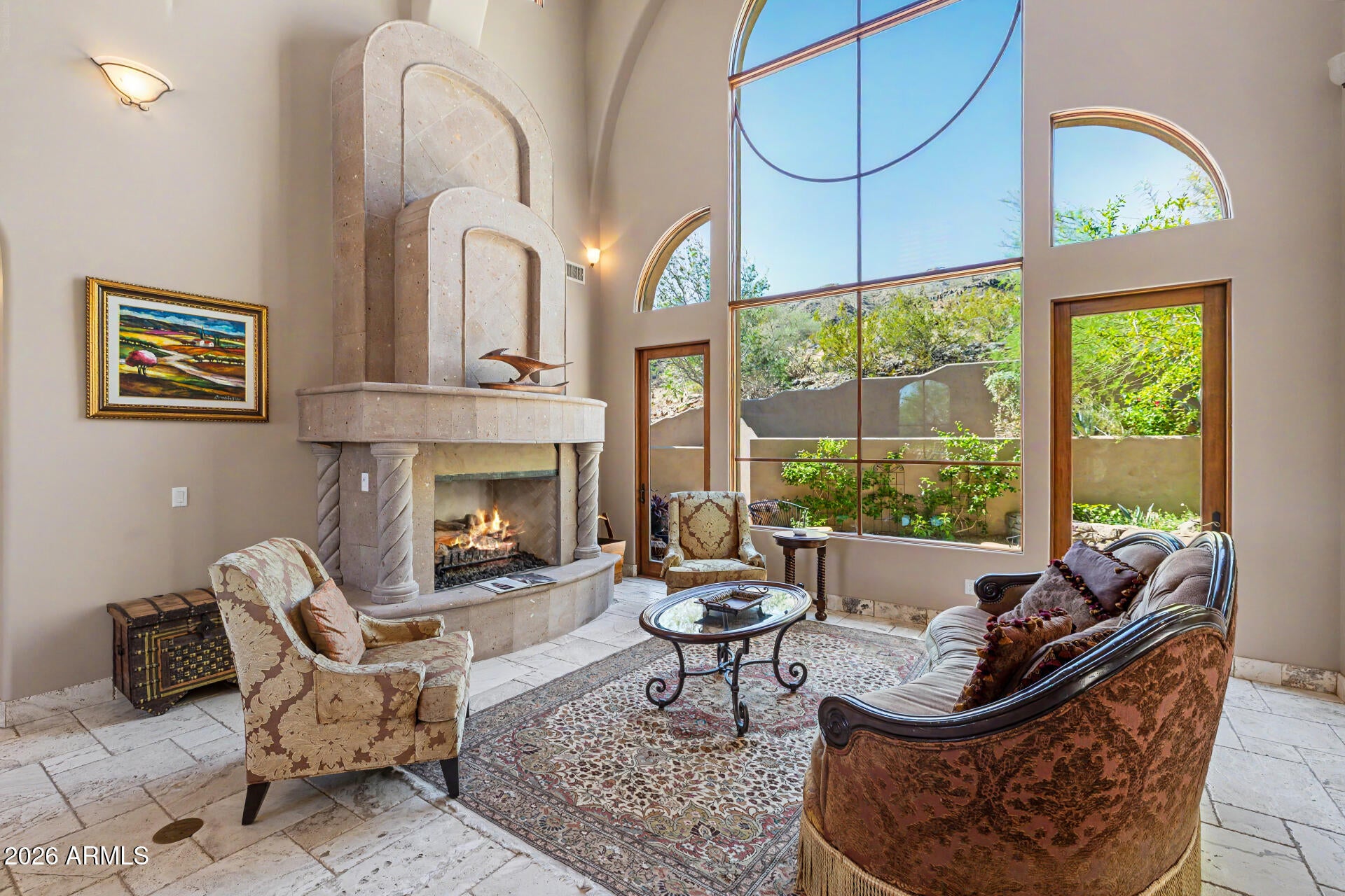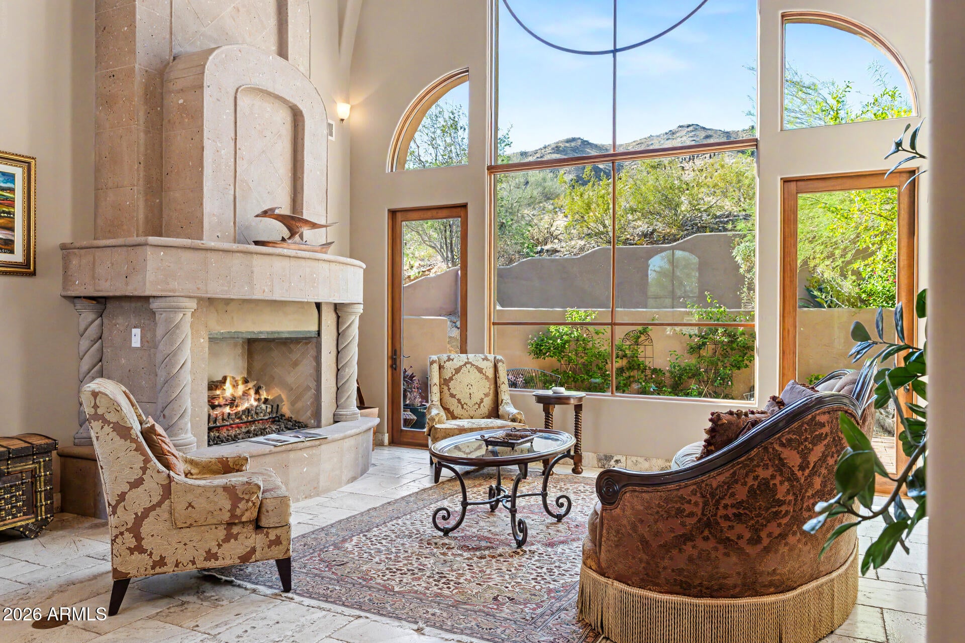 This is the one! Experience the luxury, peace, and breathtaking mountain views of this stunning residence. From the gorgeous facade, rare 6-car garage with a huge paver driveway, to the beautifully manicured landscape, everything about this home is sure to impress. The generous living spaces are filled with natural light, boasting elegant touches throughout-soaring ceilings, dramatic arches, a fireplace to add warmth, floor-to-ceiling windows, exposed beams that add character, and a soothing palette, making every space ideal for entertaining and comfortable everyday living. The kitchen is a chefs dream, complete with abundant cabinetry adorned with crown molding, tile backsplash, granite countertops, a large walk-in pantry, high-end appliances, and an island, perfect for meal prep and mid midnight snacks. The main bedroom is a true retreat, including a fireplace to ensure cozy winter nights, large windows that offer beautiful views, a spa-like bathroom with a separate shower & tub, and a walk-in closet for all your belongings. The den and loft add flexibility, providing space and privacy to work from home, study, or engage in your hobbies in peace. Another great feature of this home is the huge guest quarters, with spacious living areas complete with a fireplace, a separate exit, and a kitchenette. The backyard oasis is a dream, offering a serene landscape that pairs beautifully with the mountain views you can enjoy from the view deck and covered patio with a fireplace. Host gatherings and relax in the ample seating space with pavers, and lets not forget the sparkling pool and spa! This gem truly has it all! Just WOW!
