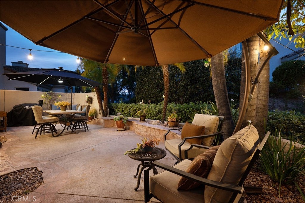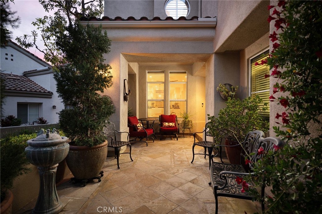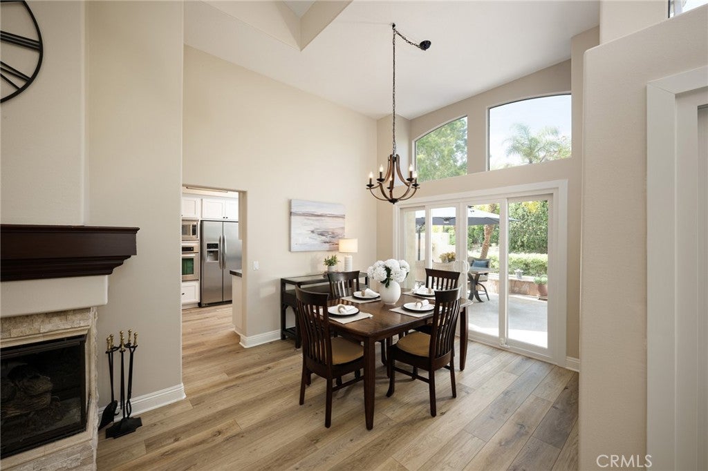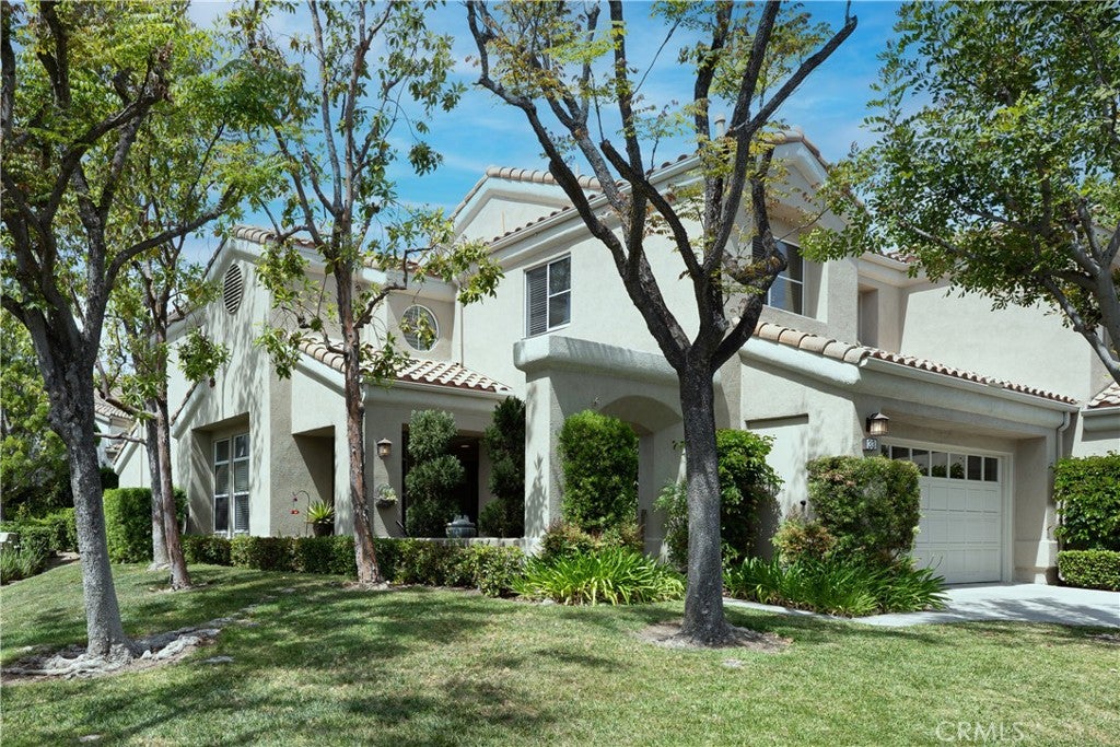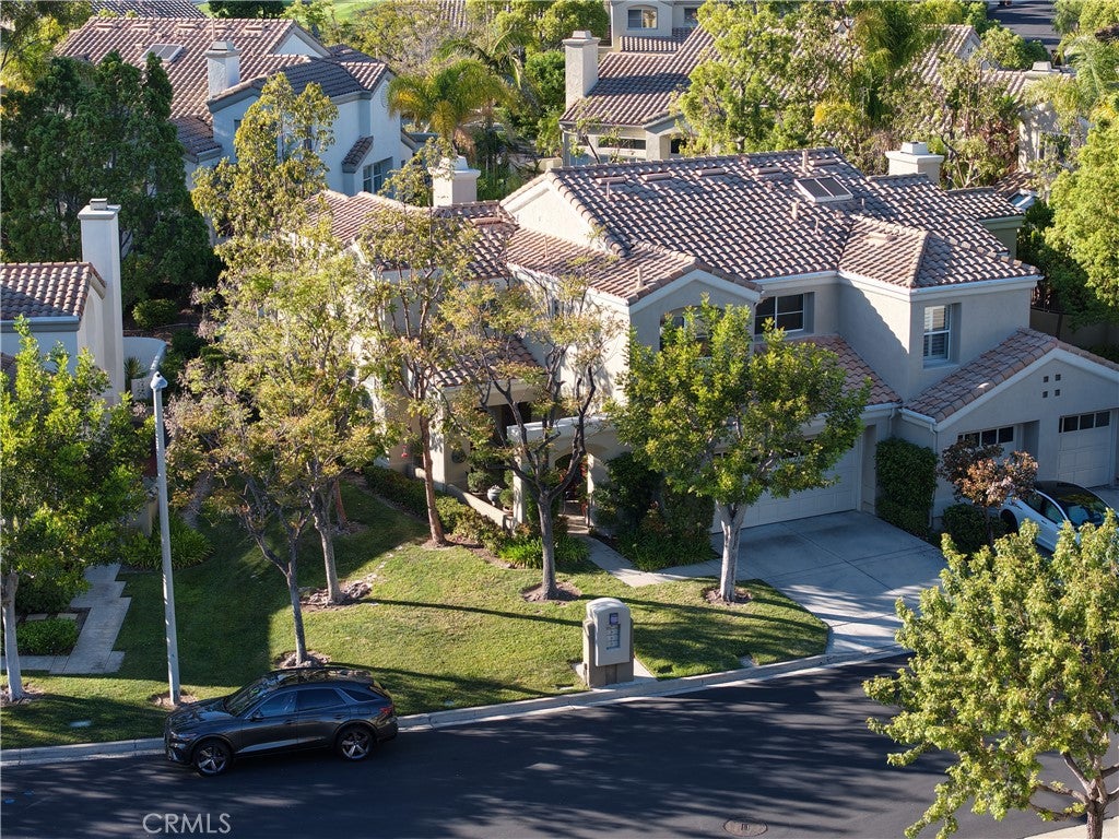 Located in the desirable Alicante Tract!! A Tijeras Creek Golf Course neighborhood! This stunning, beautifully upgraded home offers a warm and inviting layout with a dramatic front entry and open living spaces enhanced by vaulted ceilings and beautiful vinyl flooring. The kitchen, truly the heart of the home, features granite countertops, custom-painted cabinetry, stainless steel appliances, under-cabinet lighting, a stovetop, and solarium windows, and flows seamlessly into the light-filled family room with abundant natural light. The living and dining room showcase a vaulted ceiling, plantation shutters, a skylight, and a striking fireplace with custom tile and mantle. The spacious primary bedroom includes custom paint, a vaulted ceiling, and a large walk-in closet. The primary bathroom is elegantly upgraded with a Restoration Hardware vanity, Crema Marfil marble, custom tile, and a shower with a tumbled marble enclosure, tile inlay, and seamless glass door. Upstairs also features two additional bedrooms and an upgraded guest bathroom. The main level offers a beautifully upgraded guest bathroom along with a dedicated laundry room. Step outside to a private backyard retreat with hardscape and lush tropical landscaping, perfect for relaxing or entertaining. Additional features include a two car attached garage with a driveway. Residents enjoy the Alicante Association pool and spa along with Rancho Santa Margaritas amenities, including parks, pools, the lake, tennis courts, community events and more!!.