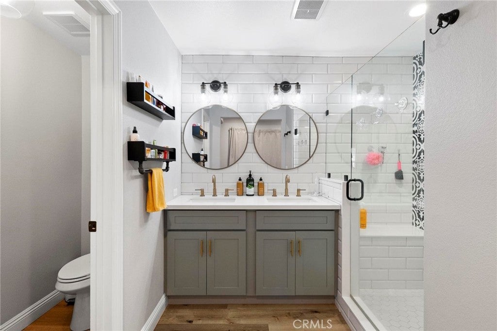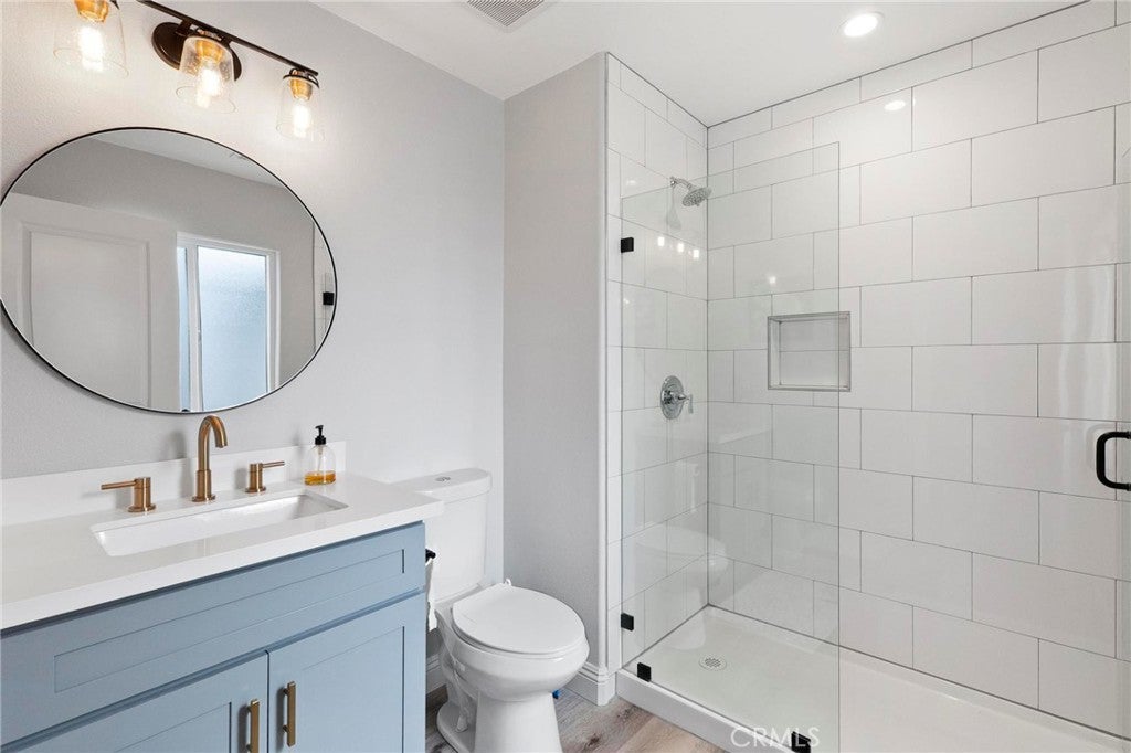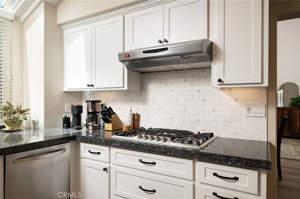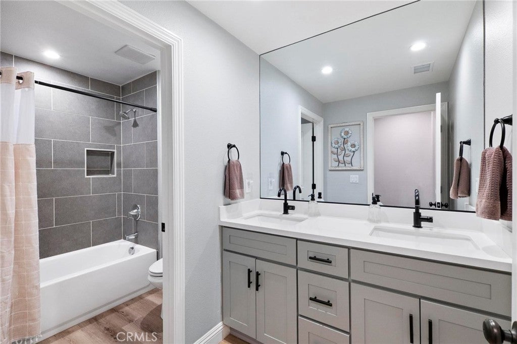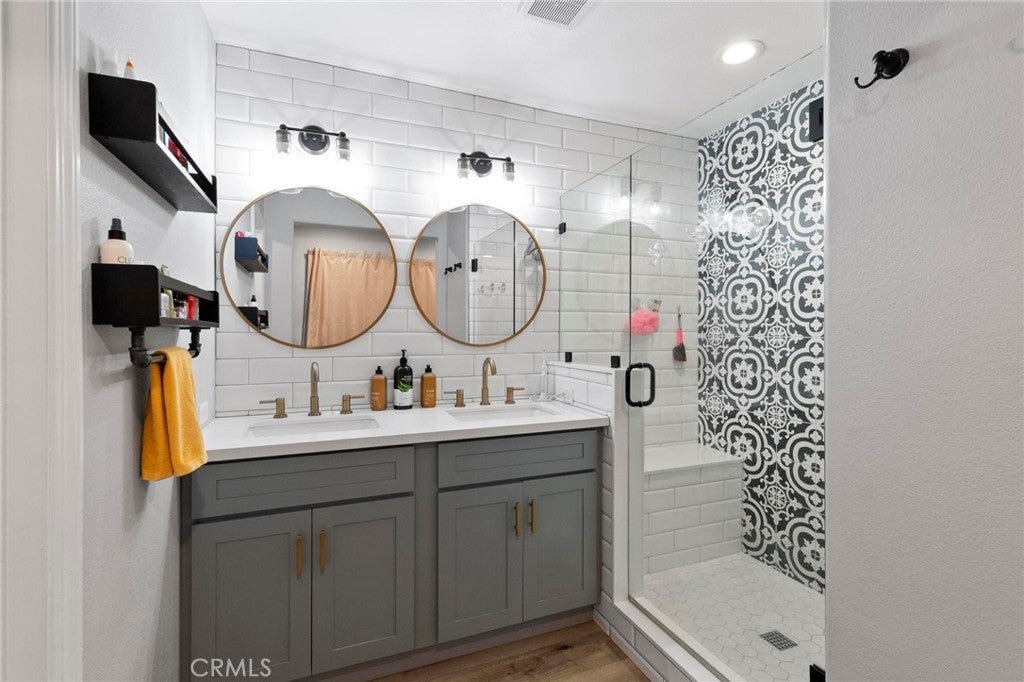 Located in the desirable Alicante Tract!! A Tijeras Creek Golf Course neighborhood! This stunning, beautifully upgraded home offers a warm and inviting layout with a dramatic front entry and open living spaces enhanced by vaulted ceilings and beautiful vinyl flooring. The kitchen, truly the heart of the home, features granite countertops, custom-painted cabinetry, stainless steel appliances, under-cabinet lighting, a stovetop, and solarium windows, and flows seamlessly into the light-filled family room with abundant natural light. The living and dining room showcase a vaulted ceiling, plantation shutters, a skylight, and a striking fireplace with custom tile and mantle. The spacious primary bedroom includes custom paint, a vaulted ceiling, and a large walk-in closet. The primary bathroom is elegantly upgraded with a Restoration Hardware vanity, Crema Marfil marble, custom tile, and a shower with a tumbled marble enclosure, tile inlay, and seamless glass door. Upstairs also features two additional bedrooms and an upgraded guest bathroom. The main level offers a beautifully upgraded guest bathroom along with a dedicated laundry room. Step outside to a private backyard retreat with hardscape and lush tropical landscaping, perfect for relaxing or entertaining. Additional features include a two car attached garage with a driveway. Residents enjoy the Alicante Association pool and spa along with Rancho Santa Margaritas amenities, including parks, pools, the lake, tennis courts, community events and more!!.