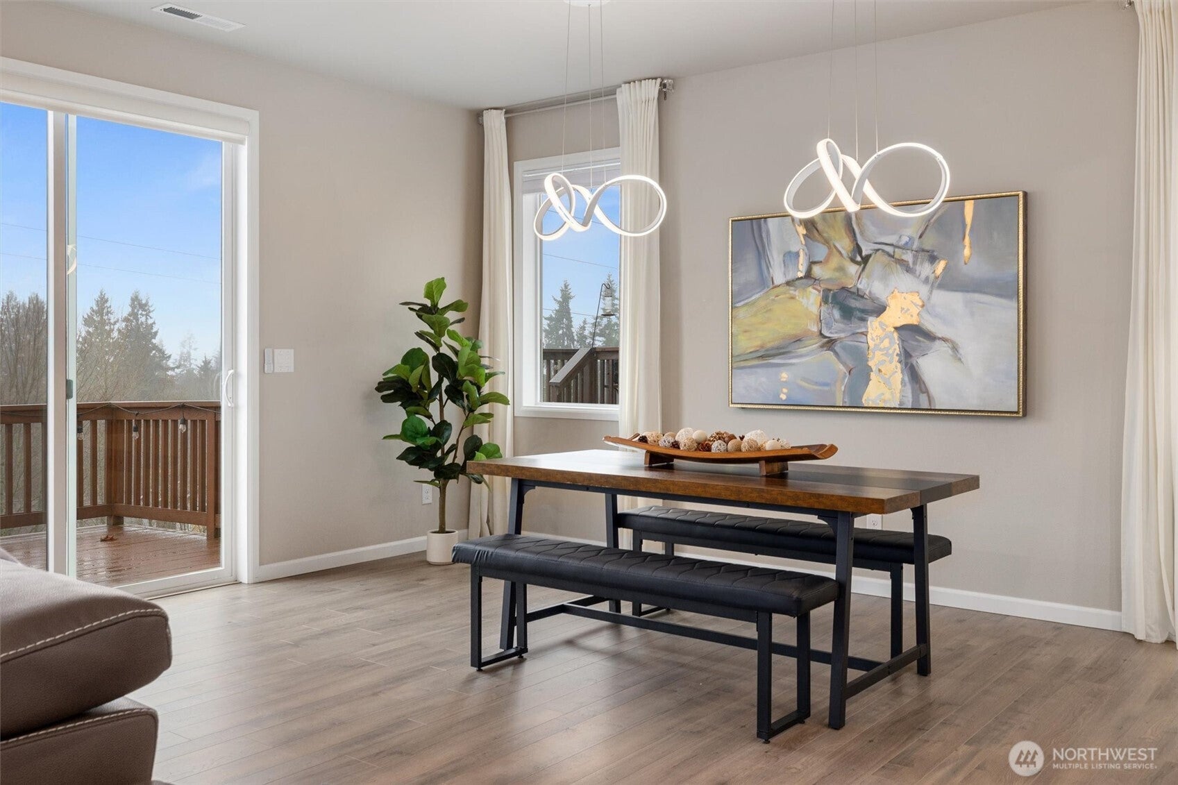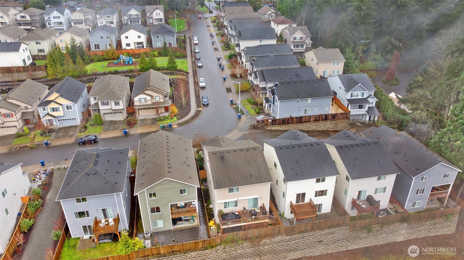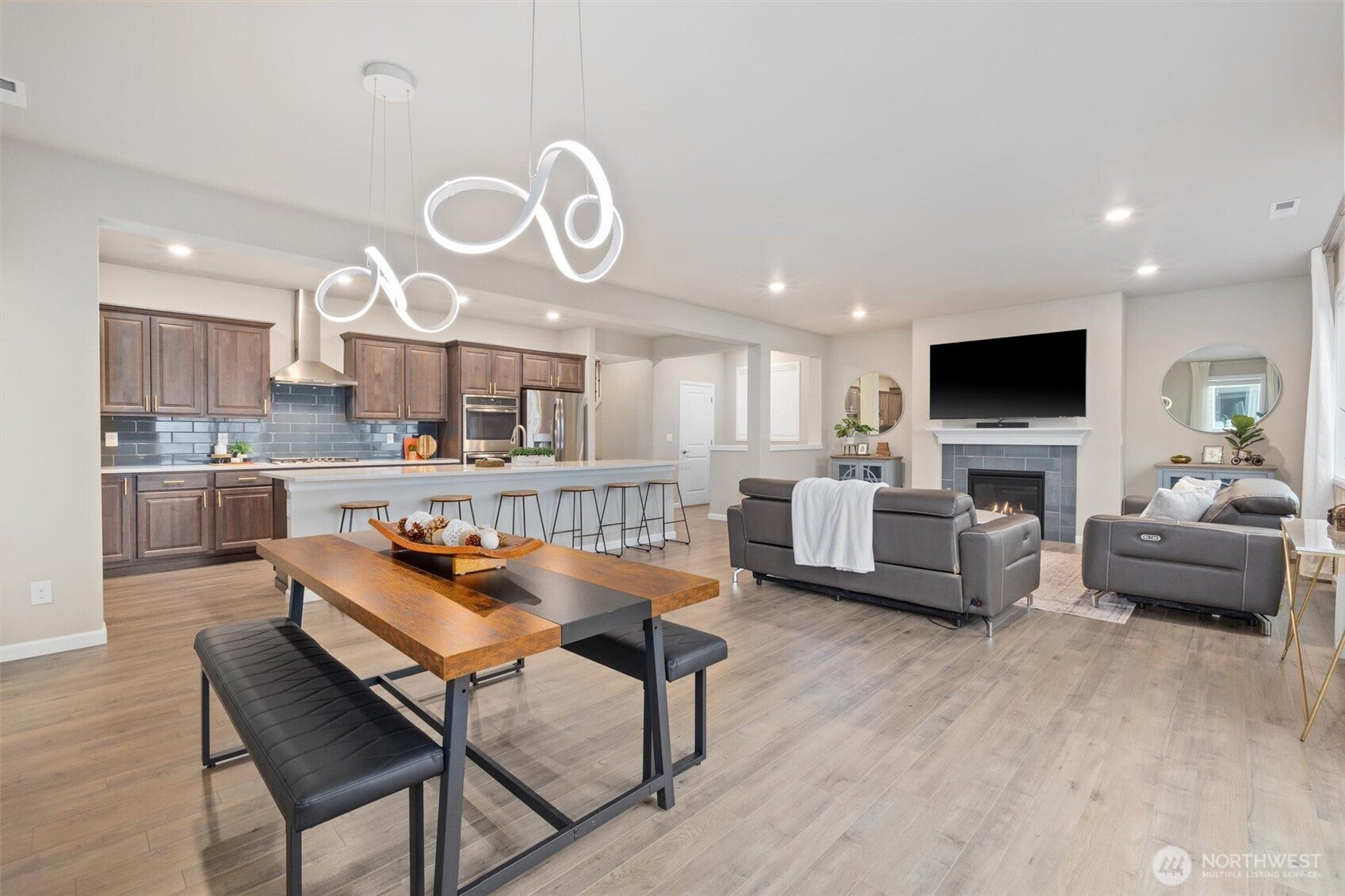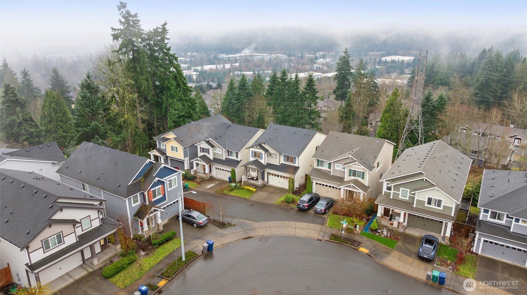 Covered front patio welcomes you to this spectacular 9-foot-ceiling SMART home. From the moment you step inside, the grand entryway & soaring ceilings set the tone, complemented by abundant natural light & stunning territorial & Olympic Mountain views. Just off the entry, the heart of the home awaits, impressive chefs kitchen designed for both everyday living & entertaining. Featuring a large eating island w/seating for 6, 5-burner gas cooktop, double ovens, soft-close cabinetry w/upgraded hardware & a pantry w/slide-out drawers. Laminate flooring flows seamlessly through the open-concept living & dining areas, anchored by a cozy gas fireplace. Tall slider & oversized windows capture the views & flood the space w/light, while canned LED lighting & smart-home features enhance comfort & efficiency. Main-floor 1/2 bth completes the main level. Upstairs, youll find 3 generously sized bedrms, including 2 that share a Jack & Jill bathroom. Spacious owners suite offers a peaceful retreat w/luxurious 5-piece ensuite. Upstairs laundry room & furnace closet add everyday convenience. Fully finished basement continues the 9-foot ceilings & provides exceptional flexibility w/a large bonus room. Optional 5th bedroom & a bath. 5th bedroom currently has one wall unfinished, offering an opportunity for customization. Expansive patio is ideal for entertaining & covered area beneath deck has been roofed creating a private, year-round seating space. Central A/C & Northshore Schools!