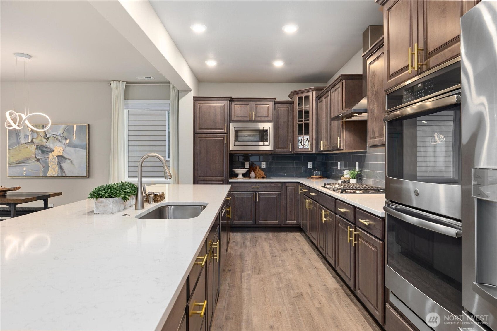 Covered front patio welcomes you to this spectacular 9-foot-ceiling SMART home. From the moment you step inside, the grand entryway & soaring ceilings set the tone, complemented by abundant natural light & stunning territorial & Olympic Mountain views. Just off the entry, the heart of the home awaits, impressive chefs kitchen designed for both everyday living & entertaining.