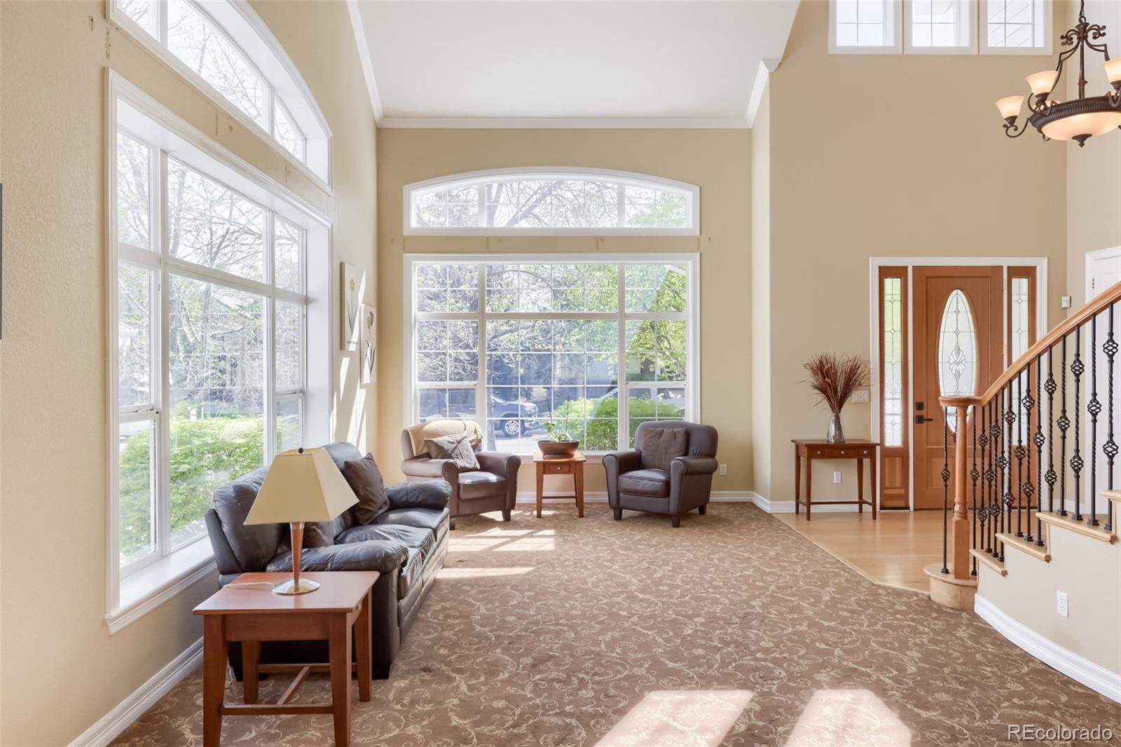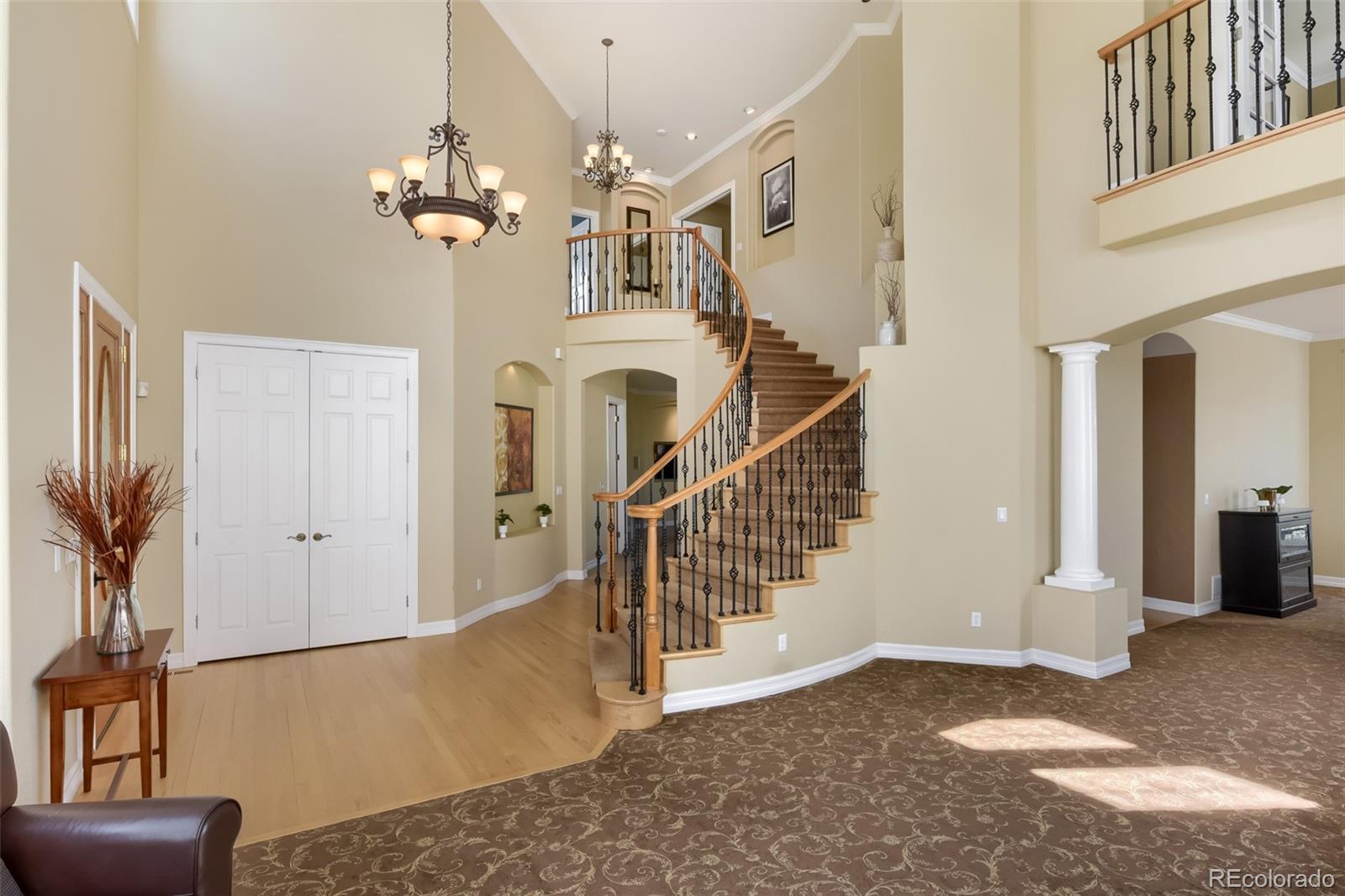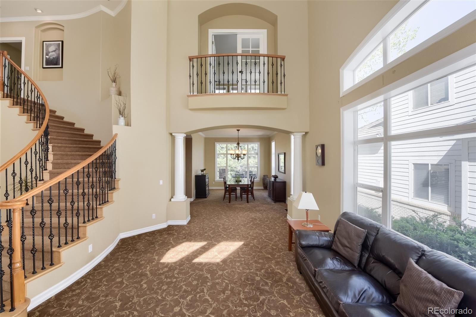 JUST LISTED in Lone Trees beautiful Carriage Club neighborhood! Perfectly positioned on a short cul-de-sac and backing to open space, this exceptional home offers privacy, views, and over 5,600 sq. ft. of thoughtfully designed living space. A charming front porch welcomes you inside to a grand entry with soaring 20 ceilings, a dramatic curved staircase, and elegant wrought iron balusters.